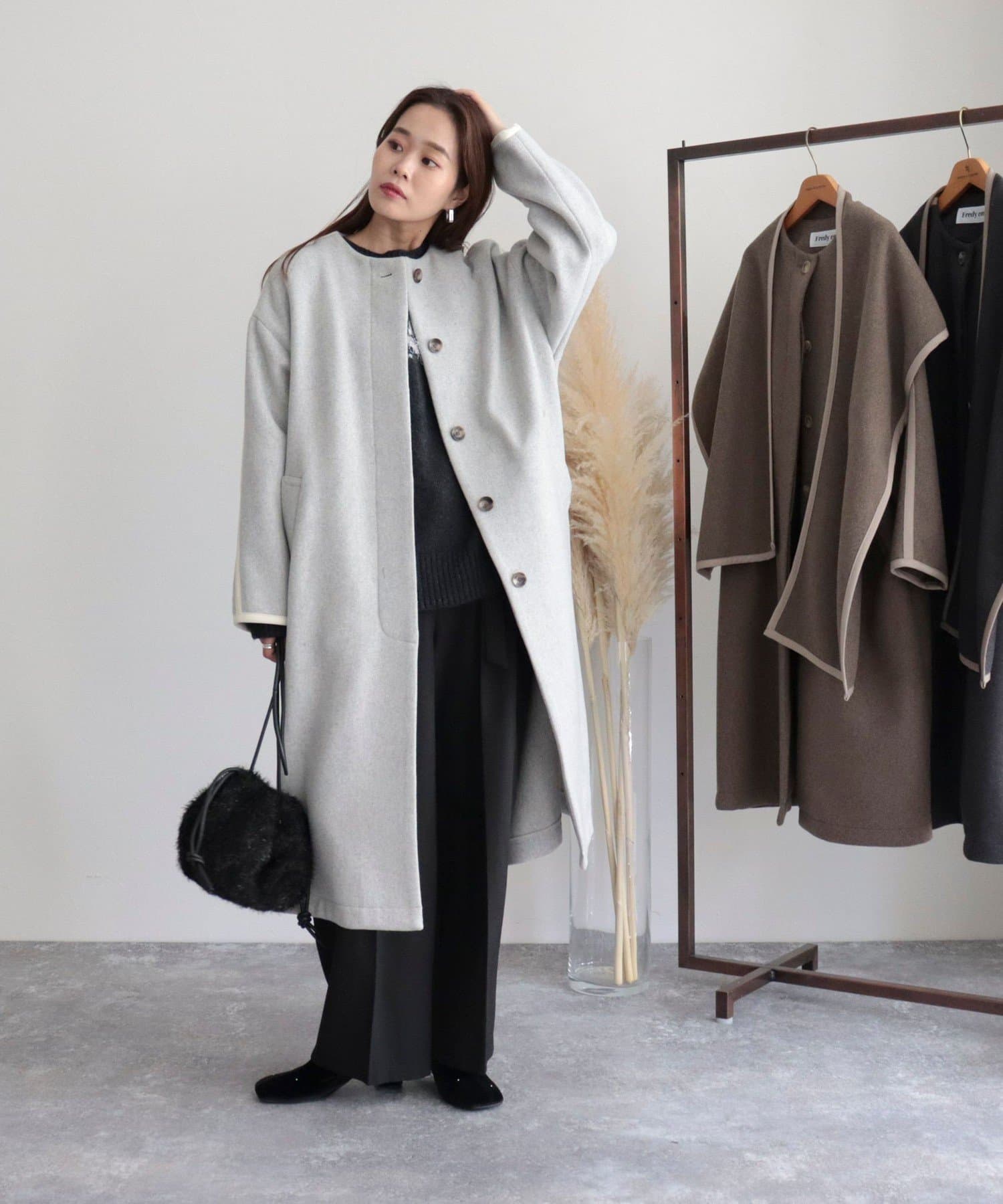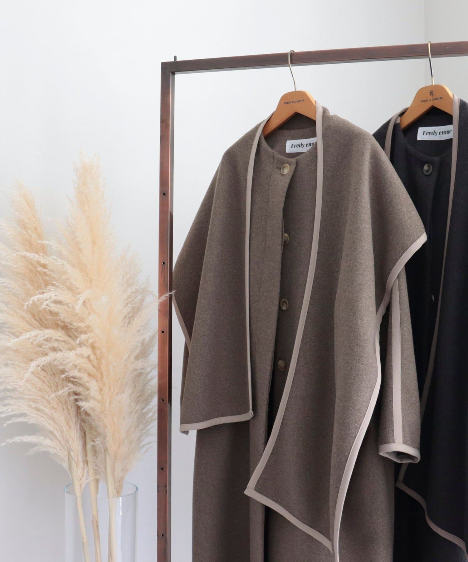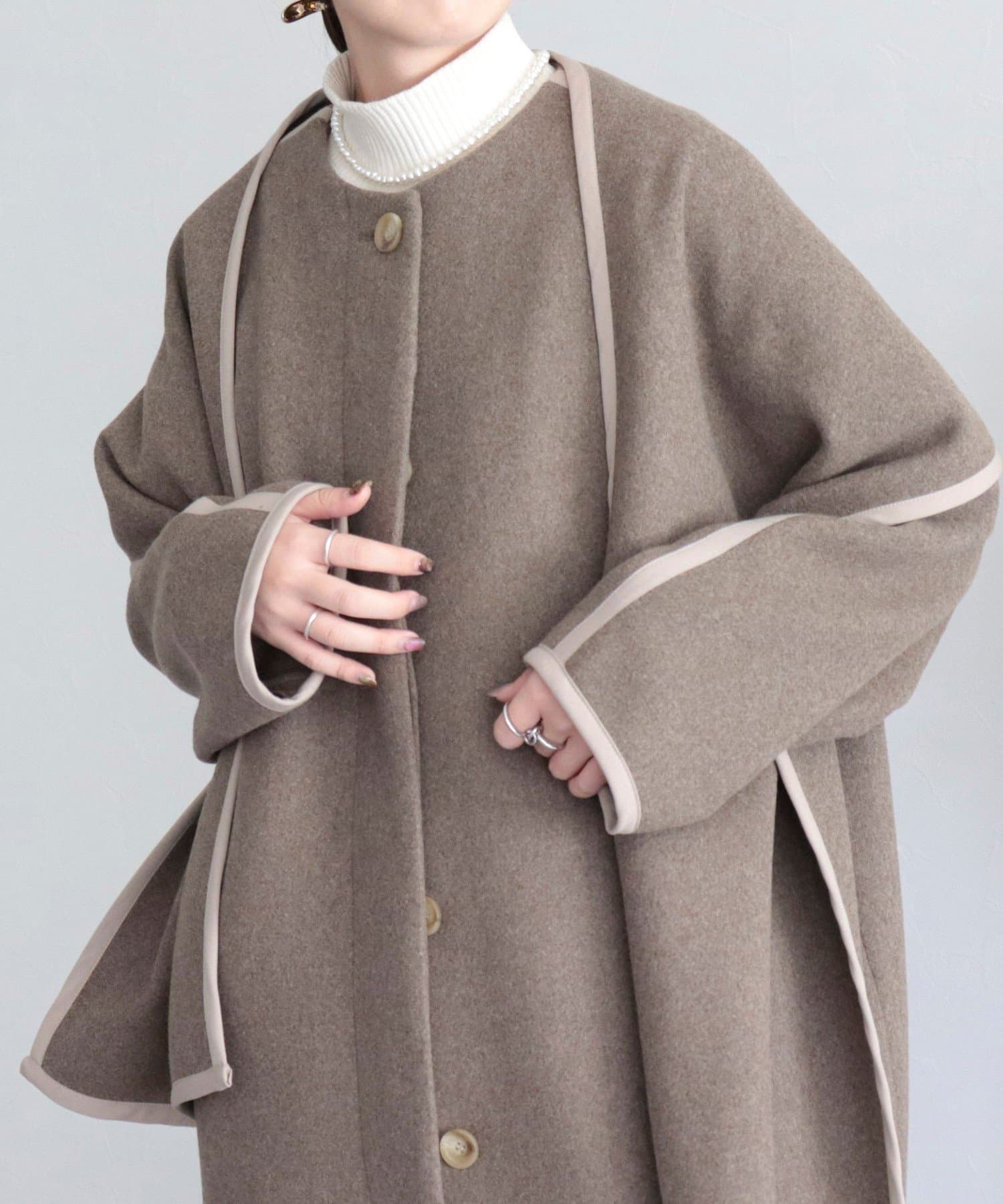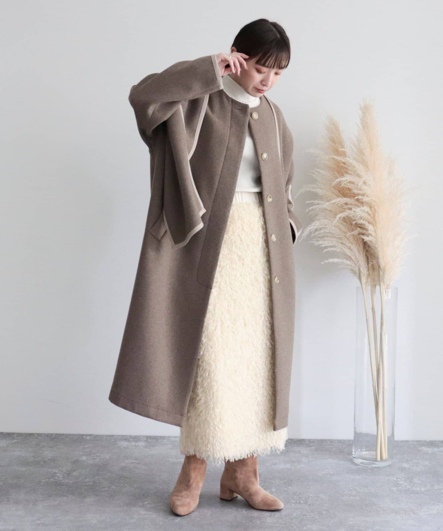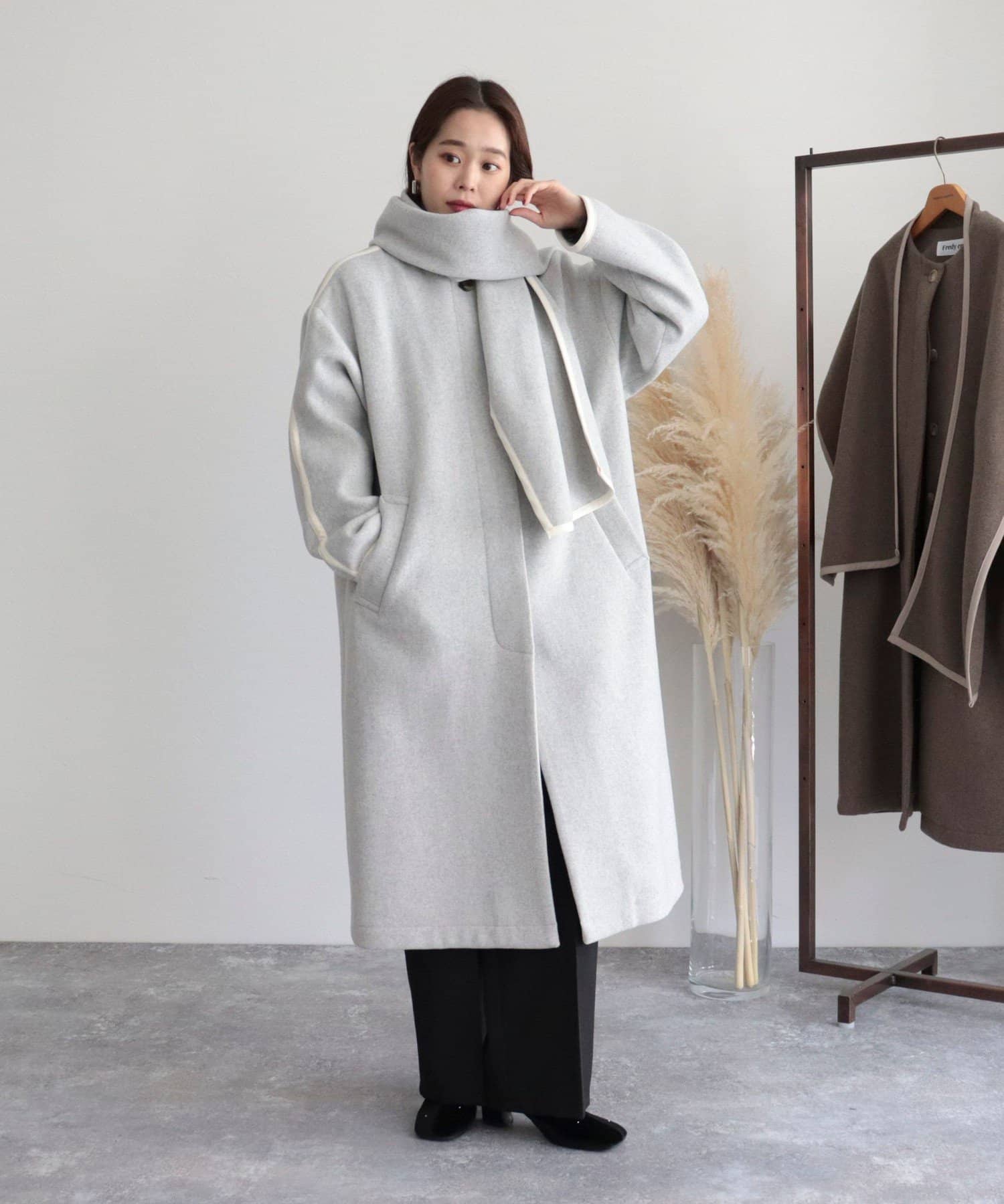 配色パイピングが今年らしい ストールとノーカラーコートのセットアイテム