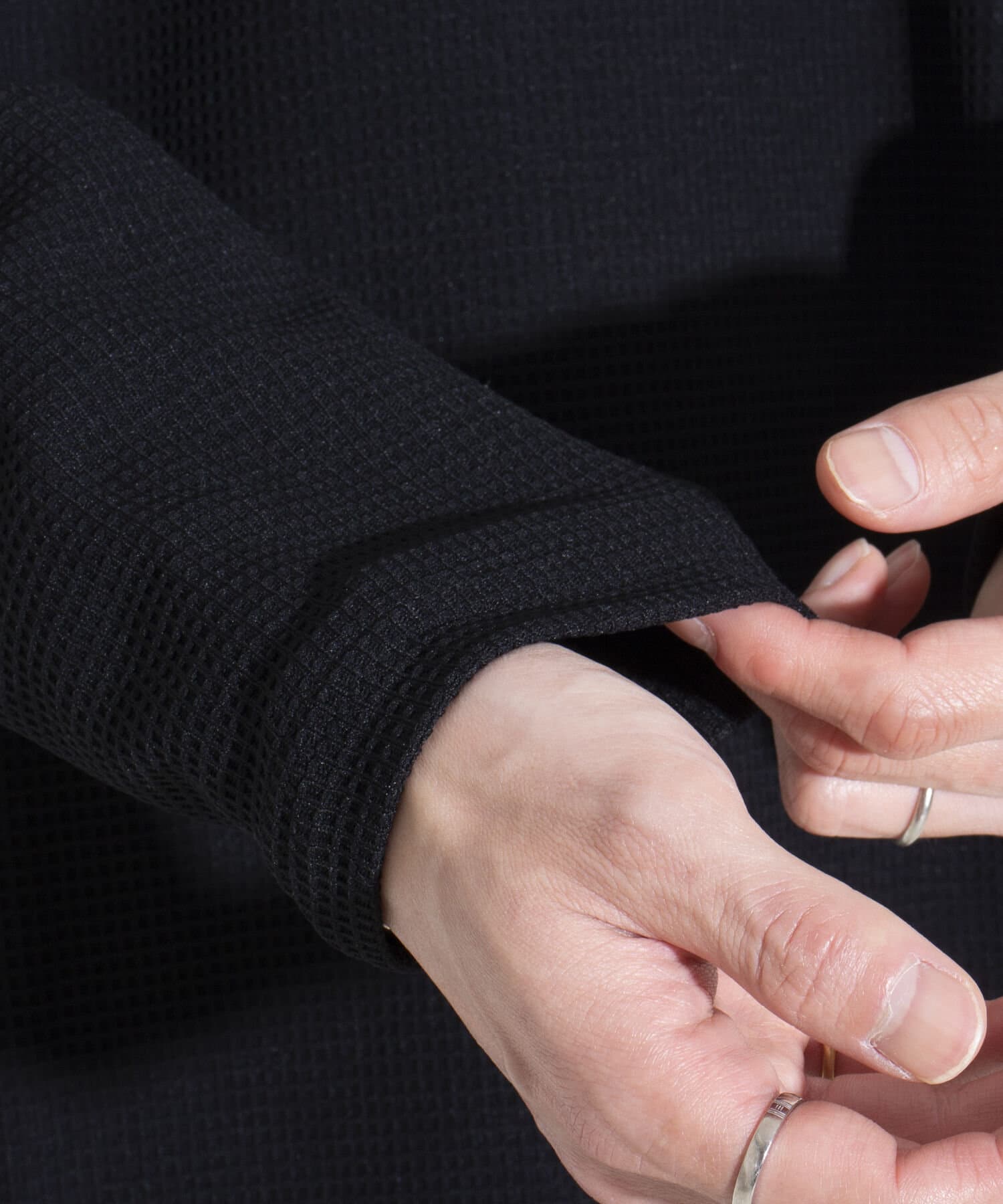 肌との接触面積の少ないワッフル素材はべたつきにくく、肌に張り付かないのでさらっとした着心地に仕上がっています。