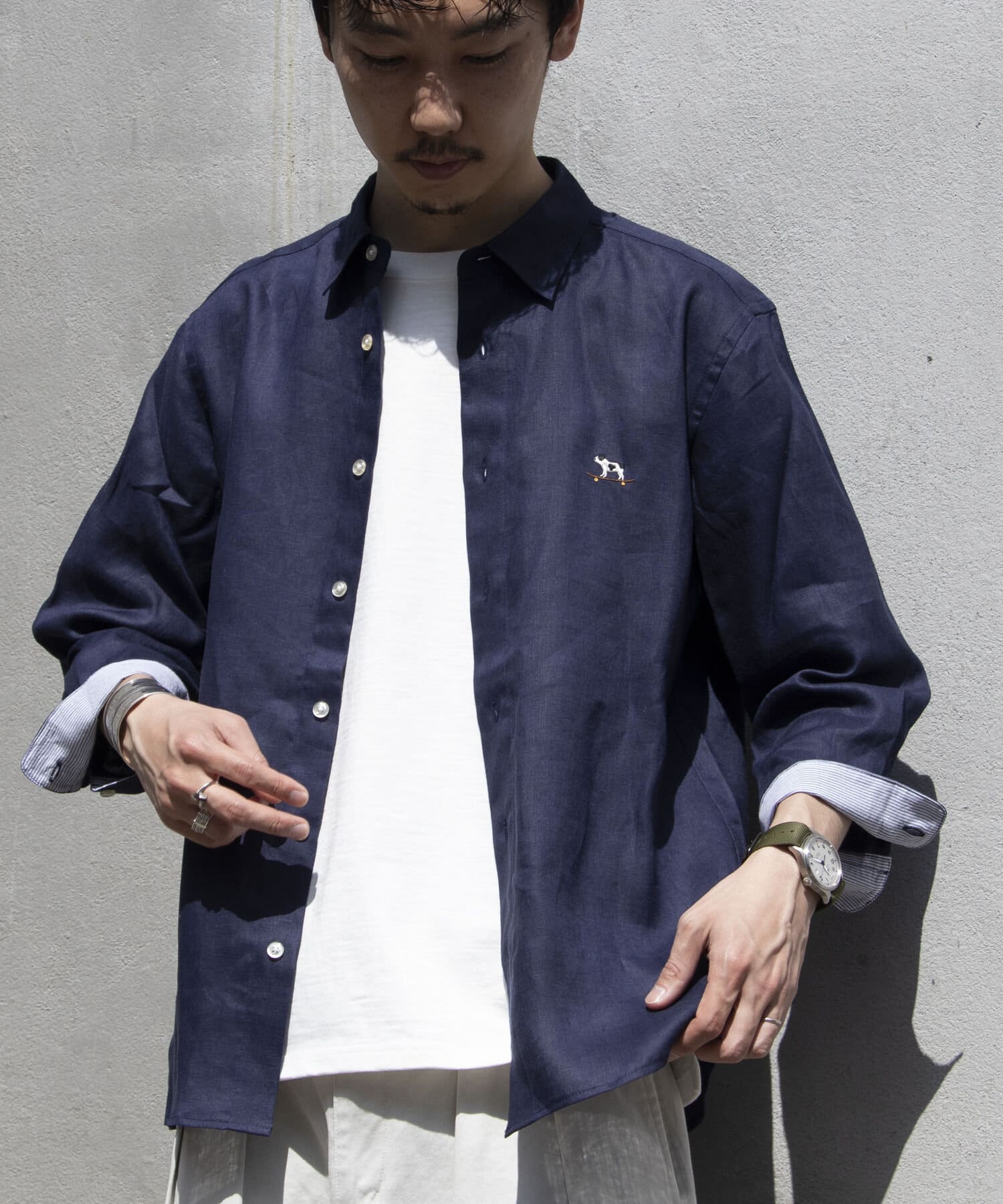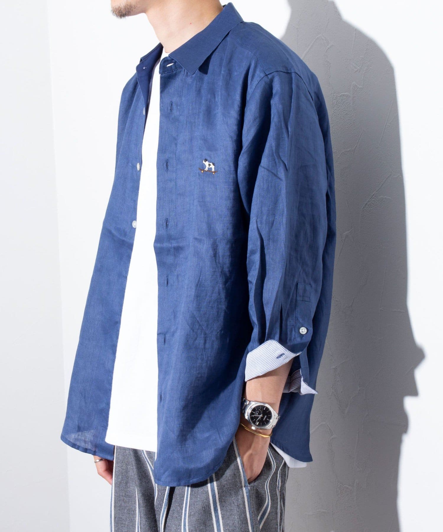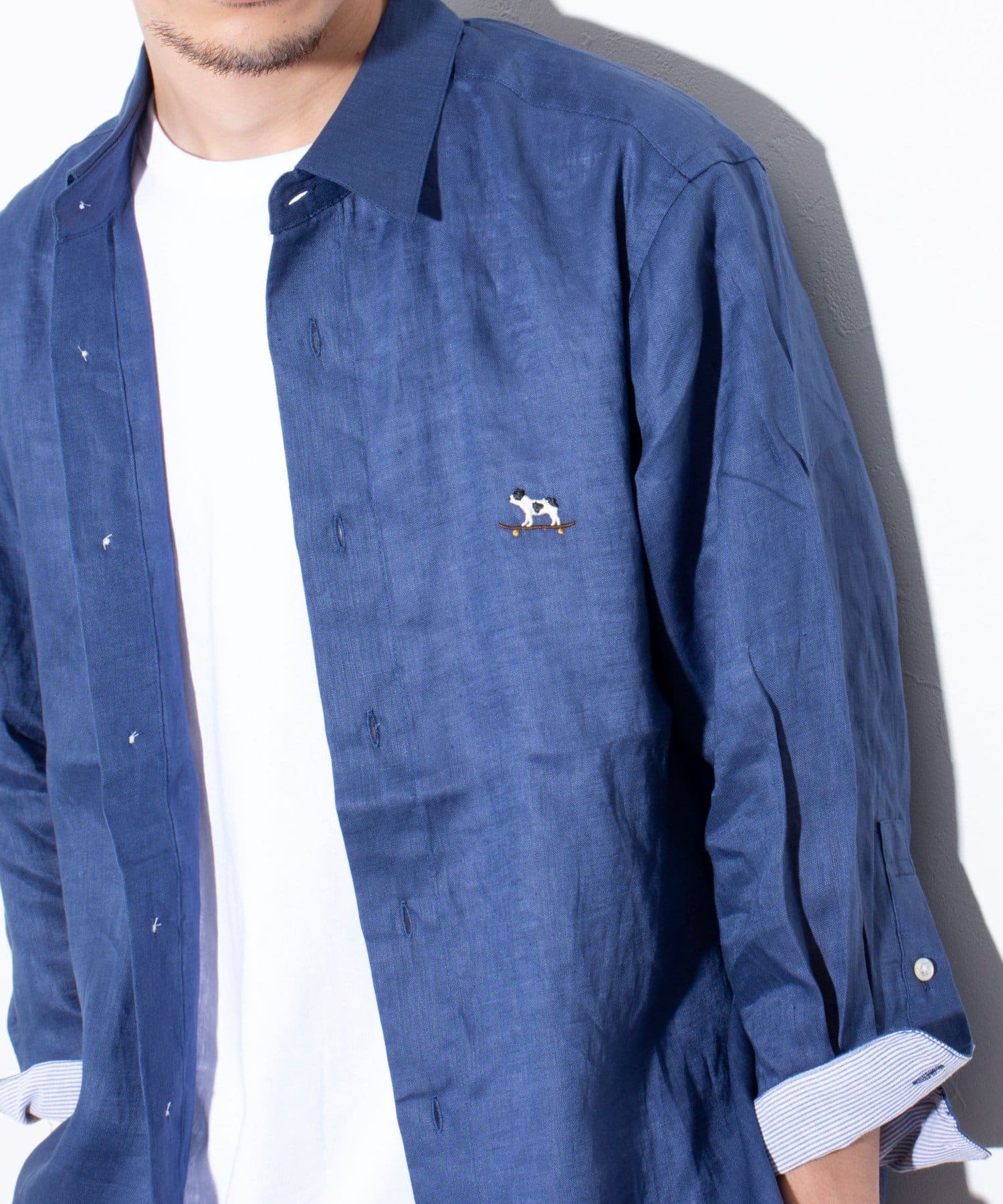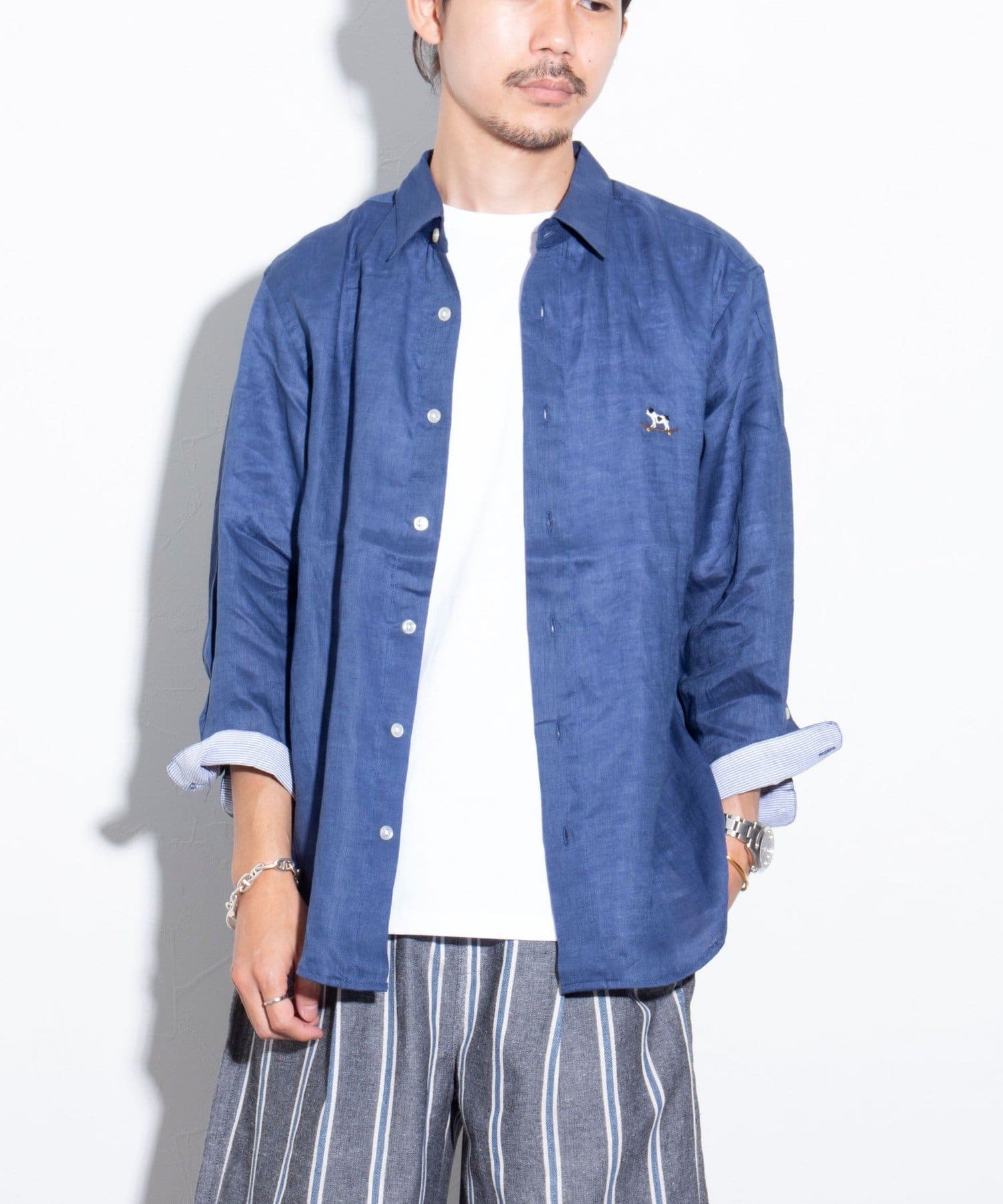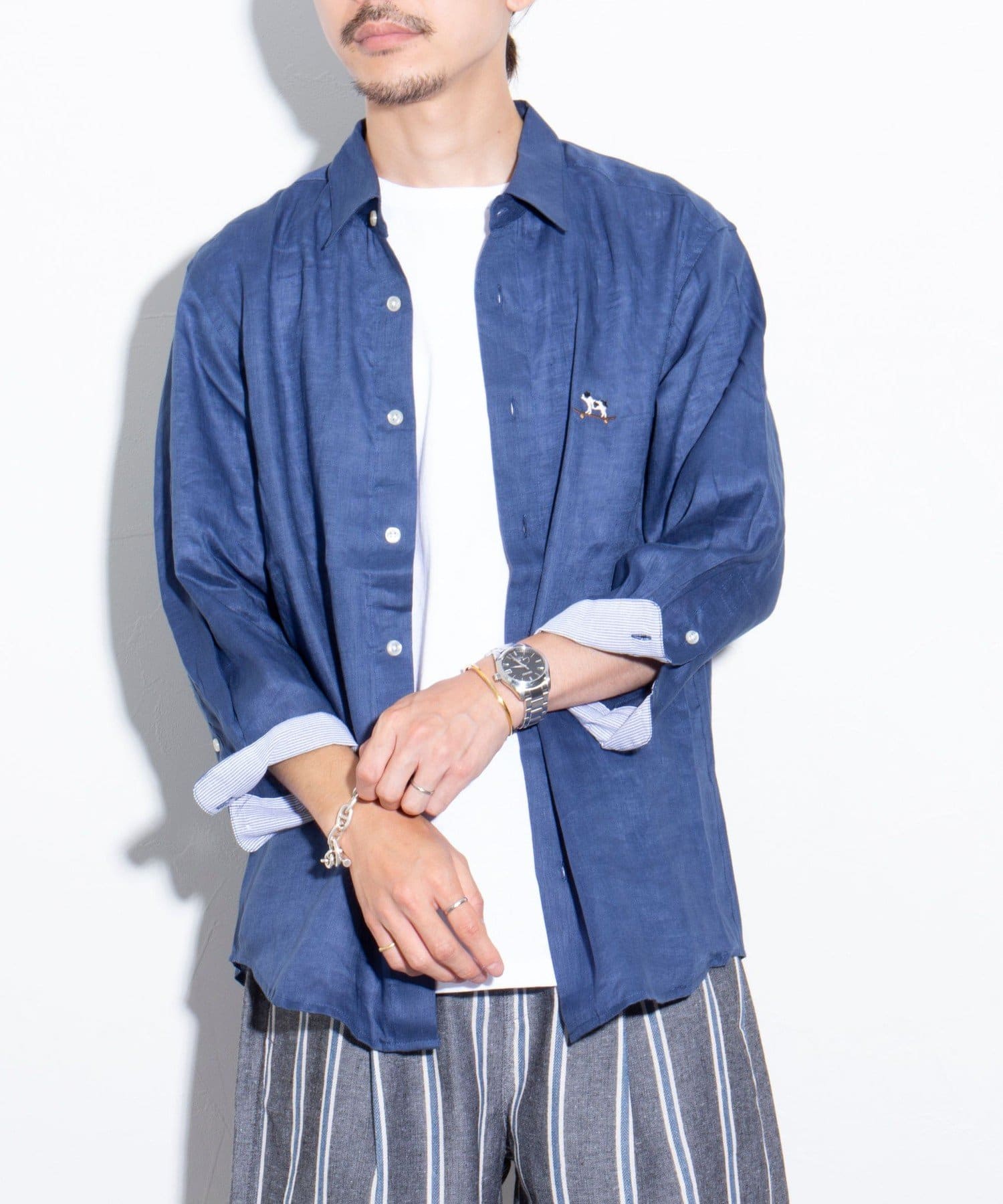 【GLOSTER】フレンチブルドッグ刺繍 レギュラーカラー7分袖リネンシャツ