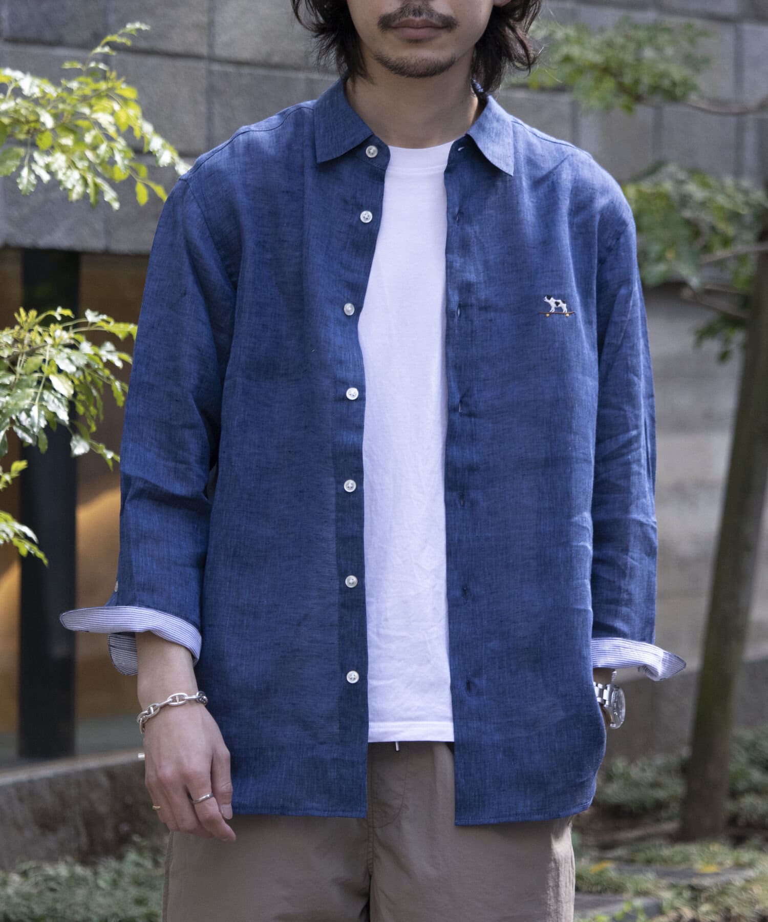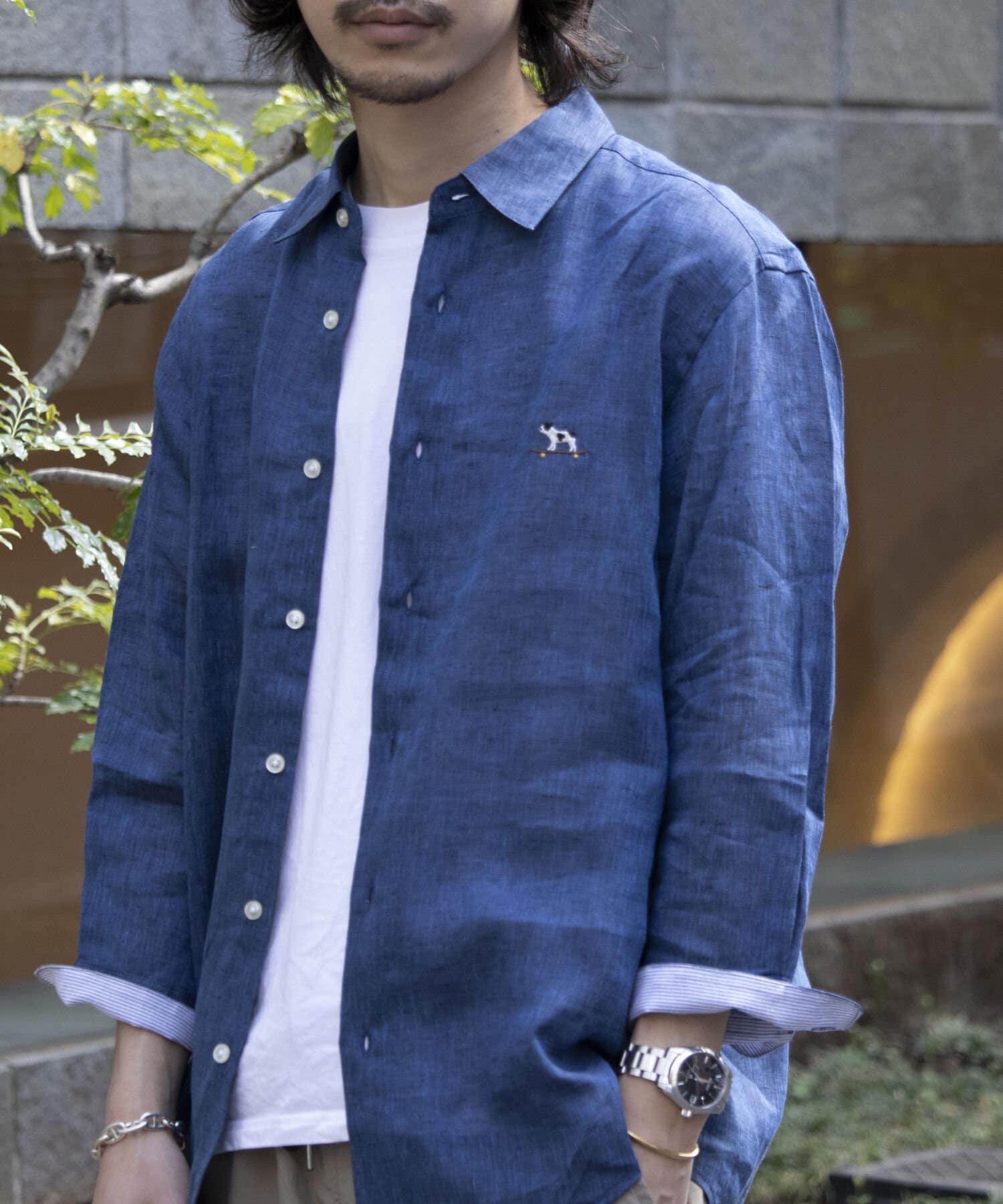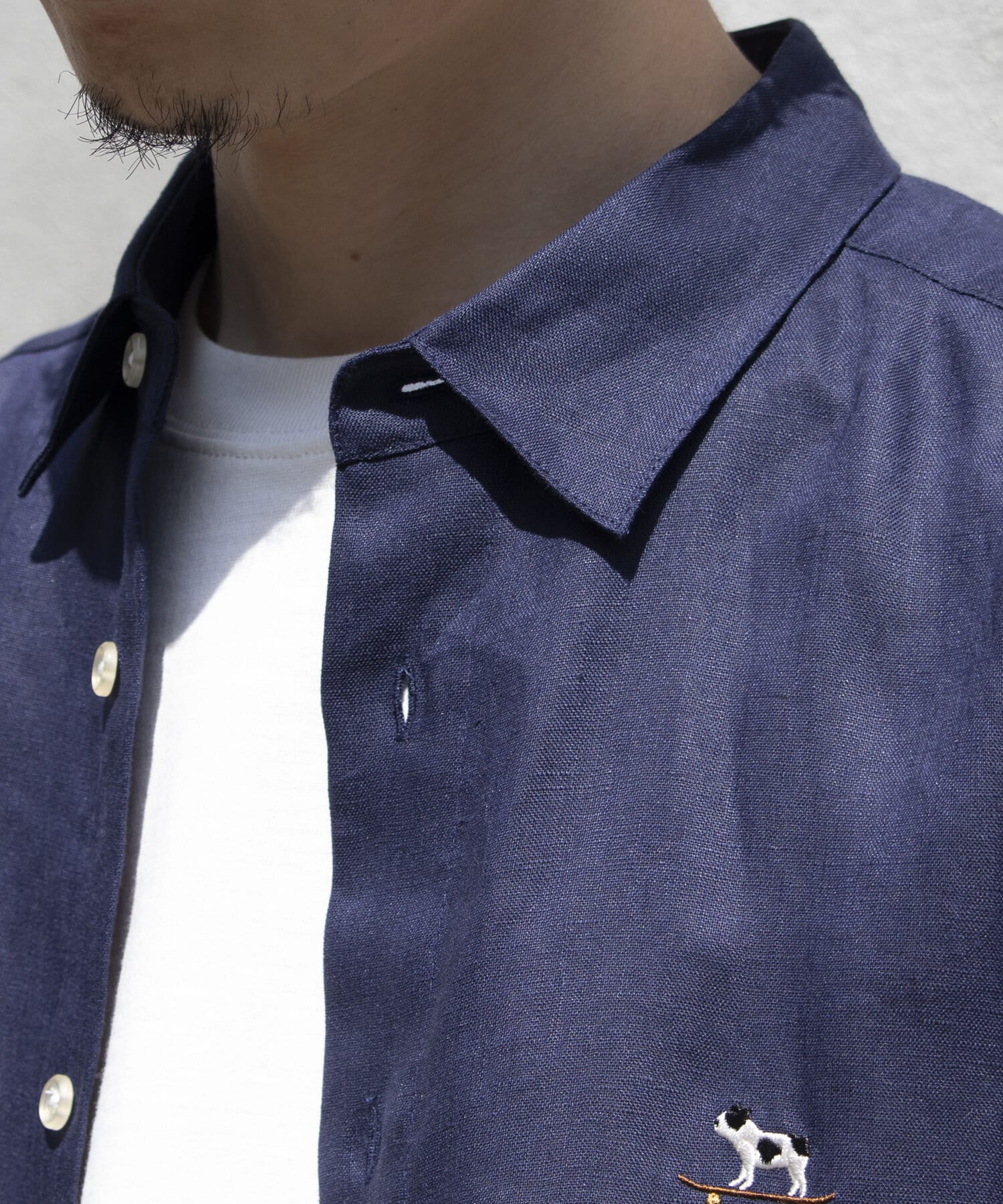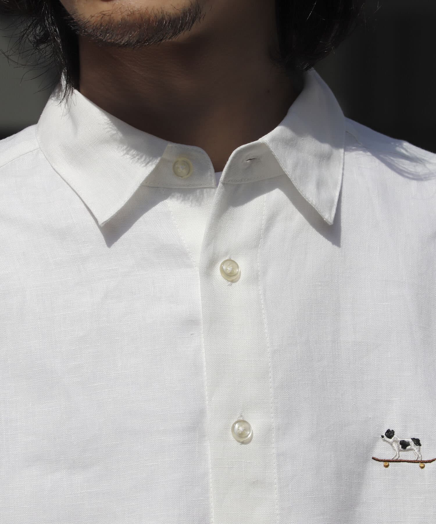 【GLOSTER】フレンチブルドッグ刺繍 レギュラーカラー7分袖リネンシャツ
