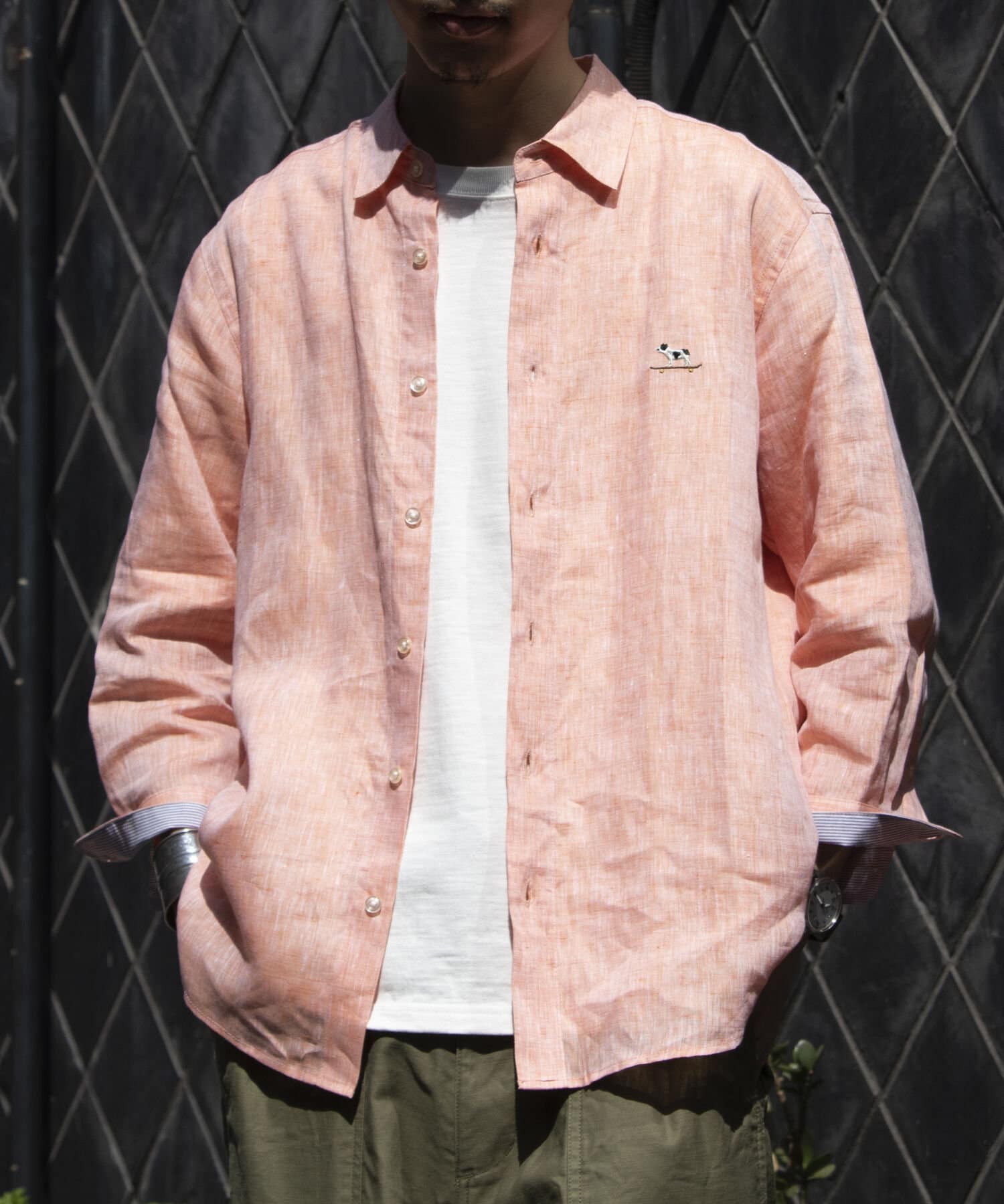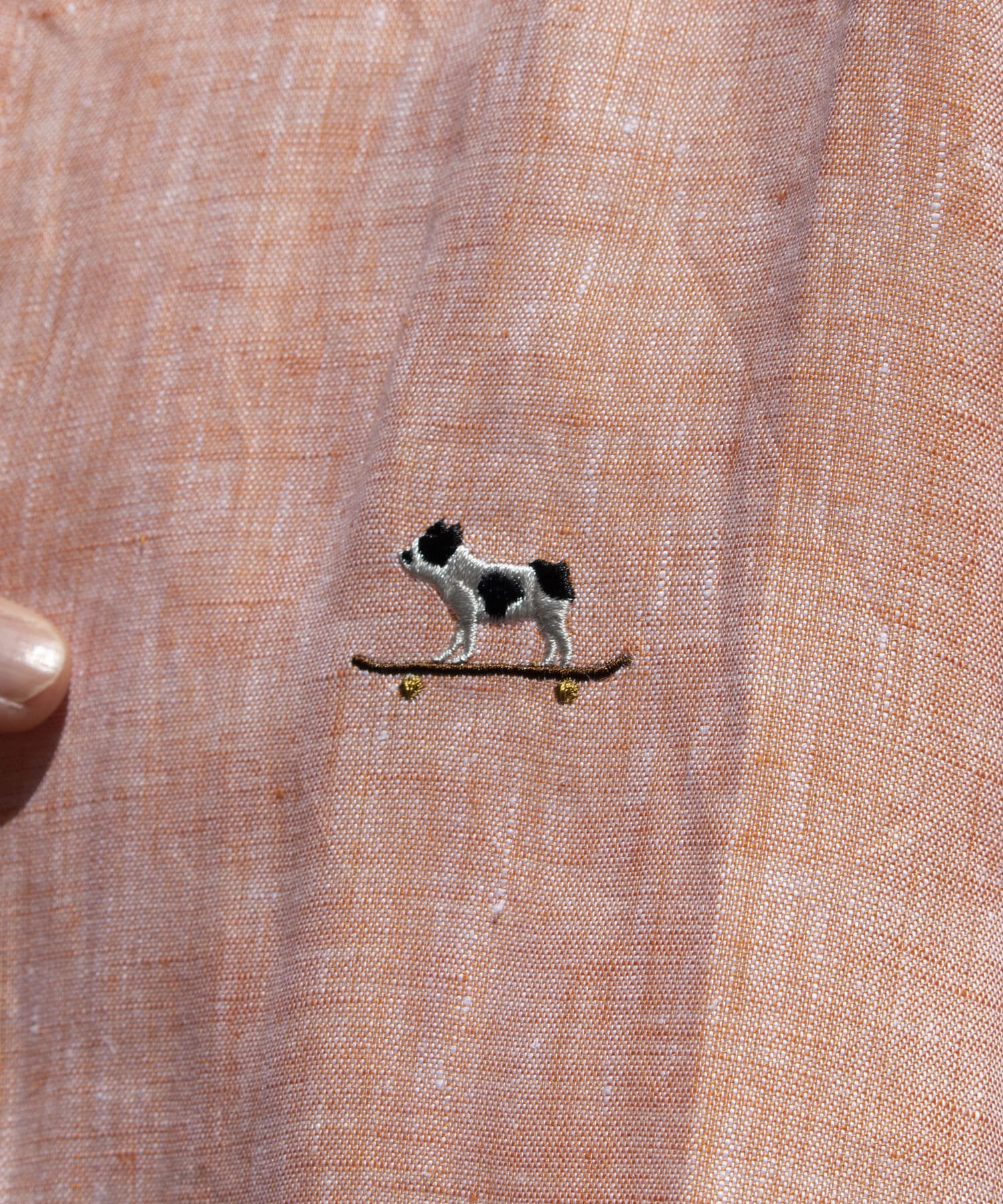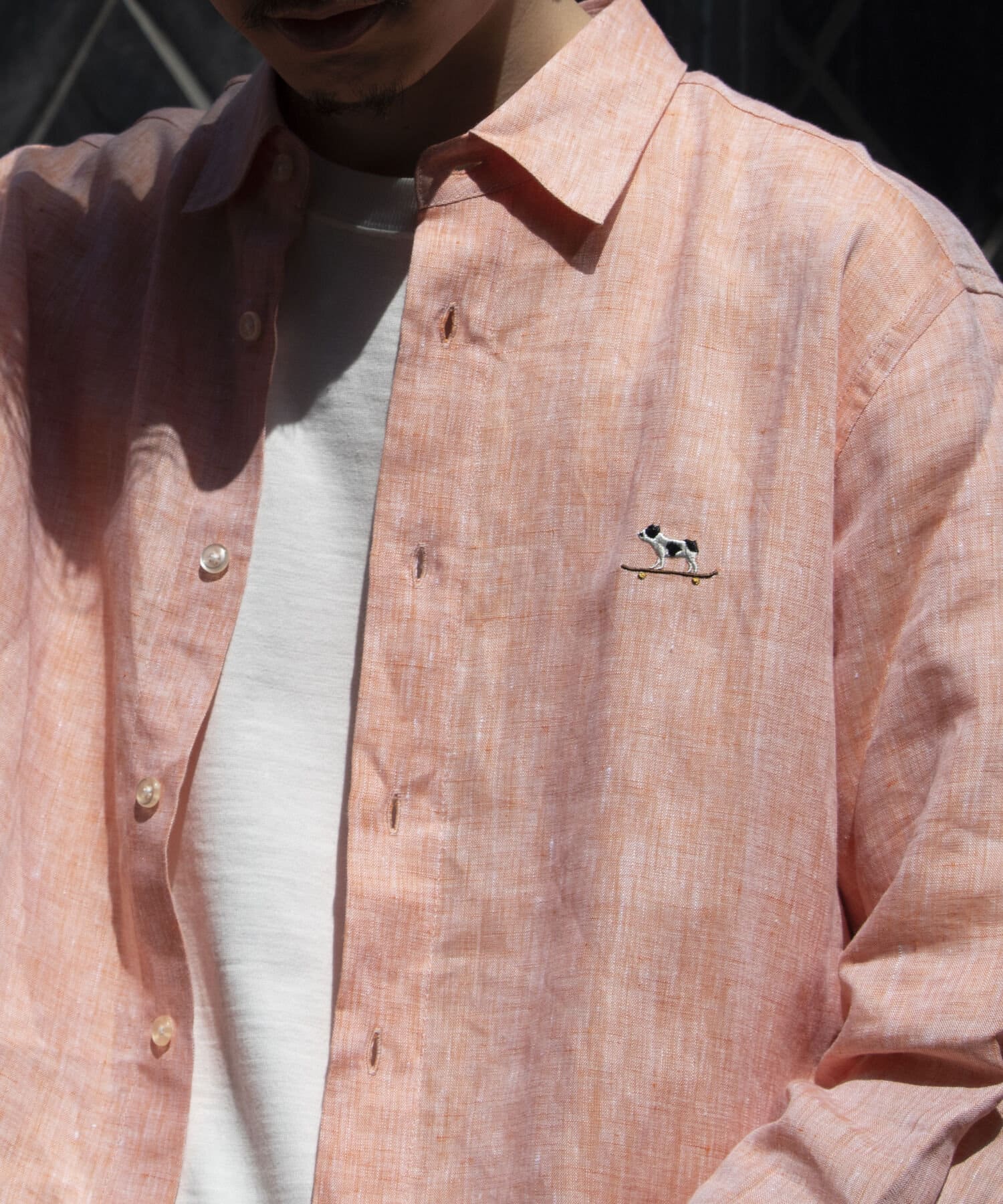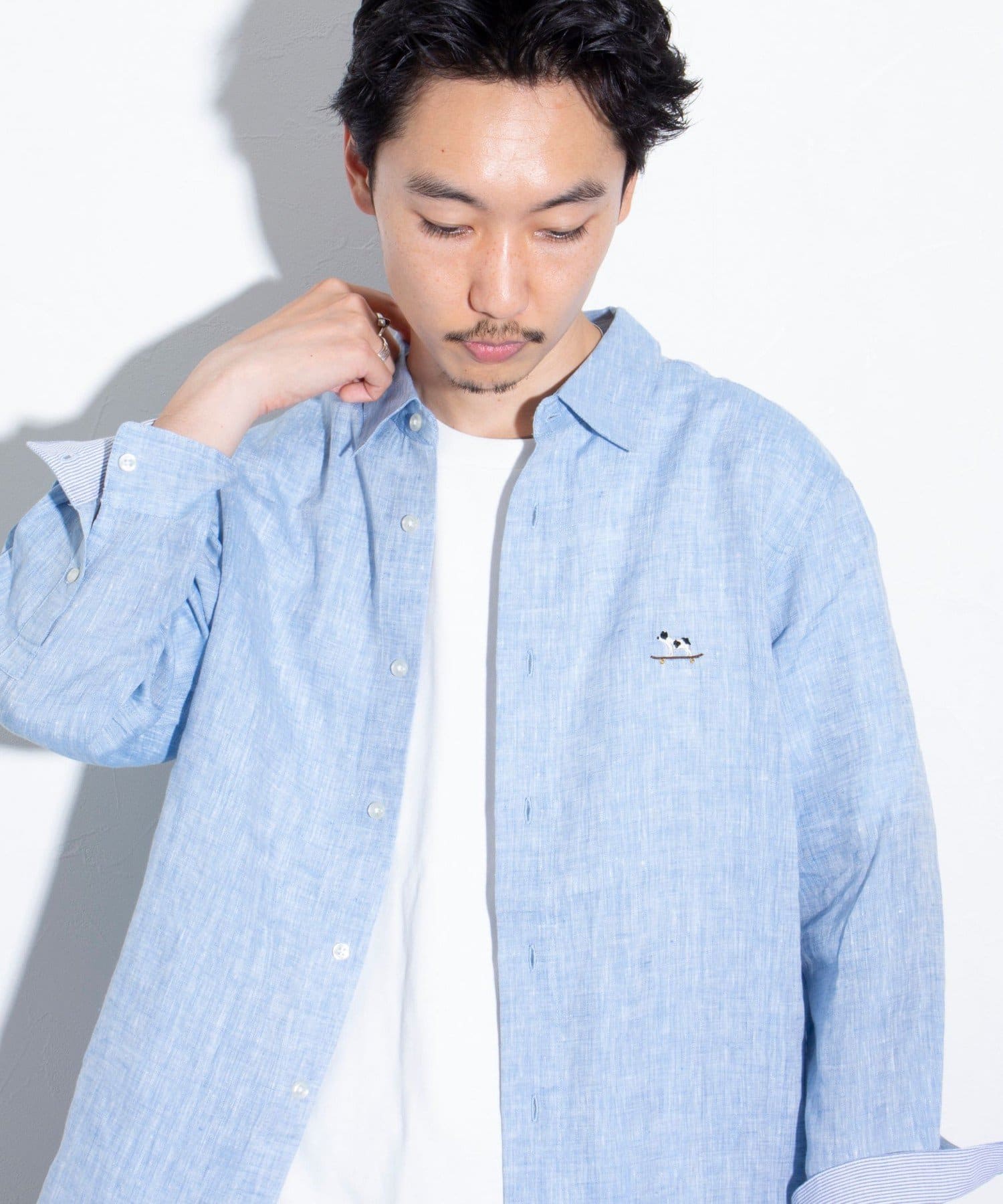 【GLOSTER】フレンチブルドッグ刺繍 レギュラーカラー7分袖リネンシャツ