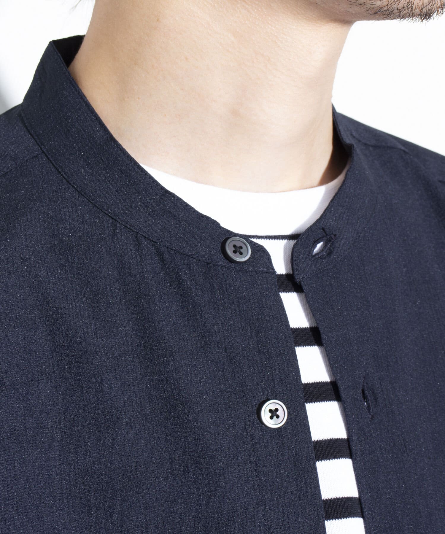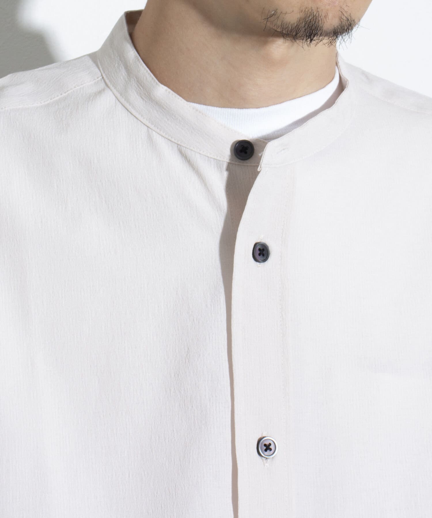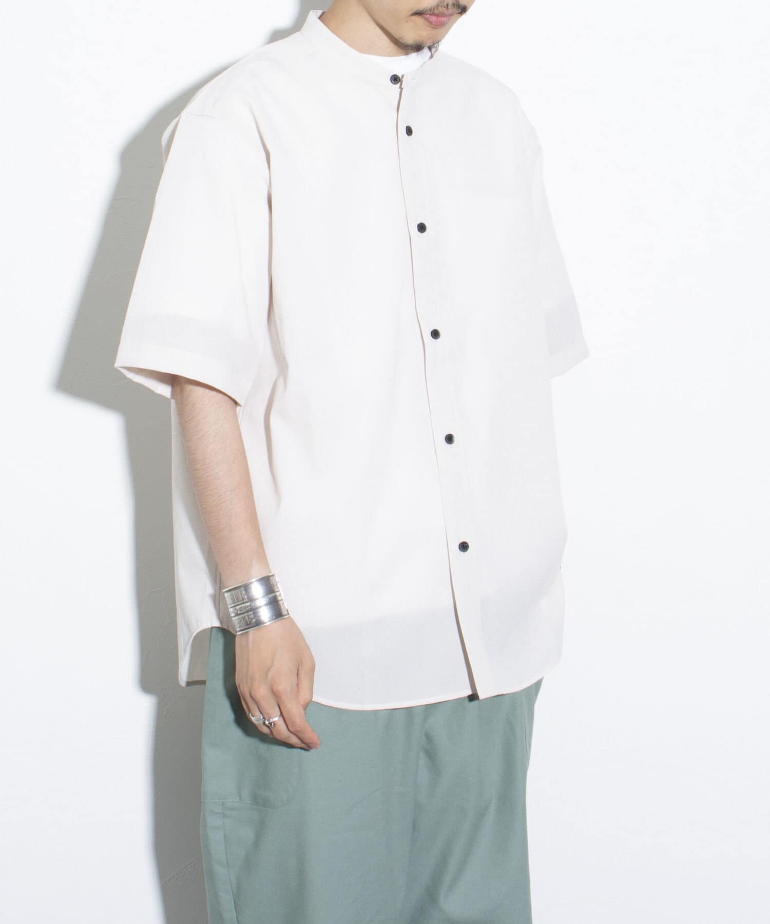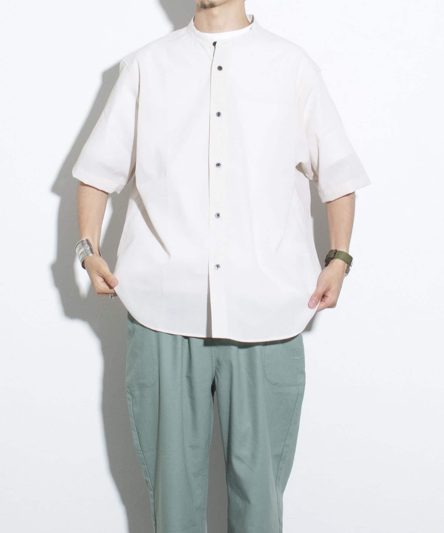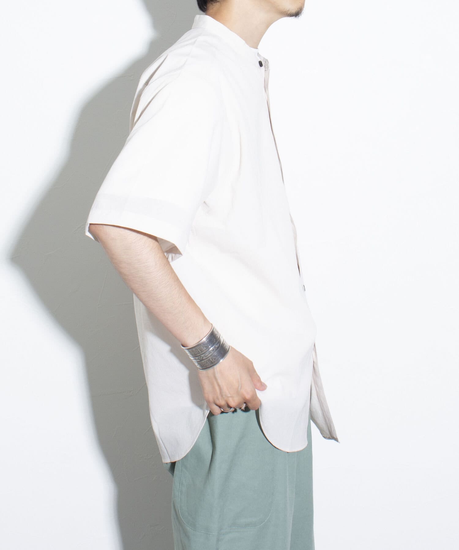 時代に合わせややゆったりめなサイズ感に設定したバンドカラーシャツ。