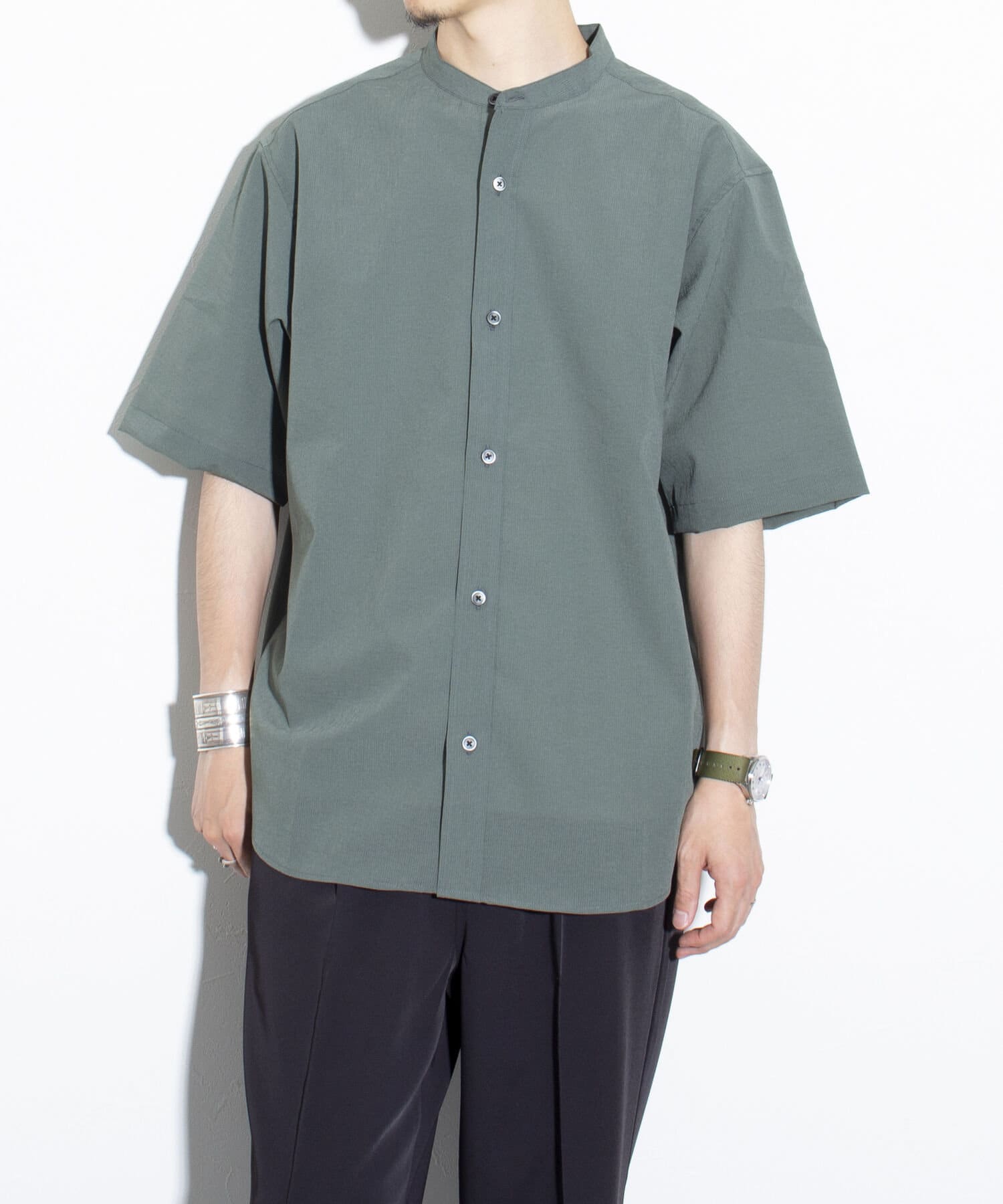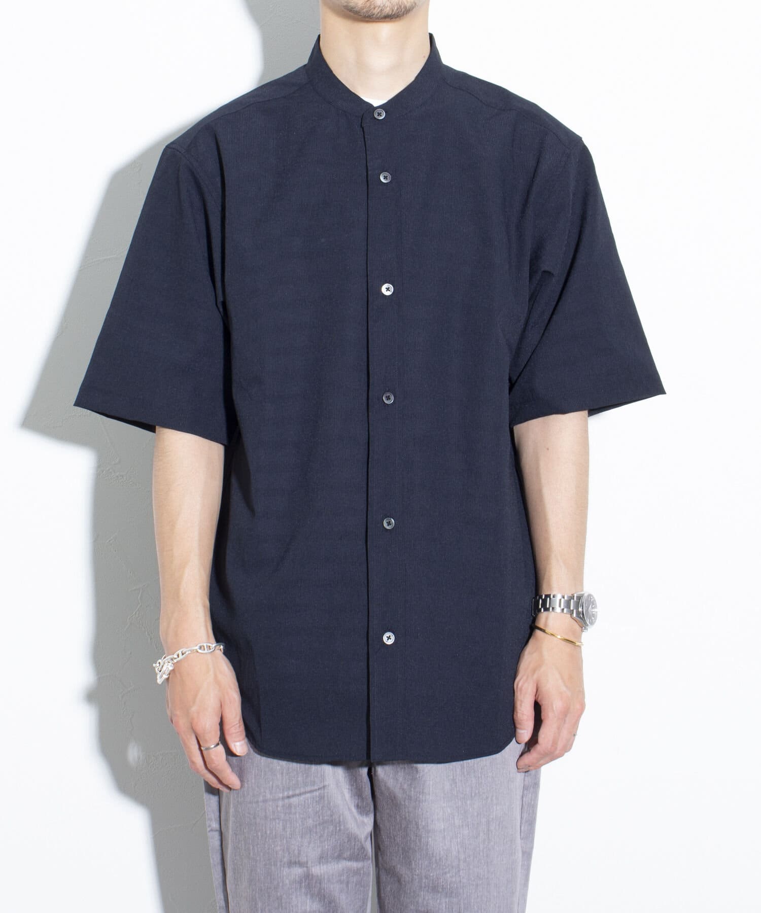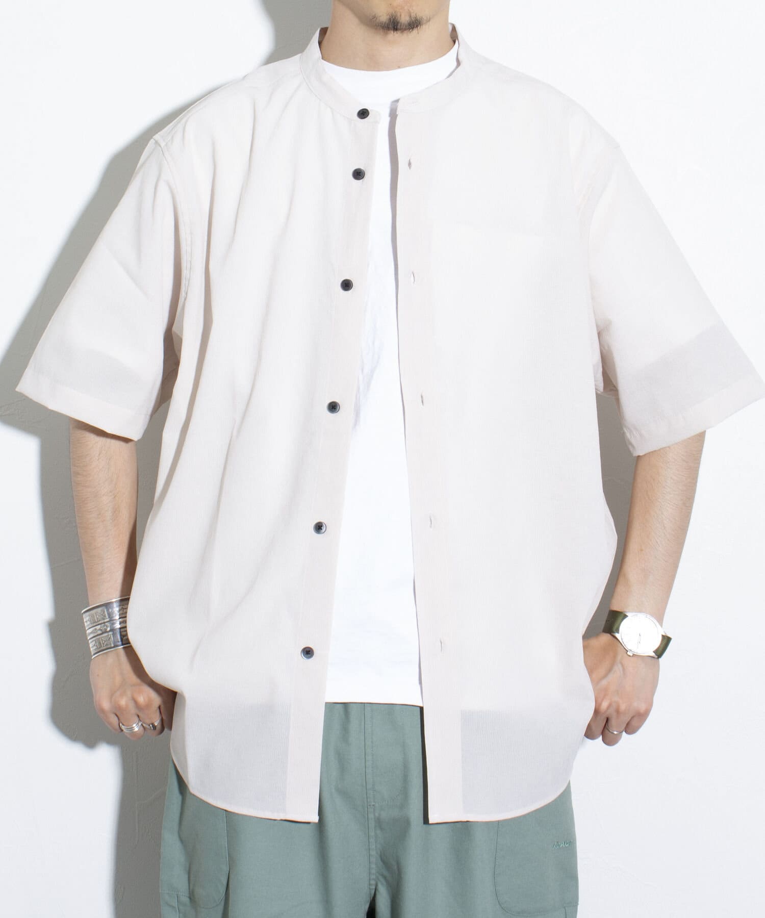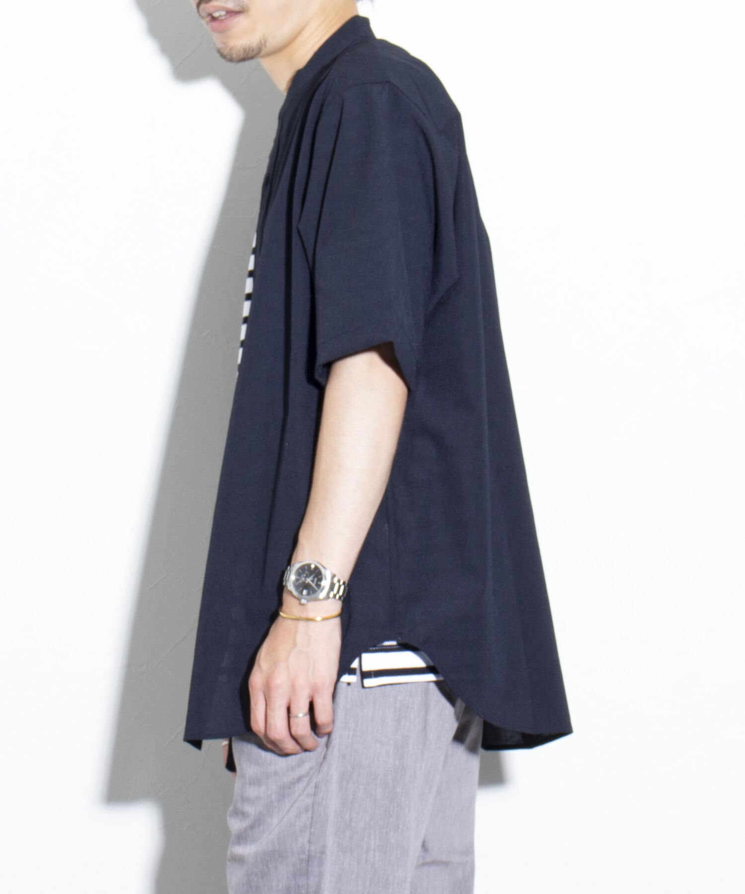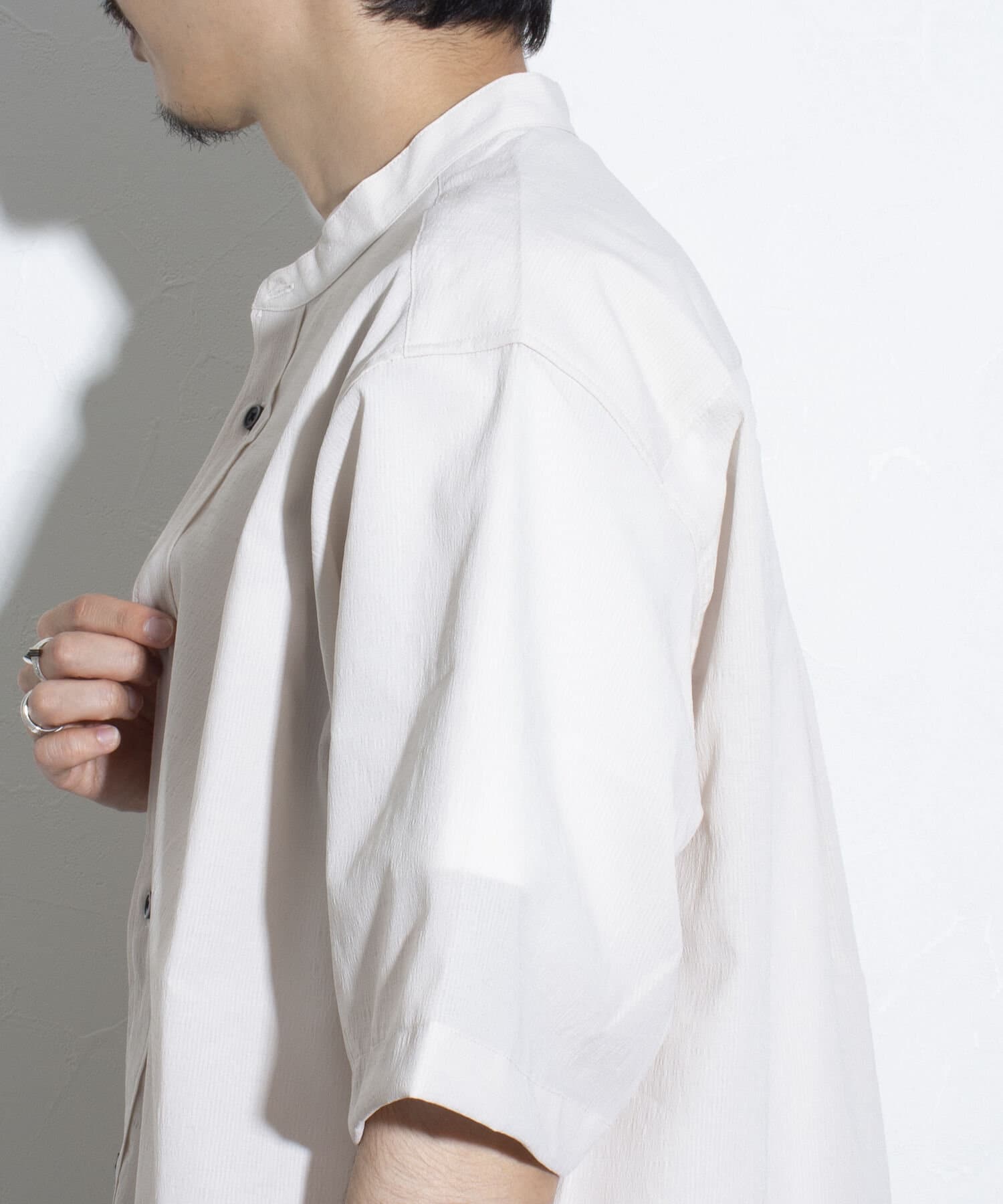 時代に合わせややゆったりめなサイズ感に設定したバンドカラーシャツ。