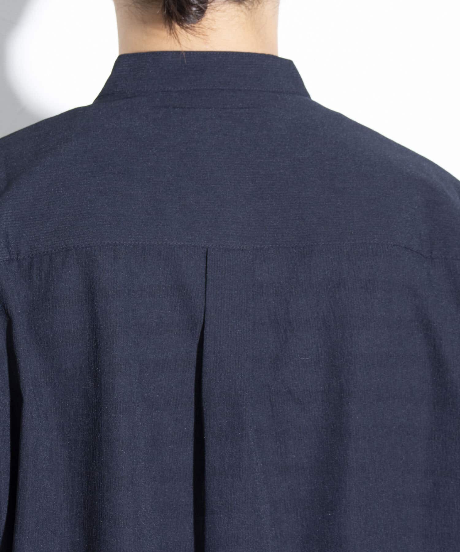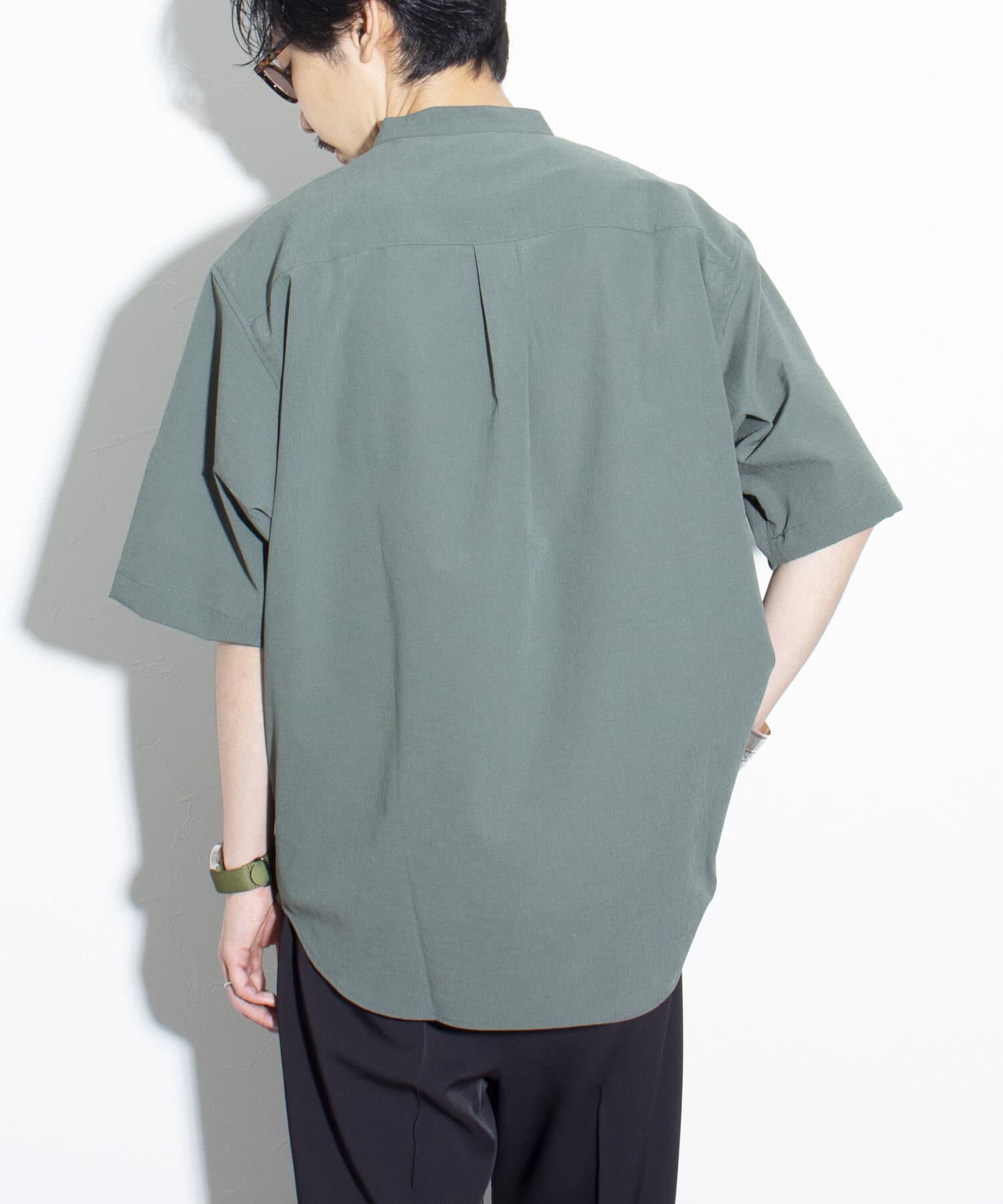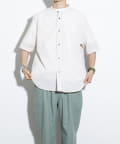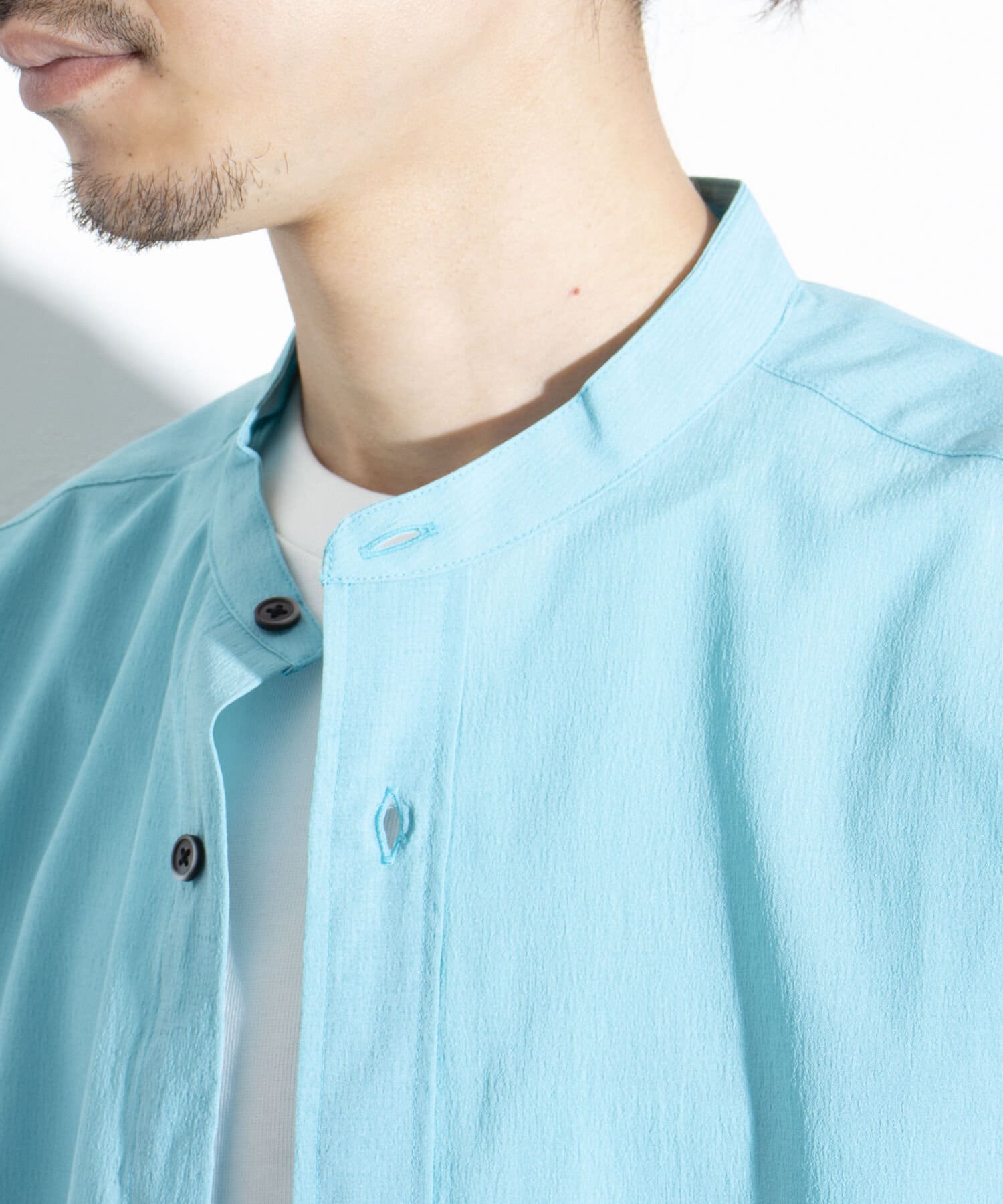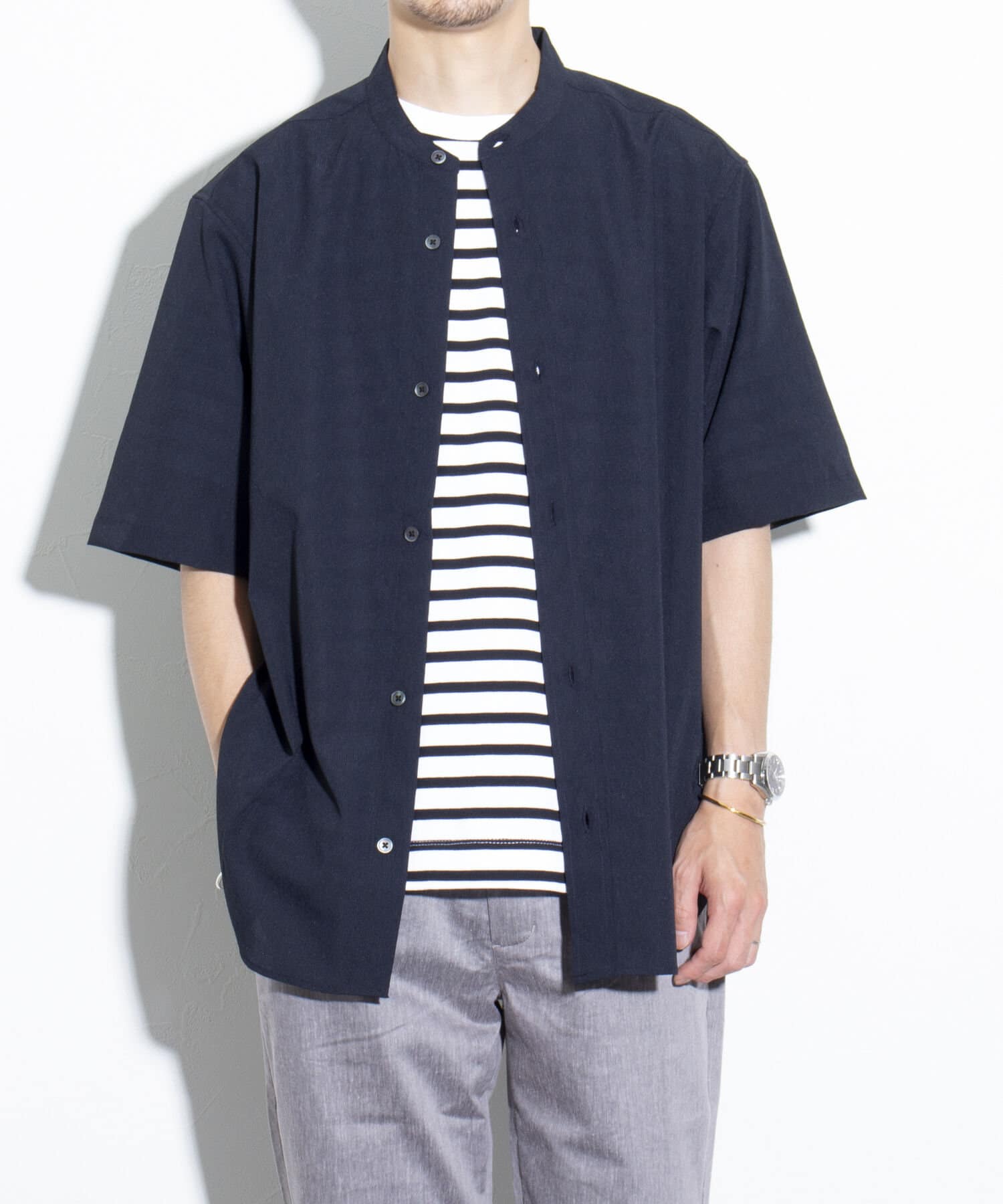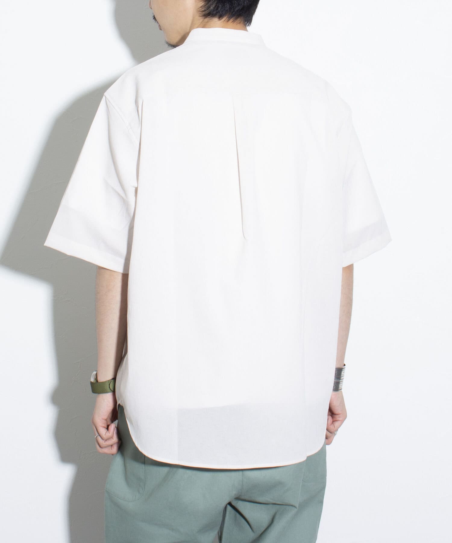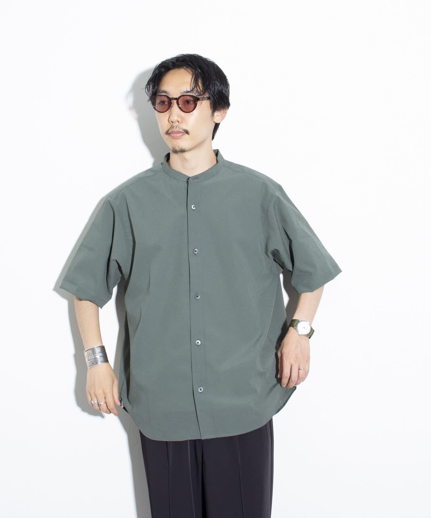 時代に合わせややゆったりめなサイズ感に設定したバンドカラーシャツ。