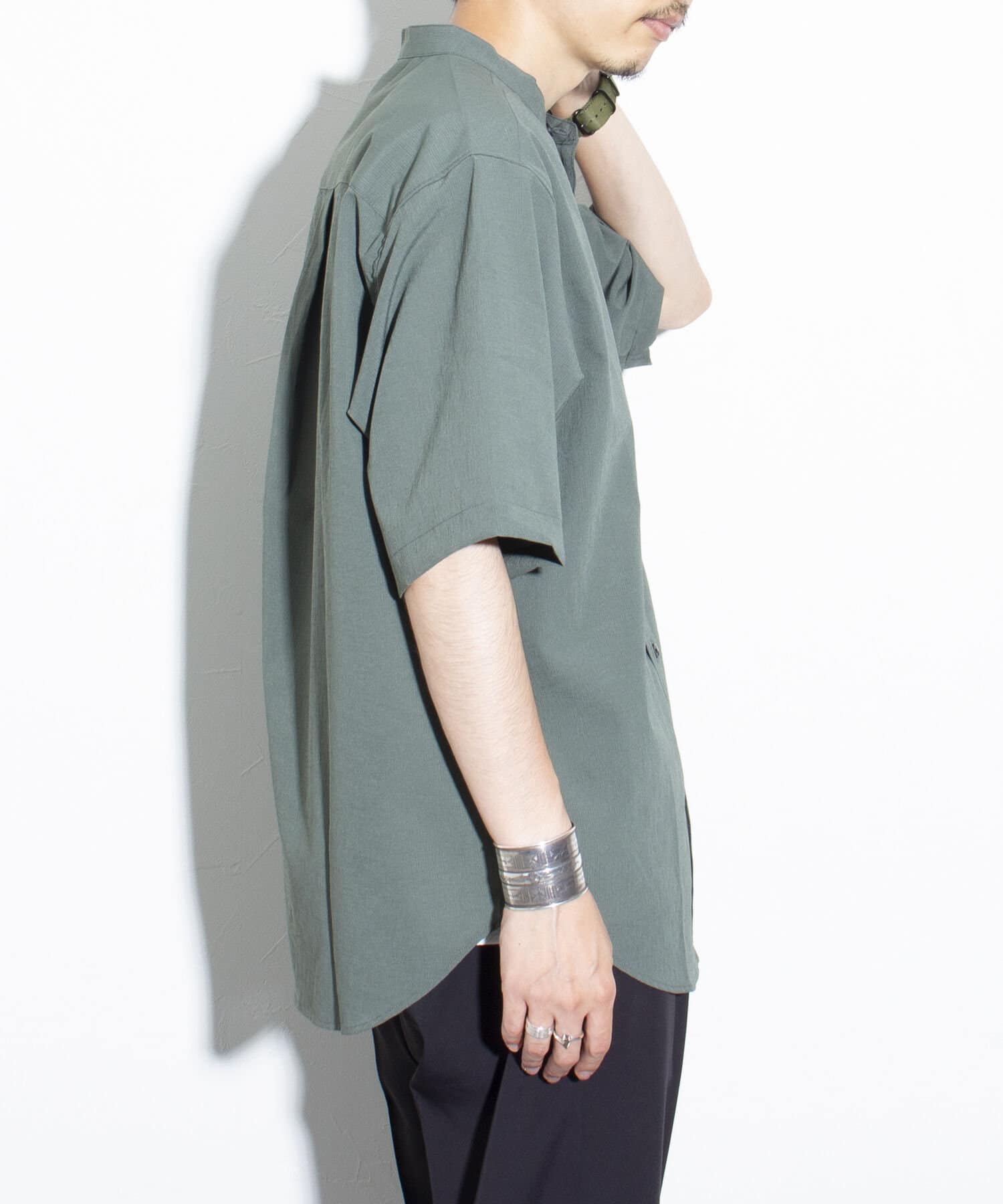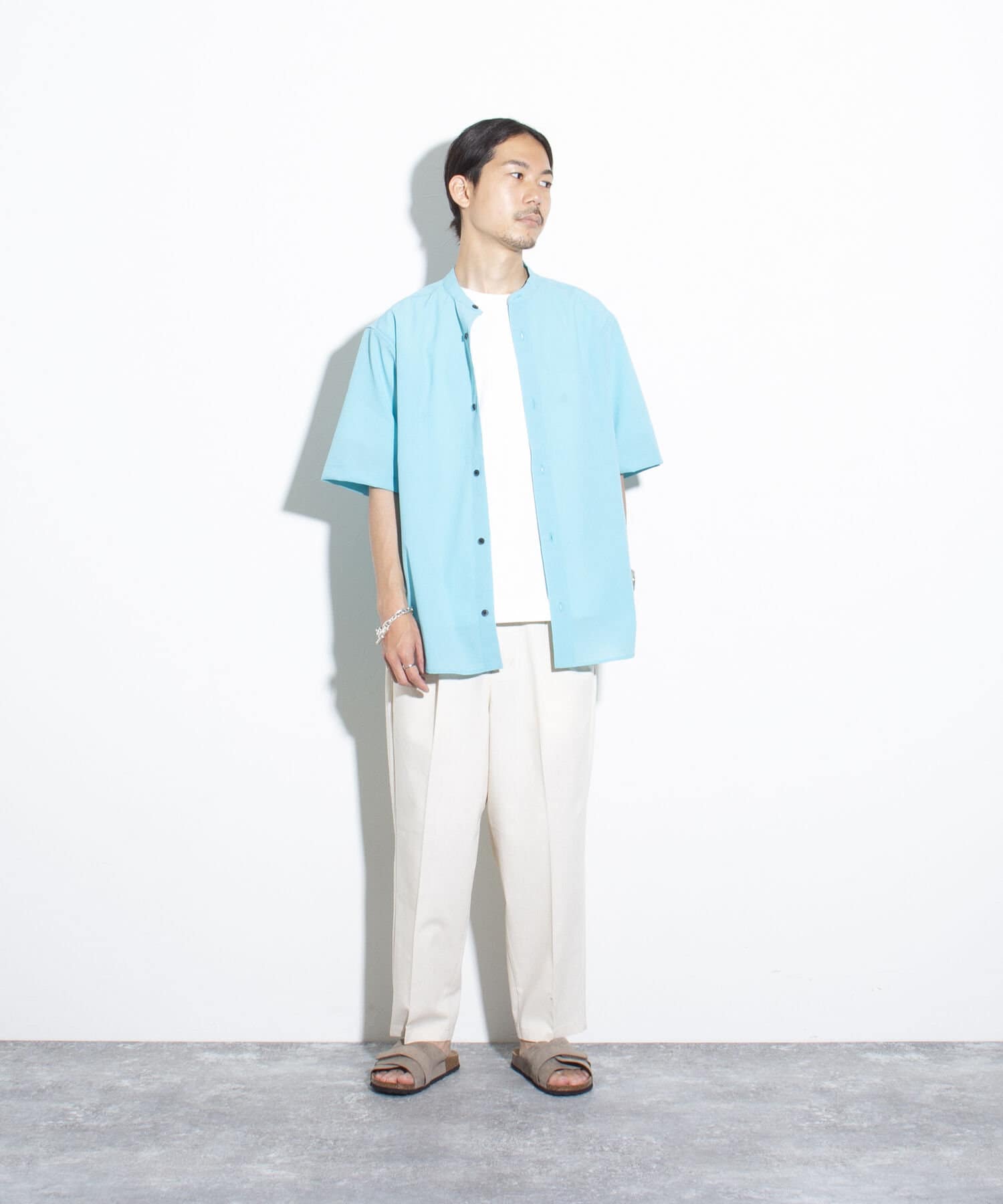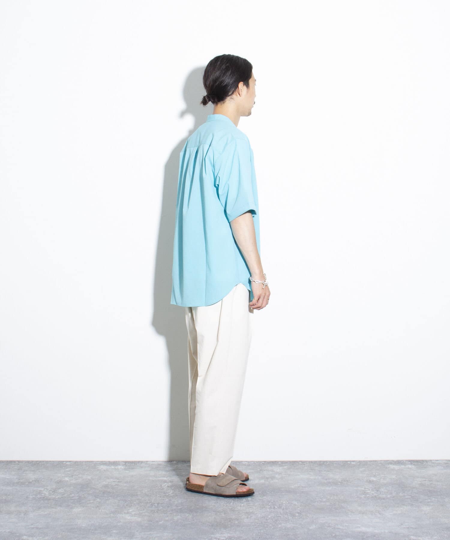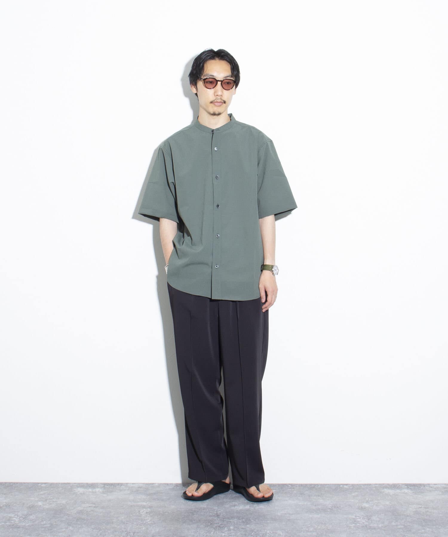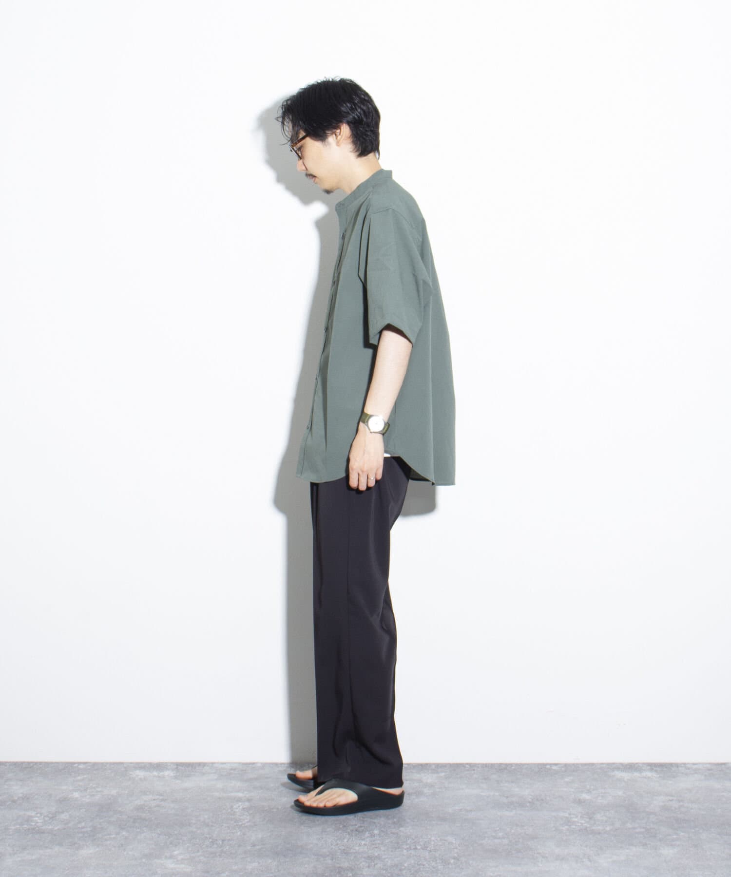 時代に合わせややゆったりめなサイズ感に設定したバンドカラーシャツ。