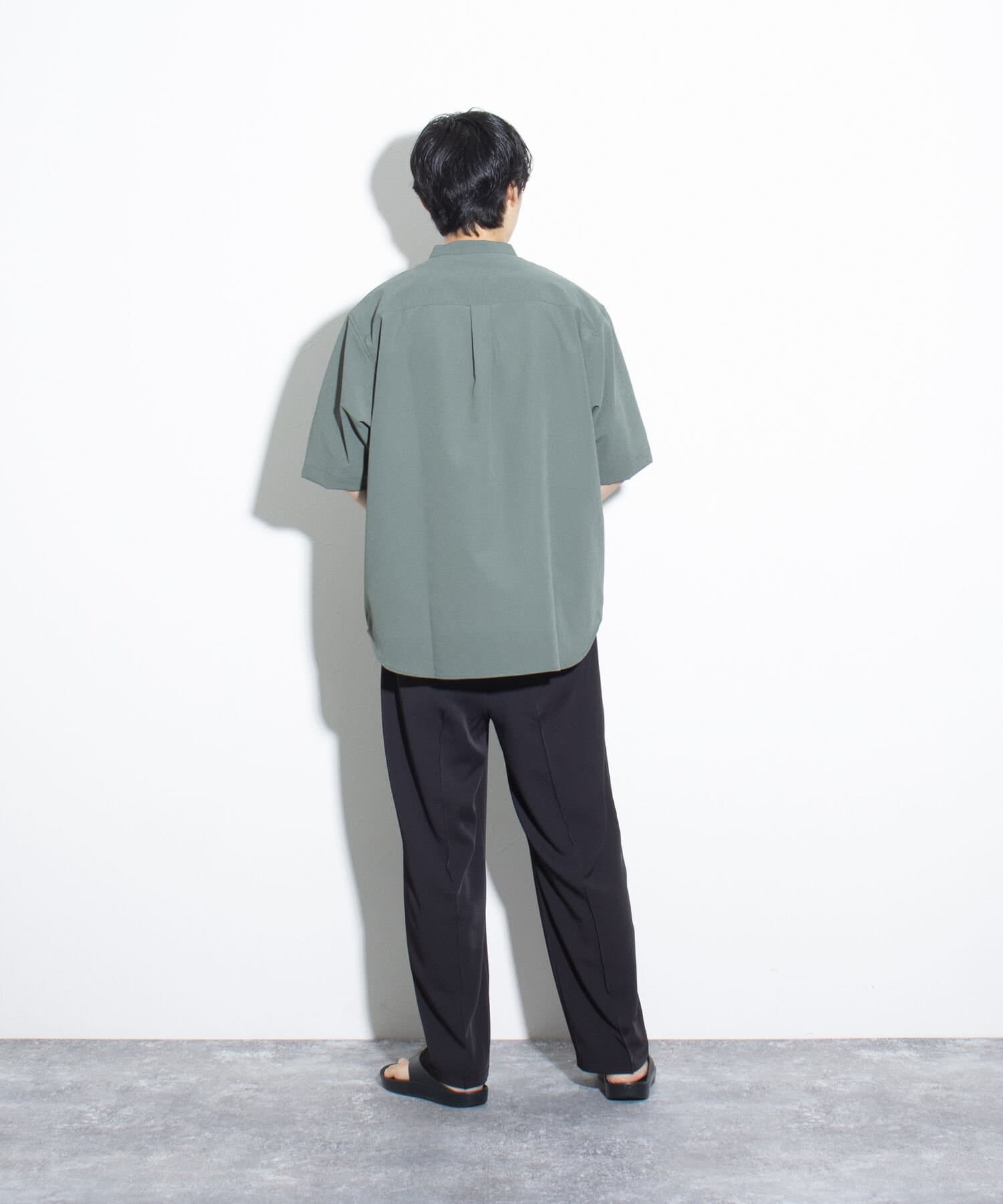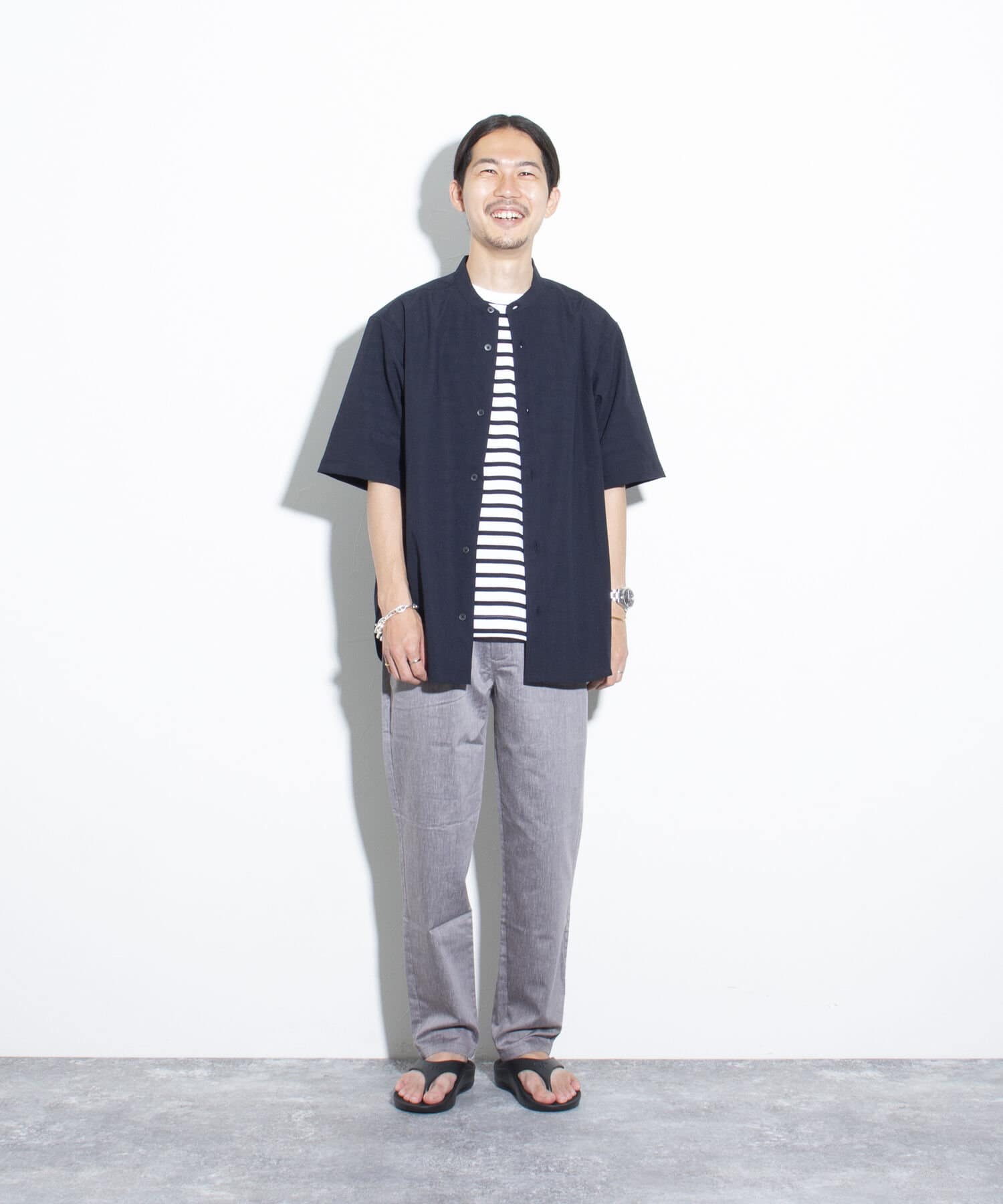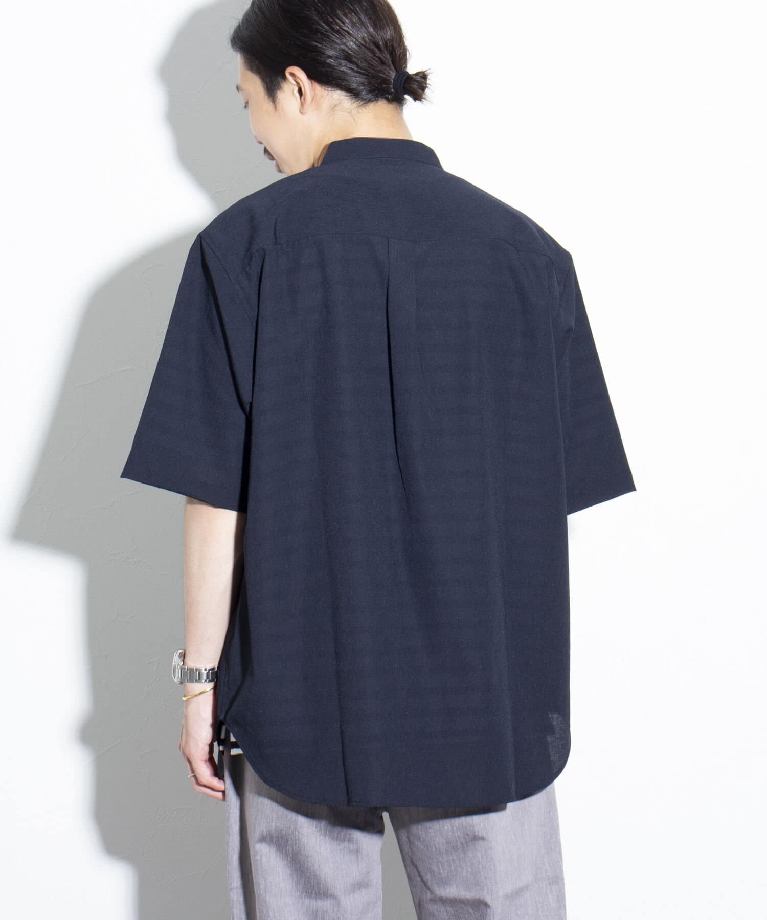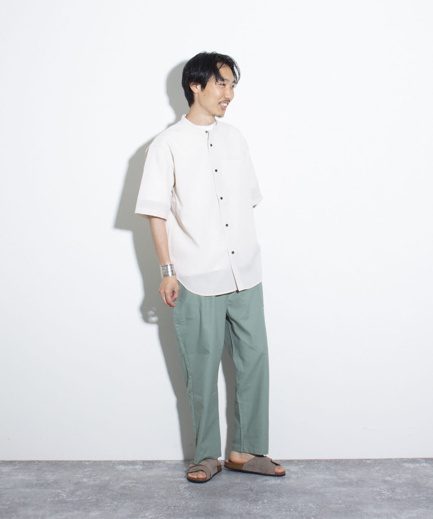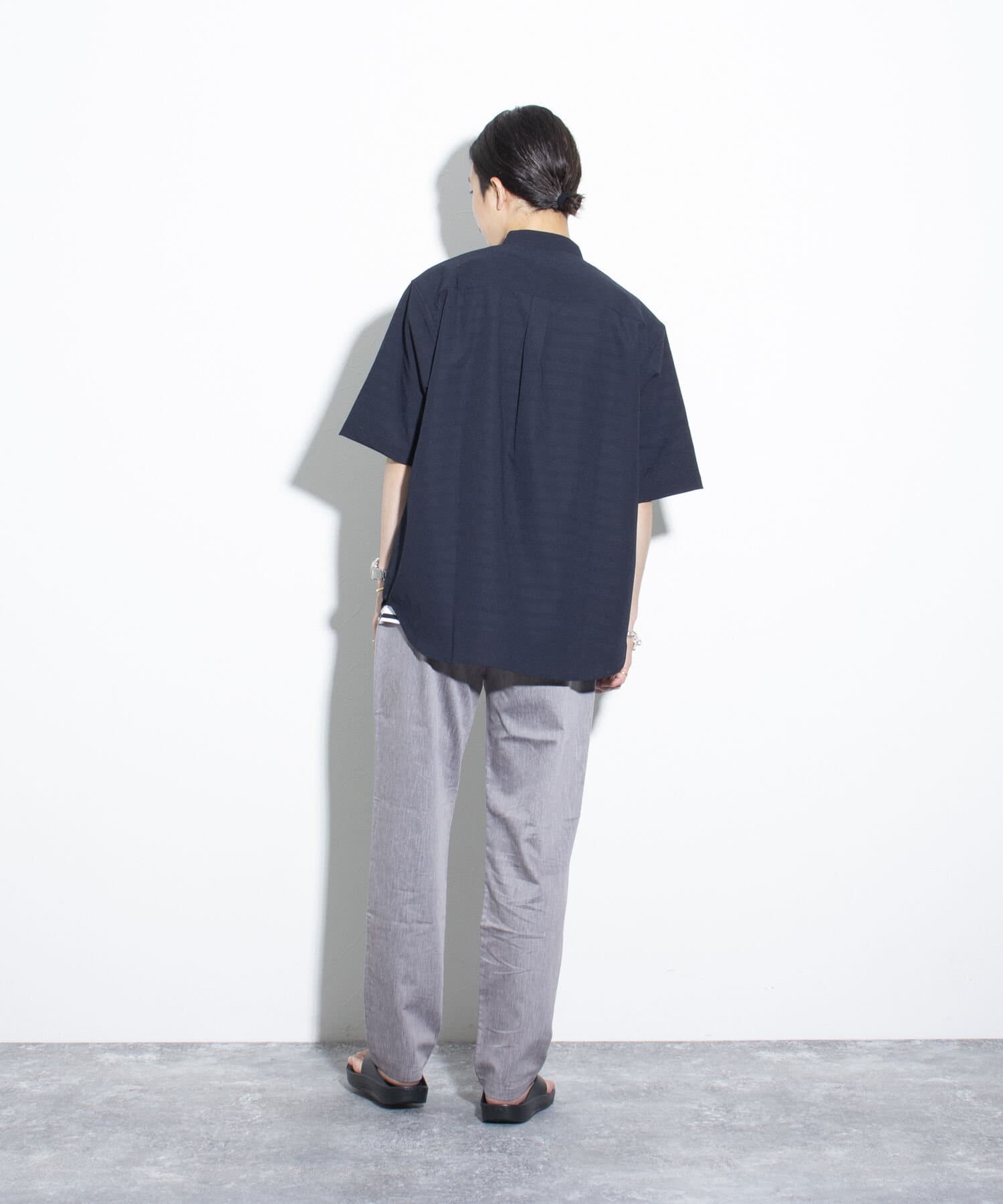時代に合わせややゆったりめなサイズ感に設定したバンドカラーシャツ。