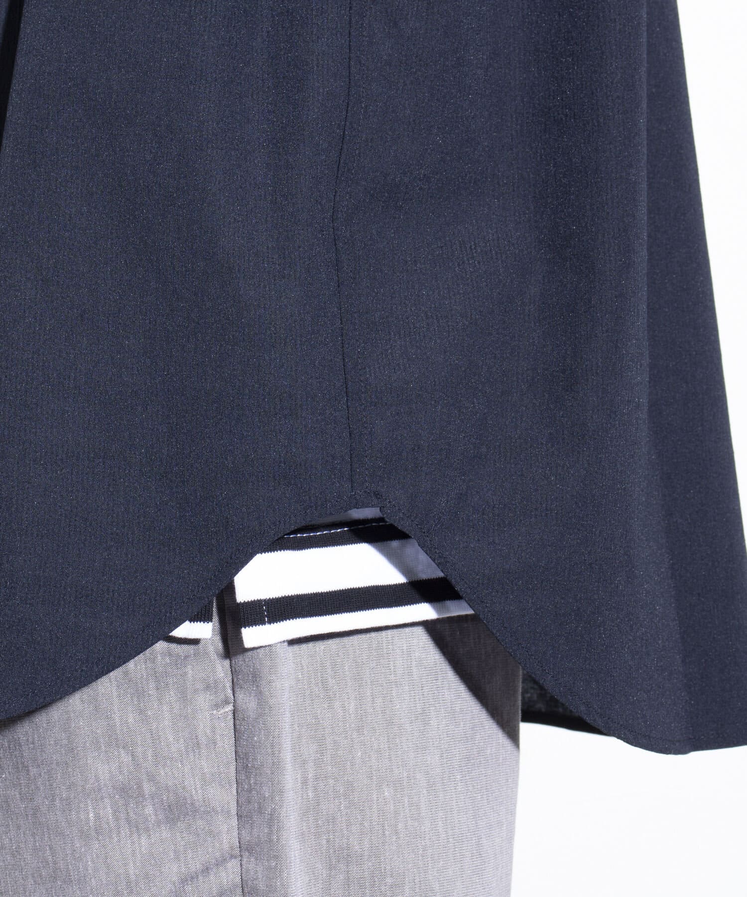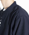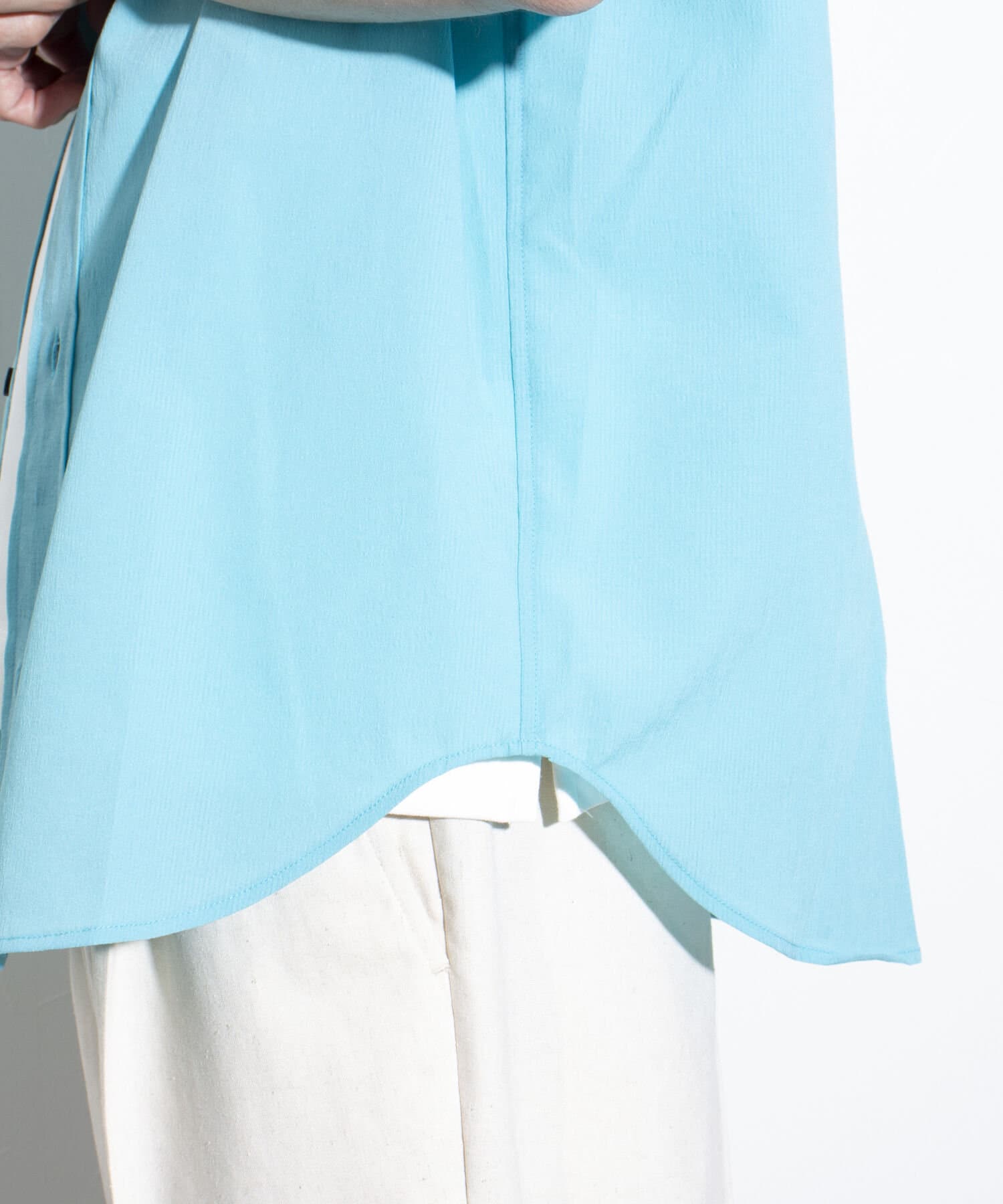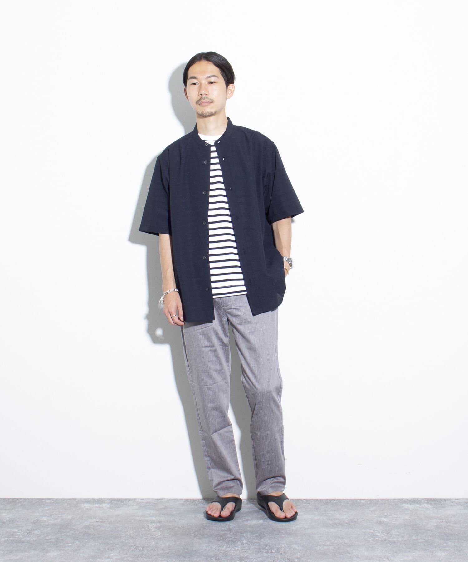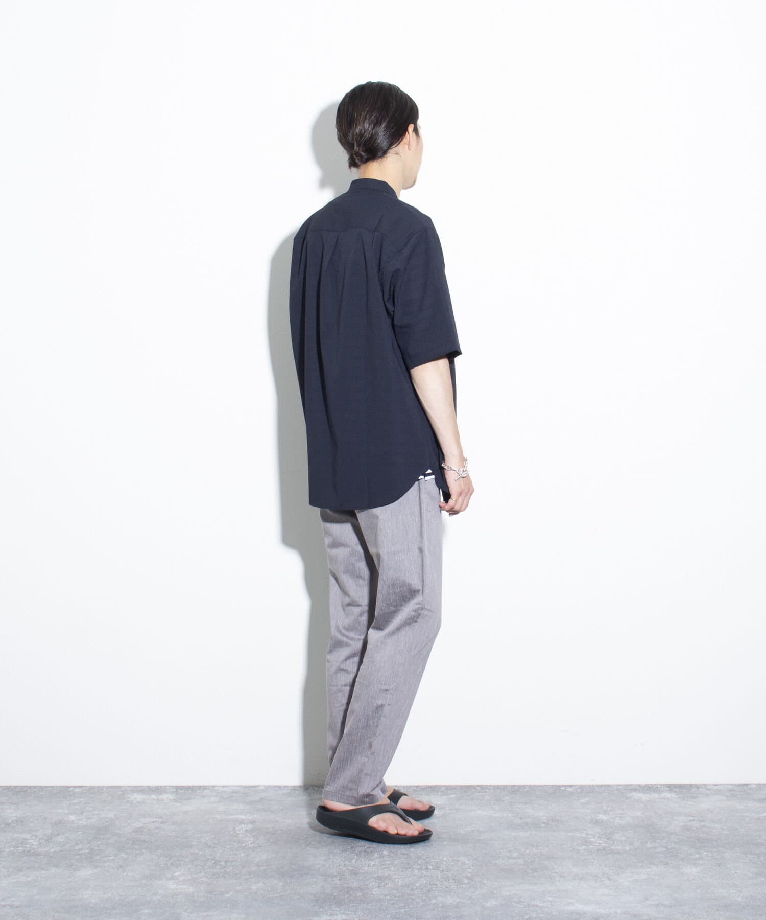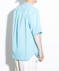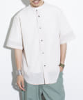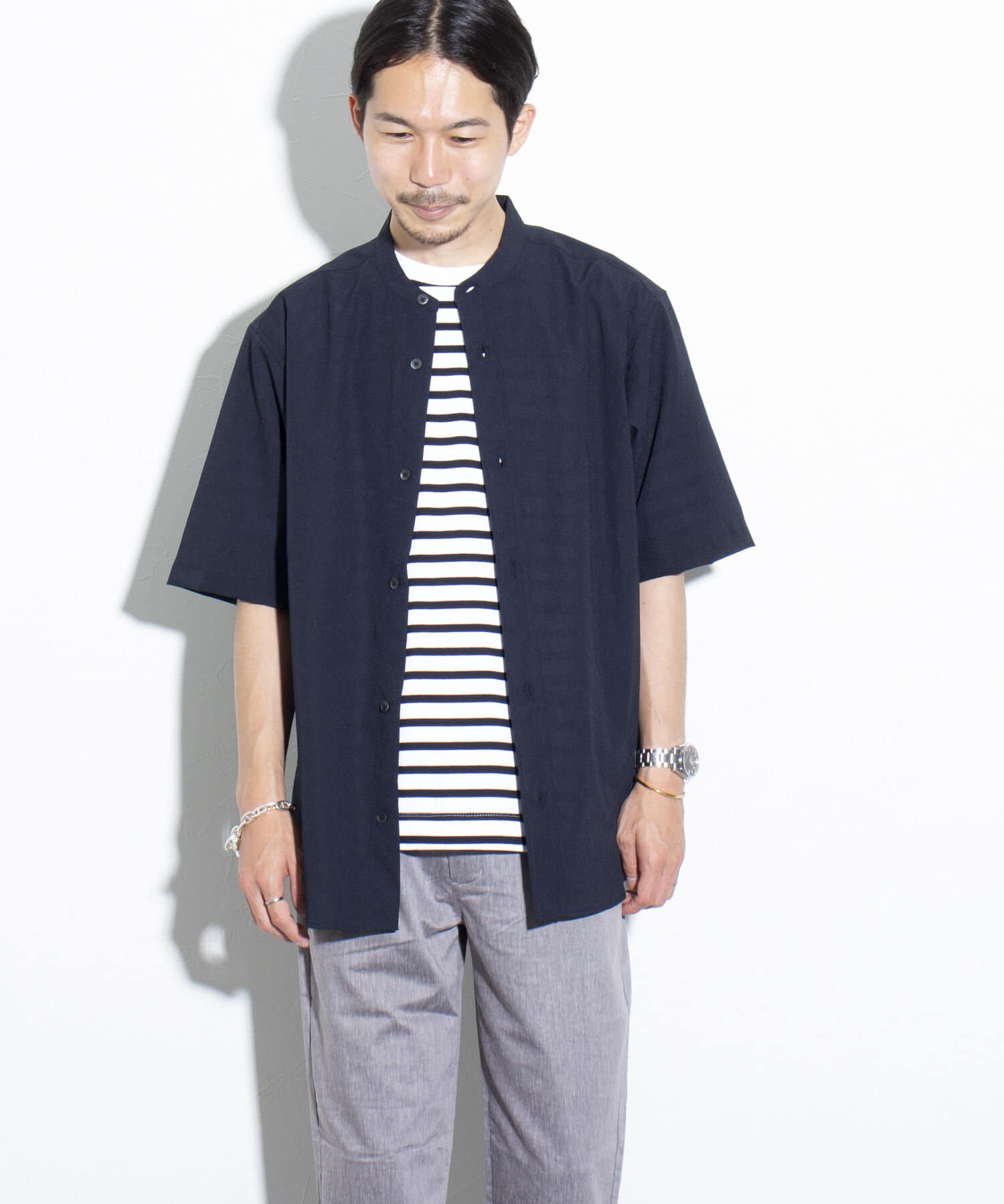 時代に合わせややゆったりめなサイズ感に設定したバンドカラーシャツ。