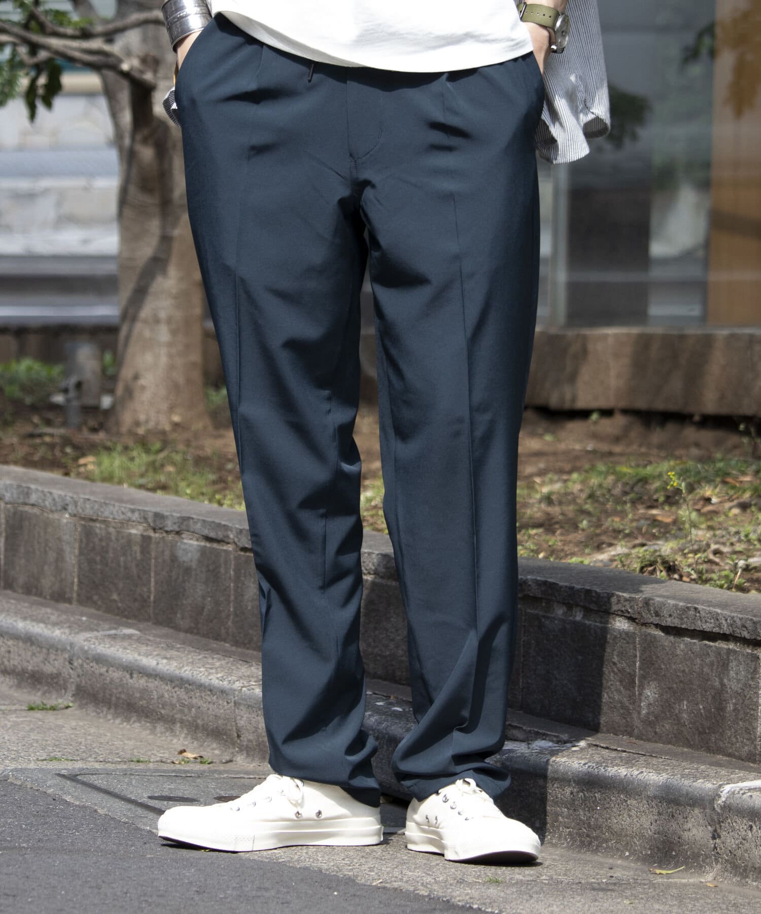 ワンタックに深めの股上、ストレッチ性でリラックスした履き心地です。