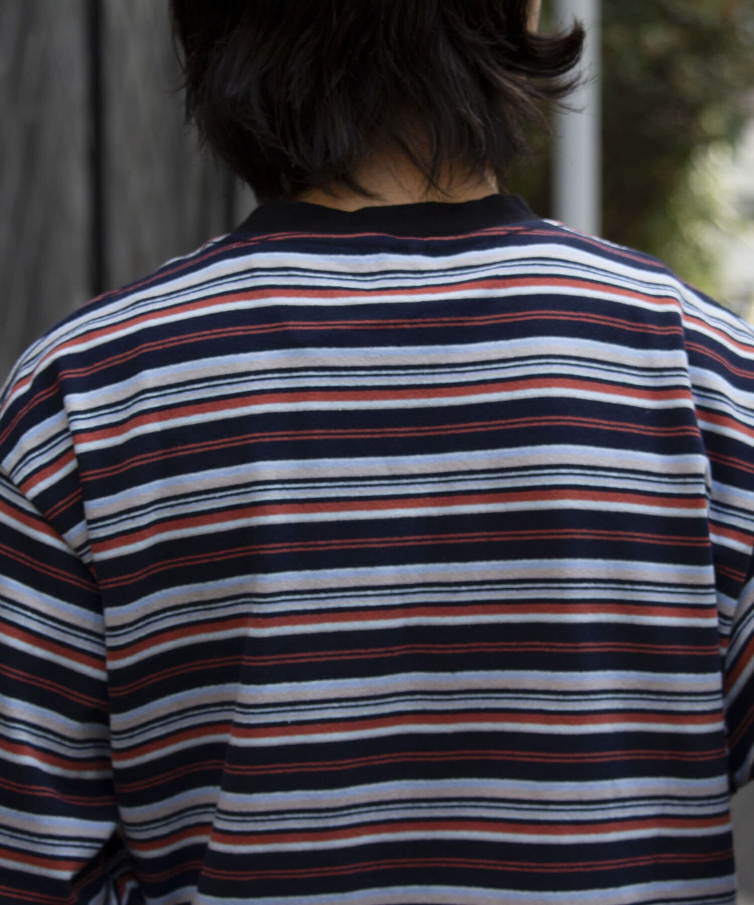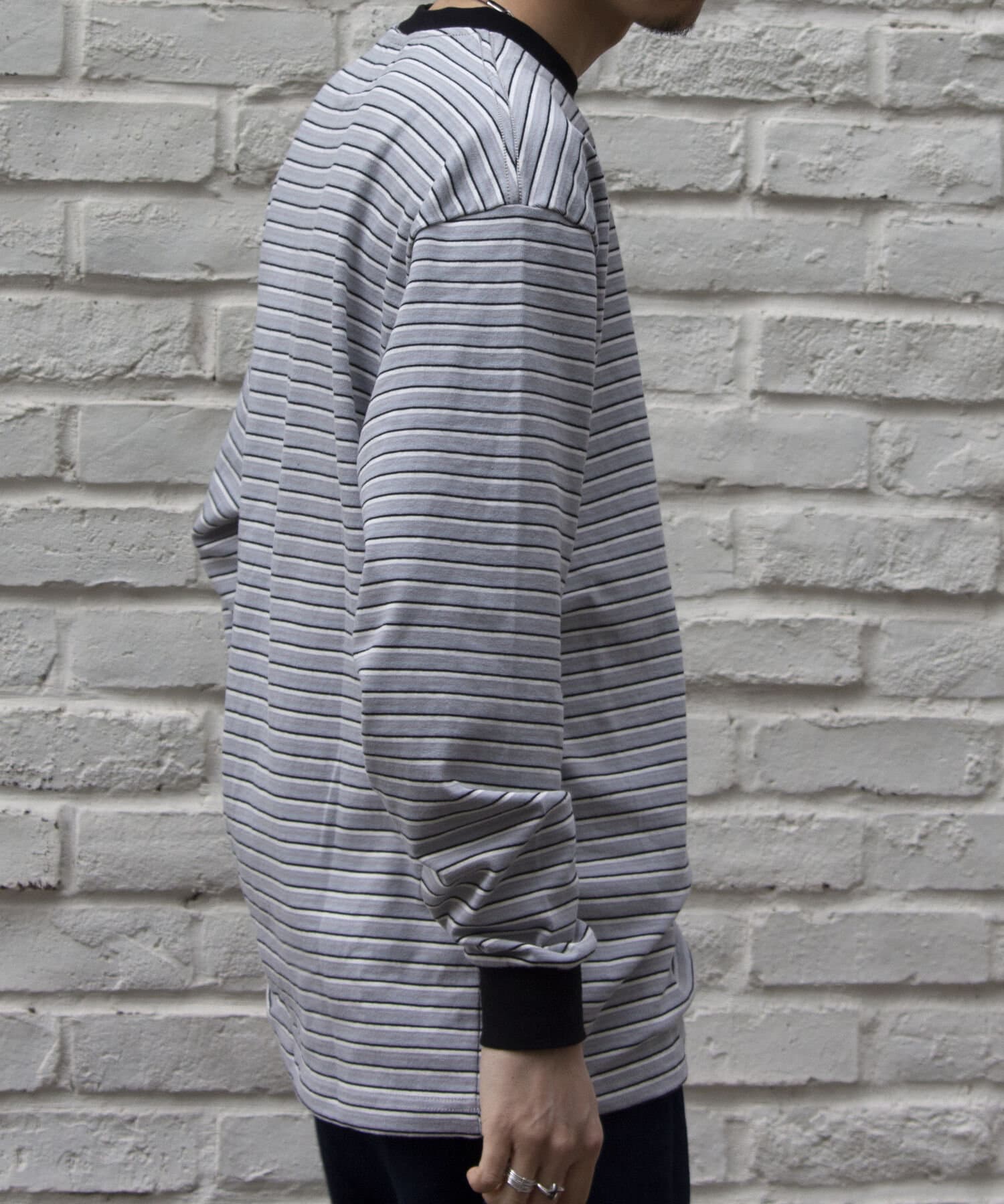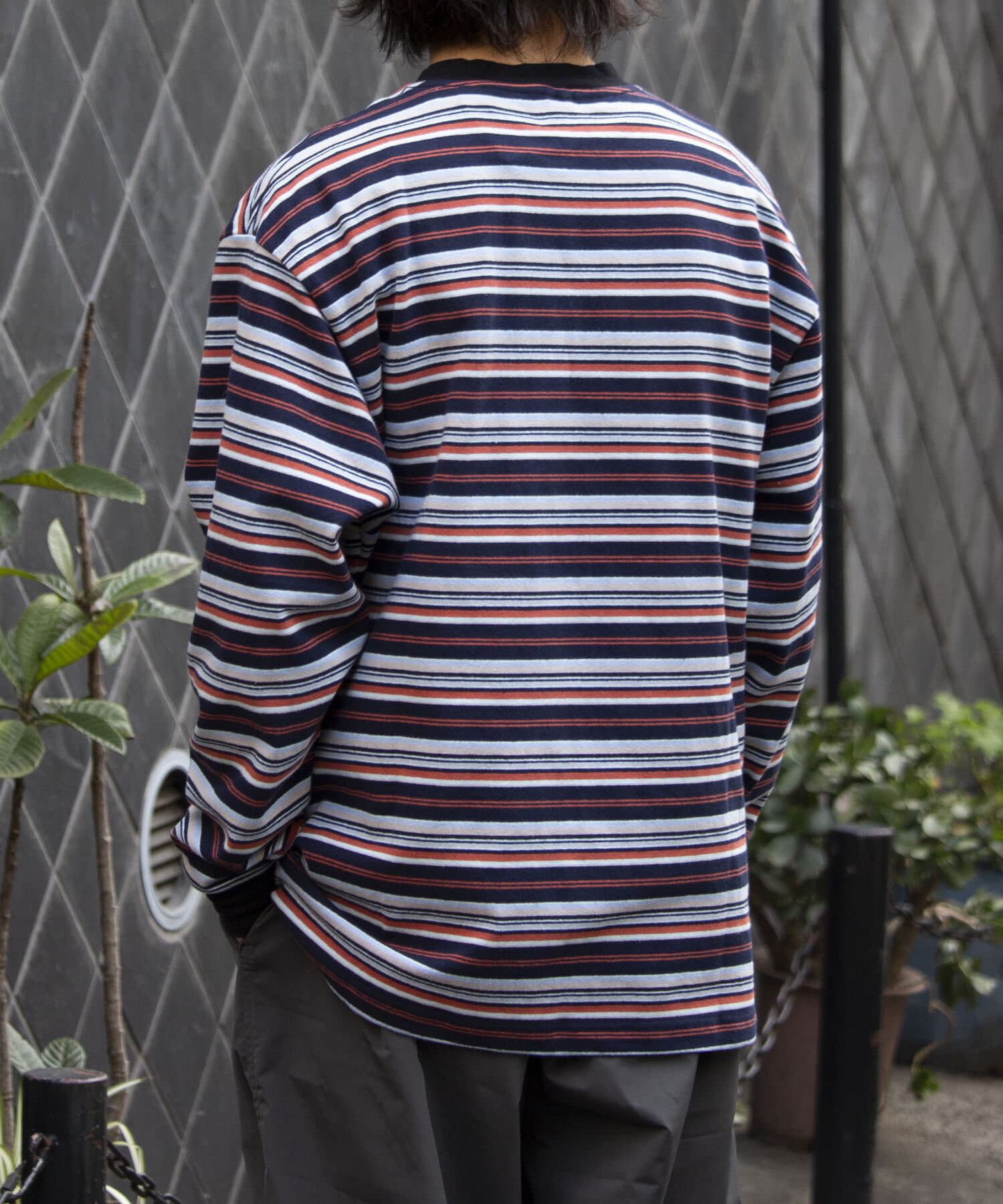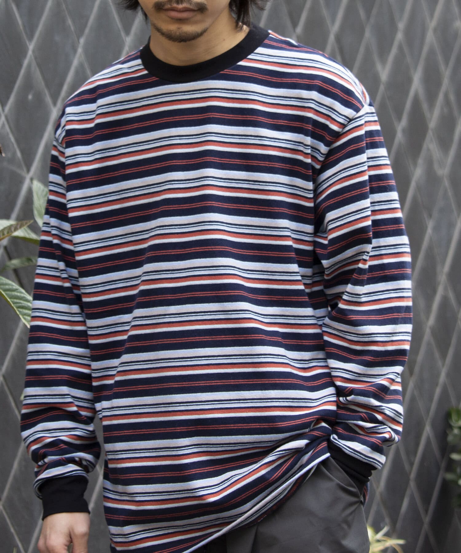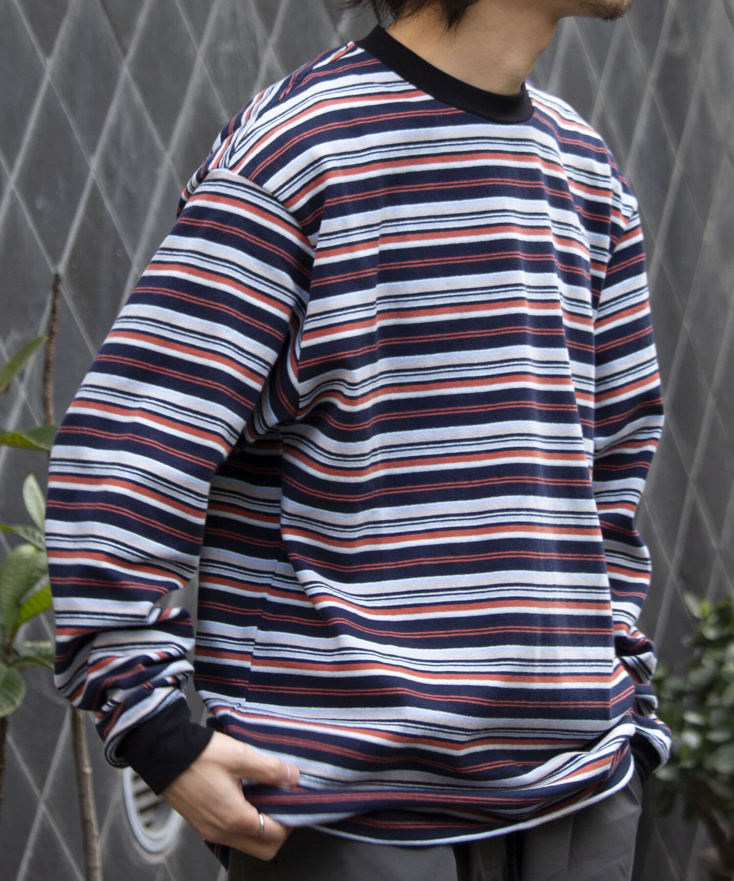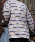 およそ9オンスのヘビーウェイト生地からなる、マルチボーダーのロンTです。