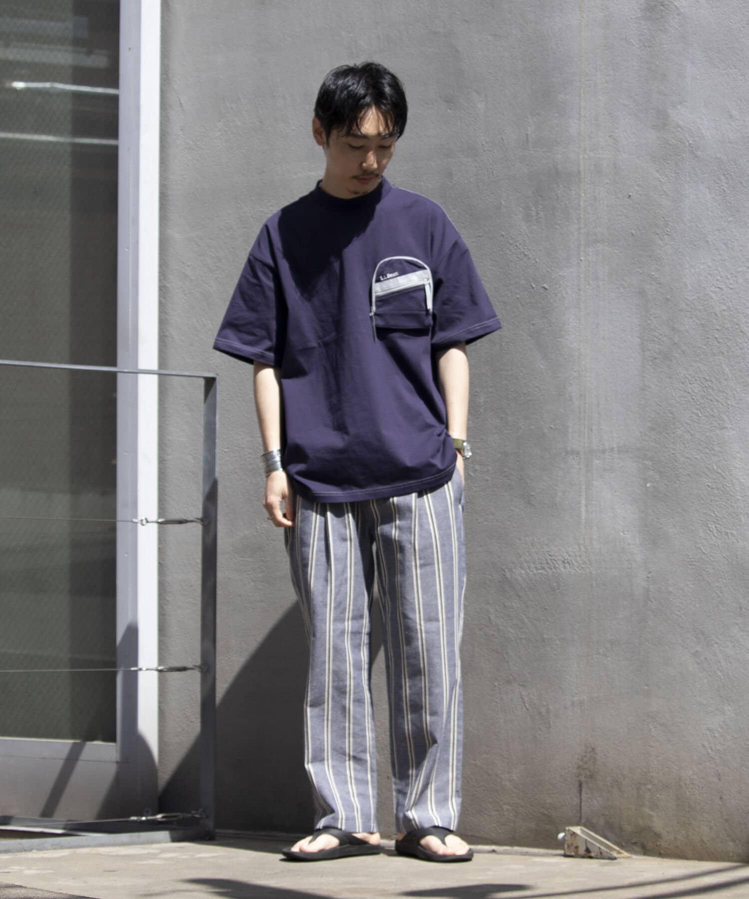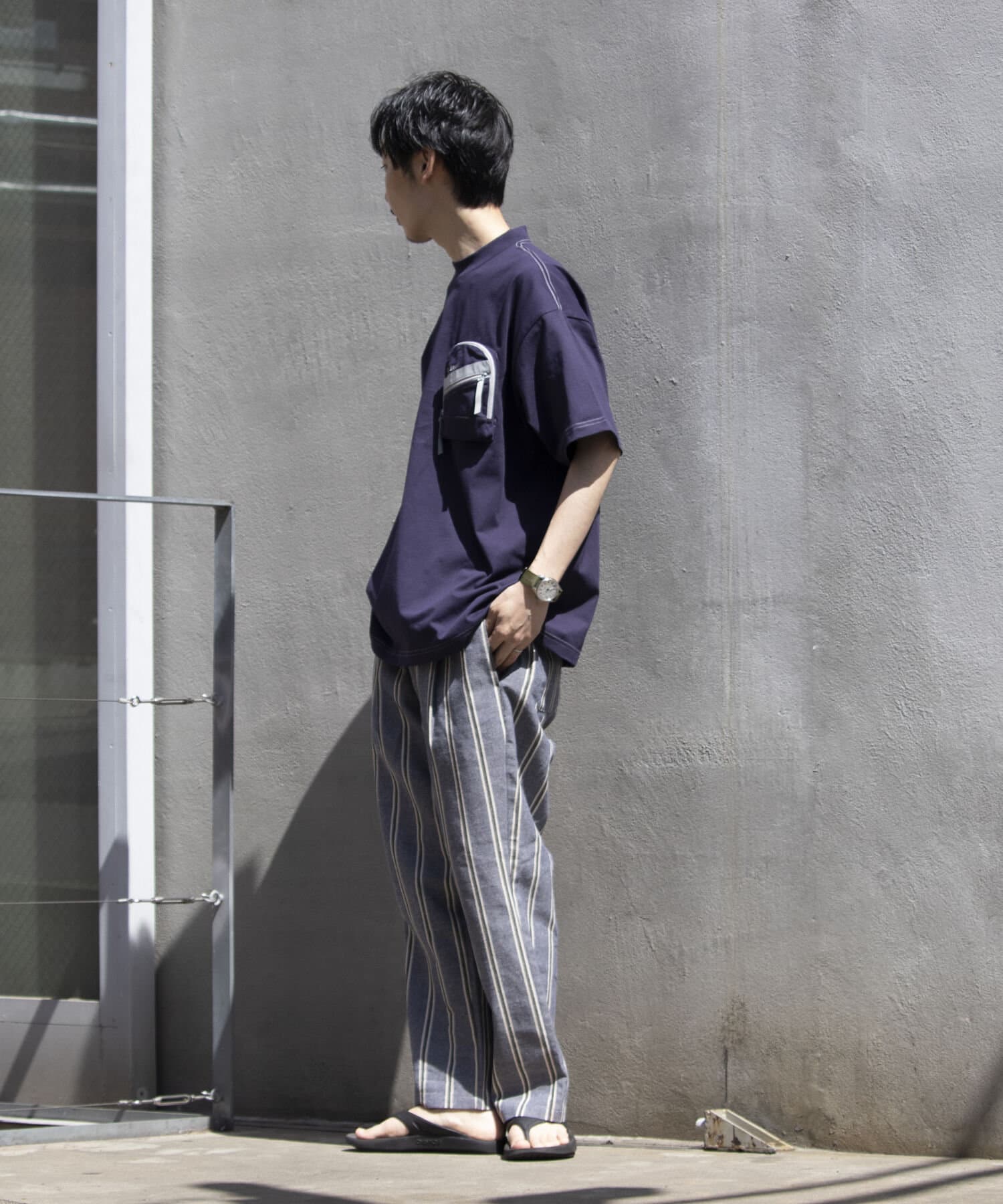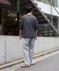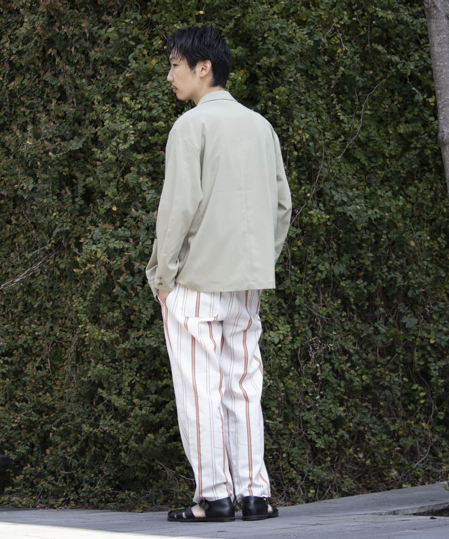 シンプルなイージーシルエット、ヒップ周りに程よい余裕を持たせ、裾に向けて程よくテーパードしたシルエットです。