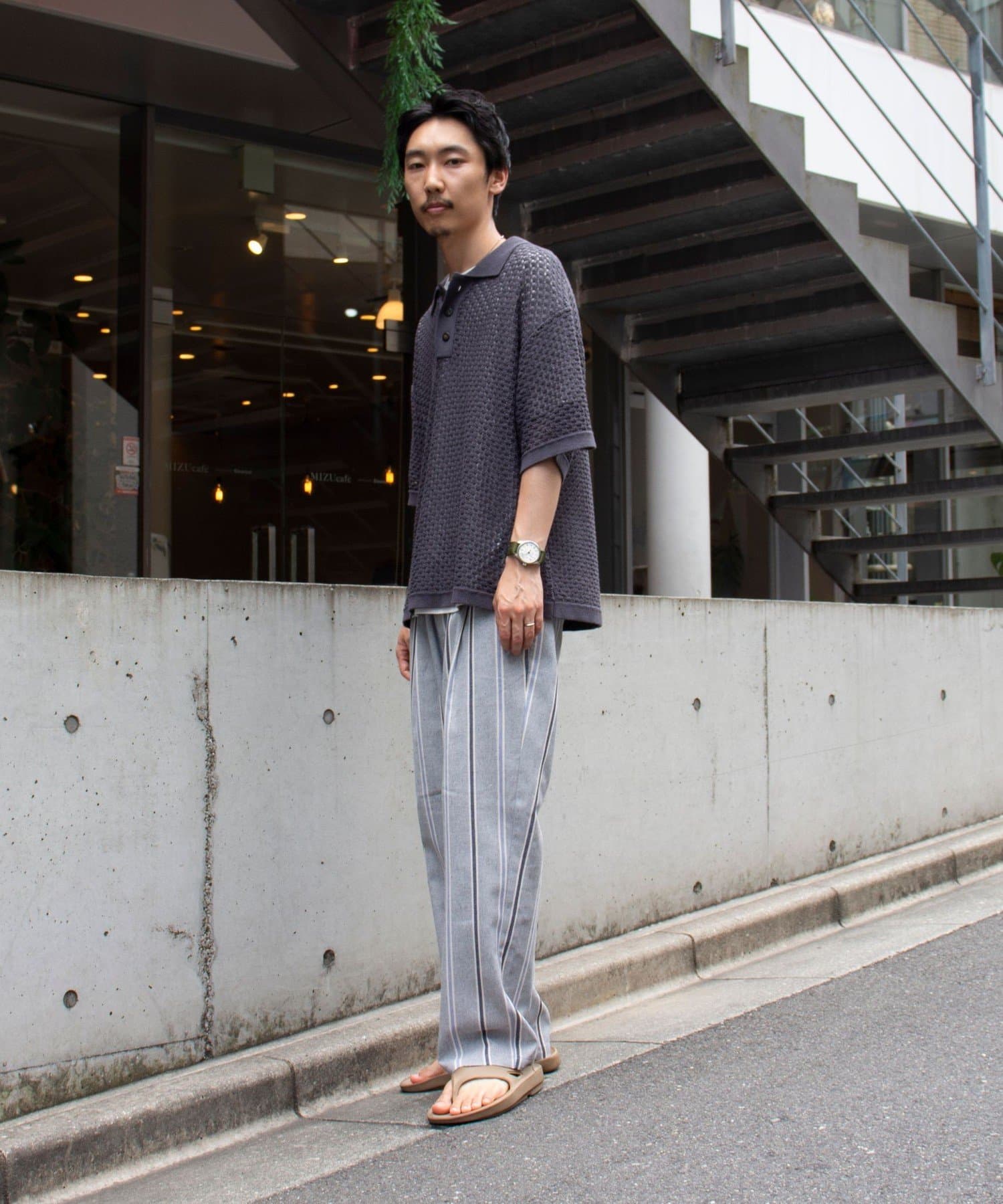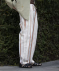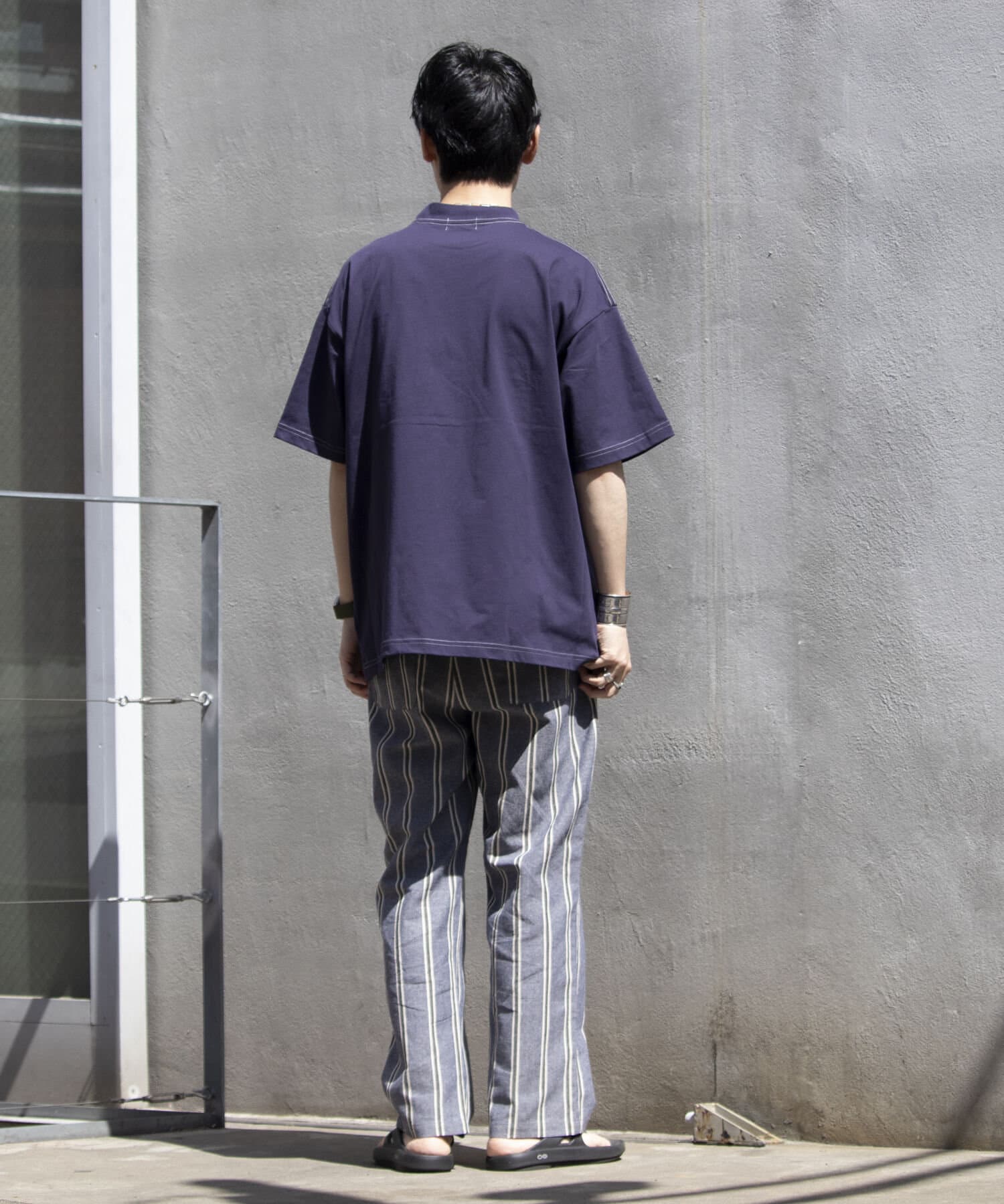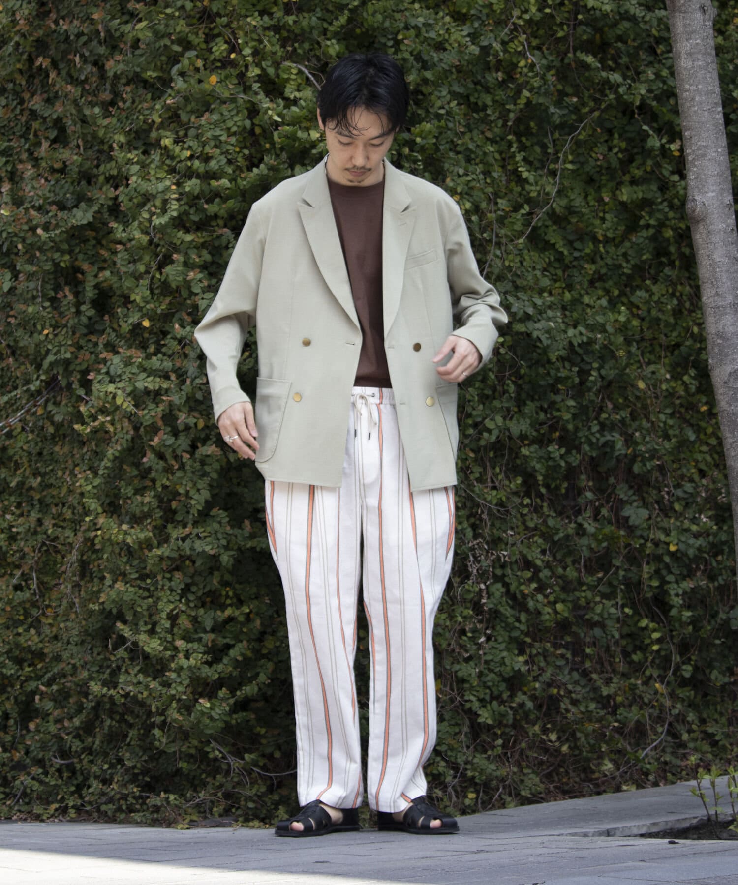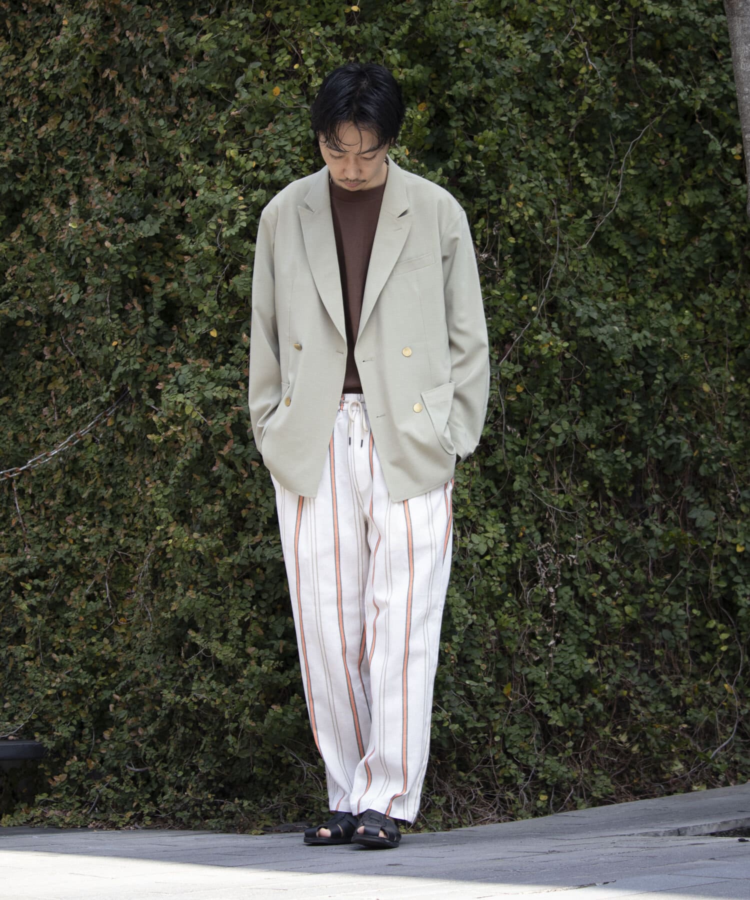 シンプルなイージーシルエット、ヒップ周りに程よい余裕を持たせ、裾に向けて程よくテーパードしたシルエットです。