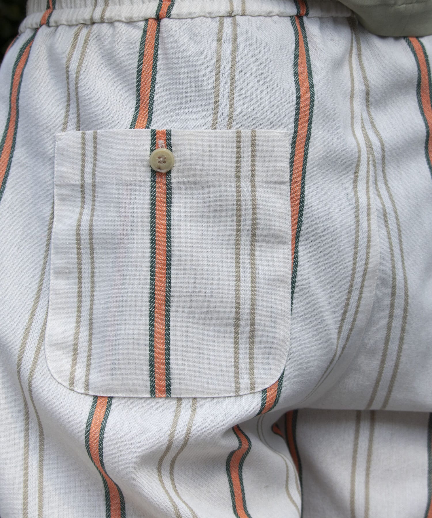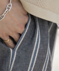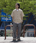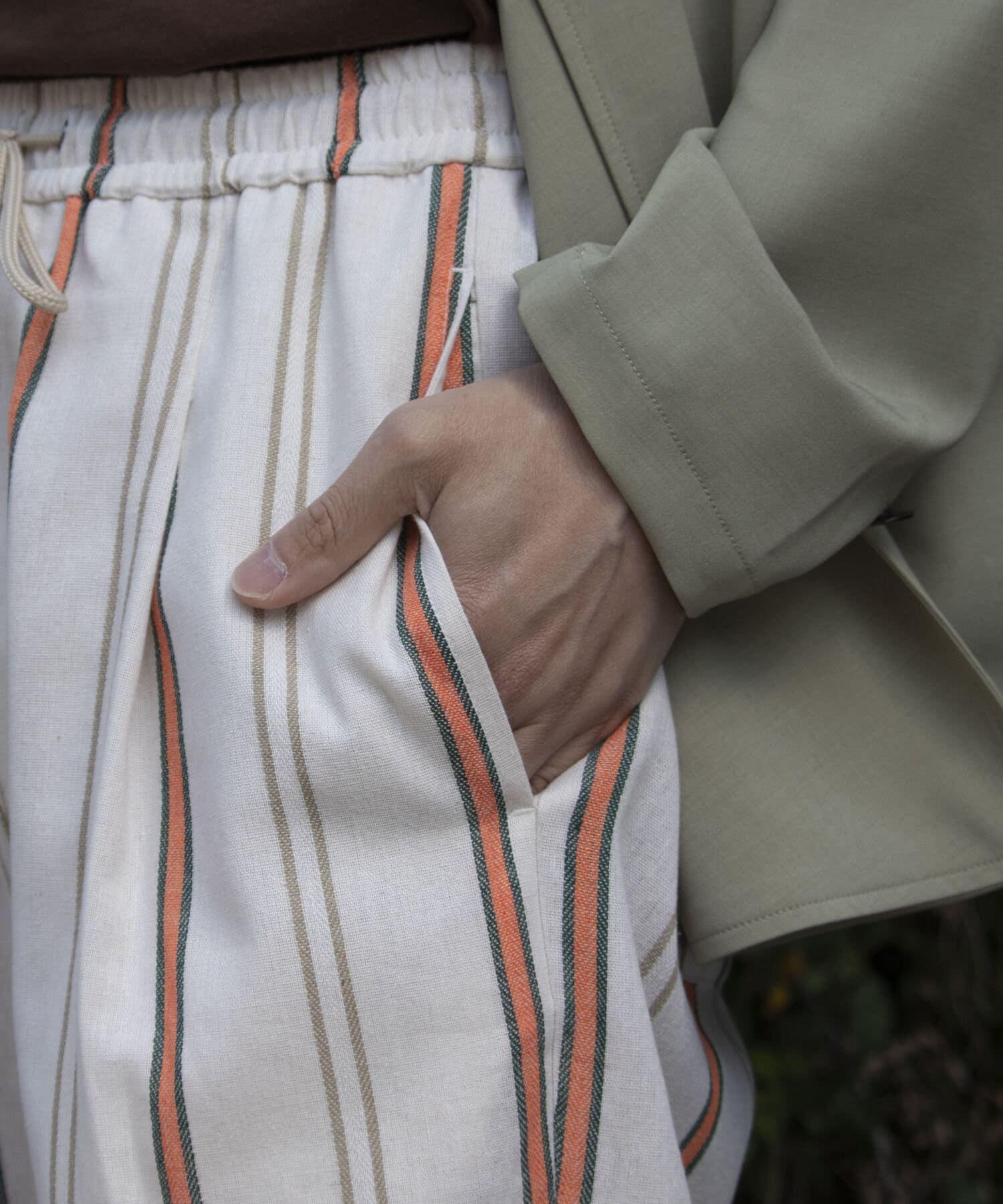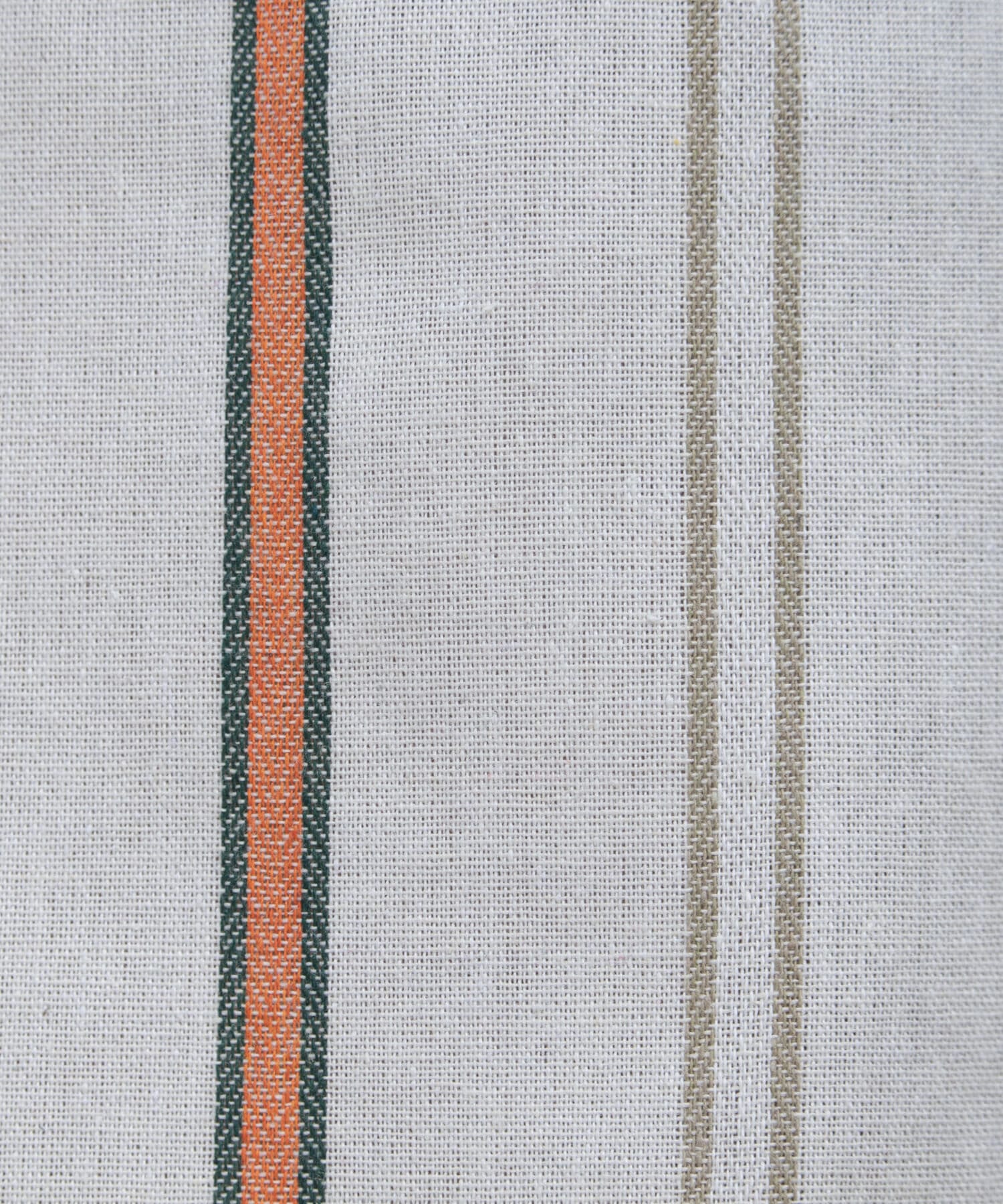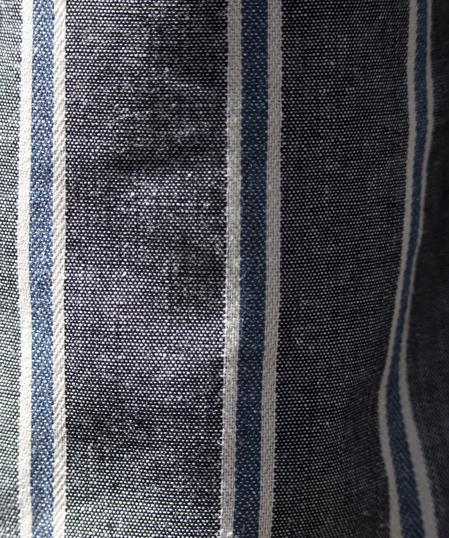 コットン・ポリエステル・リネンの3種の素材で、ナチュラルな風合いに高級感ある微光沢が特徴的なストライプ柄を表現。