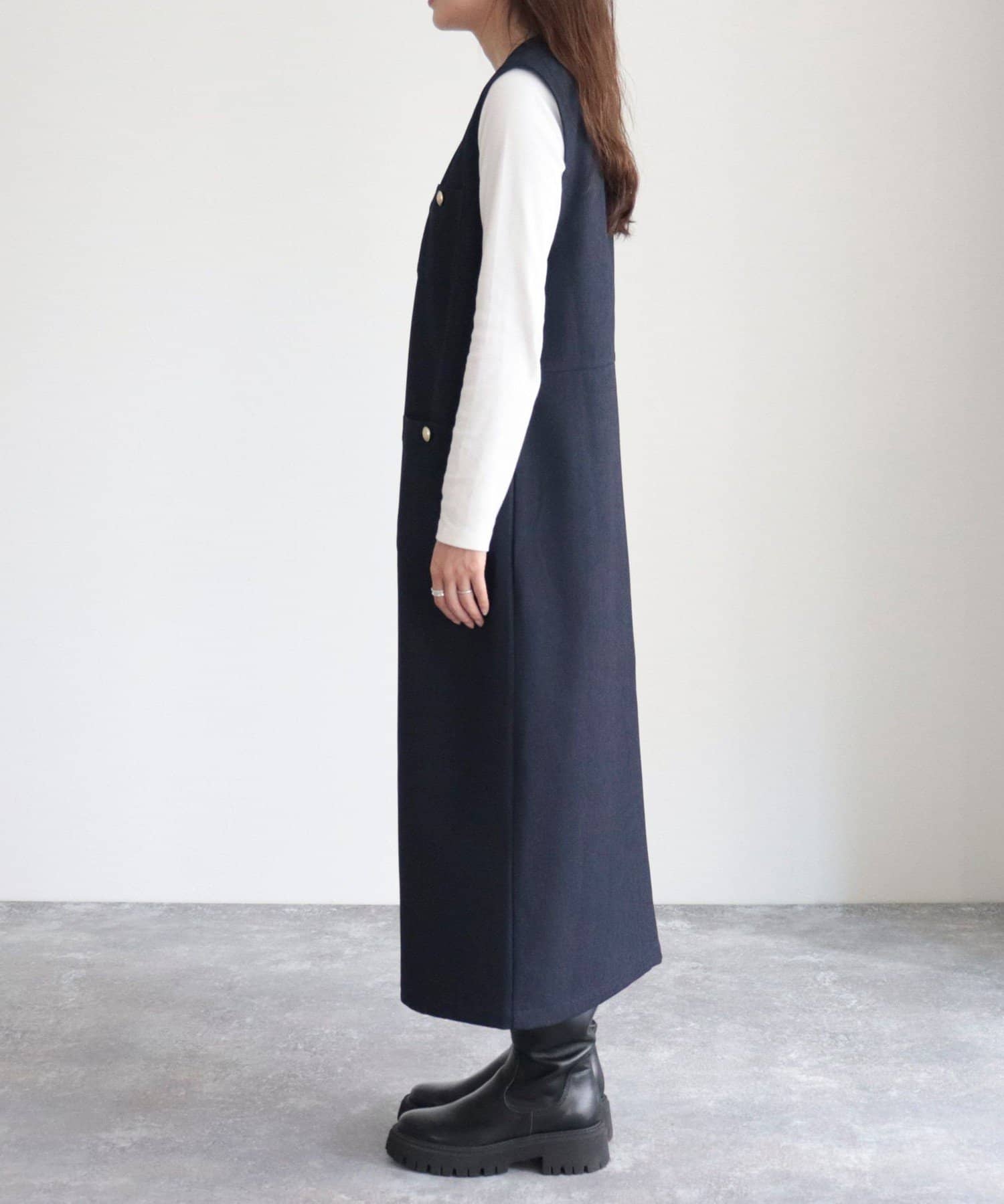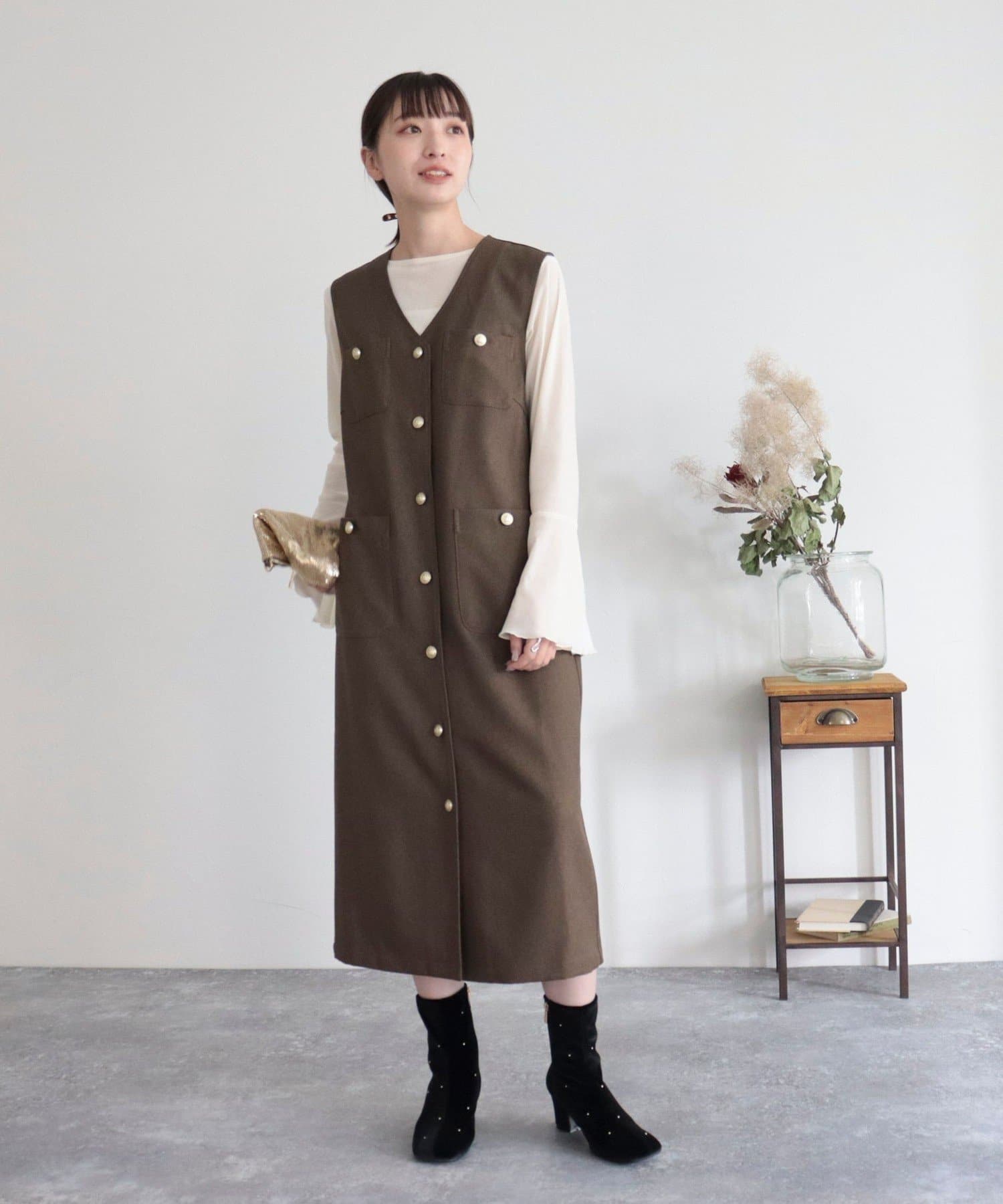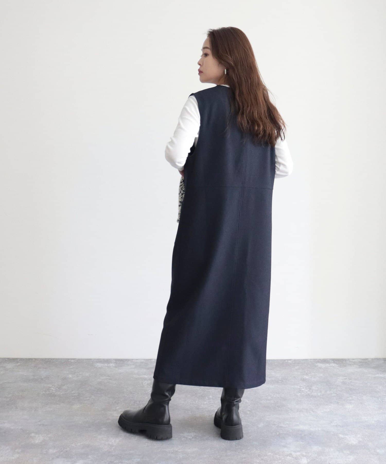 ・ワンピースとしてはもちろん、前を開けてジレとしても着用いただけるのでコーディネートの幅が広がります