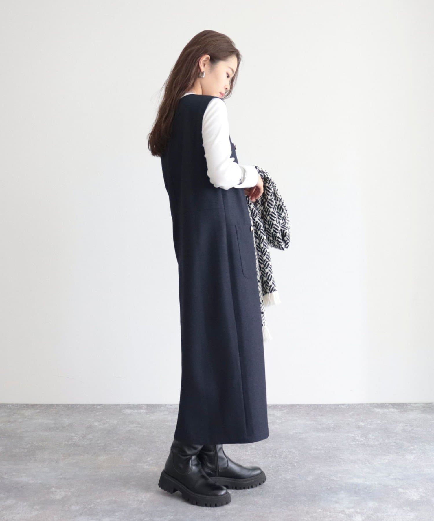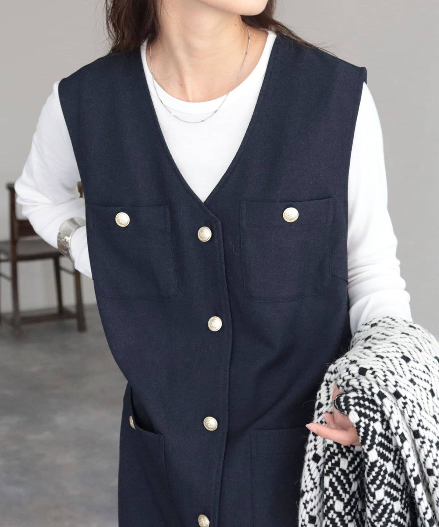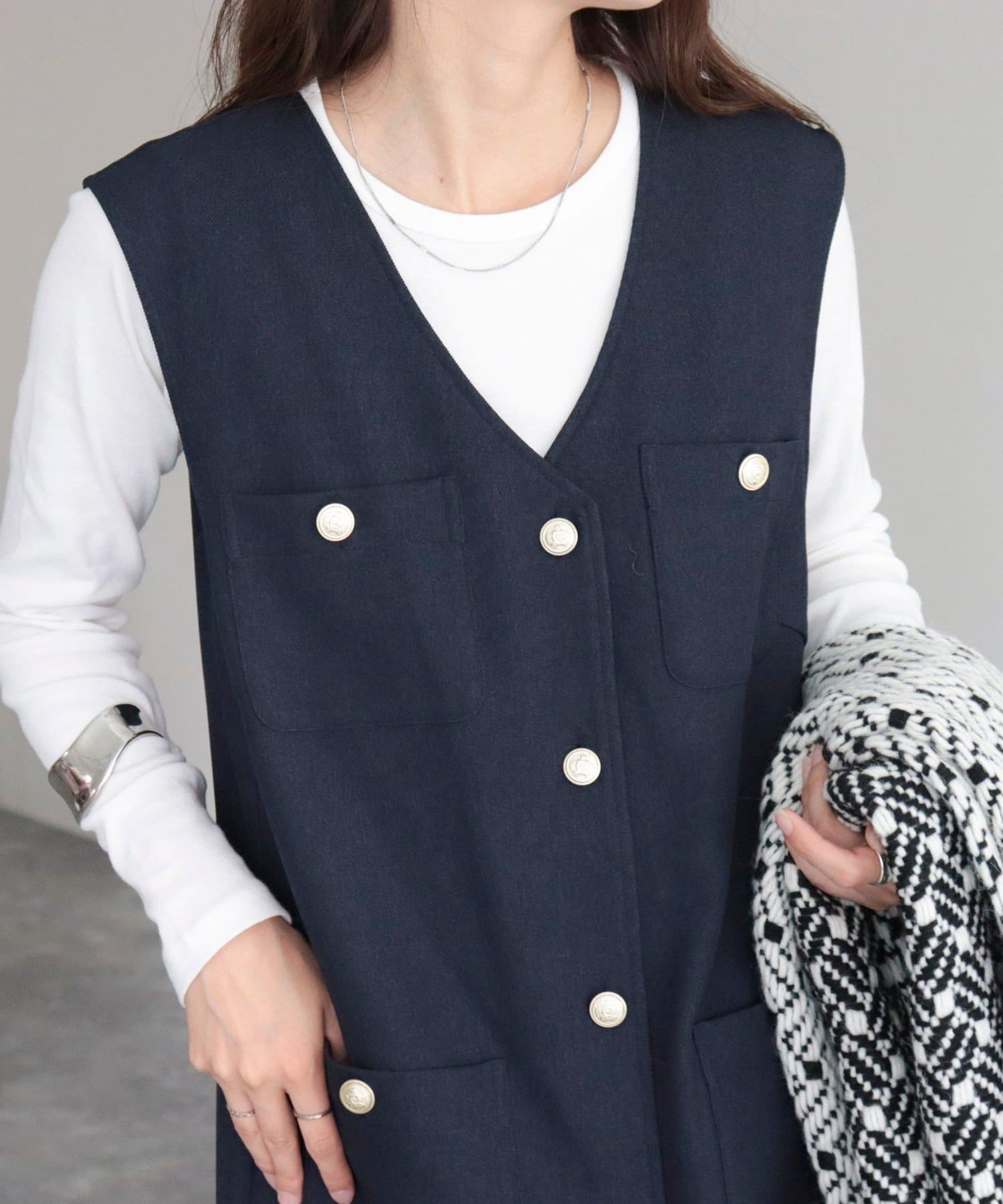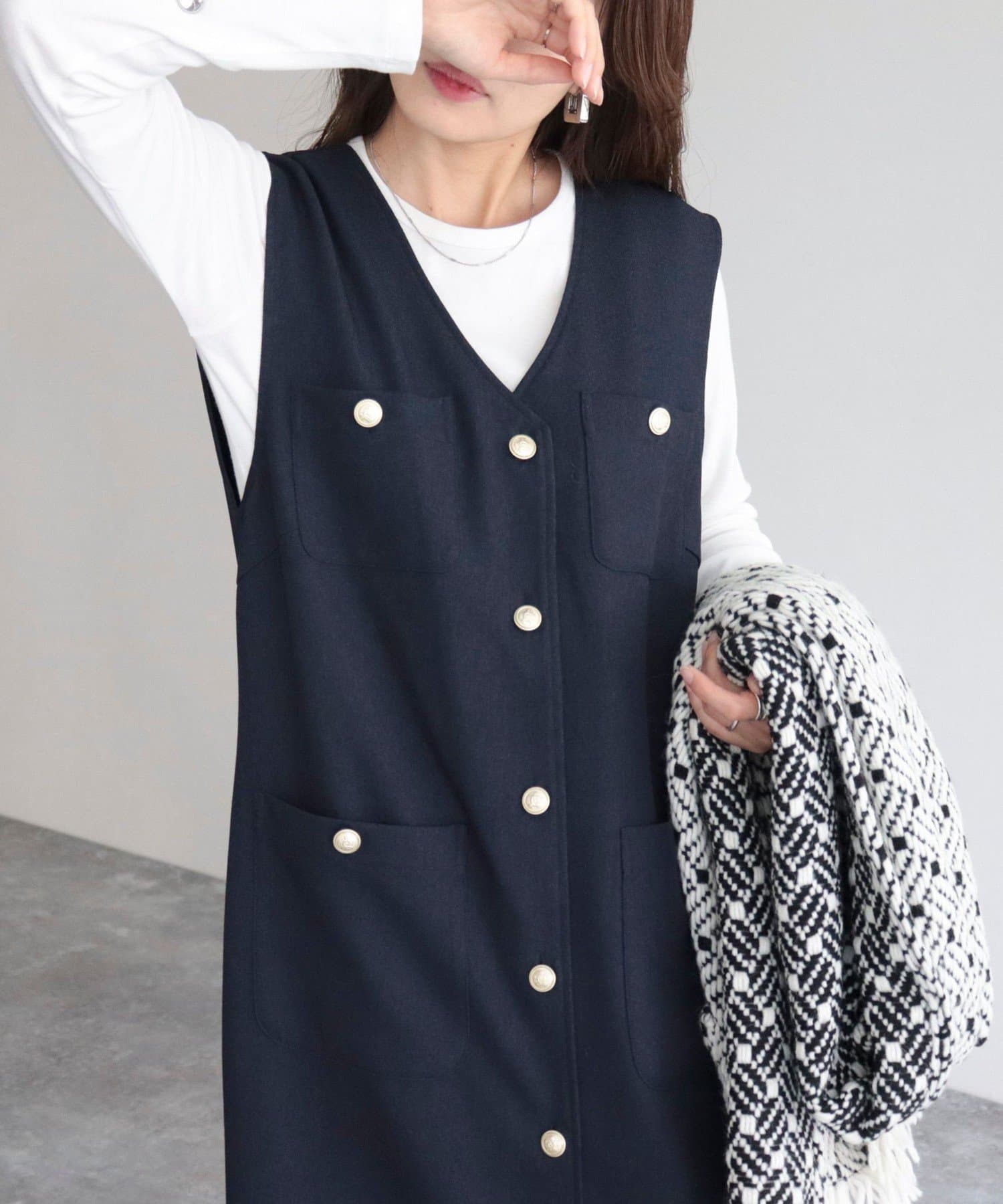 ・ワンピースとしてはもちろん、前を開けてジレとしても着用いただけるのでコーディネートの幅が広がります