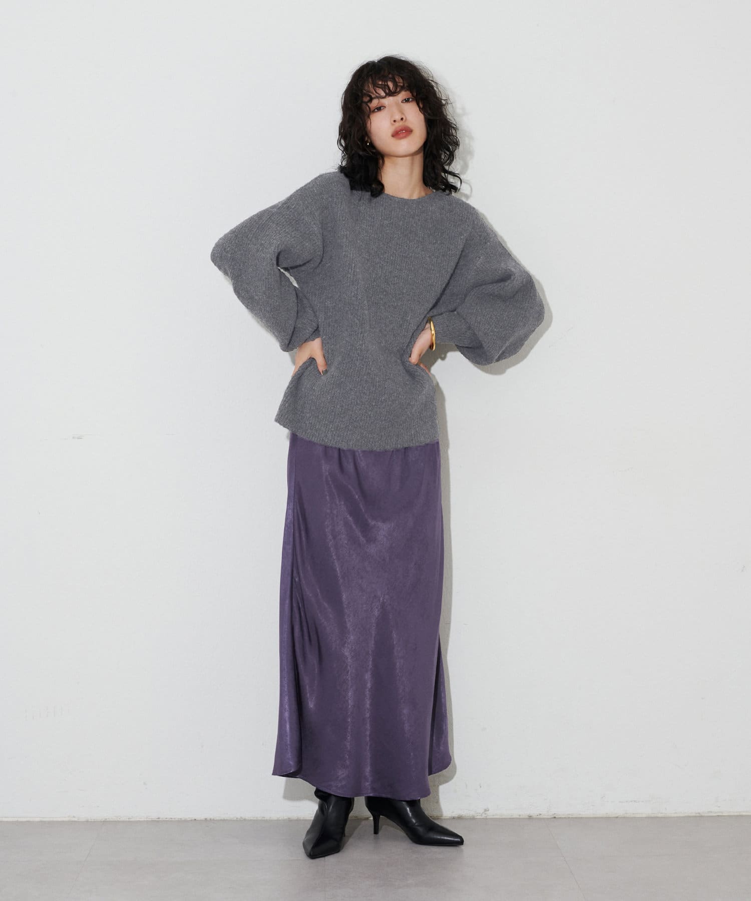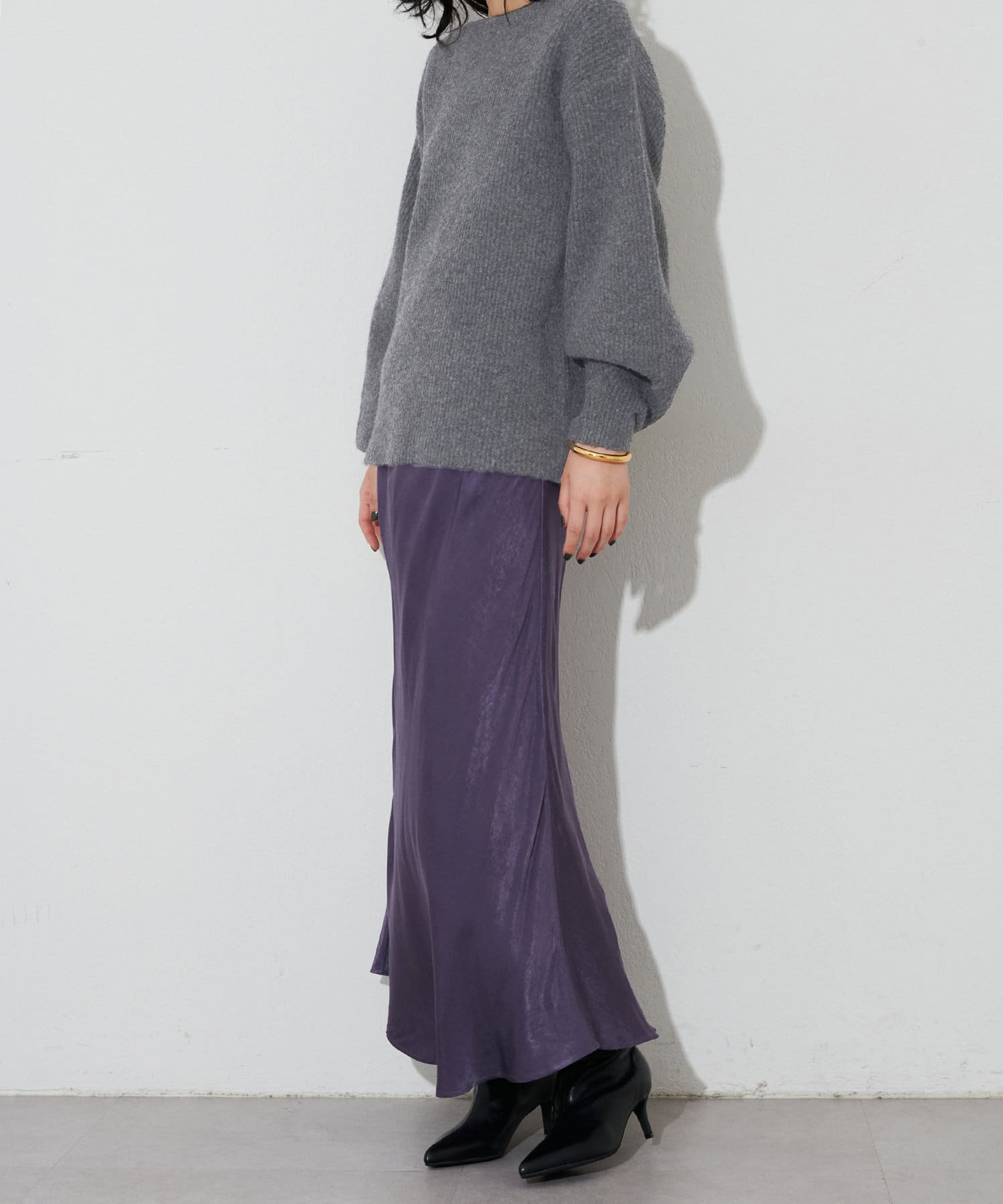 光沢感のある上品なアイテムなので秋冬のニットにはもちろん
