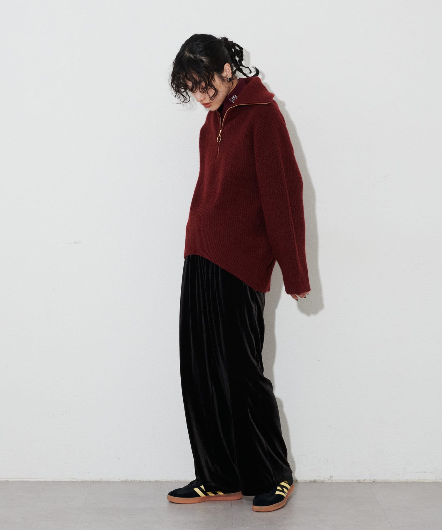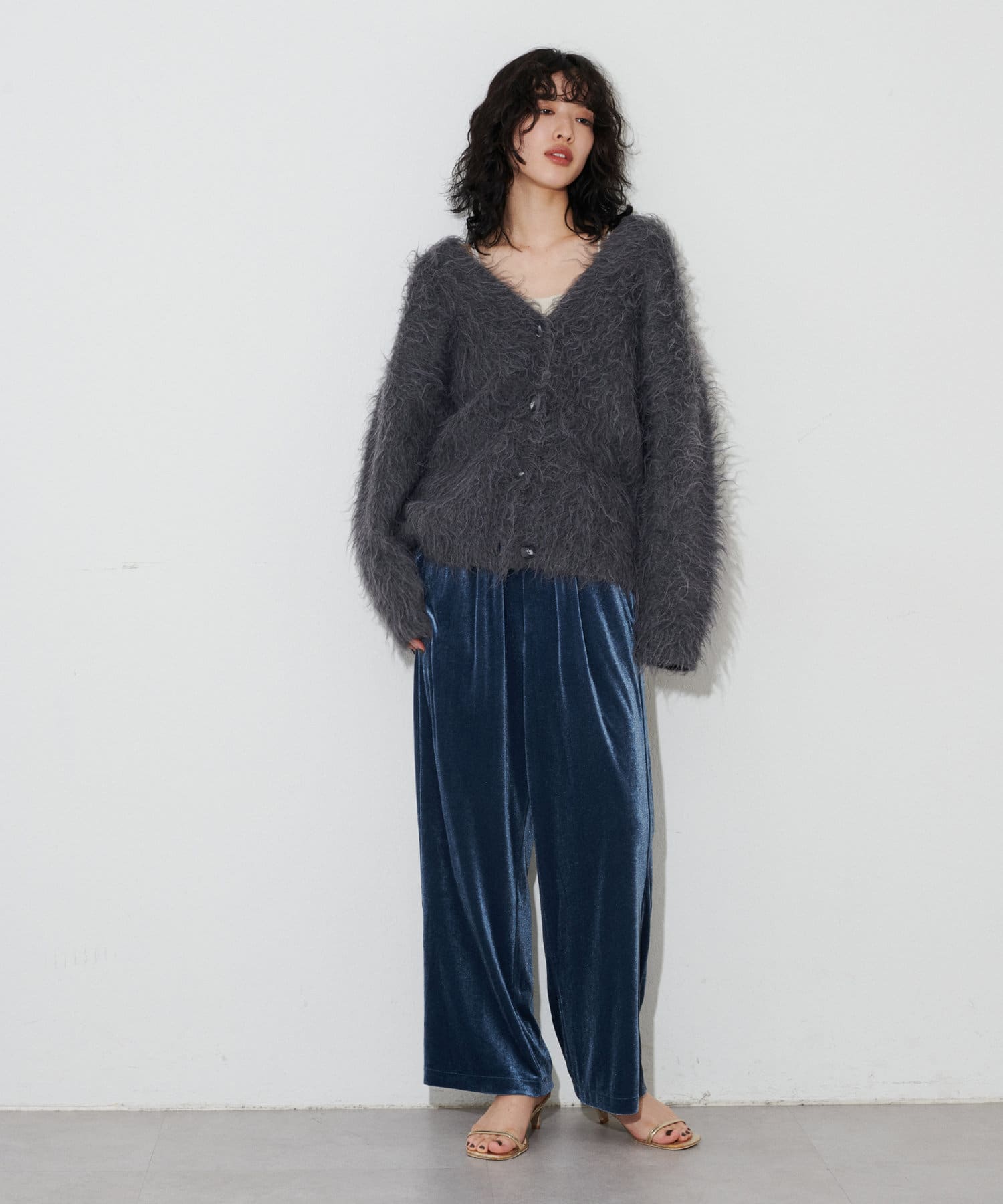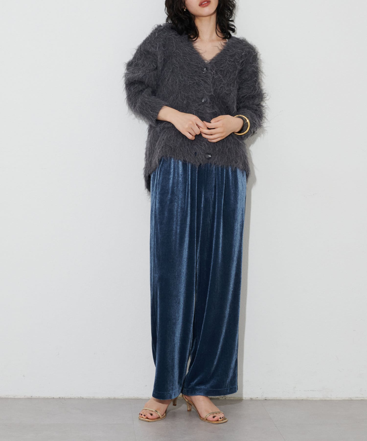 程よい裾幅のベロアワイドパンツ。