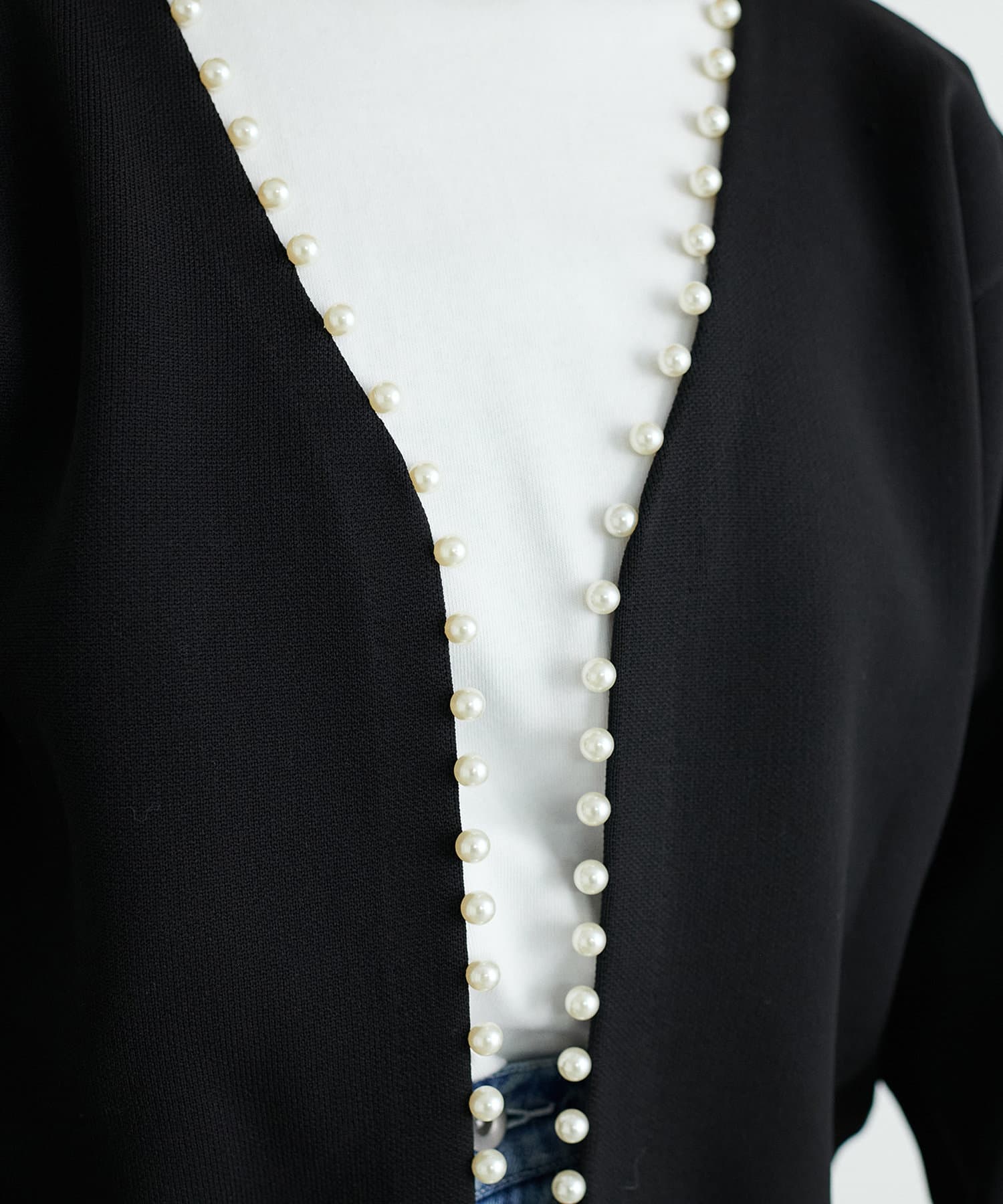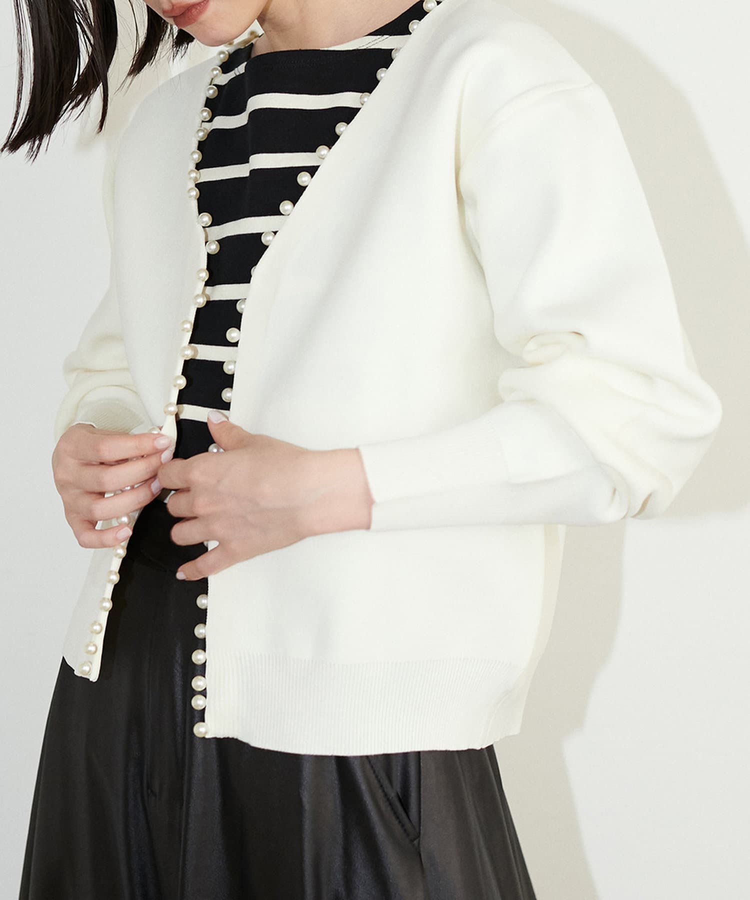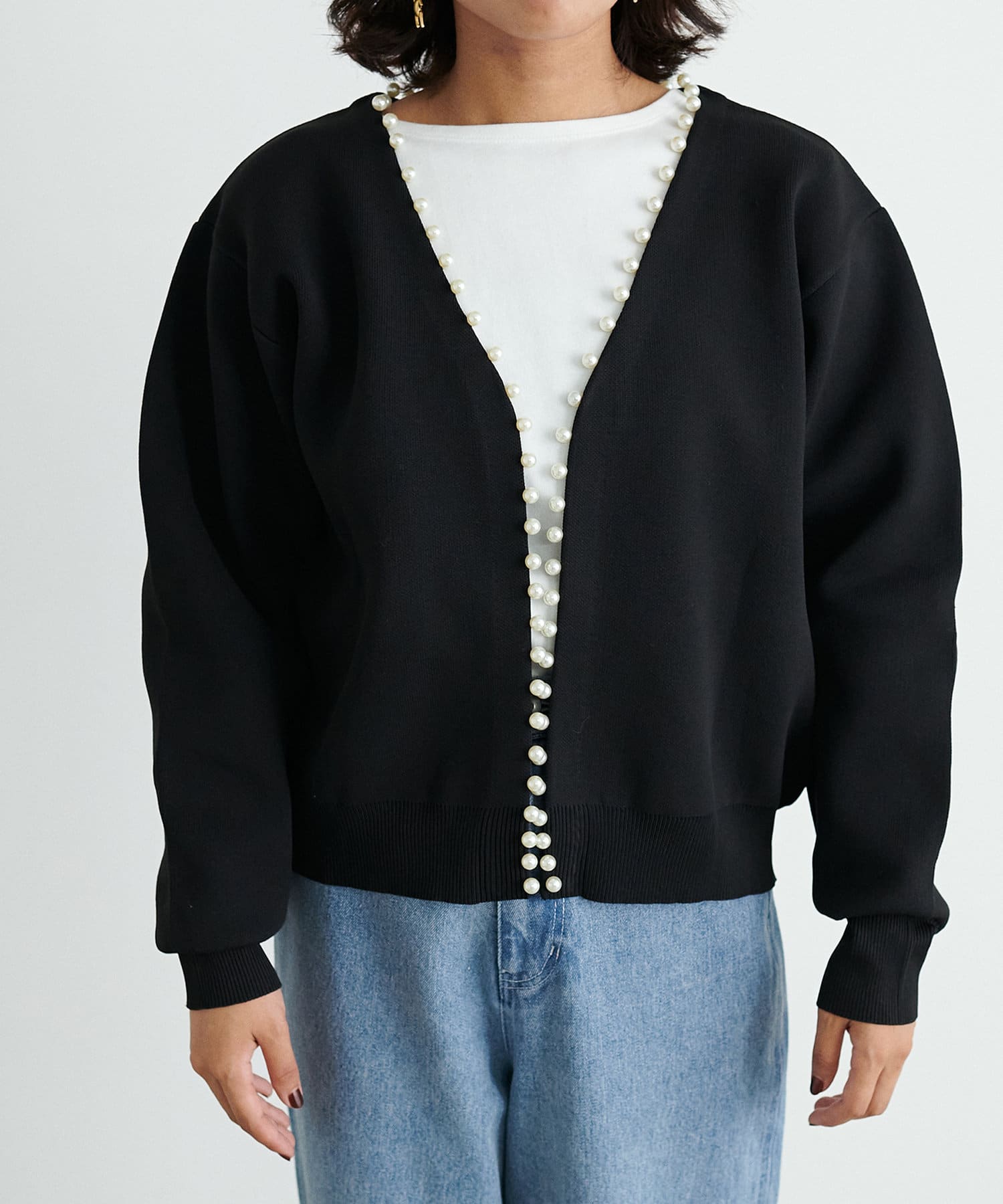 パッと見ただけで可愛らしい、襟ぐりから前立てに並んだパールが印象的なカーディガン。