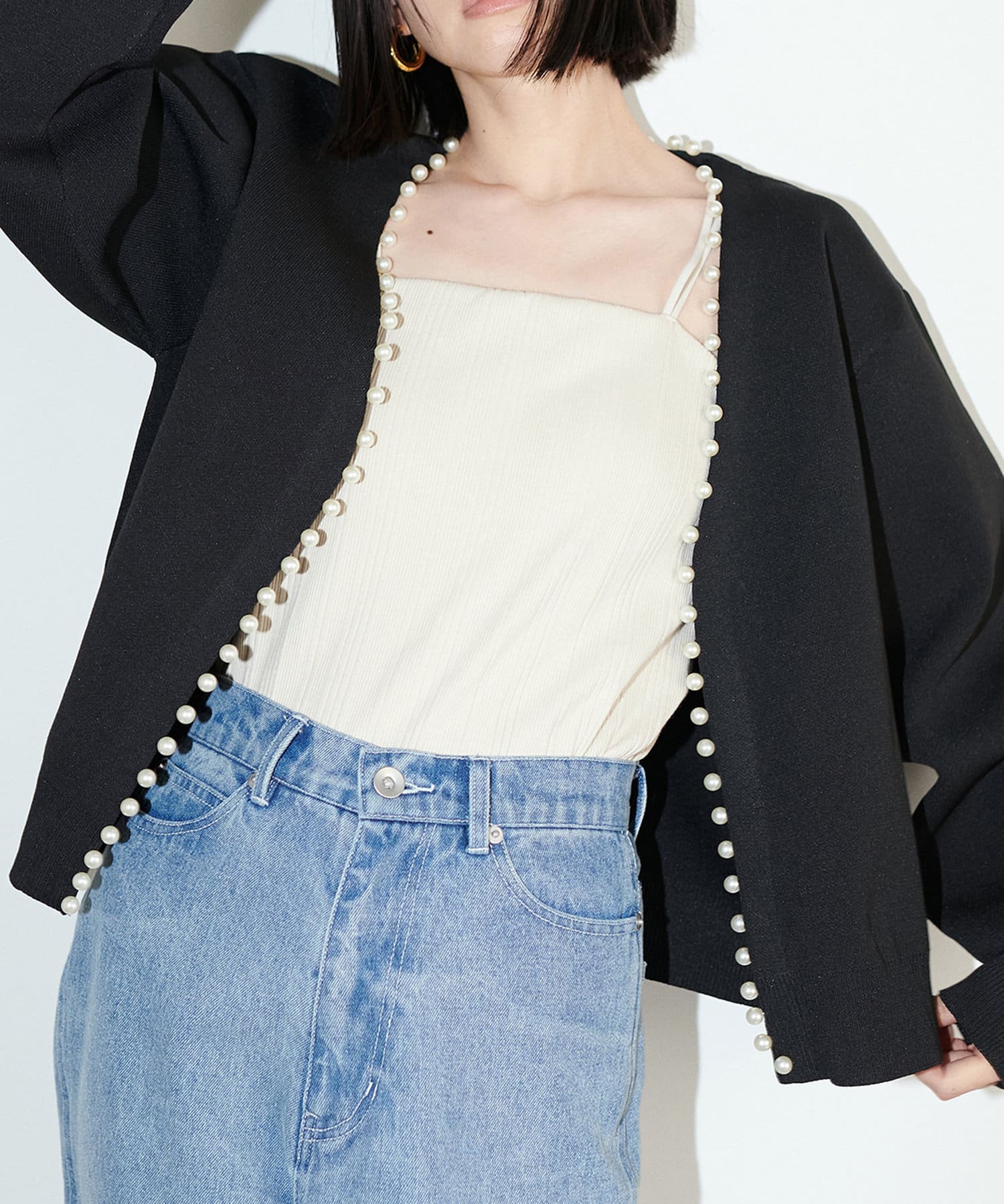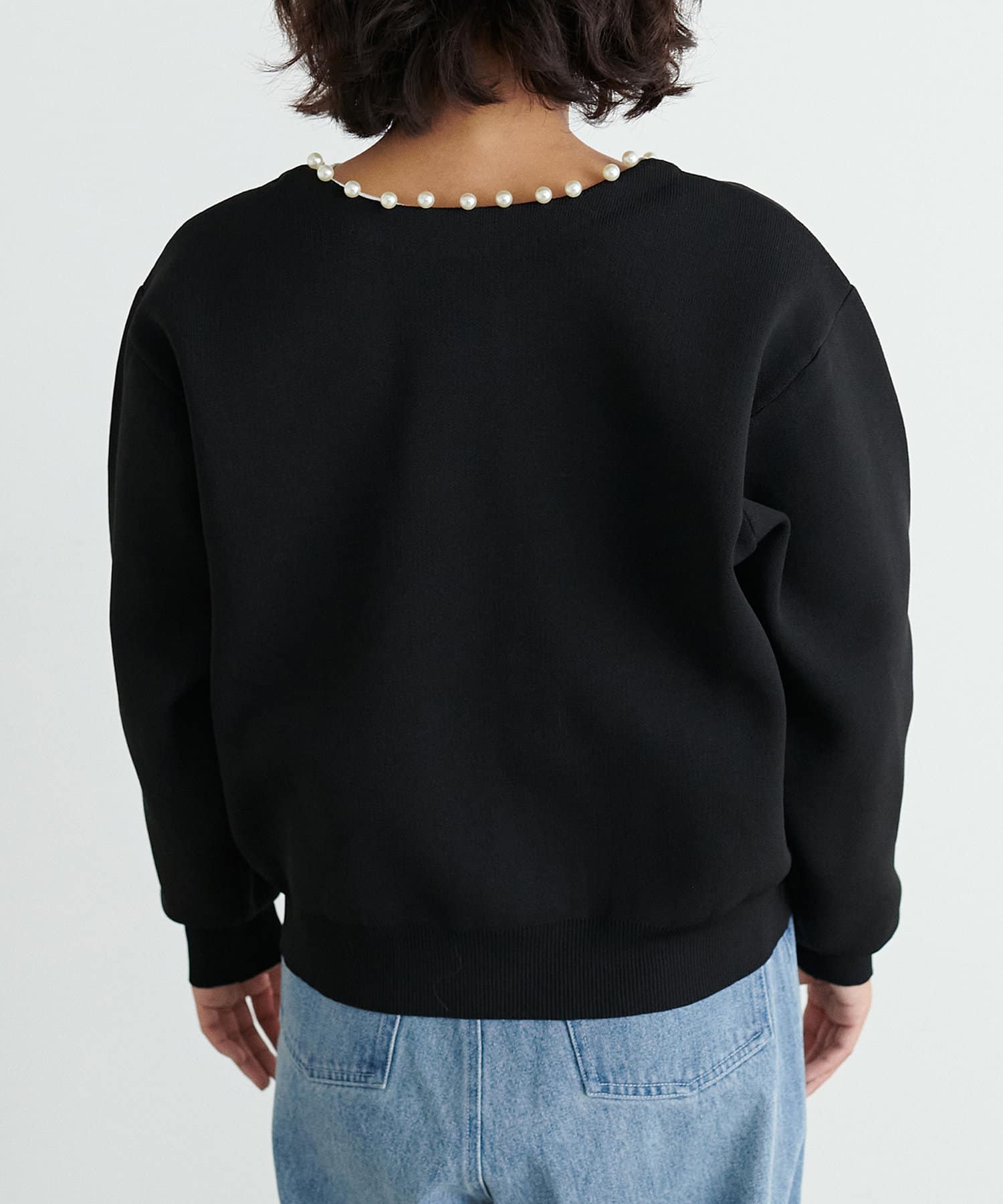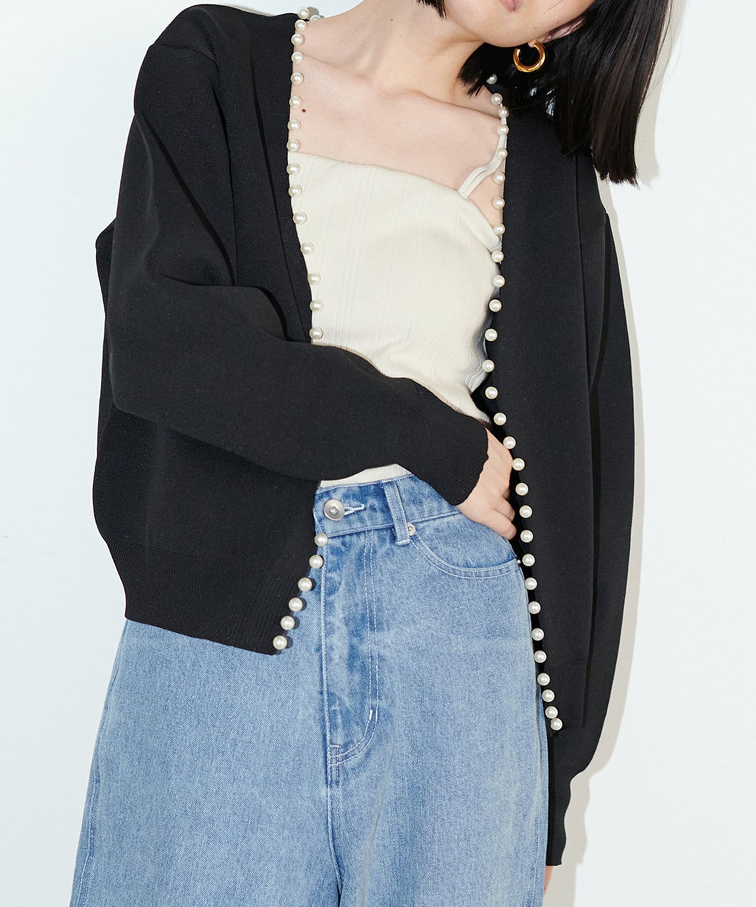 パッと見ただけで可愛らしい、襟ぐりから前立てに並んだパールが印象的なカーディガン。