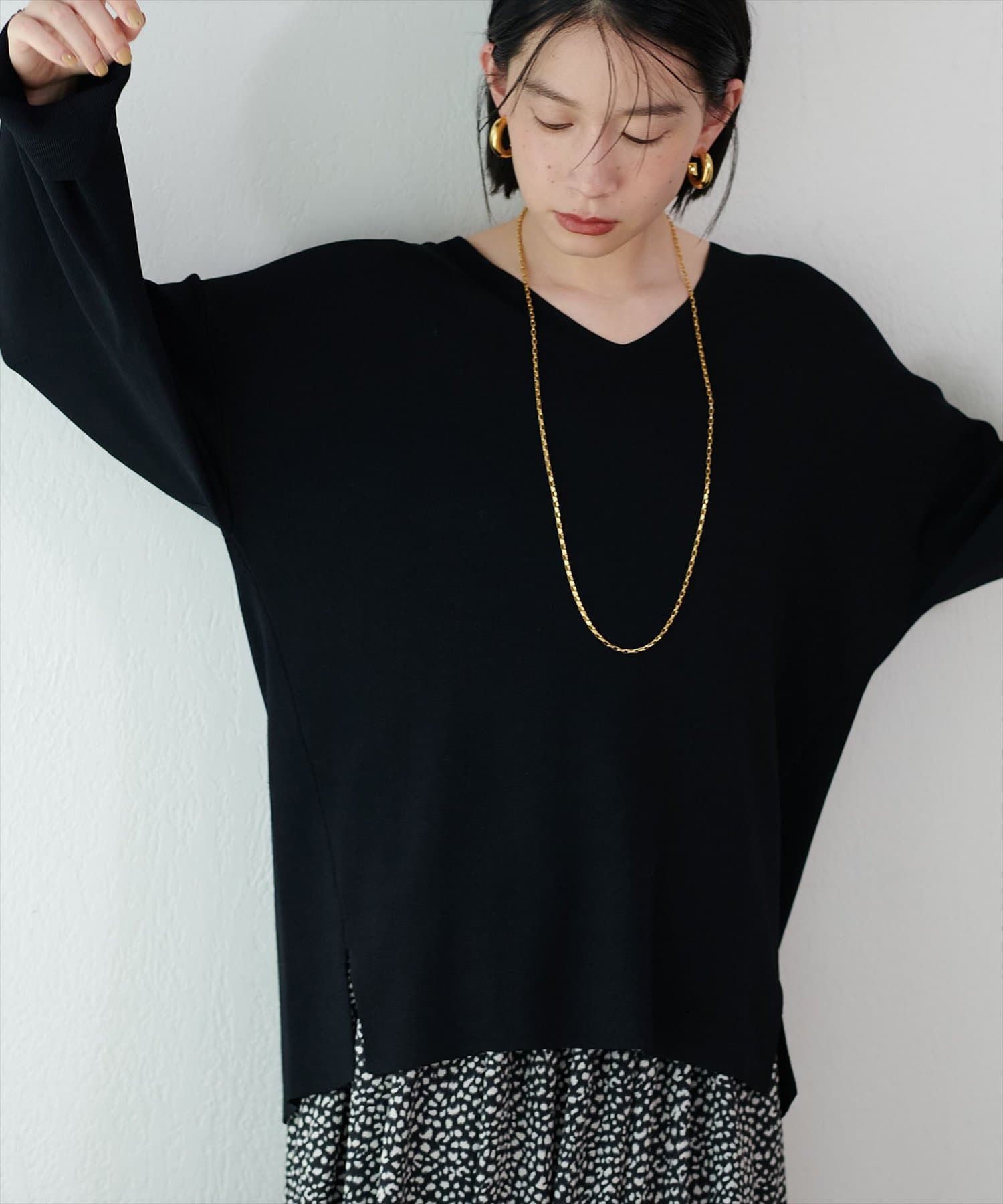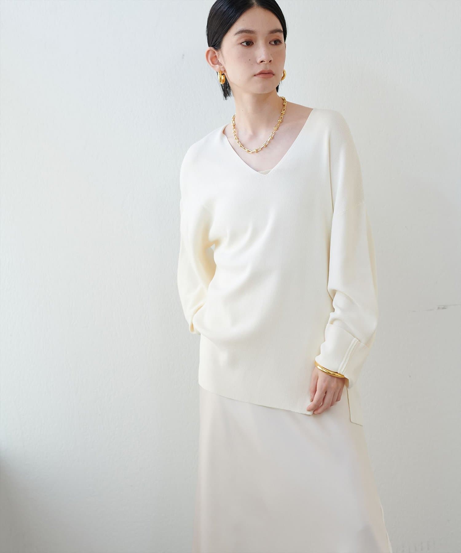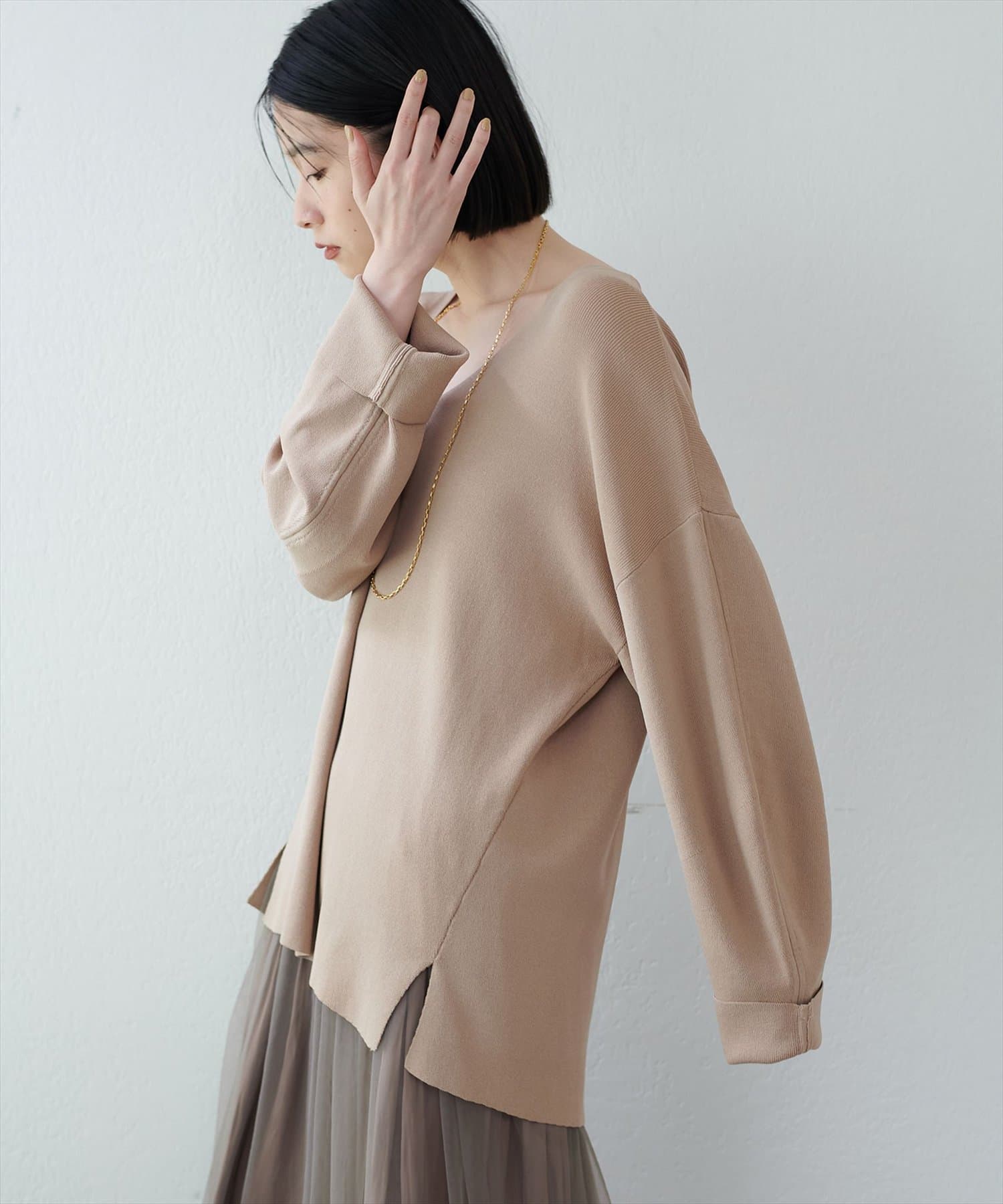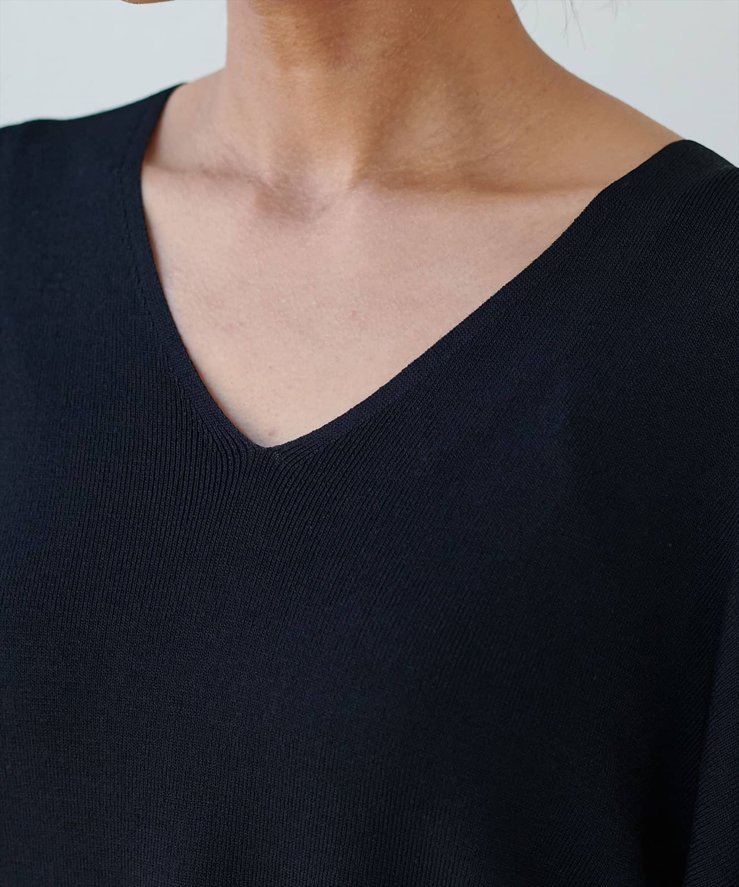 叶えています。深めのVネックが顔周りをきれいに見せ、