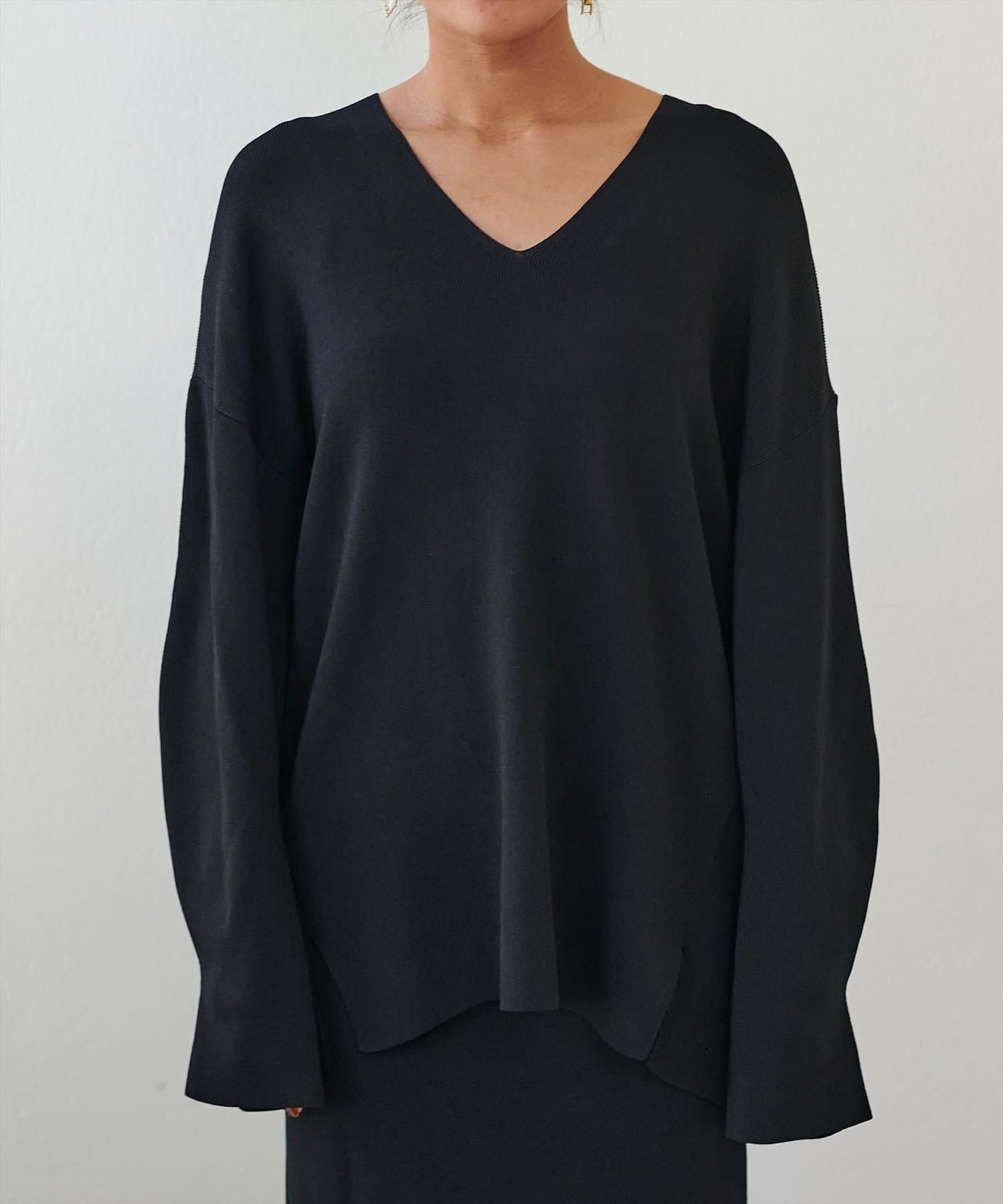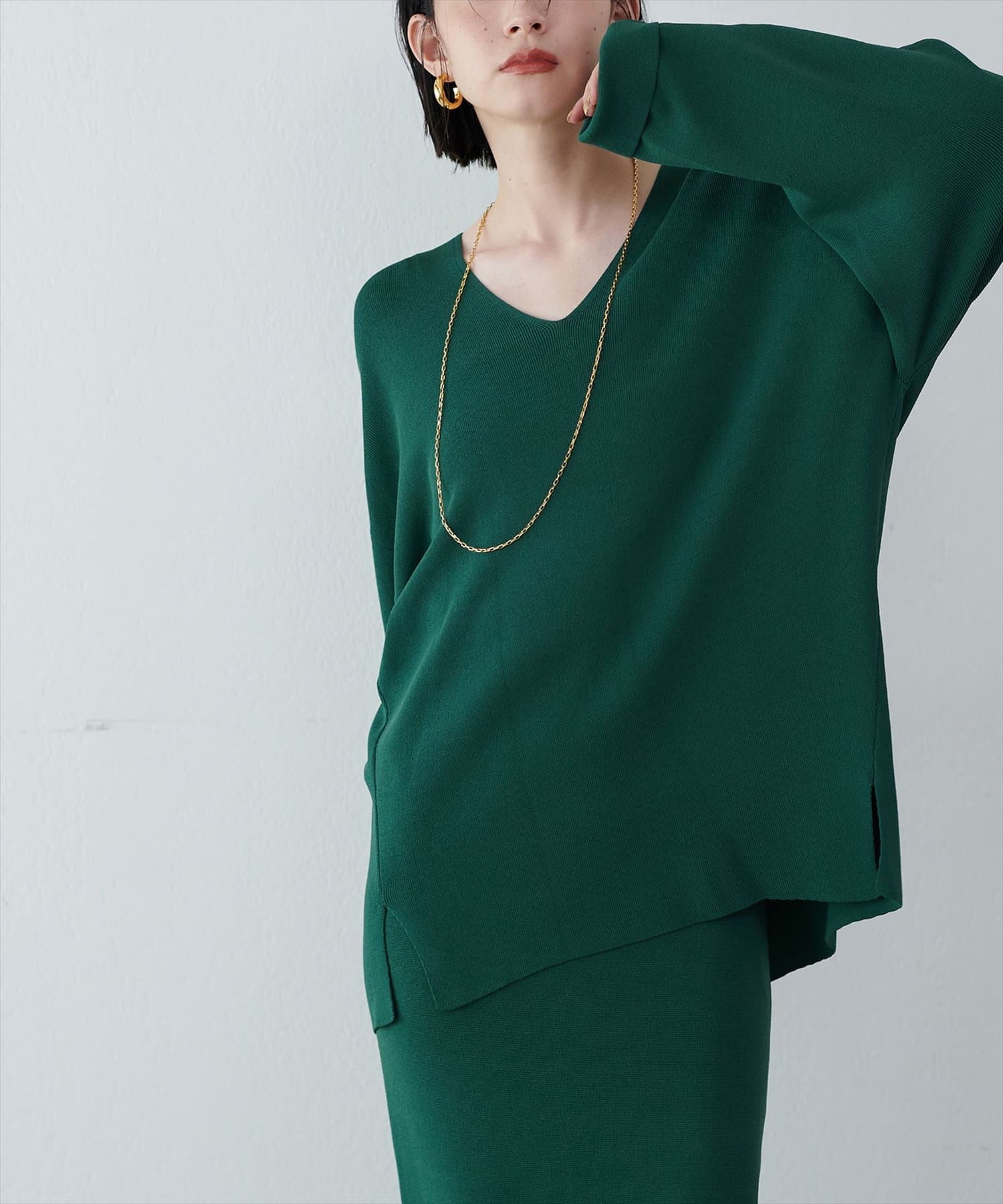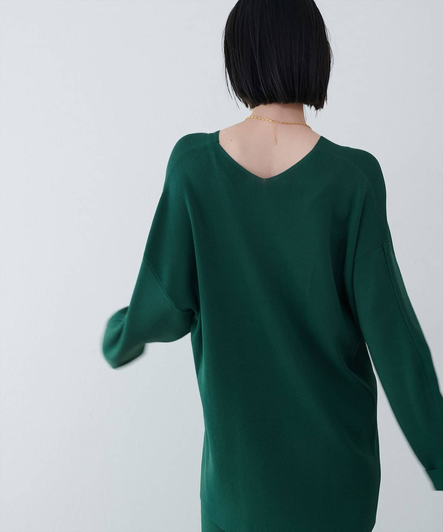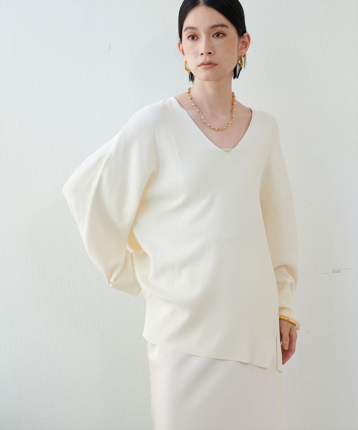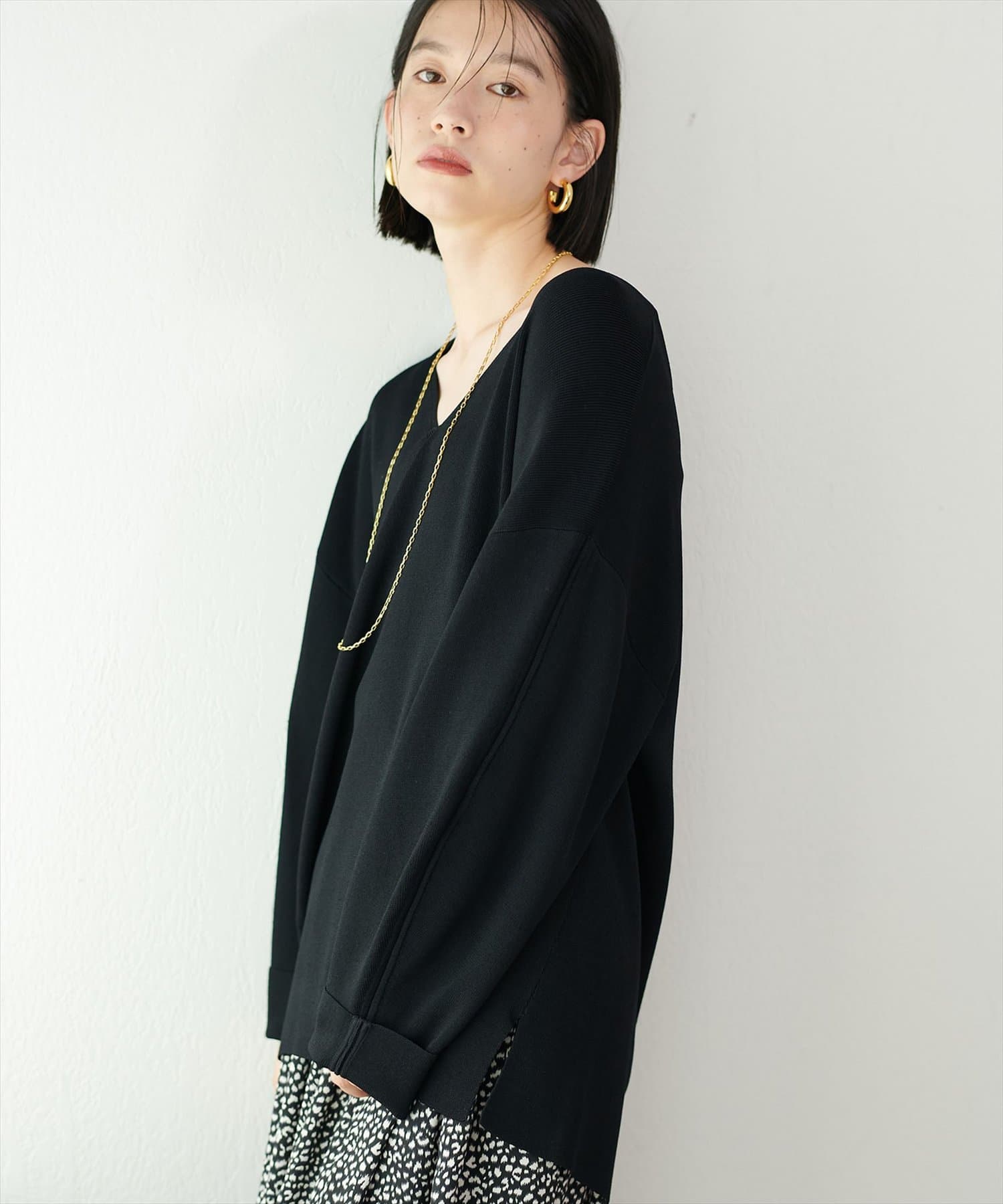 叶えています。深めのVネックが顔周りをきれいに見せ、