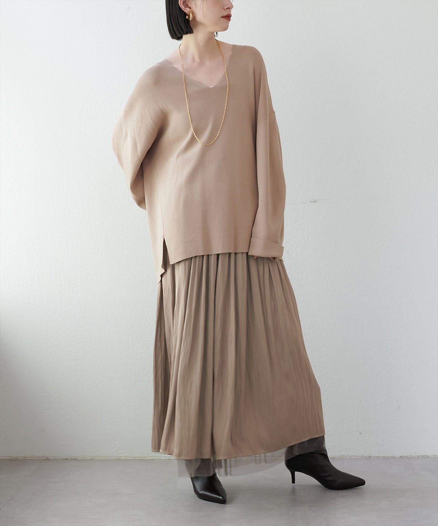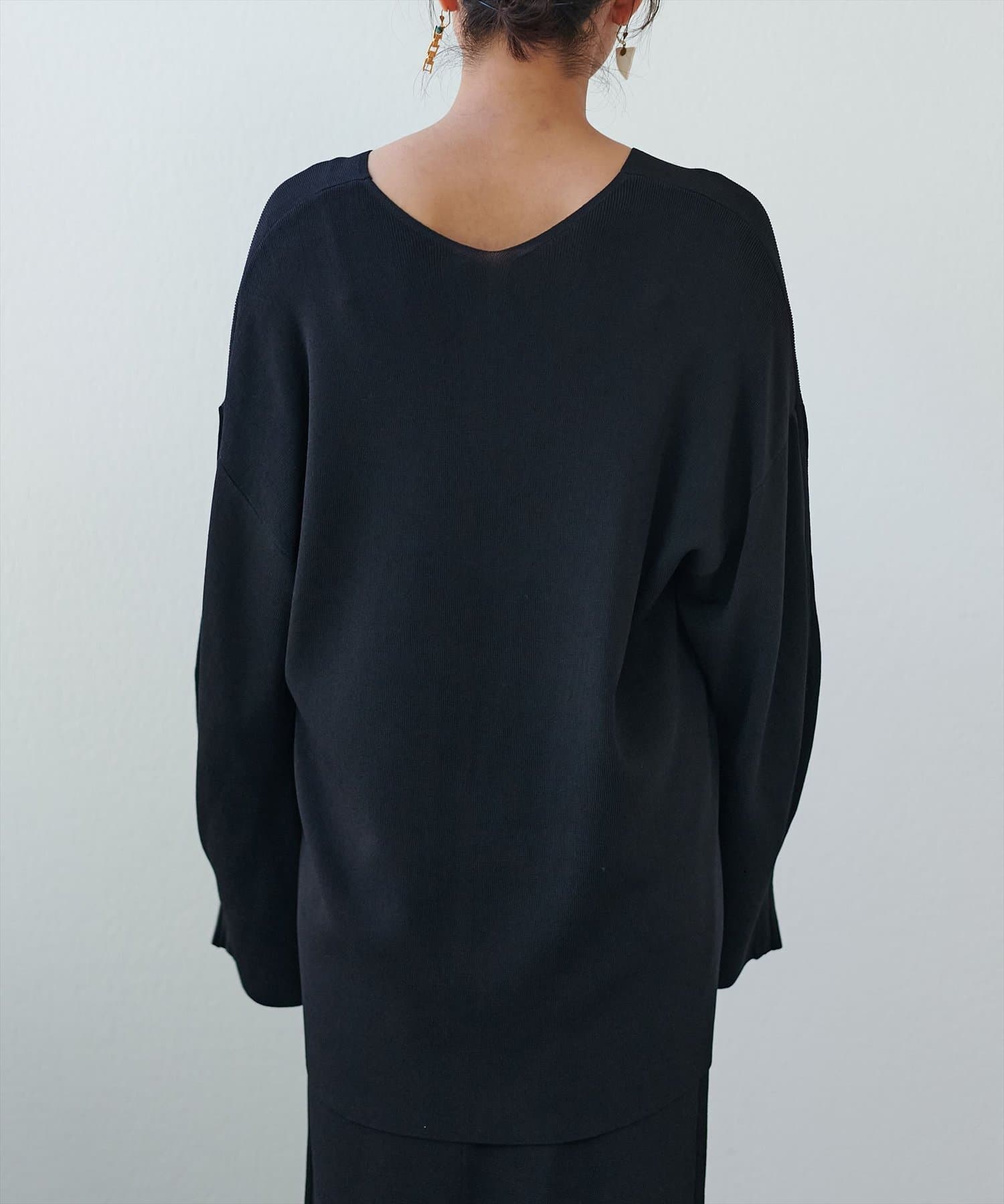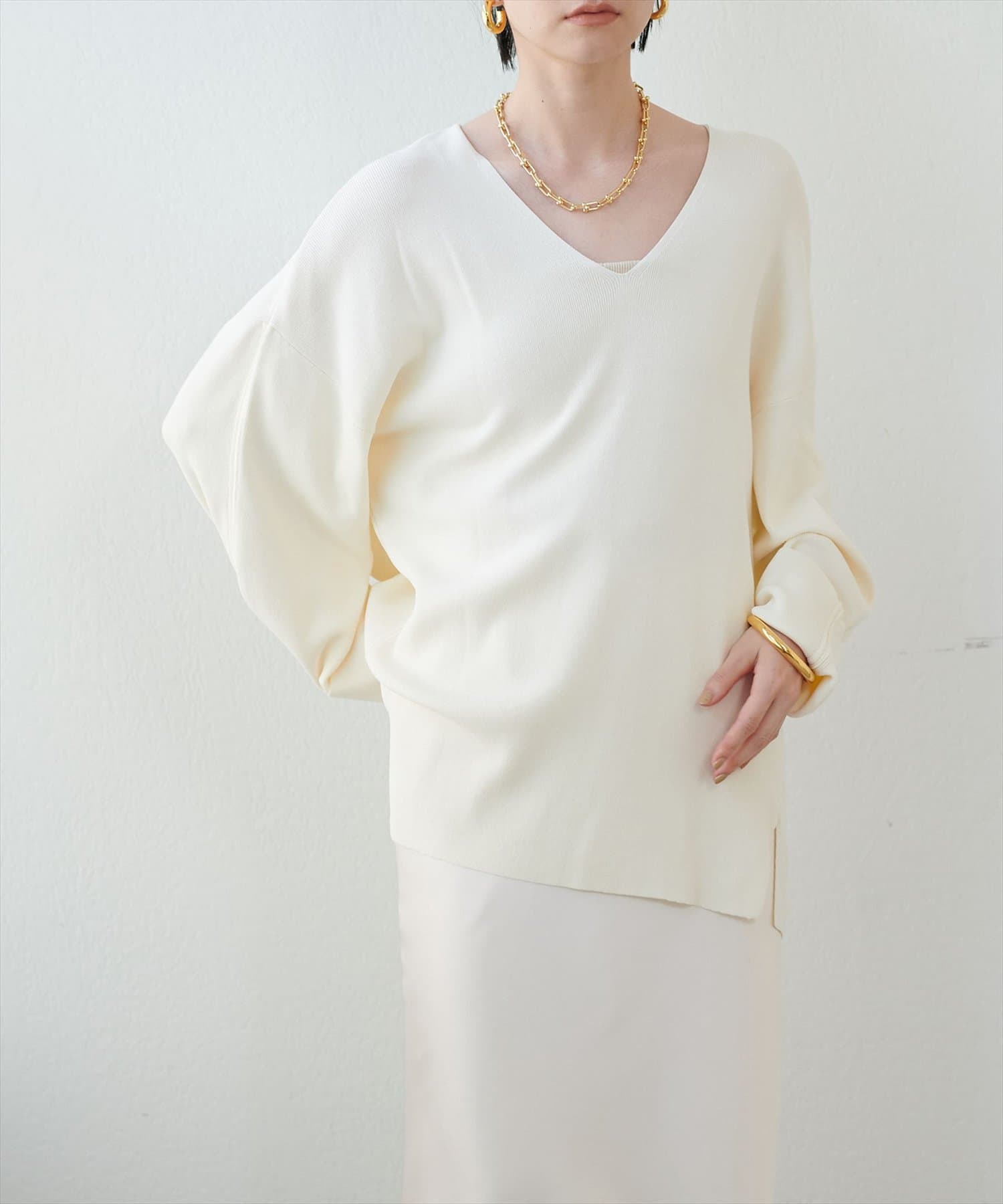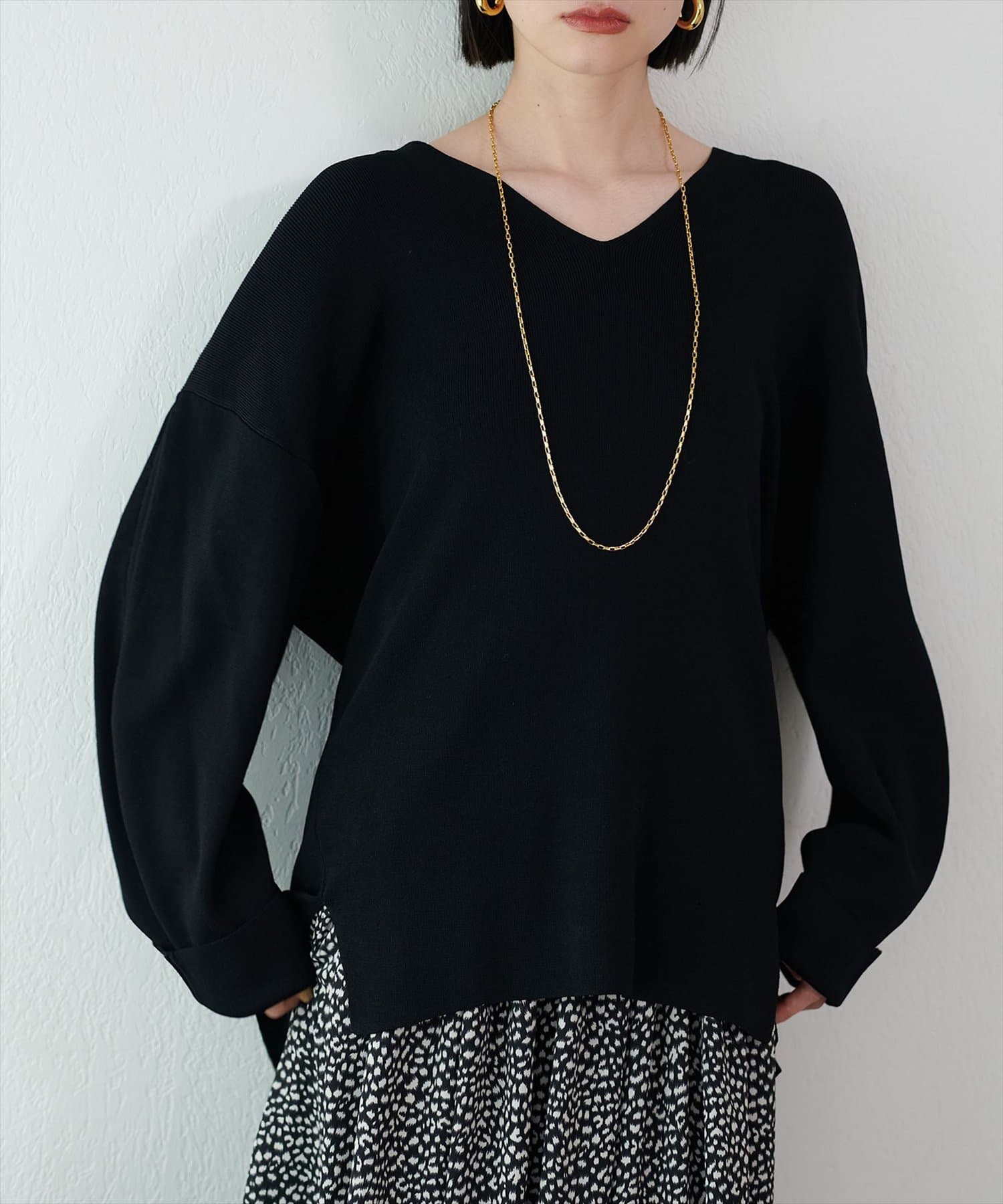 叶えています。深めのVネックが顔周りをきれいに見せ、