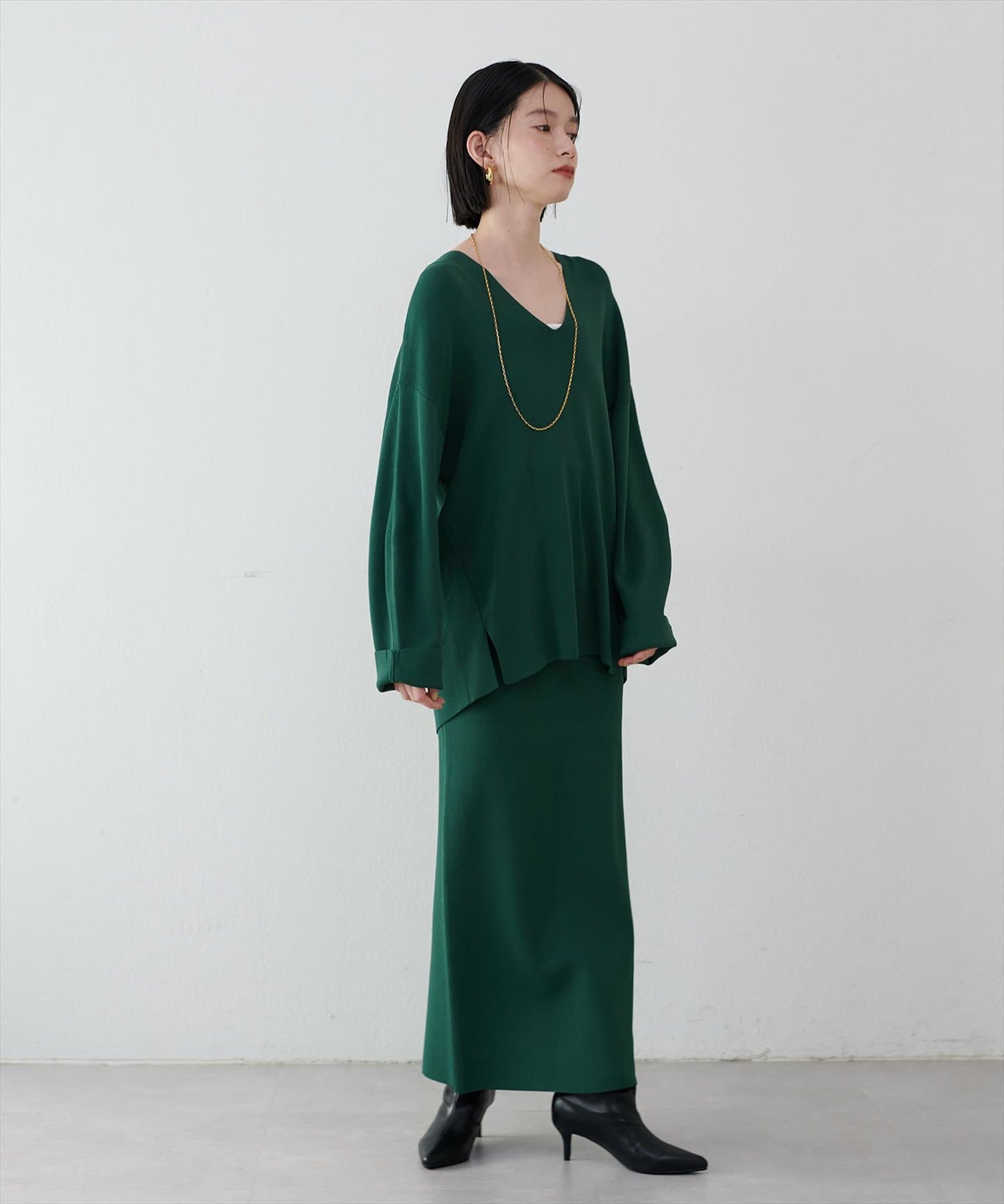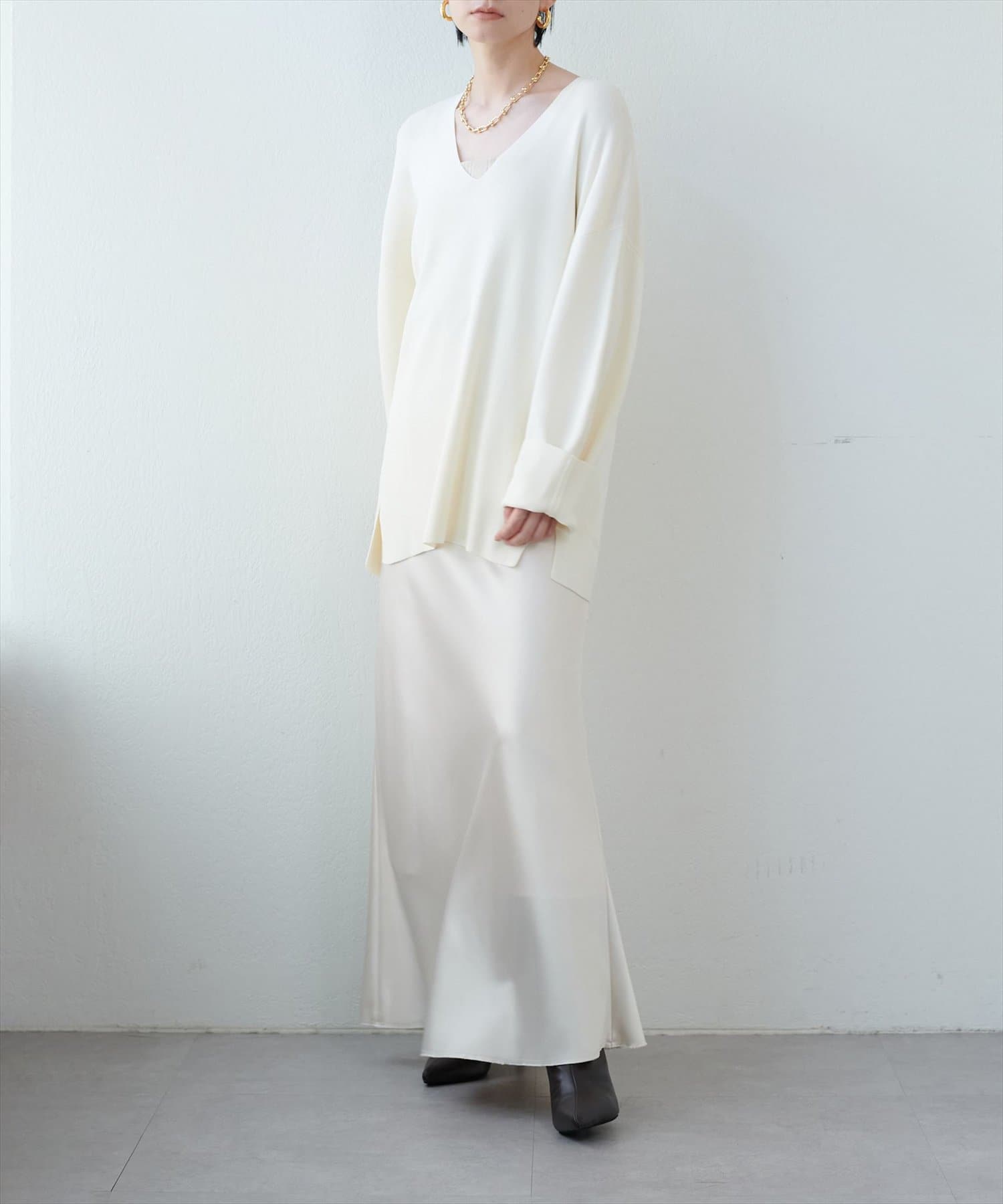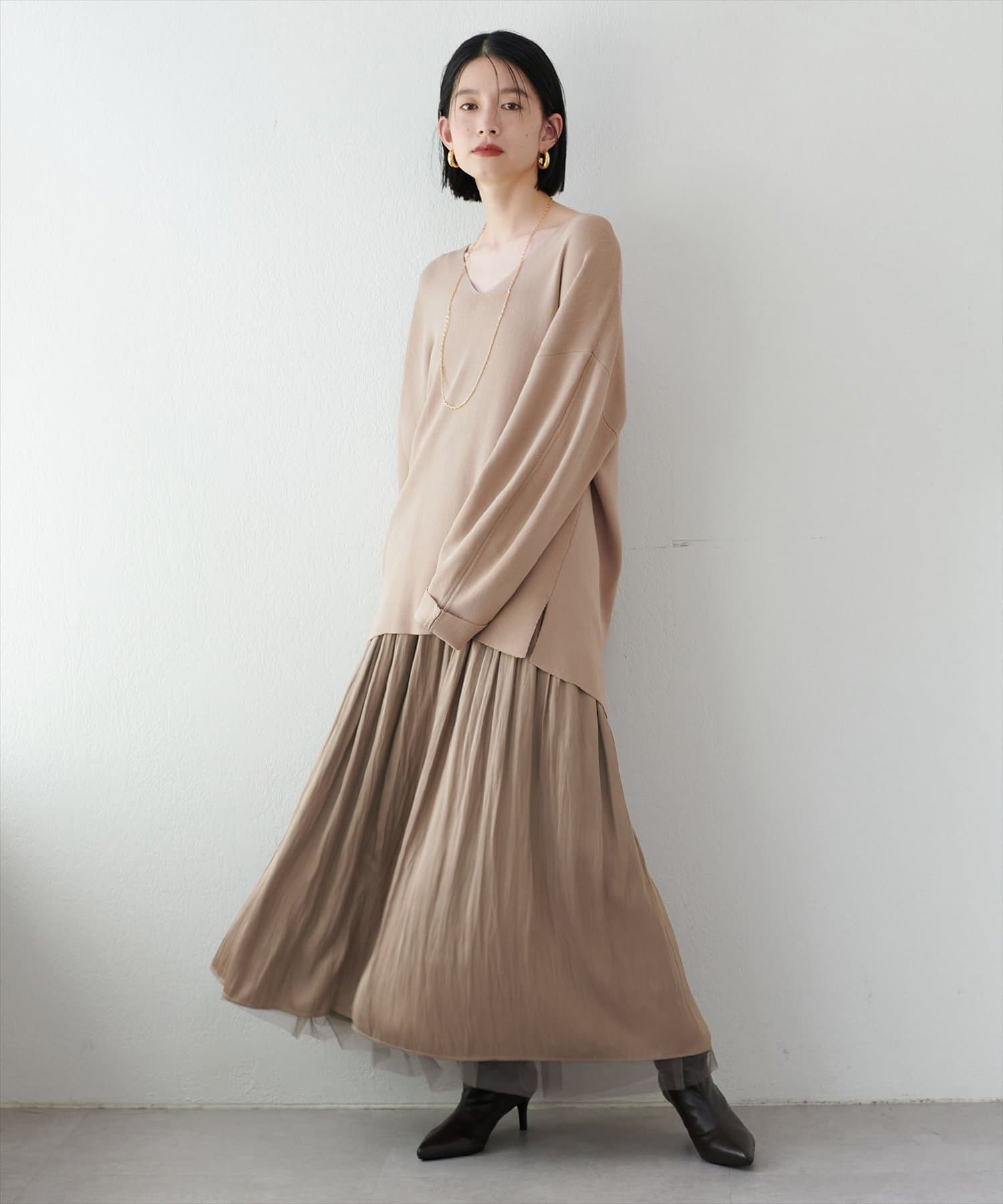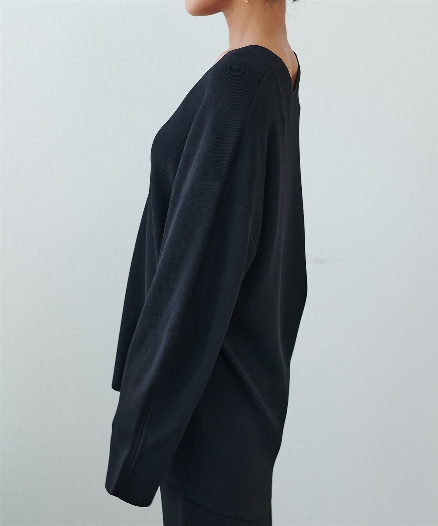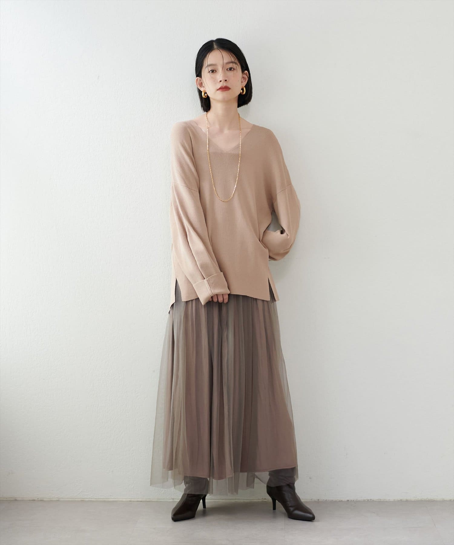 叶えています。深めのVネックが顔周りをきれいに見せ、