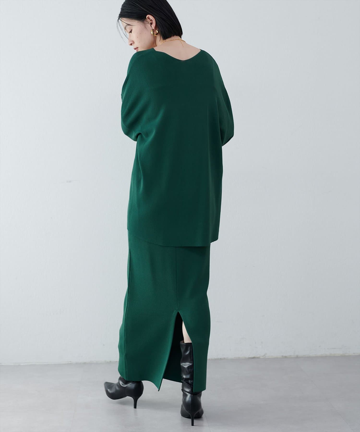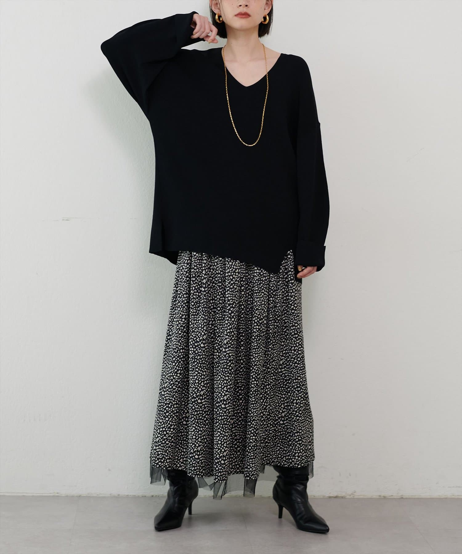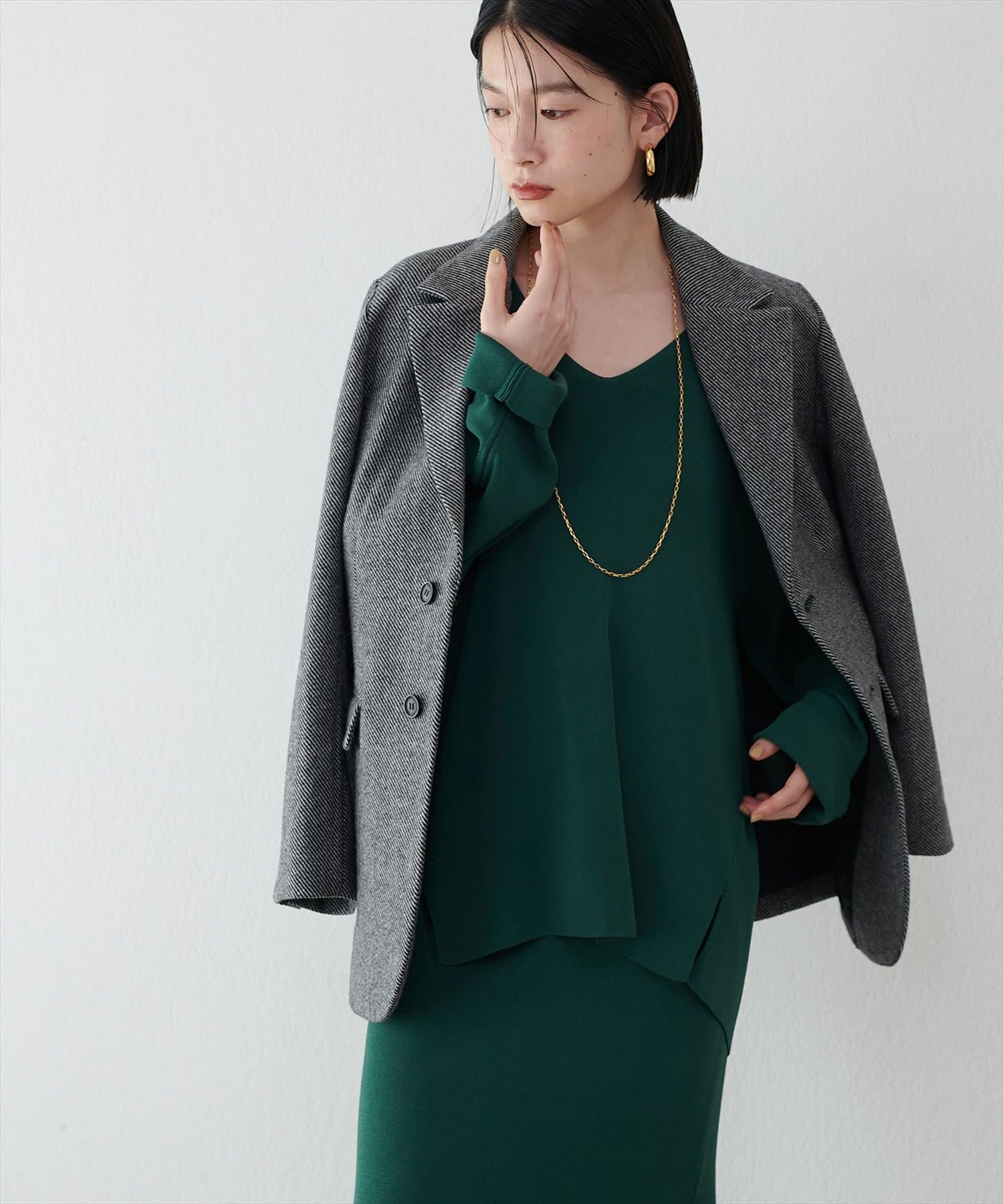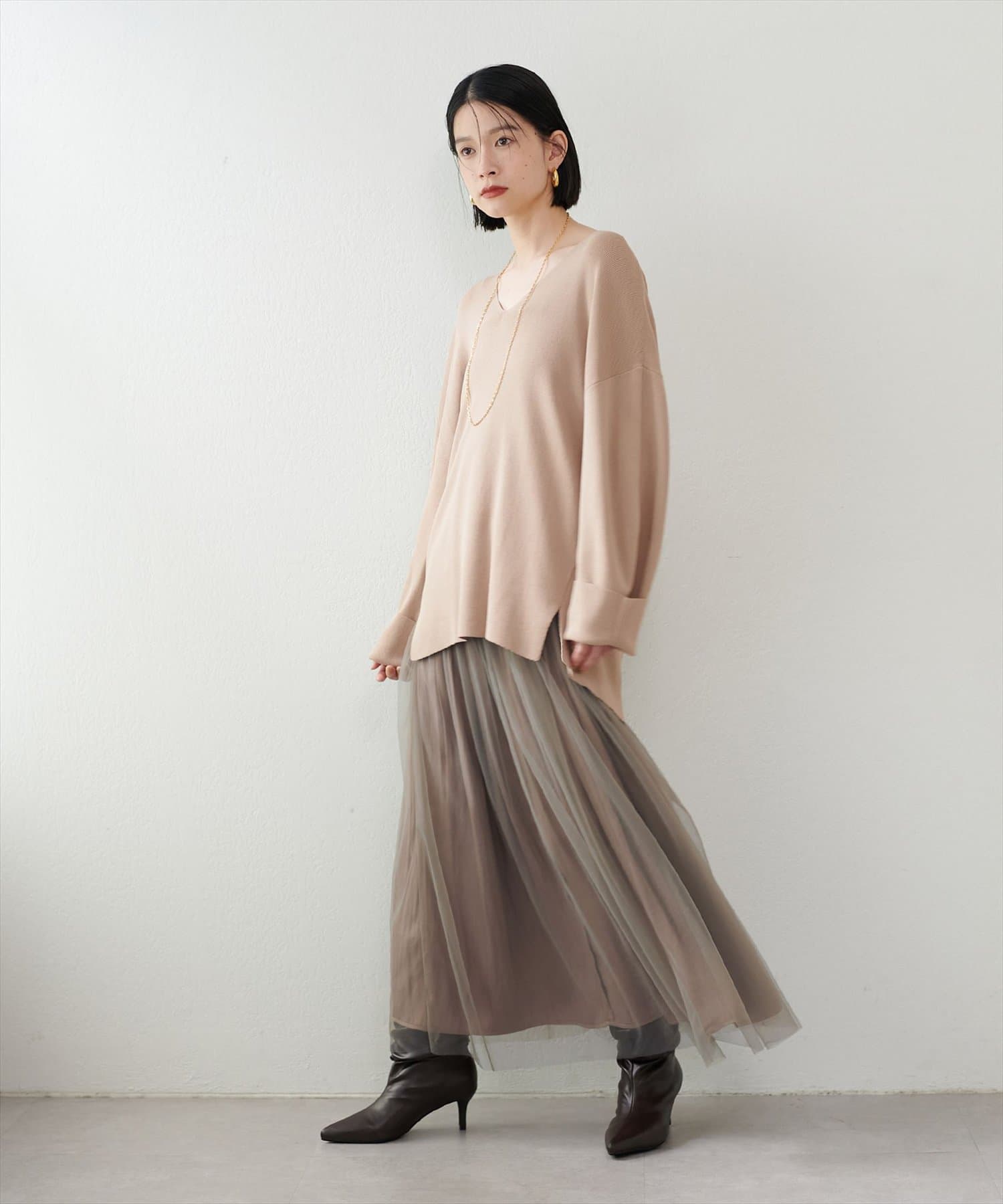 叶えています。深めのVネックが顔周りをきれいに見せ、