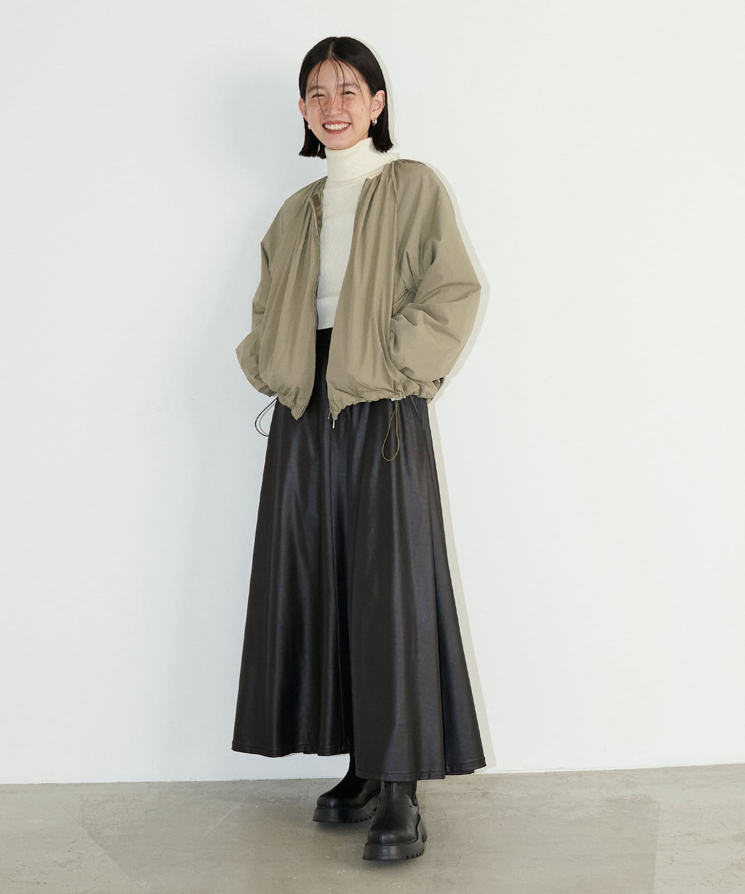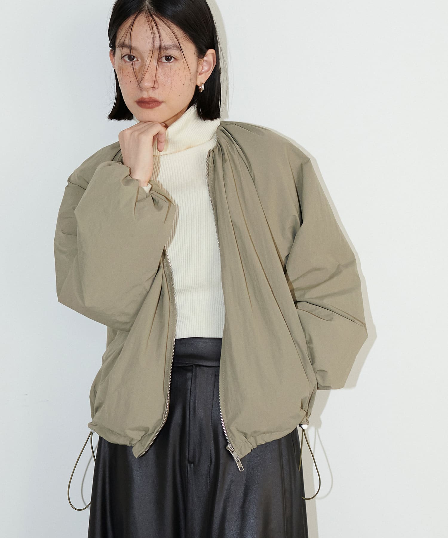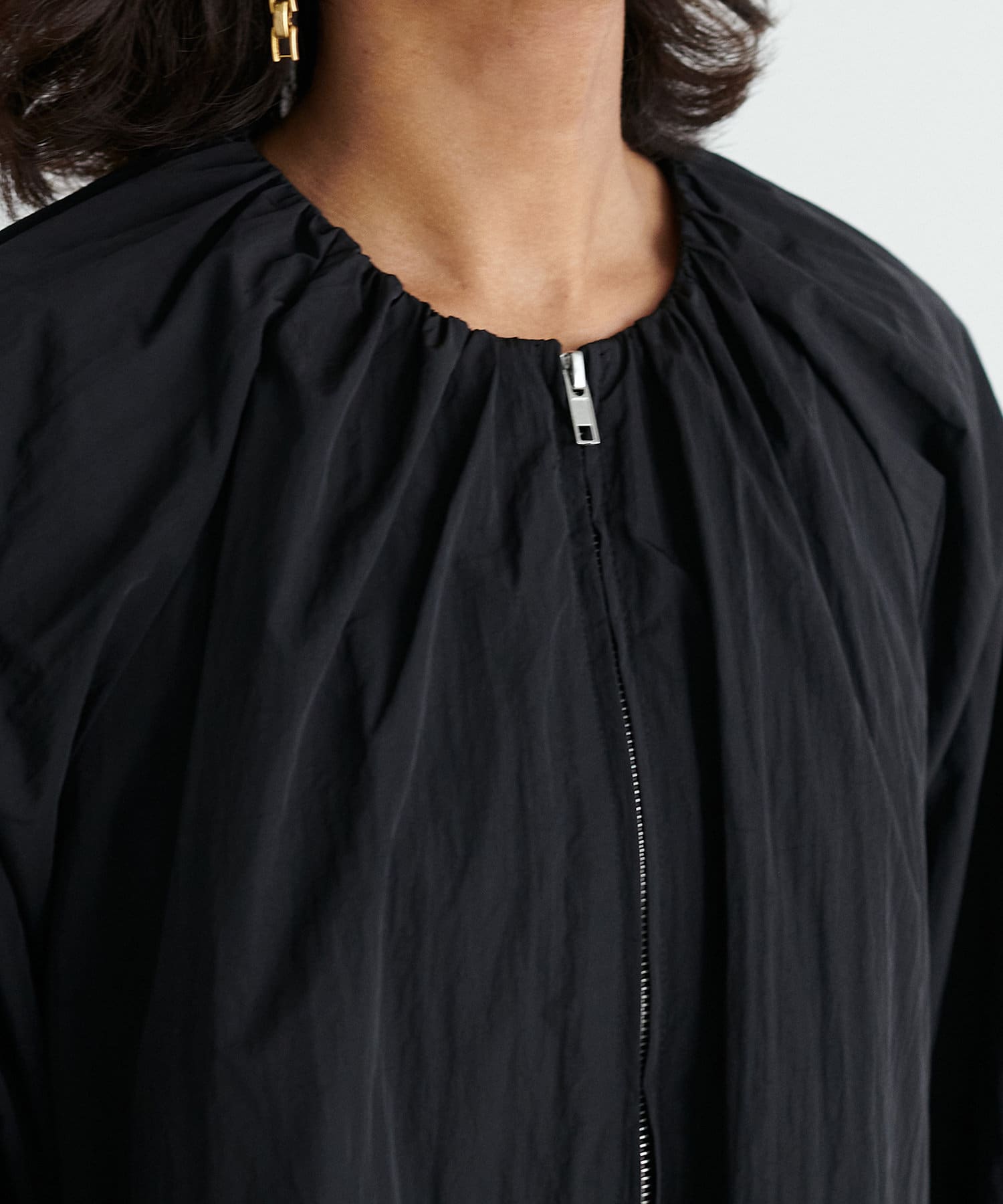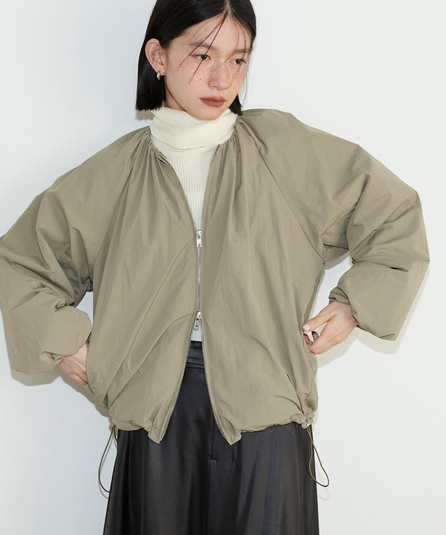 女性らしい丸みとたっぷりギャザーの旬顔ブルゾン。