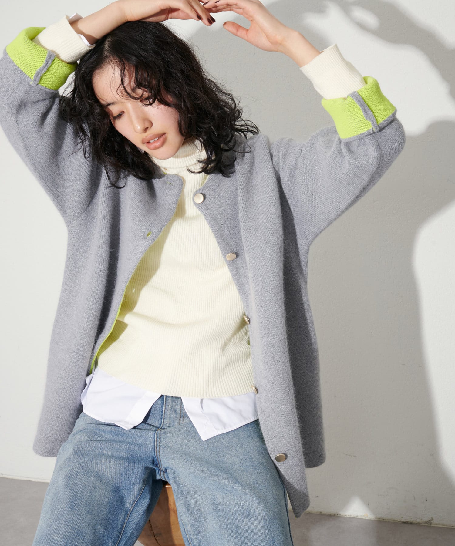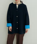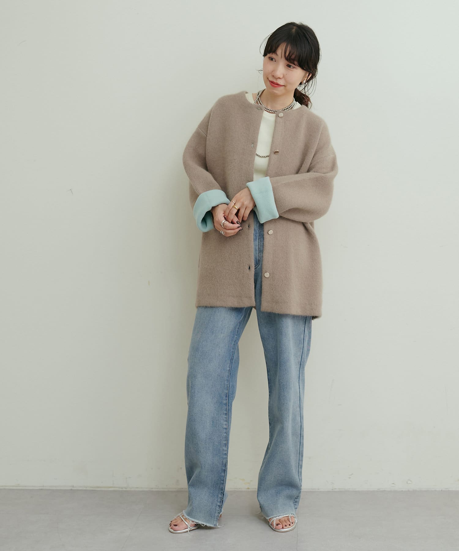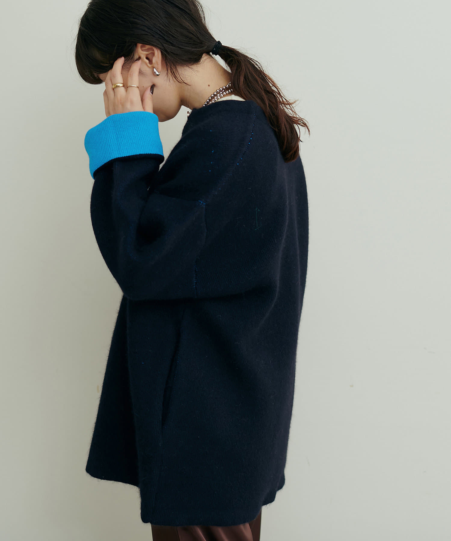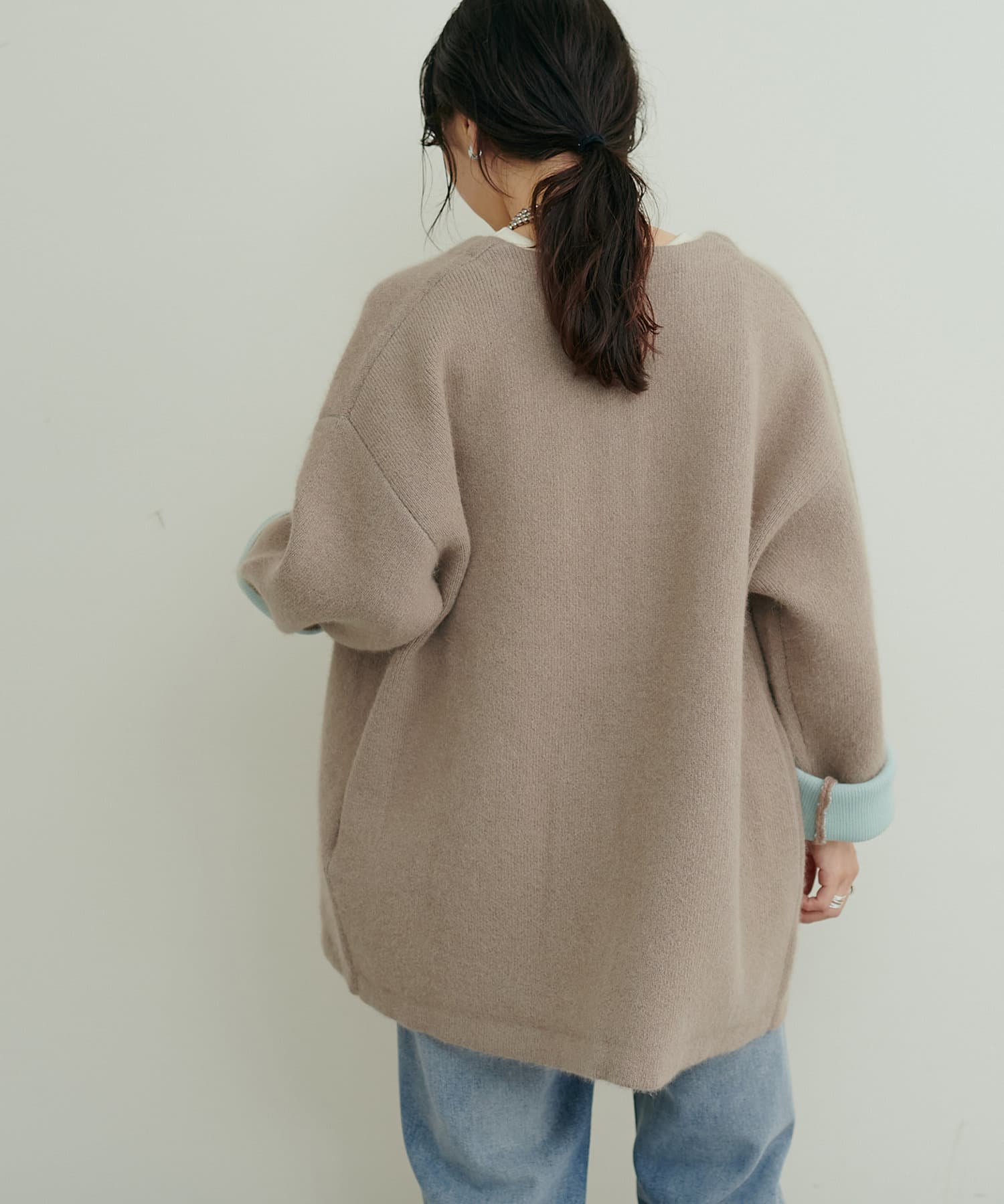 カーディガンの内側は、配色使いのダブルフェイス仕様に仕立て、釦を開けてお召し頂いたり、