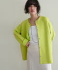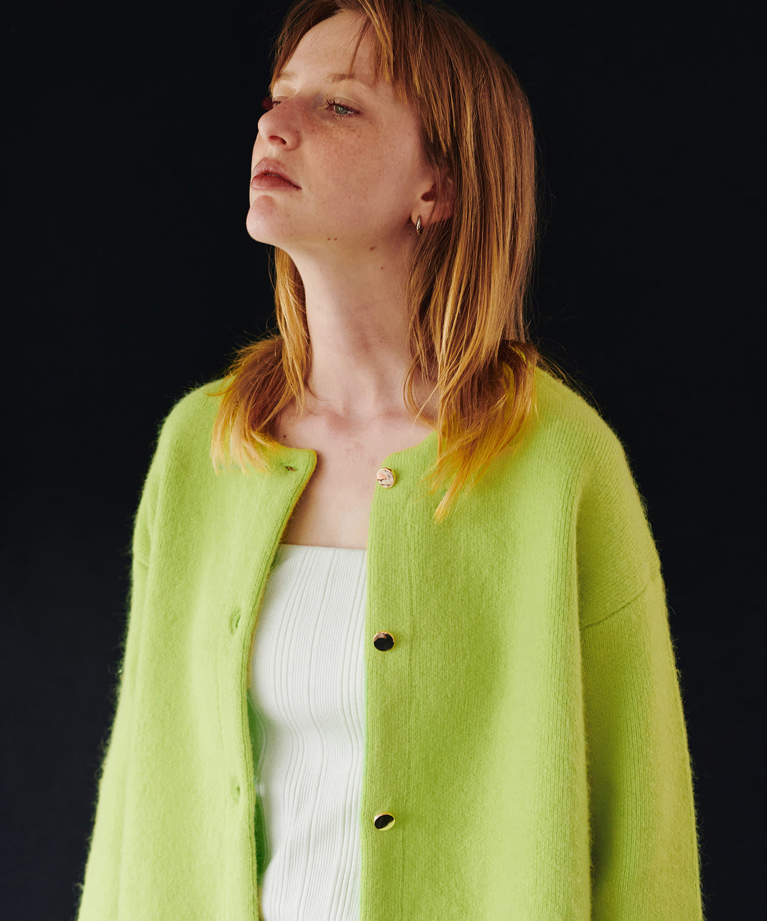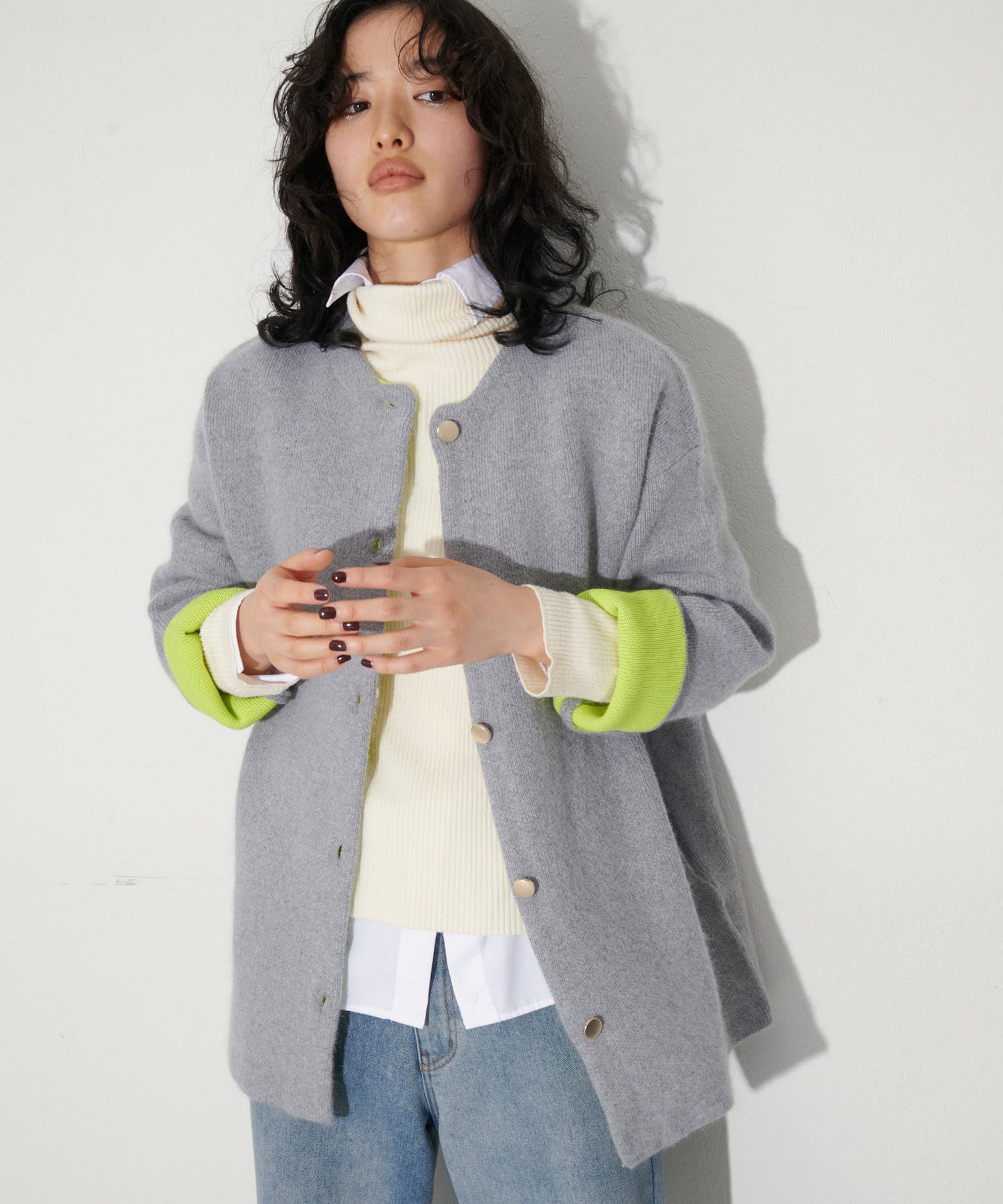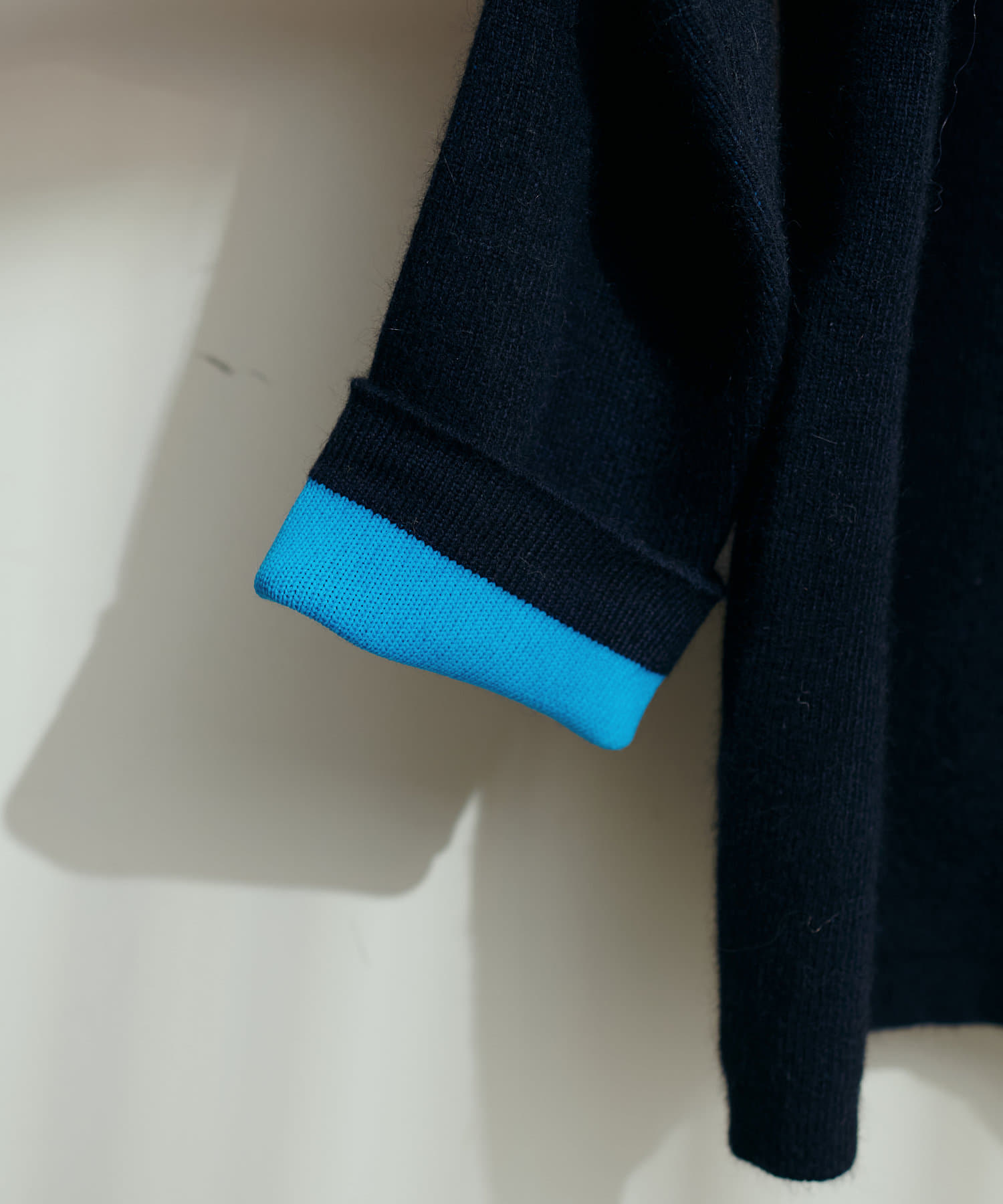 カーディガンの内側は、配色使いのダブルフェイス仕様に仕立て、釦を開けてお召し頂いたり、