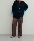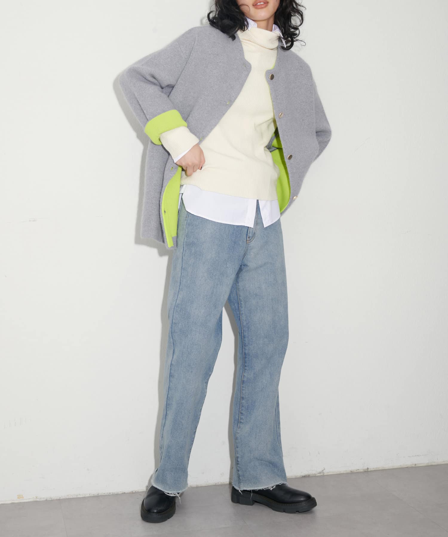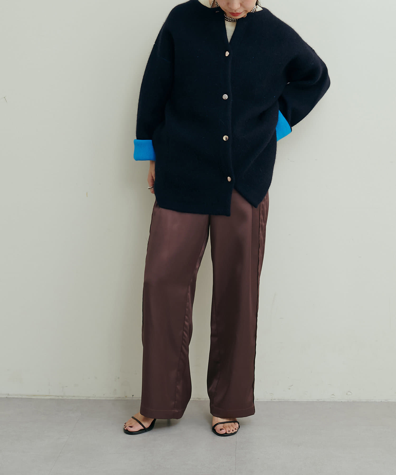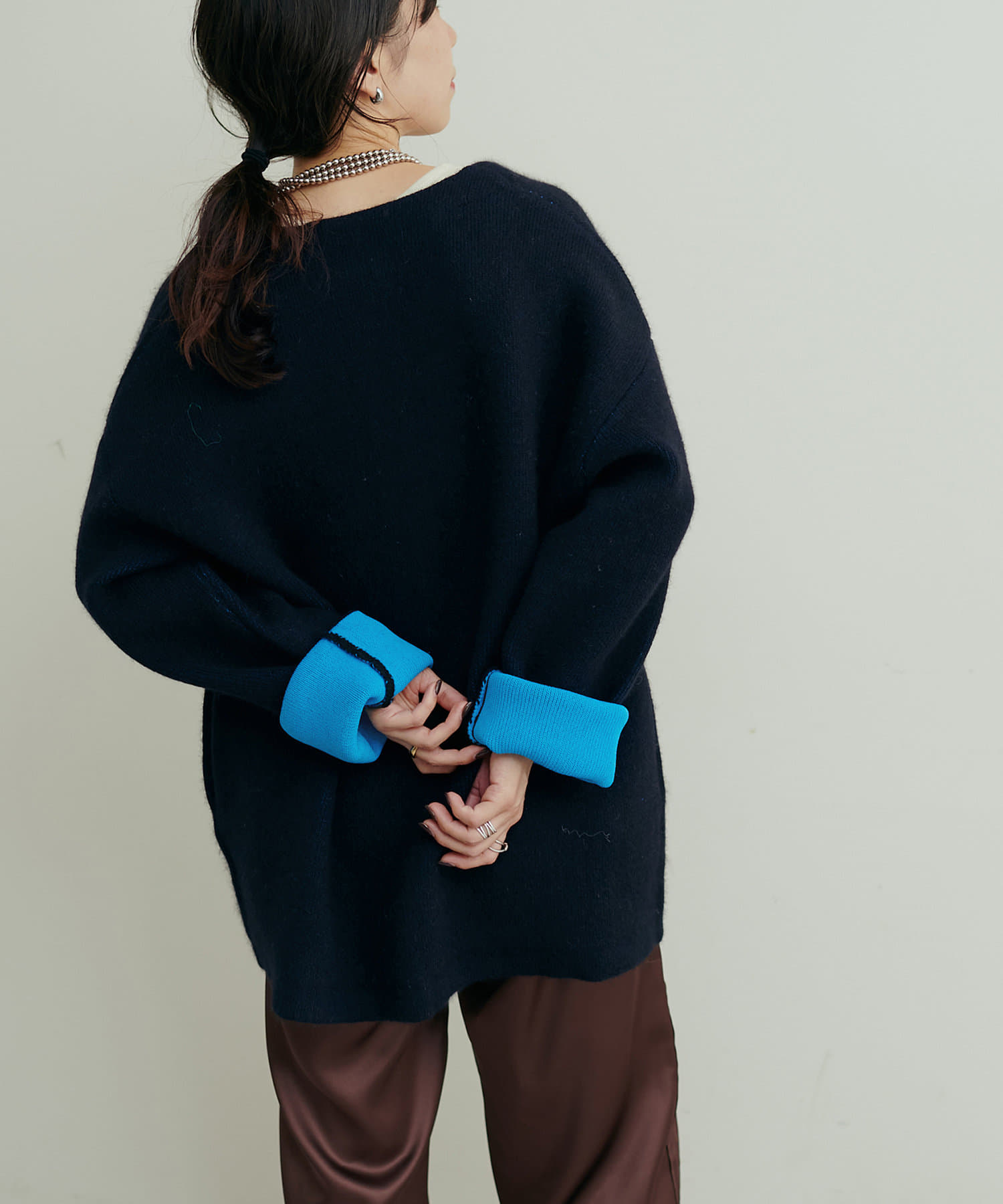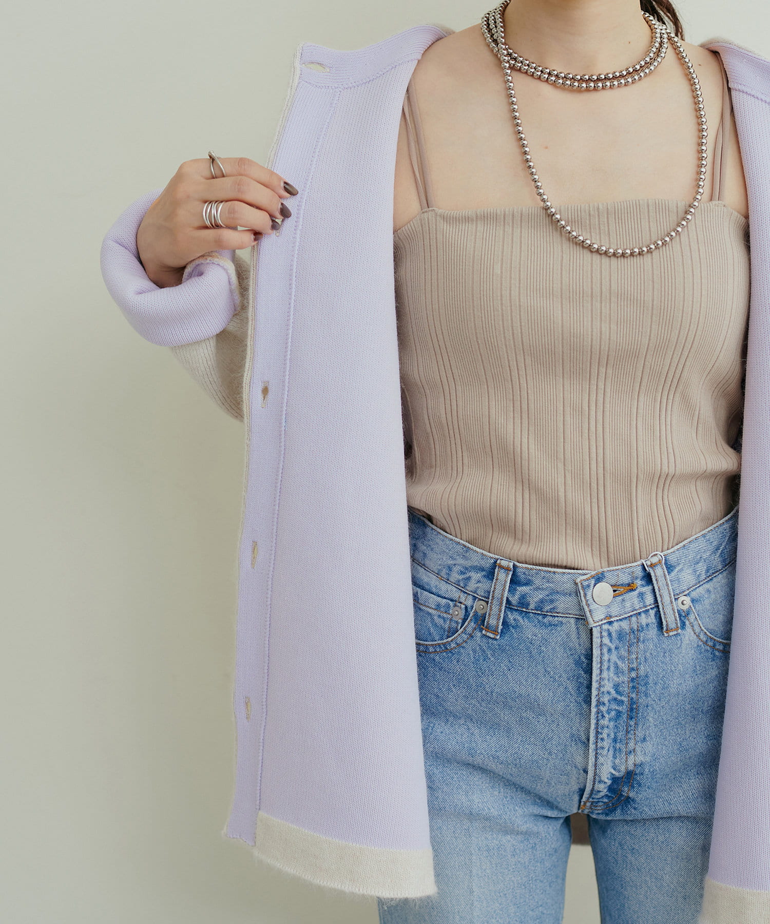 カーディガンの内側は、配色使いのダブルフェイス仕様に仕立て、釦を開けてお召し頂いたり、