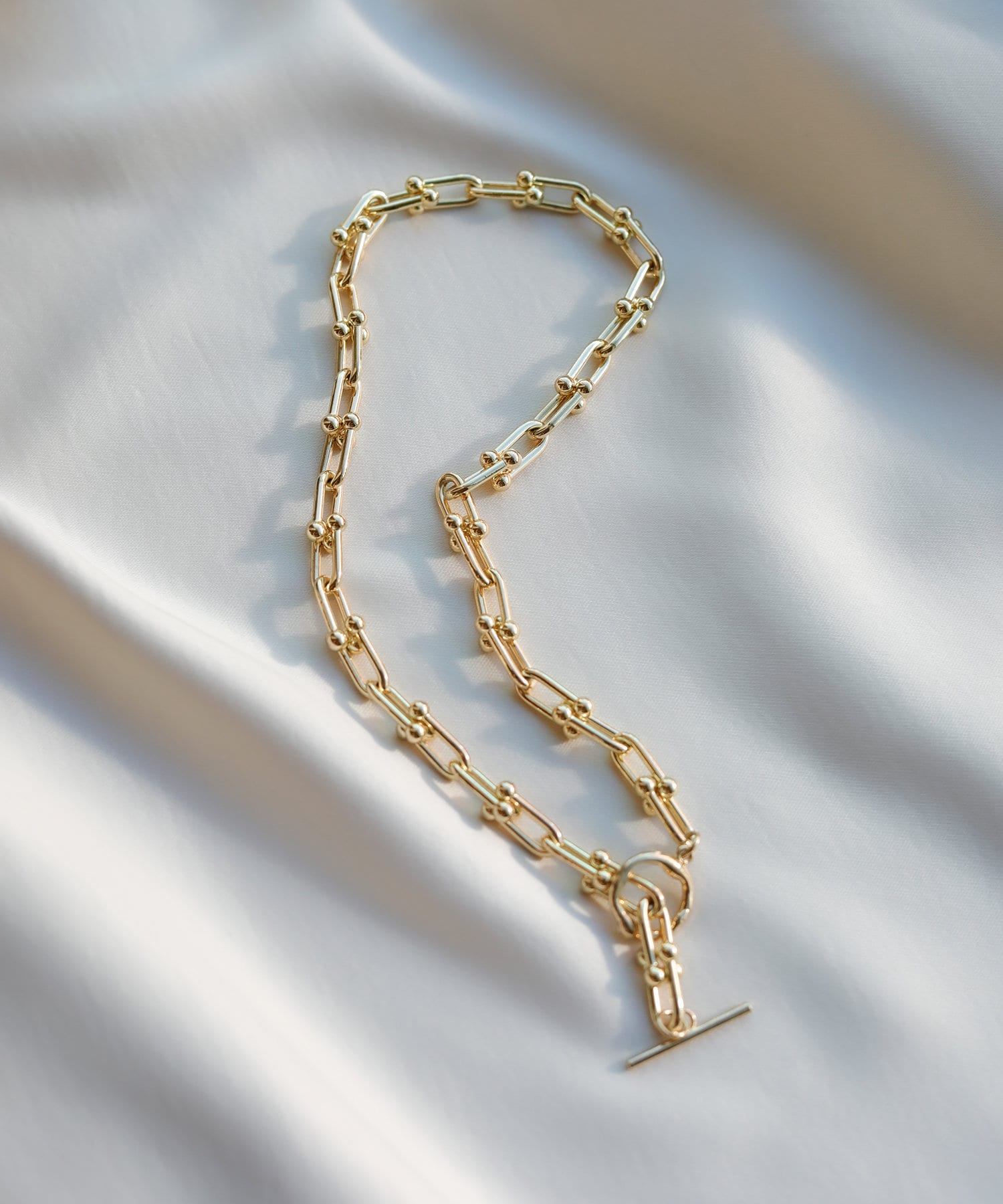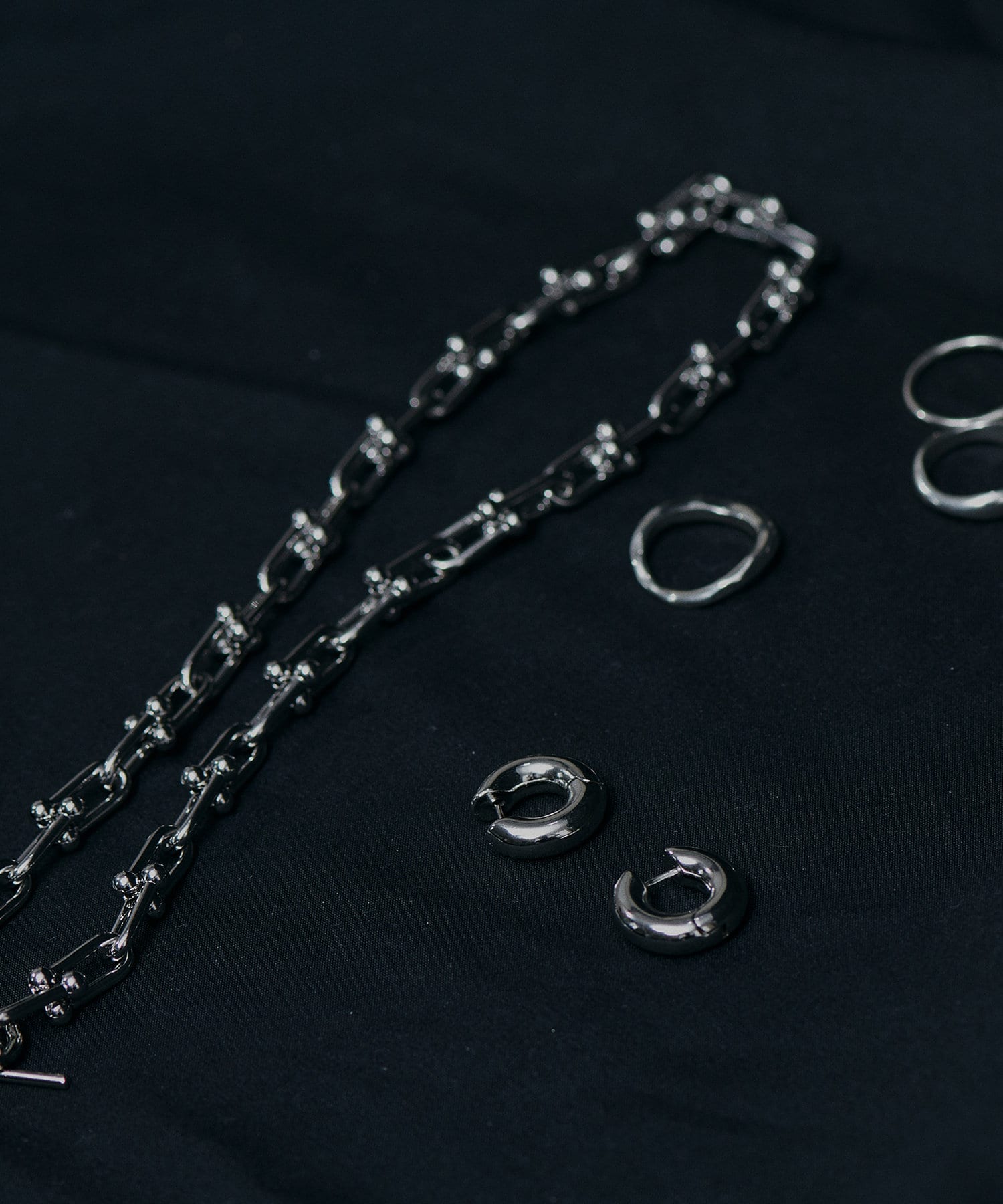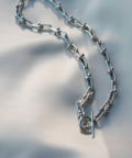 楕円のパーツが並んだ適度にボリューム感のあるネックレス。やや太さはありますが、