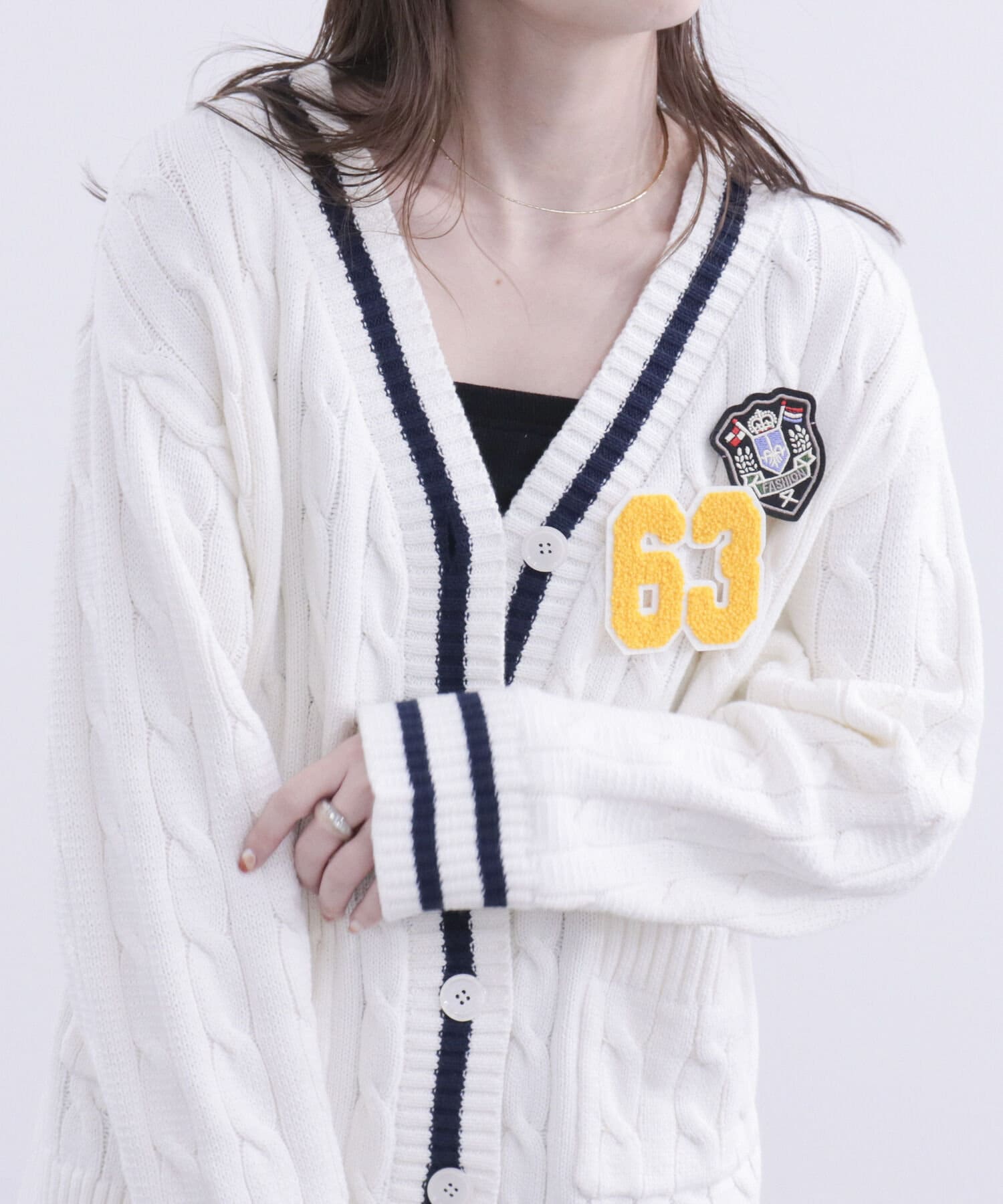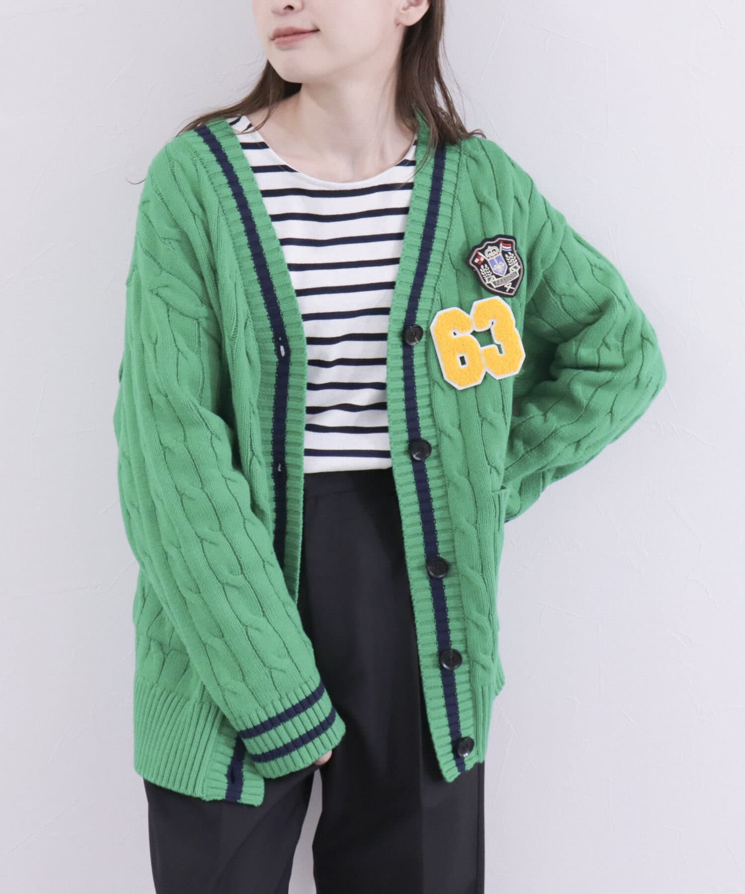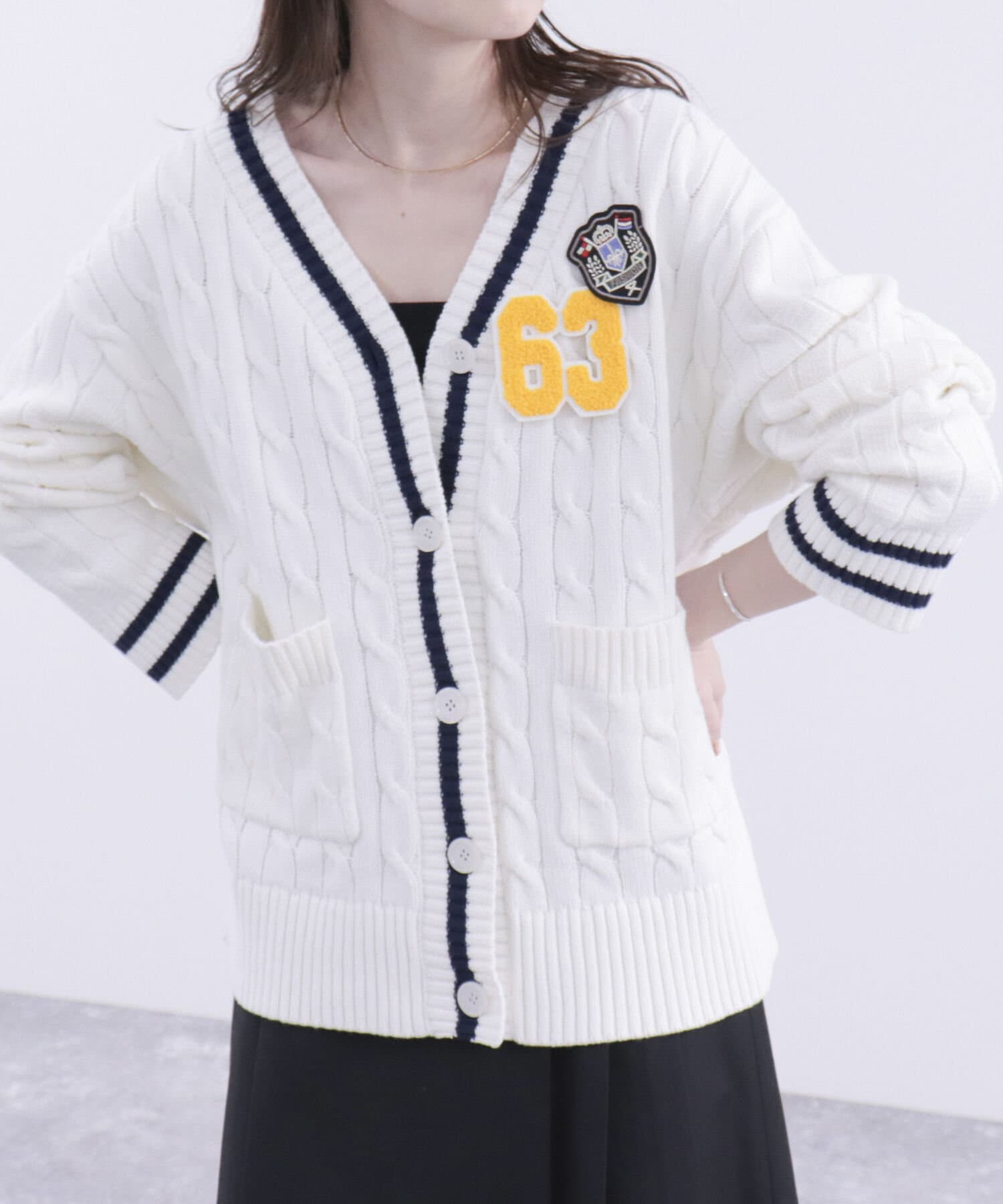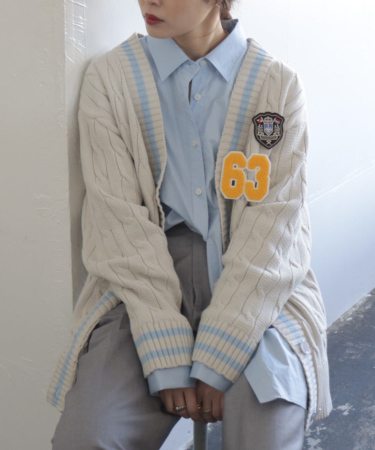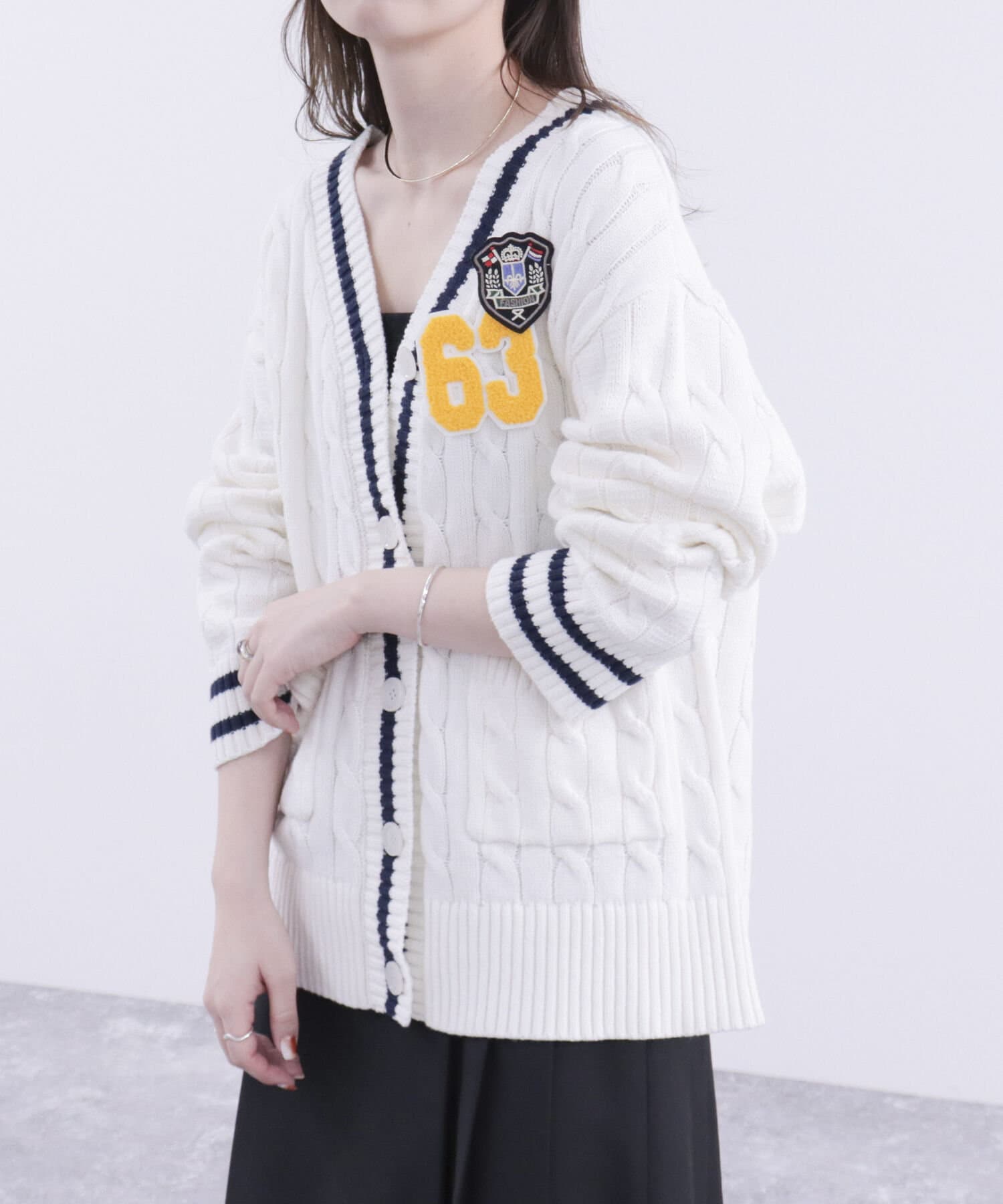 ・胸元のワッペンが目を惹くカレッジカーディガン