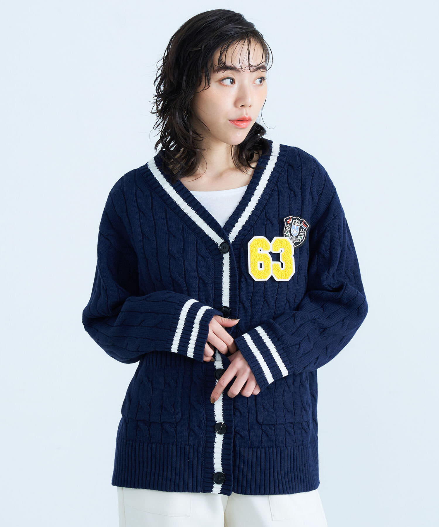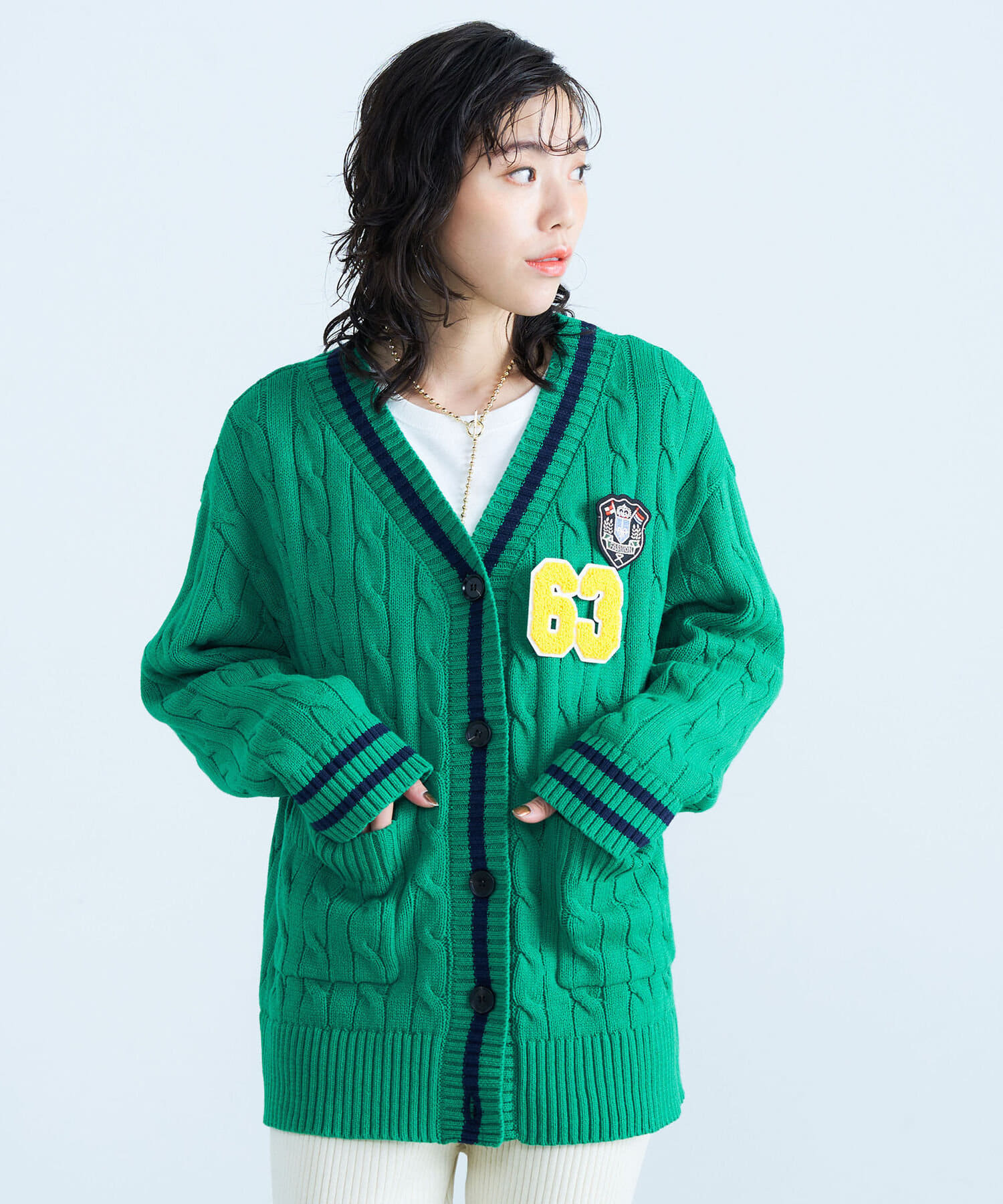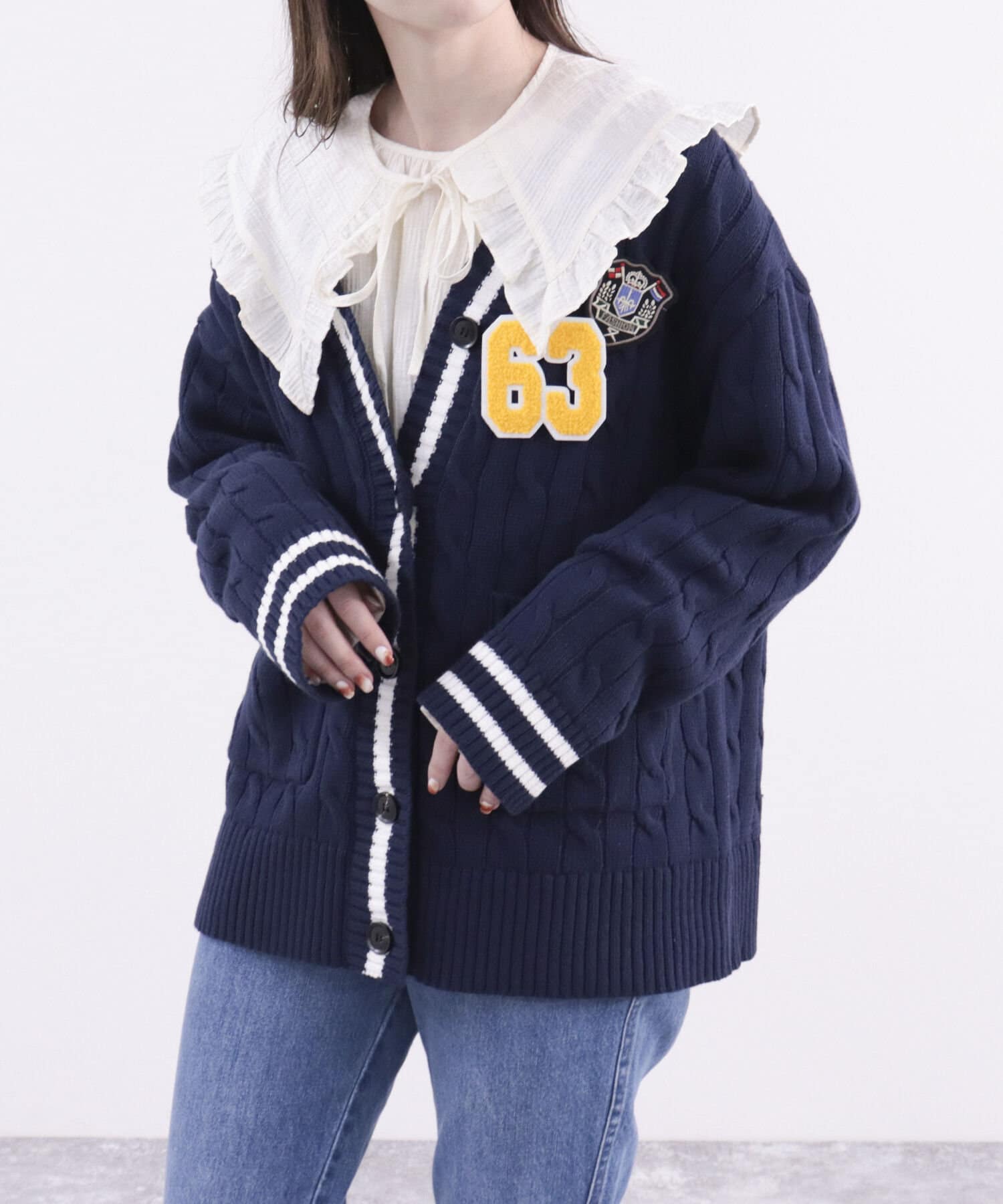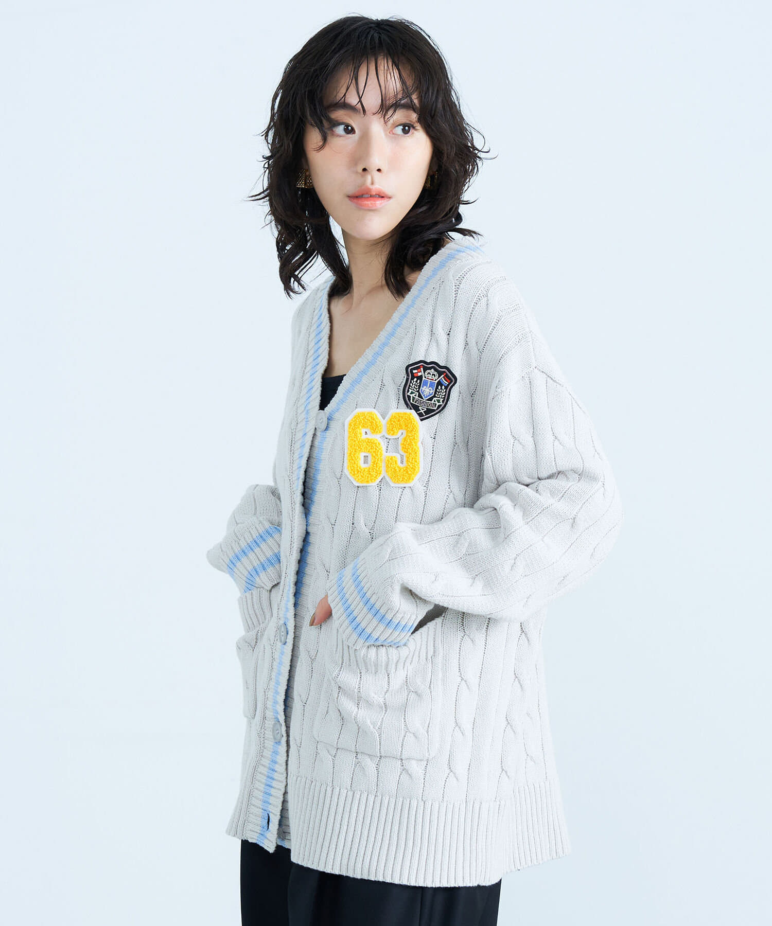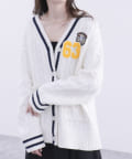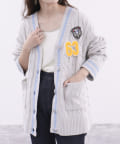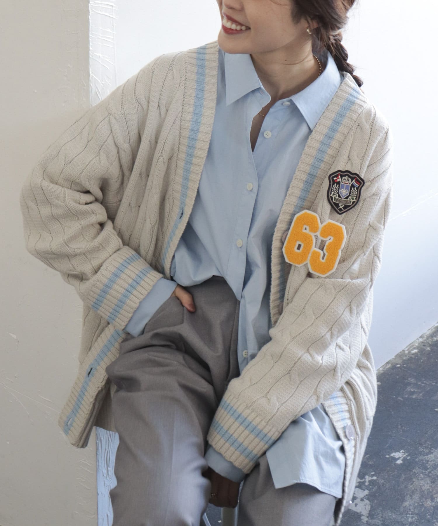 ・胸元のワッペンが目を惹くカレッジカーディガン