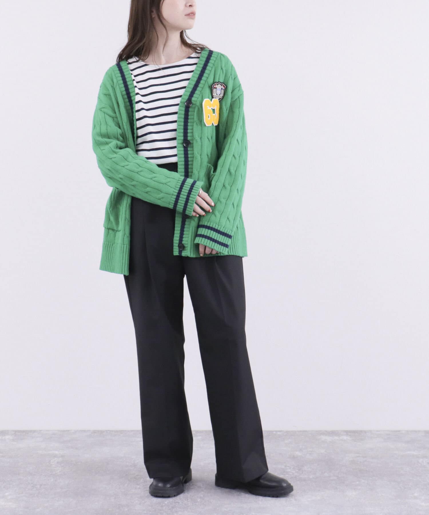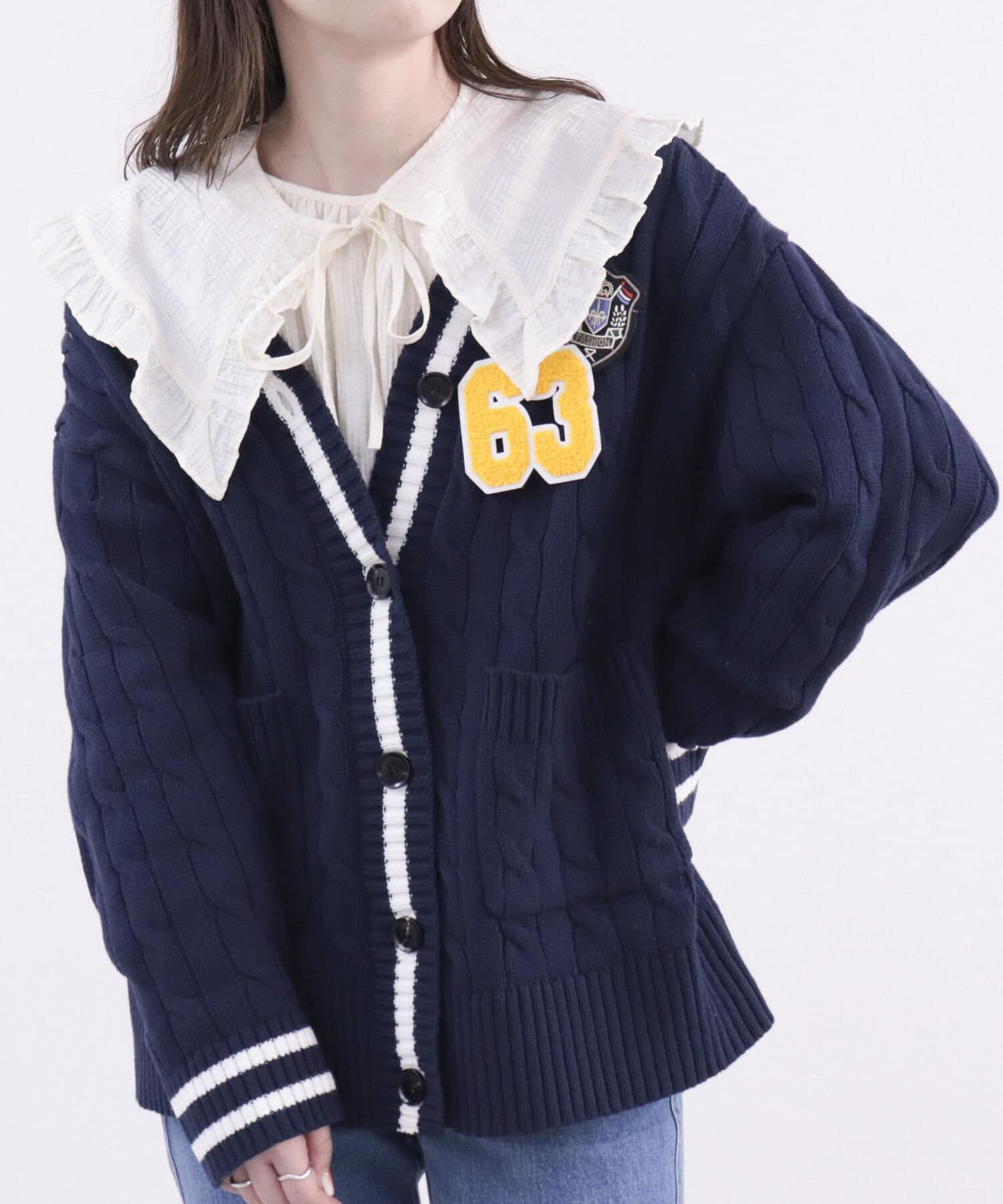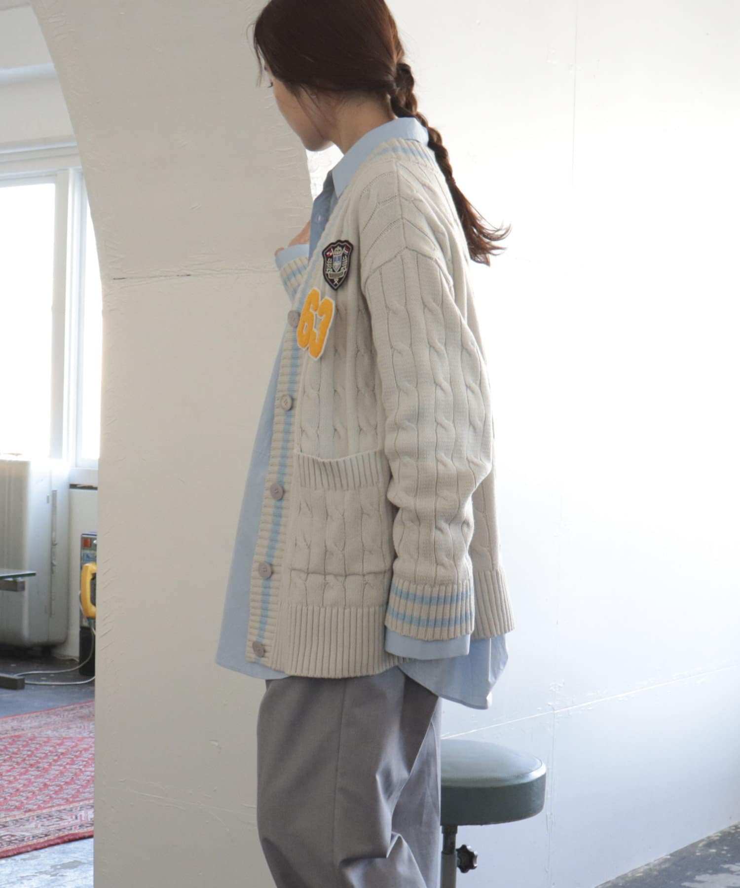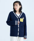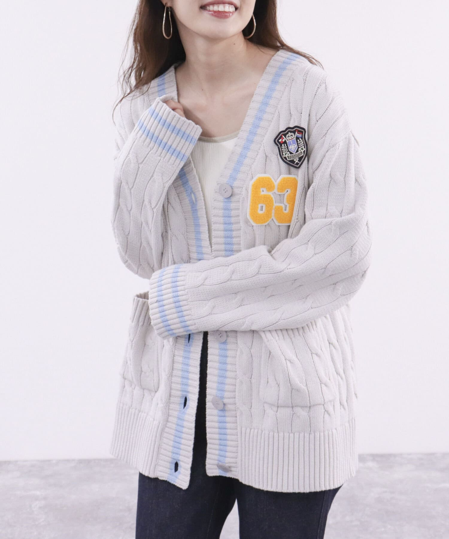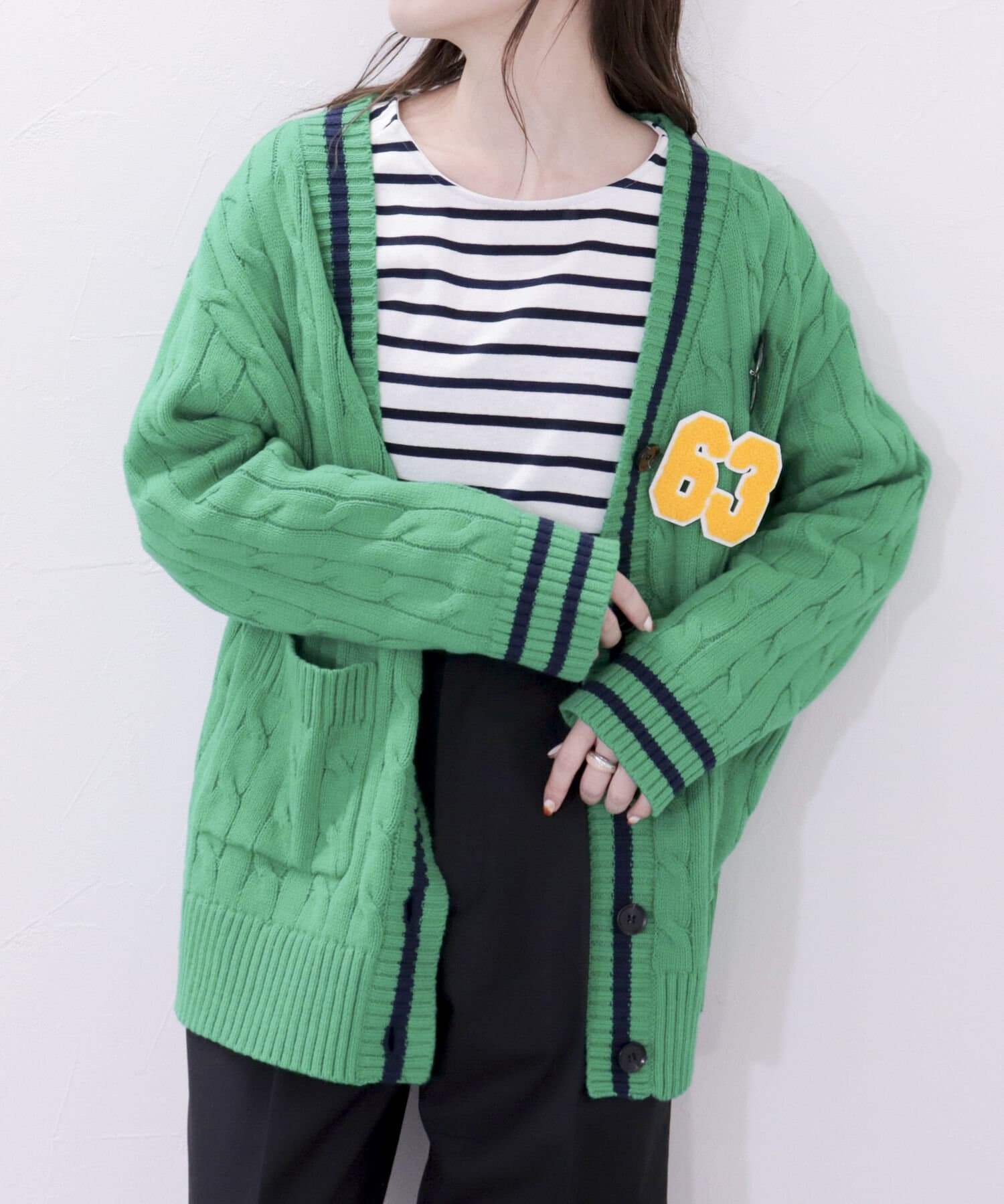 ・胸元のワッペンが目を惹くカレッジカーディガン