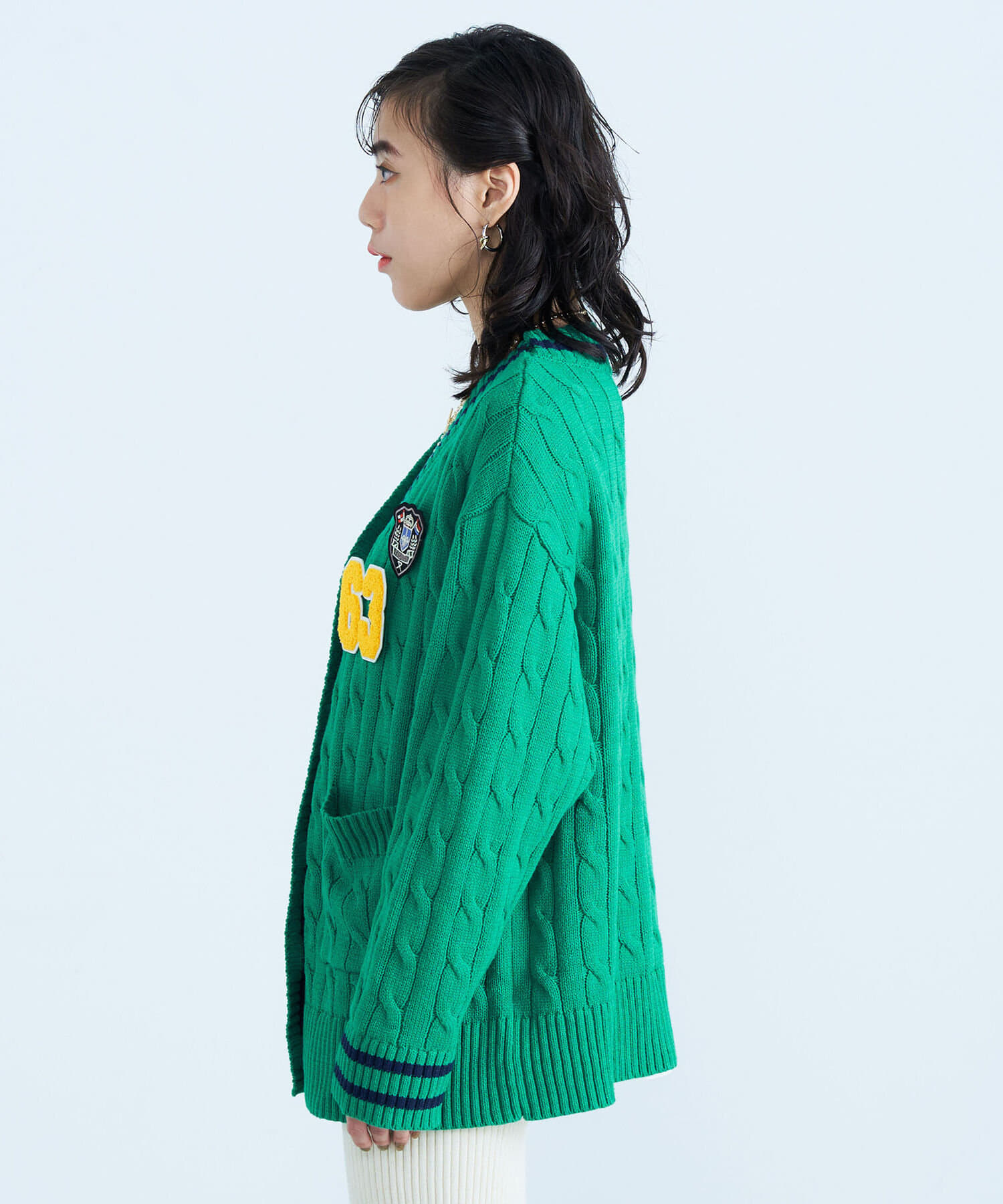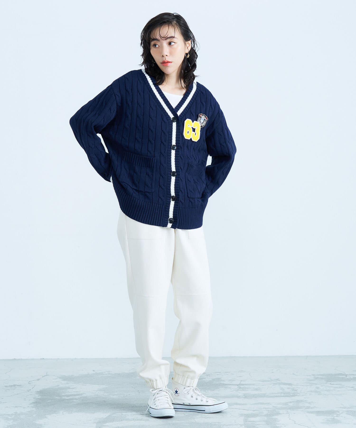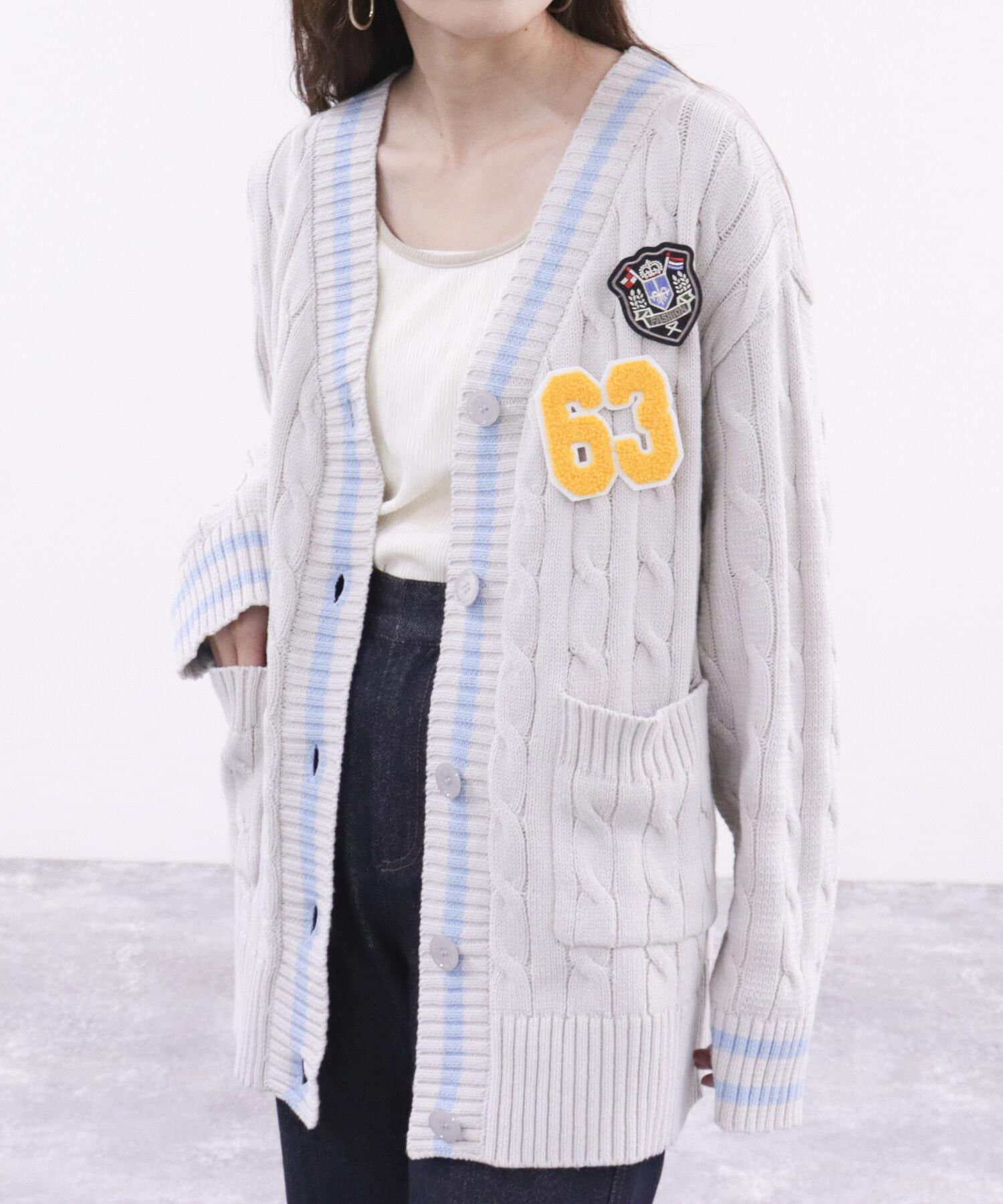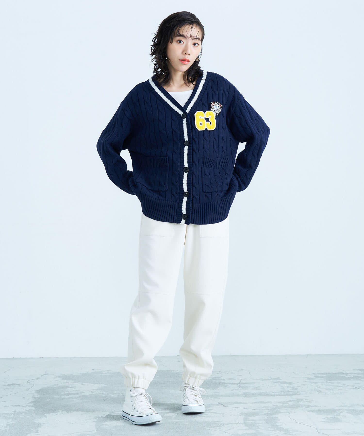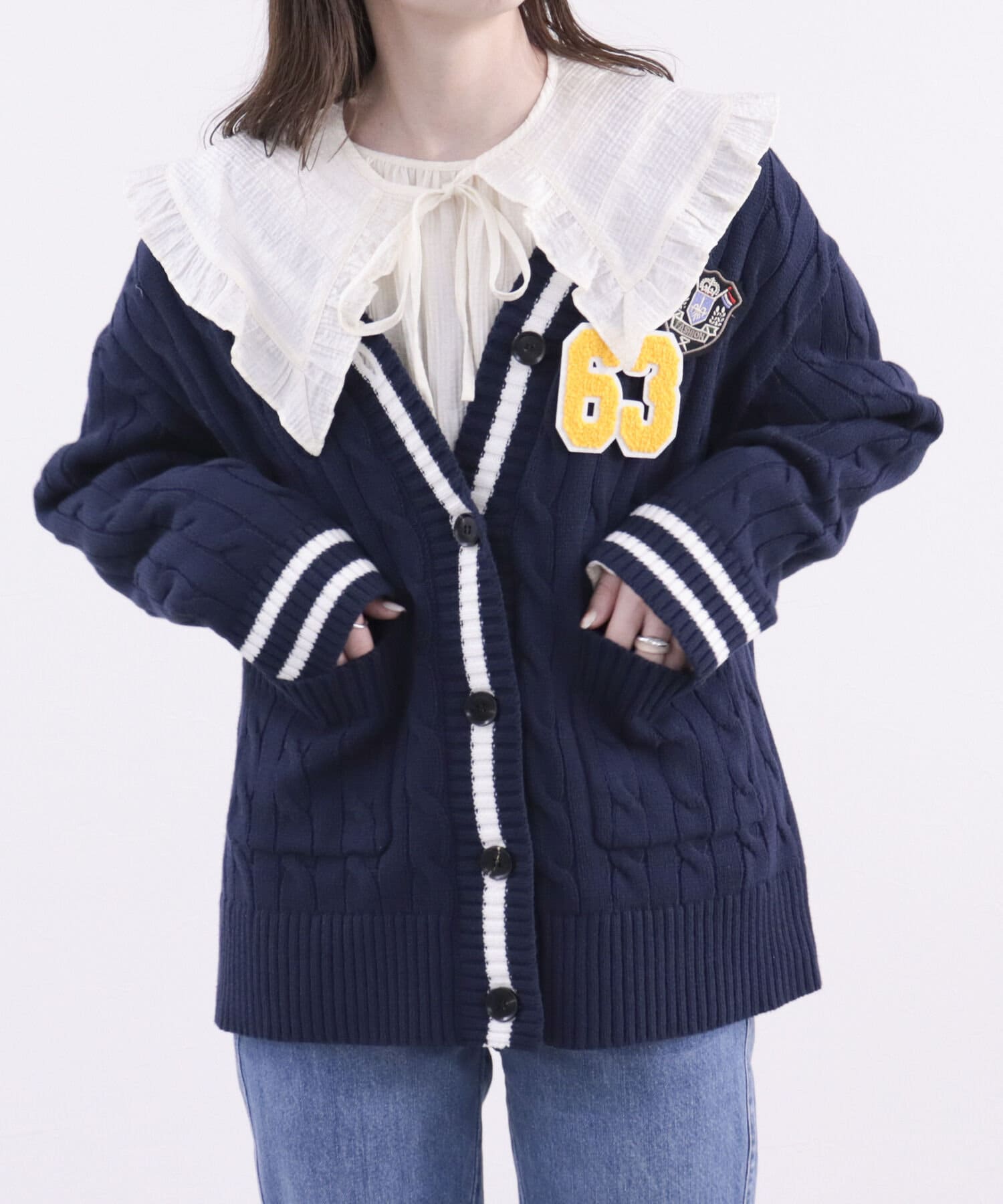 ・胸元のワッペンが目を惹くカレッジカーディガン