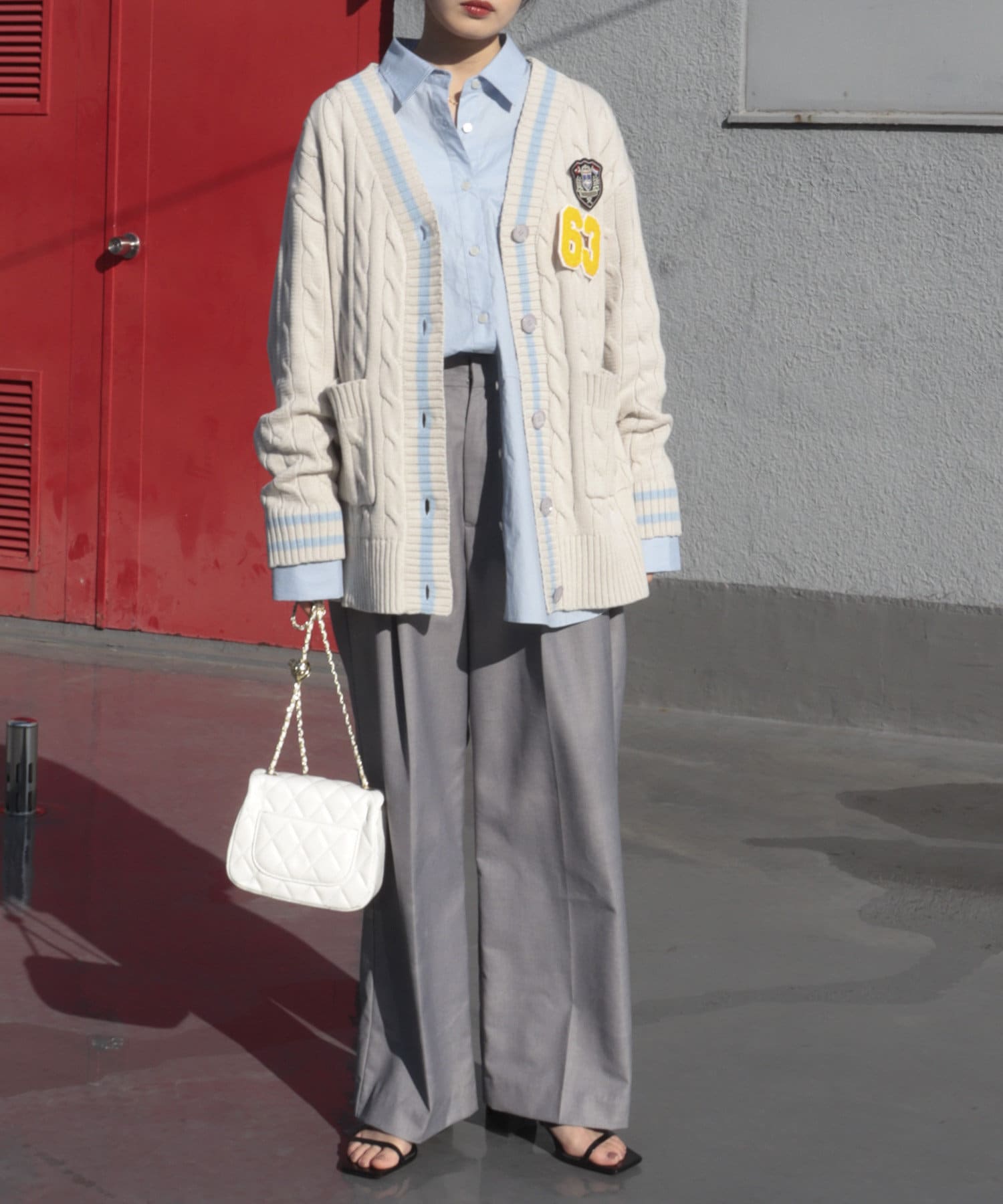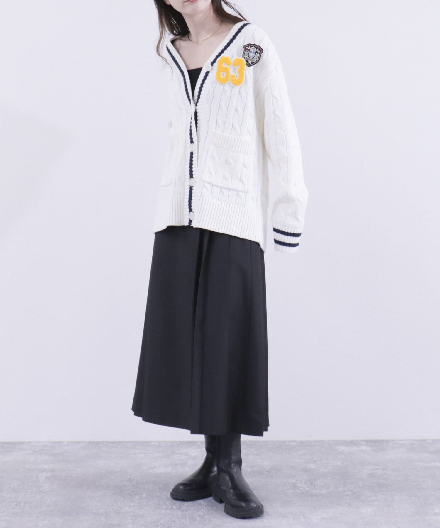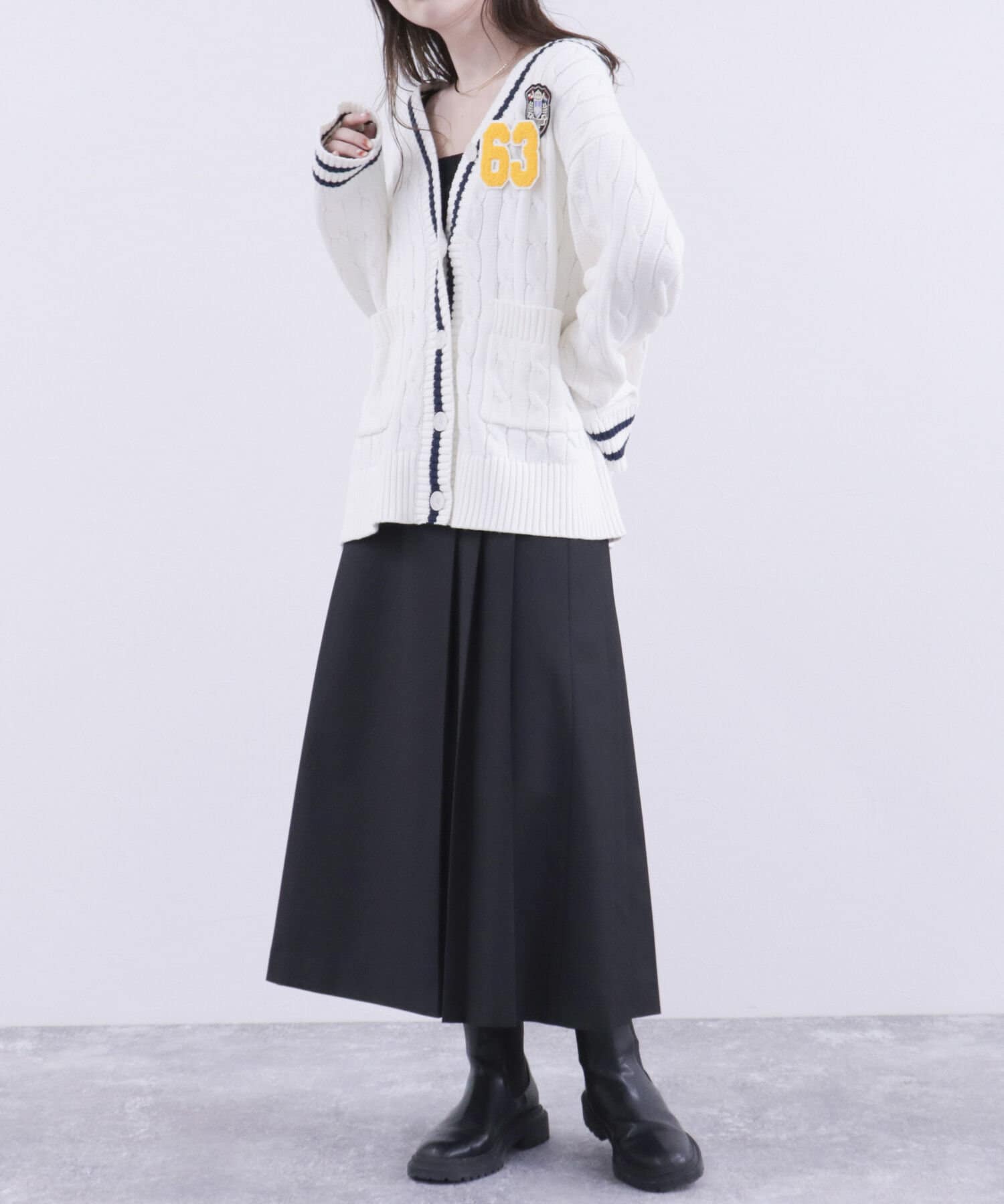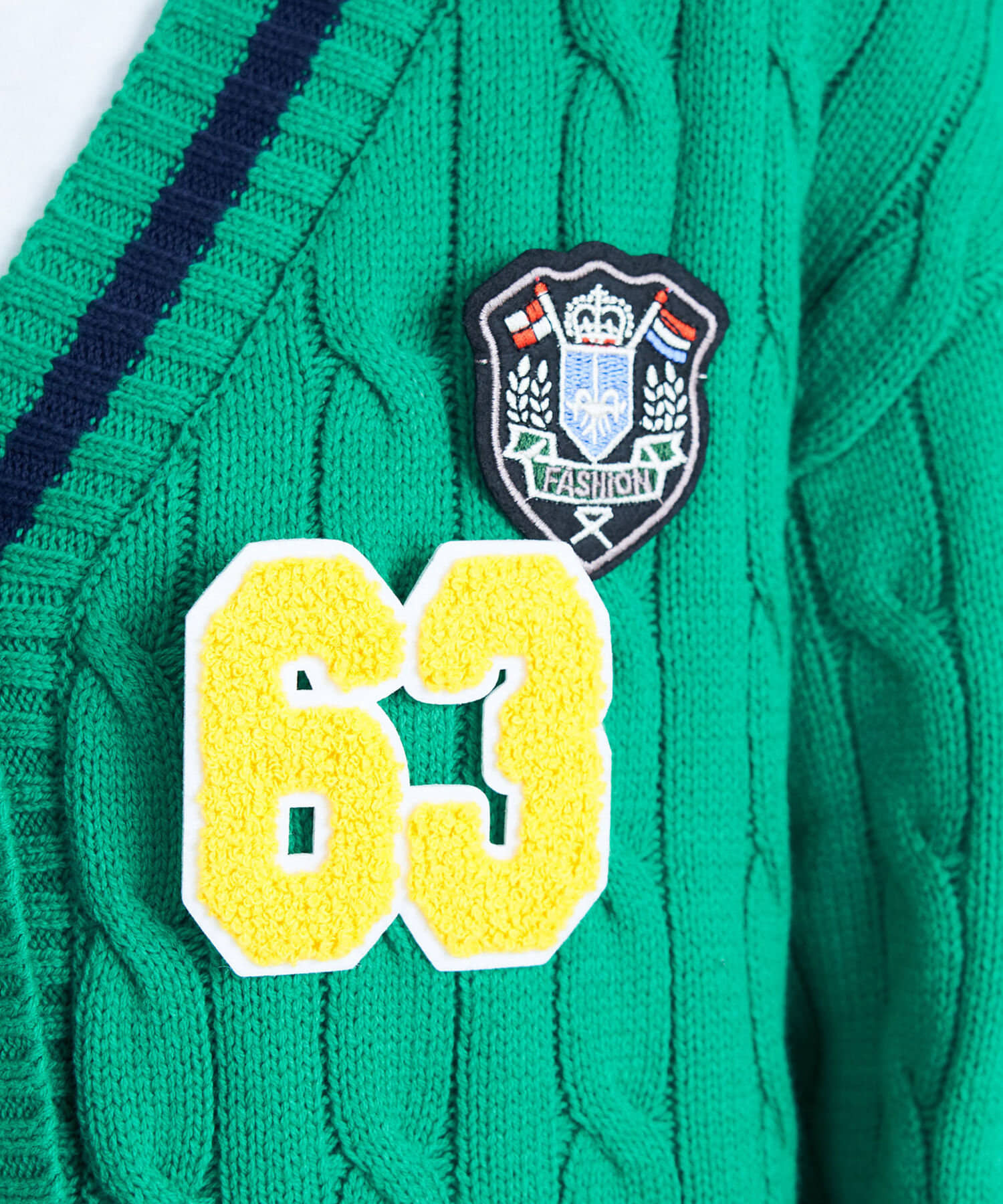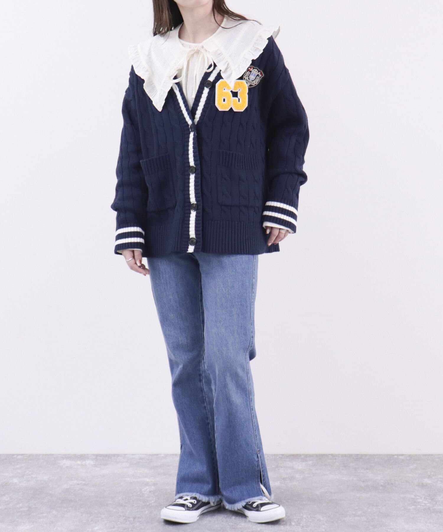 ・胸元のワッペンが目を惹くカレッジカーディガン