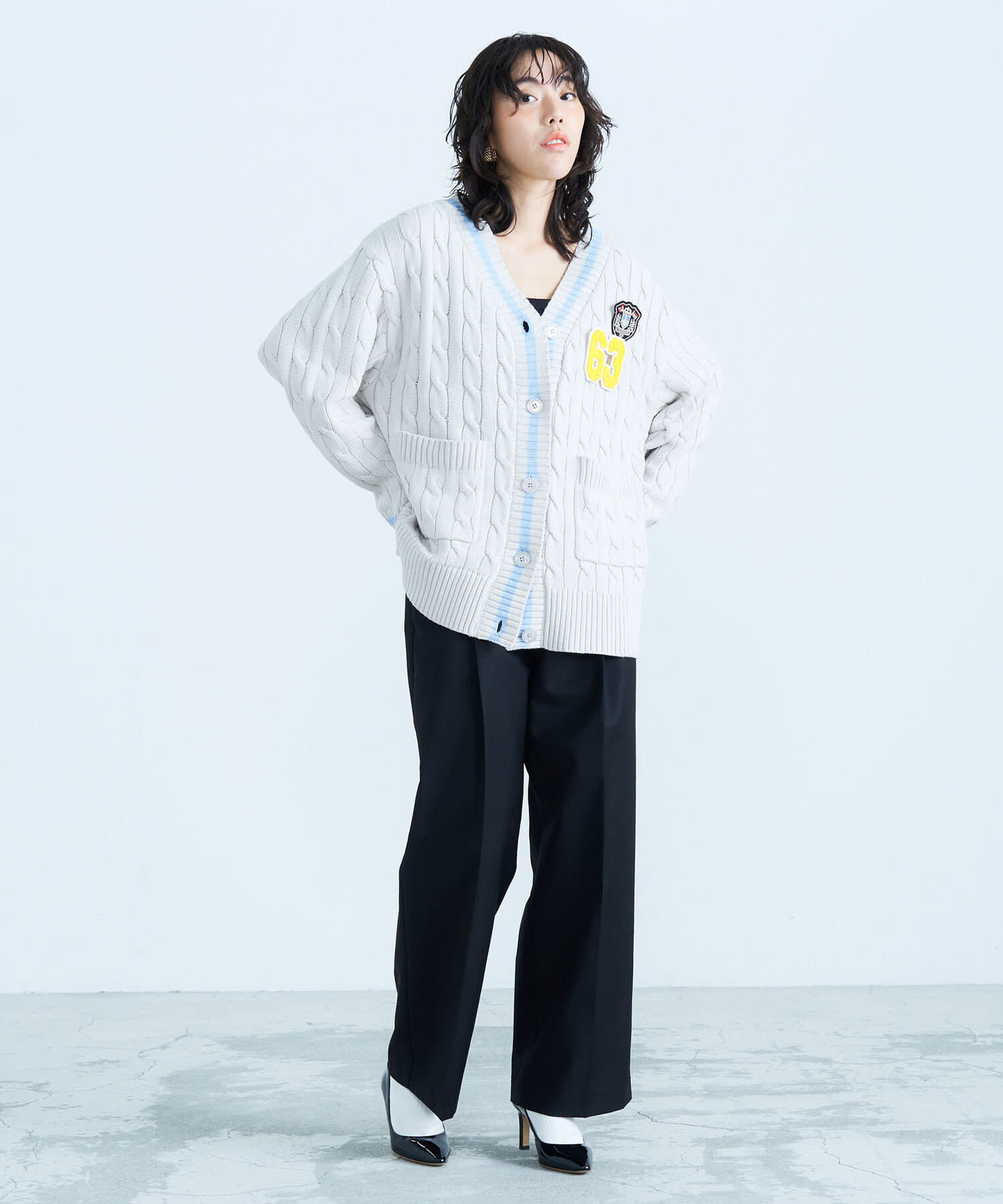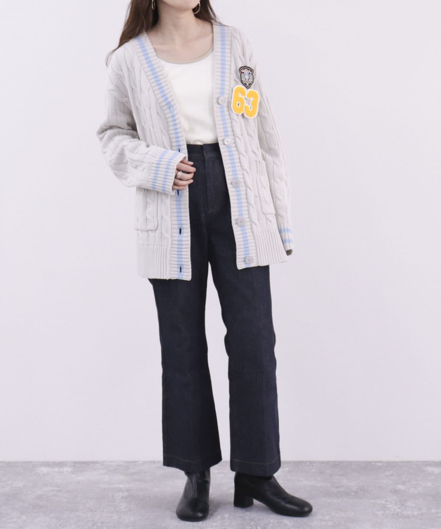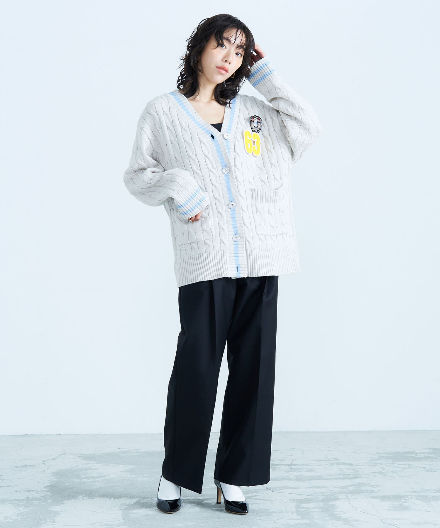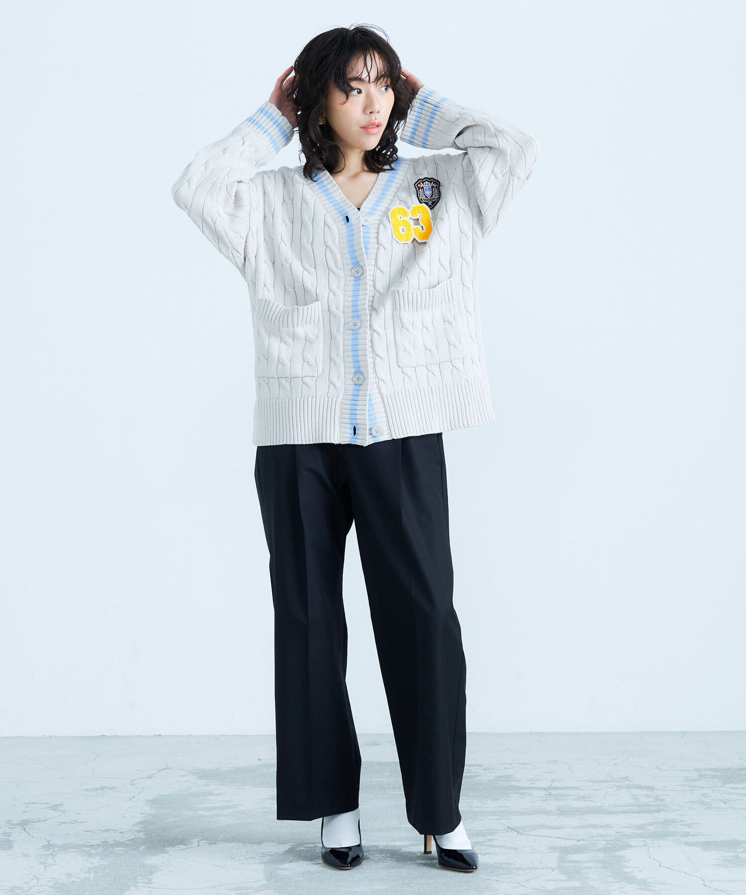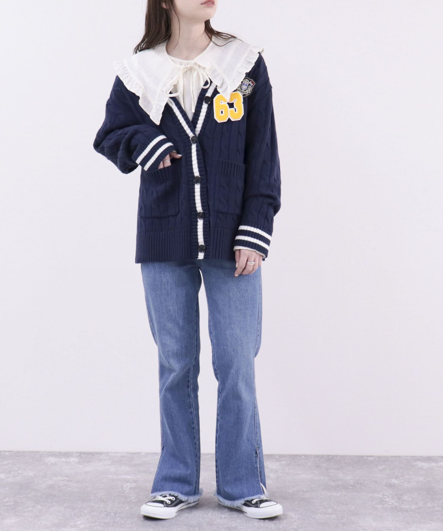 ・胸元のワッペンが目を惹くカレッジカーディガン