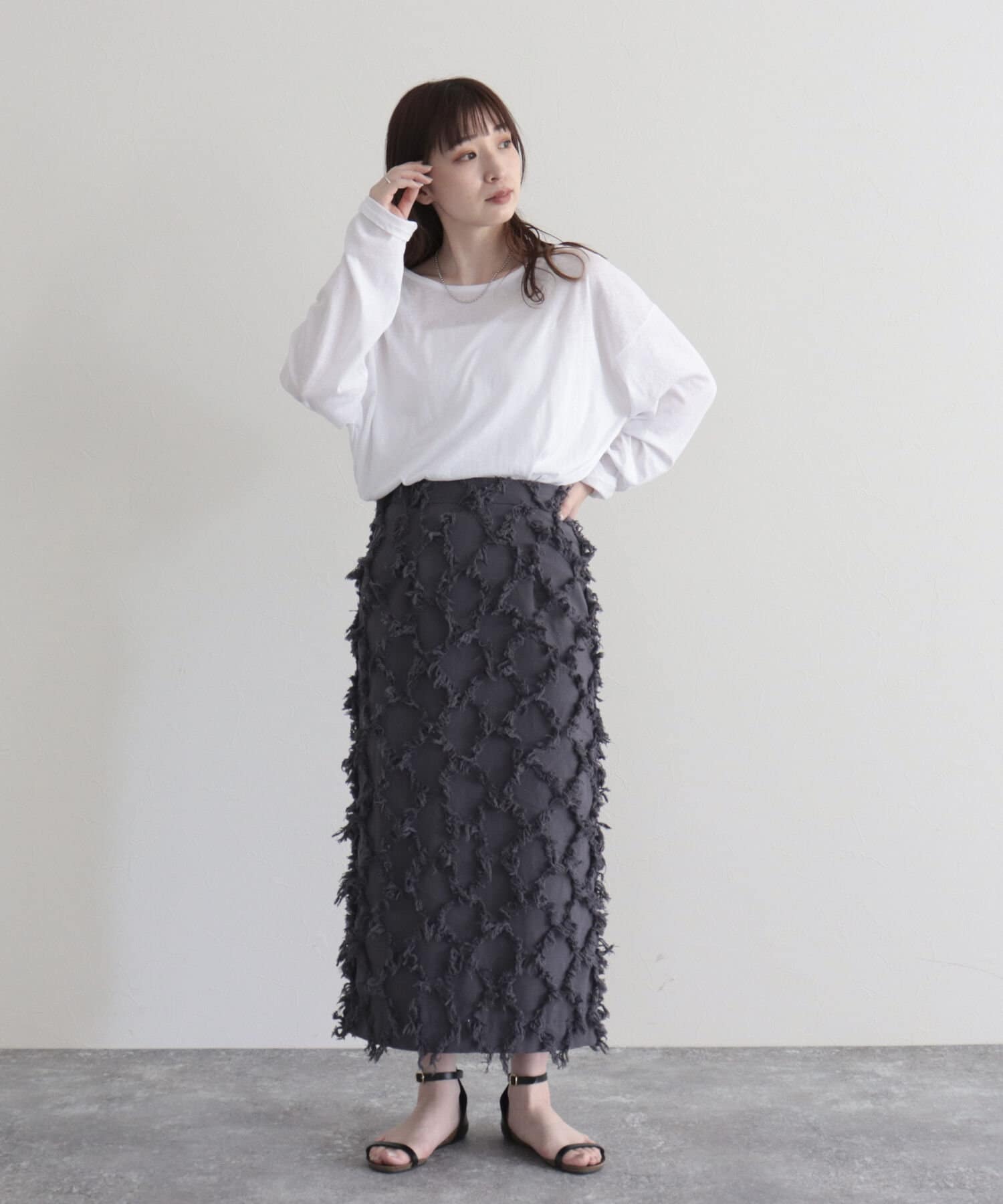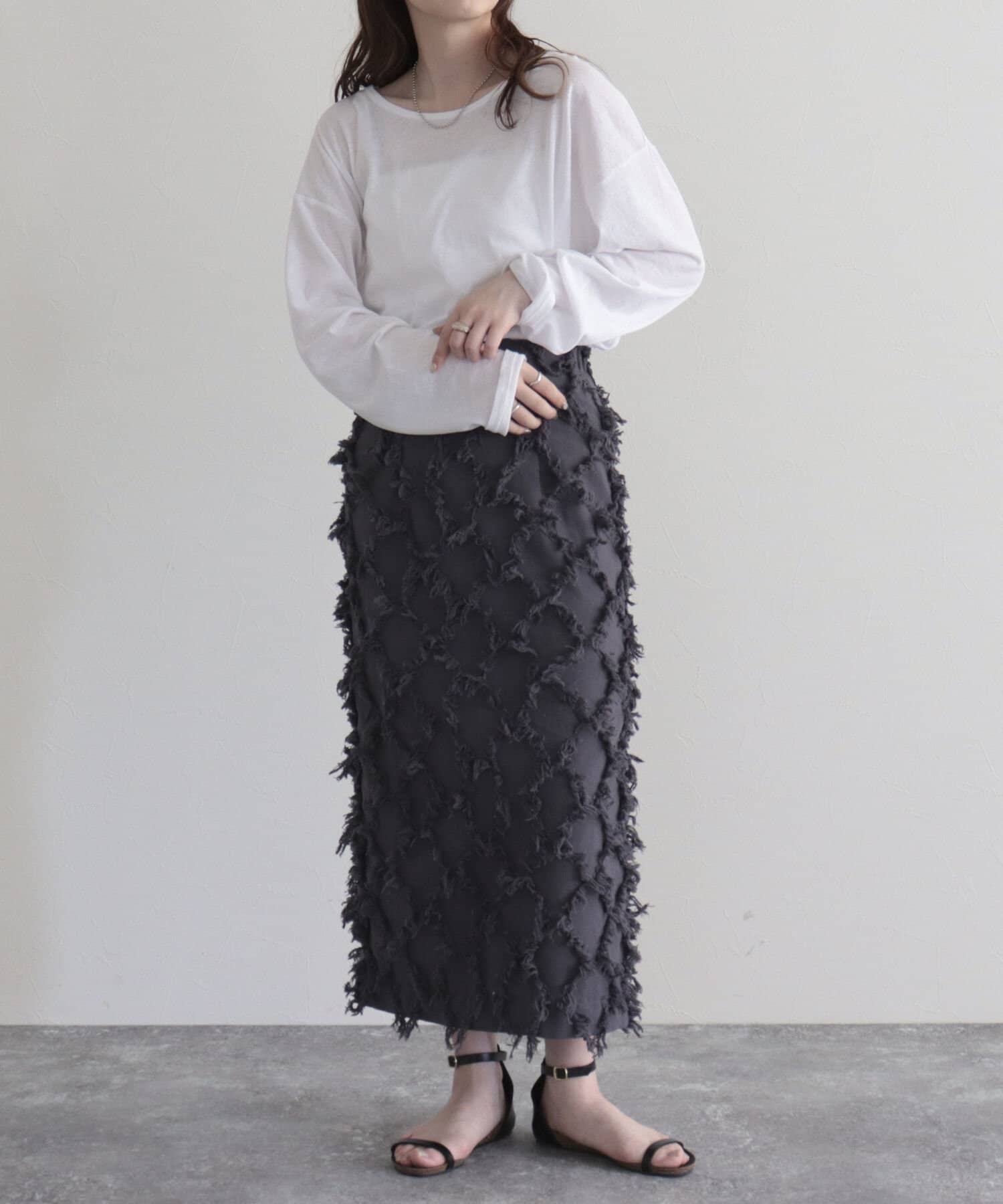 ・ベーシックな形のタイトスカートで、フリンジがコーディネートのアクセントになる1点