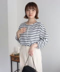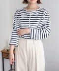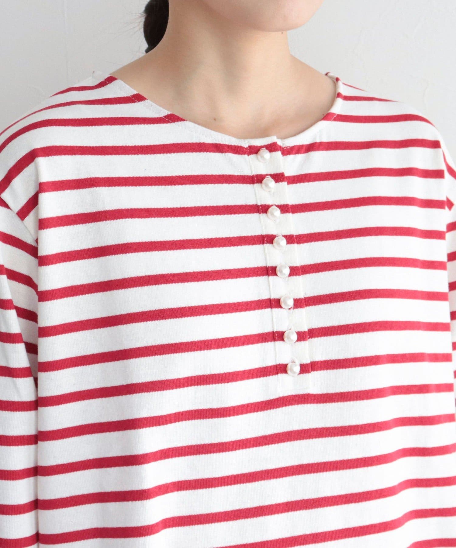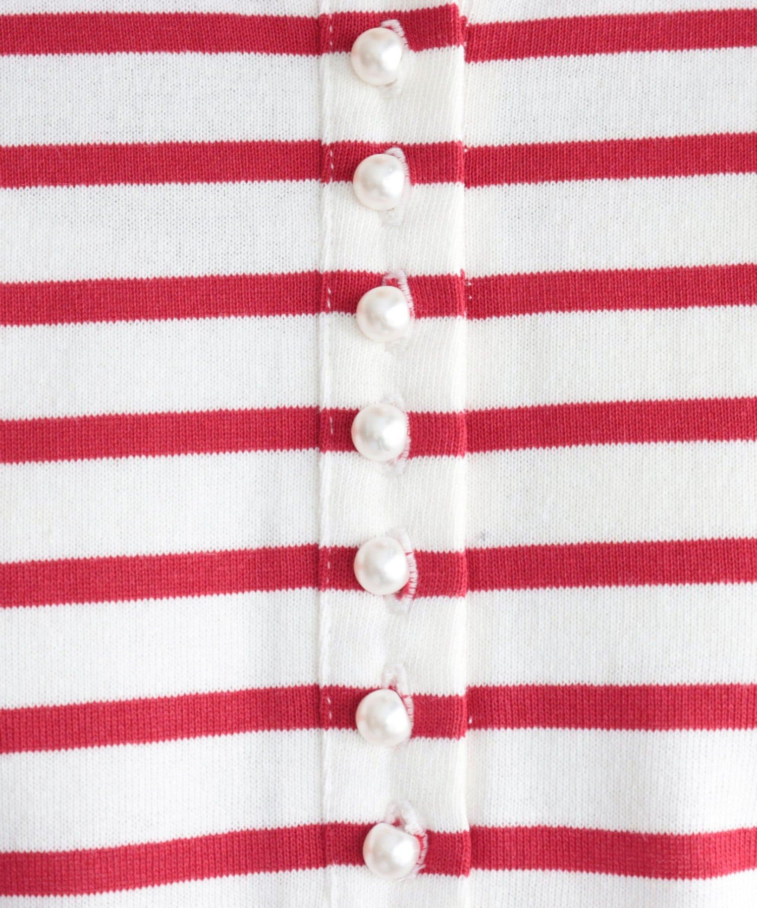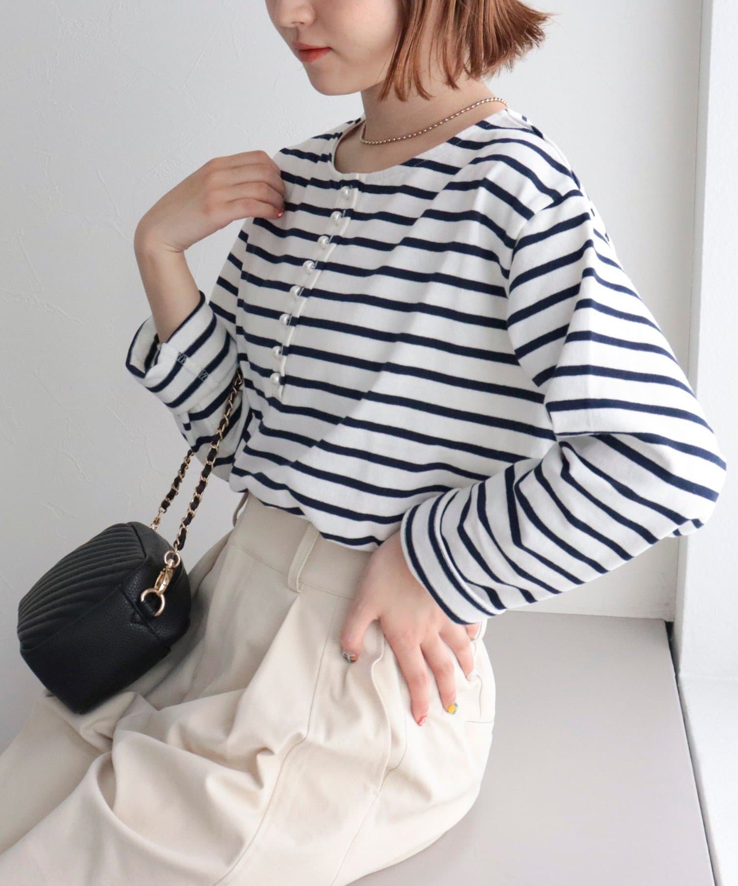 ・カジュアルなボーダーにパールボタンの組み合わせが上品なj女性らしい印象をプラスします