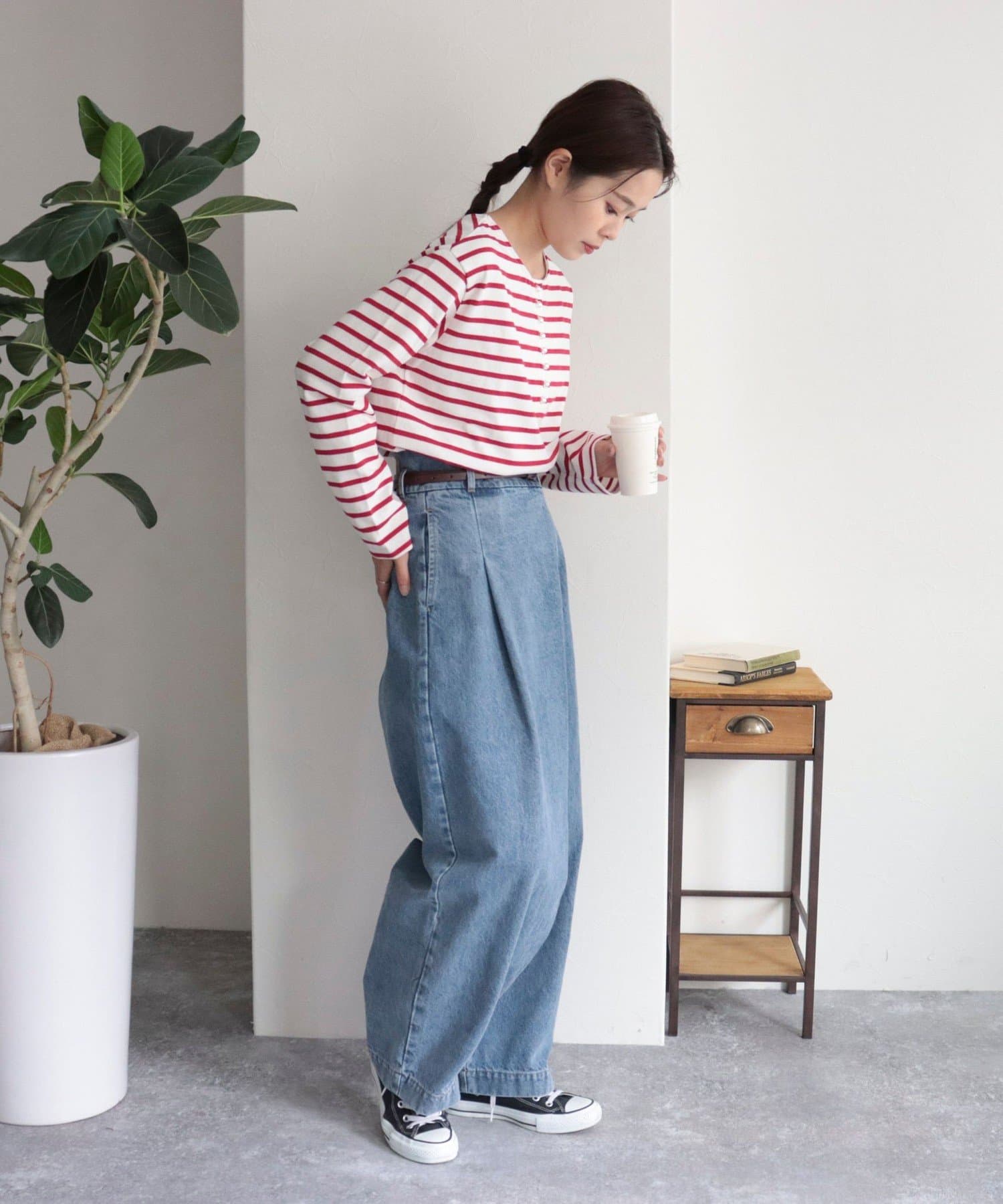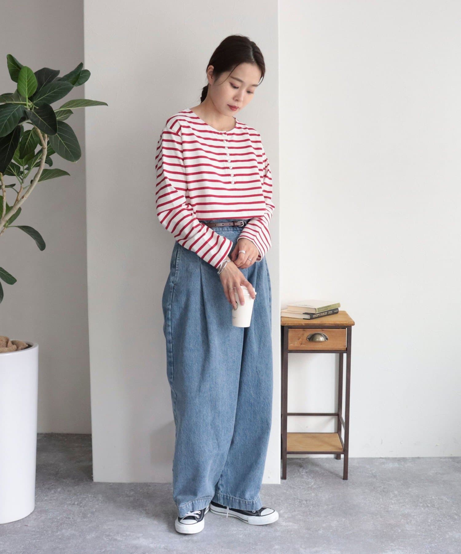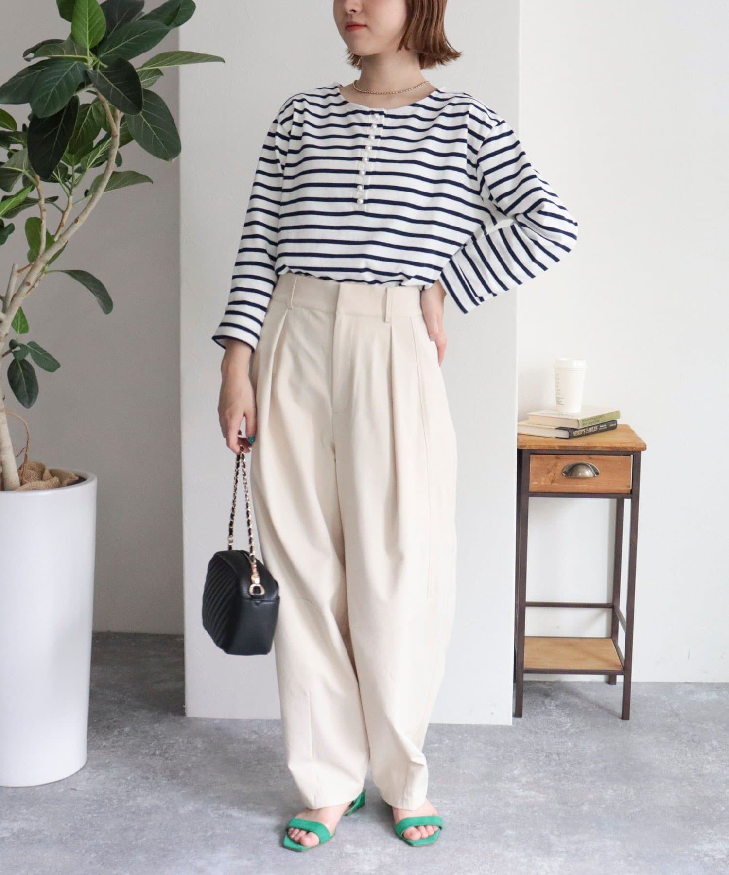 ・首元が空きすぎないヘンリーネックはカジュアルコーデに使いやすいアイテムです