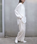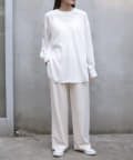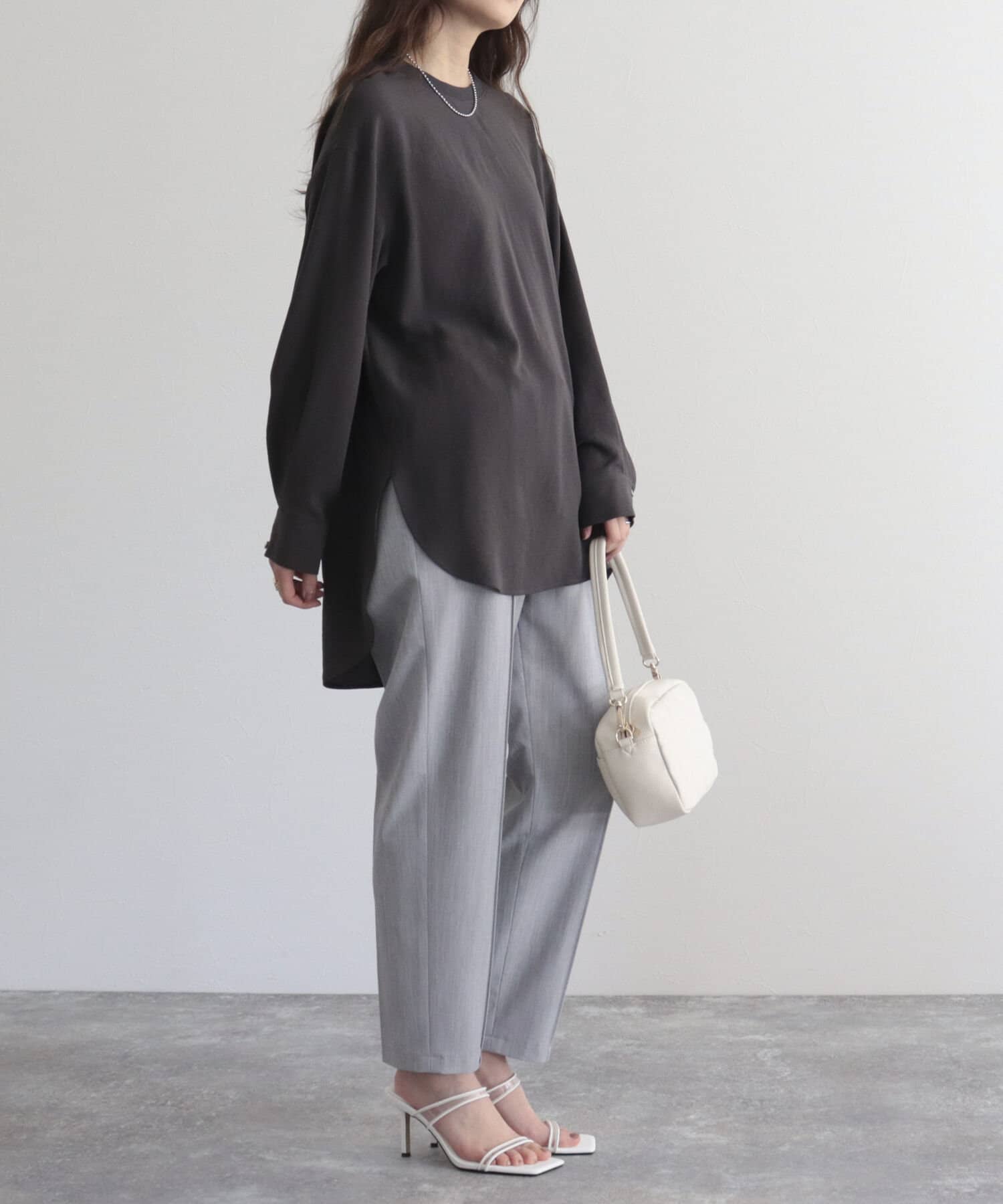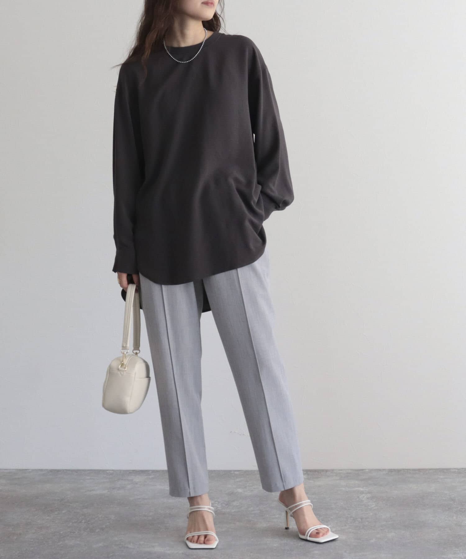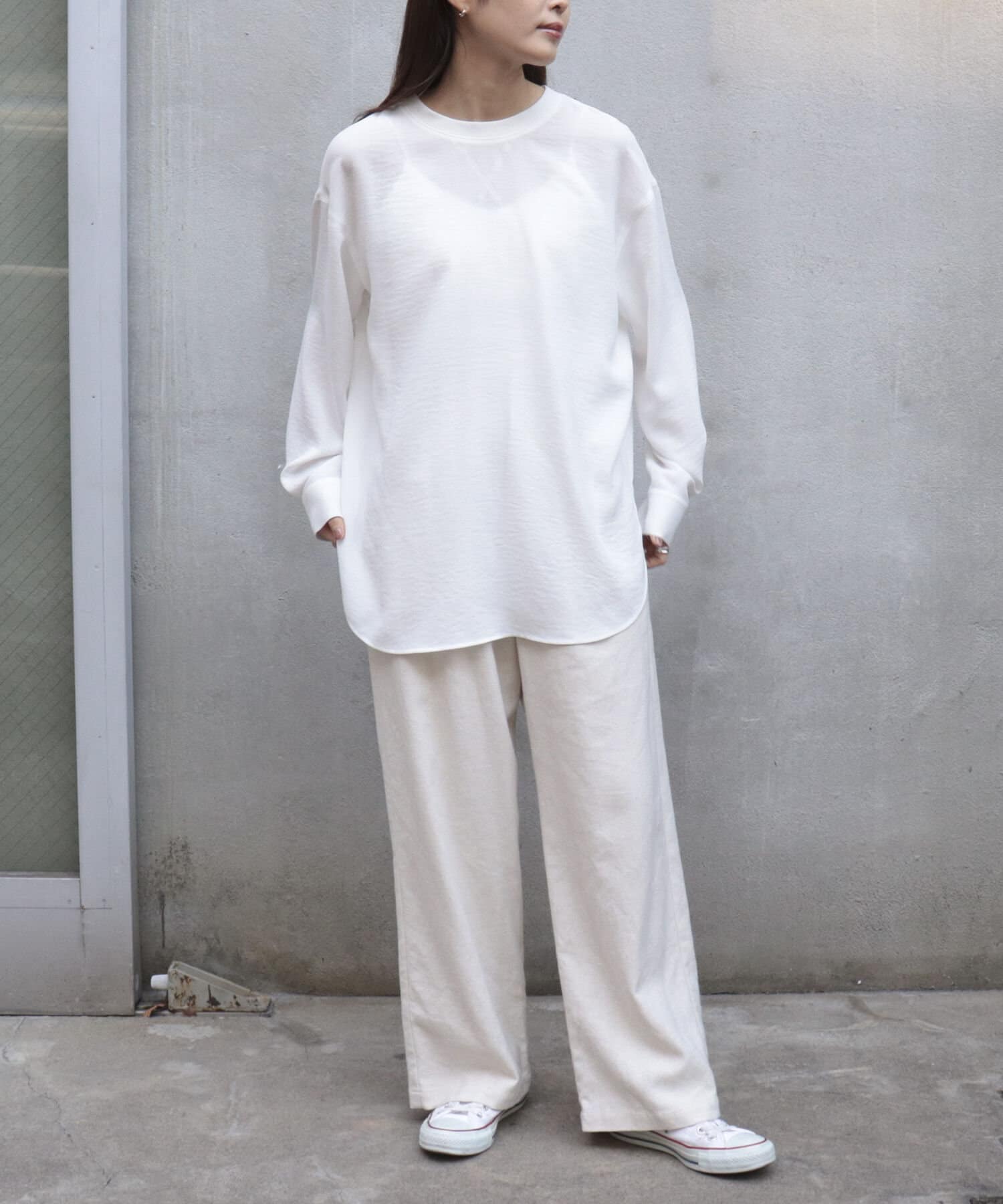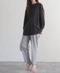 ・着丈は長めですっきりとしたパンツにウエストアウトした着こなしは腰周りをカバーしてくれるので安心感◎