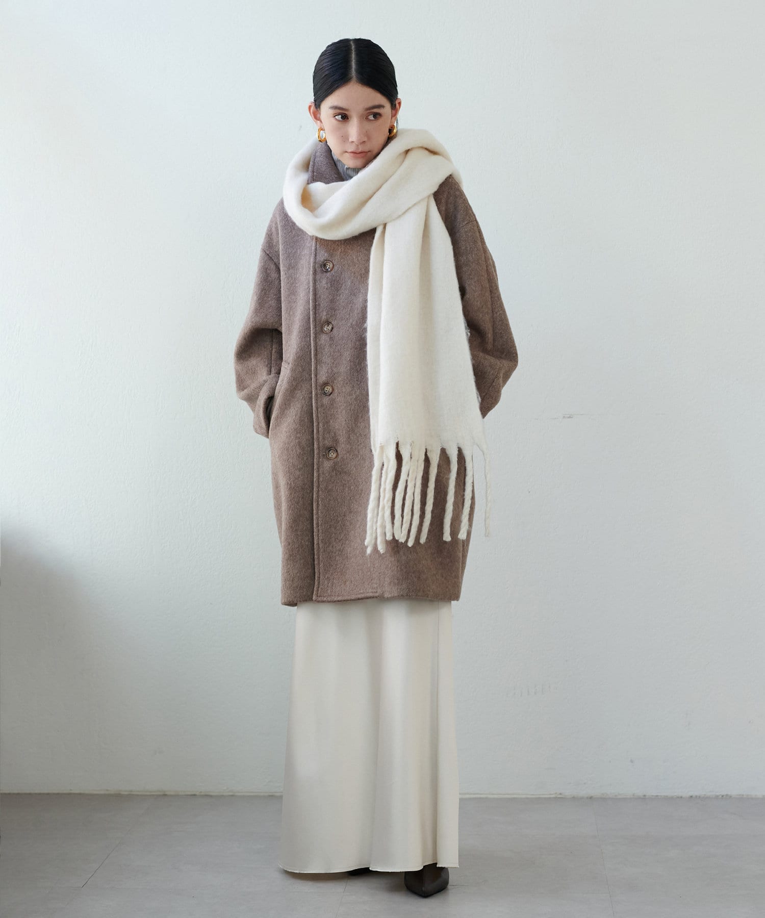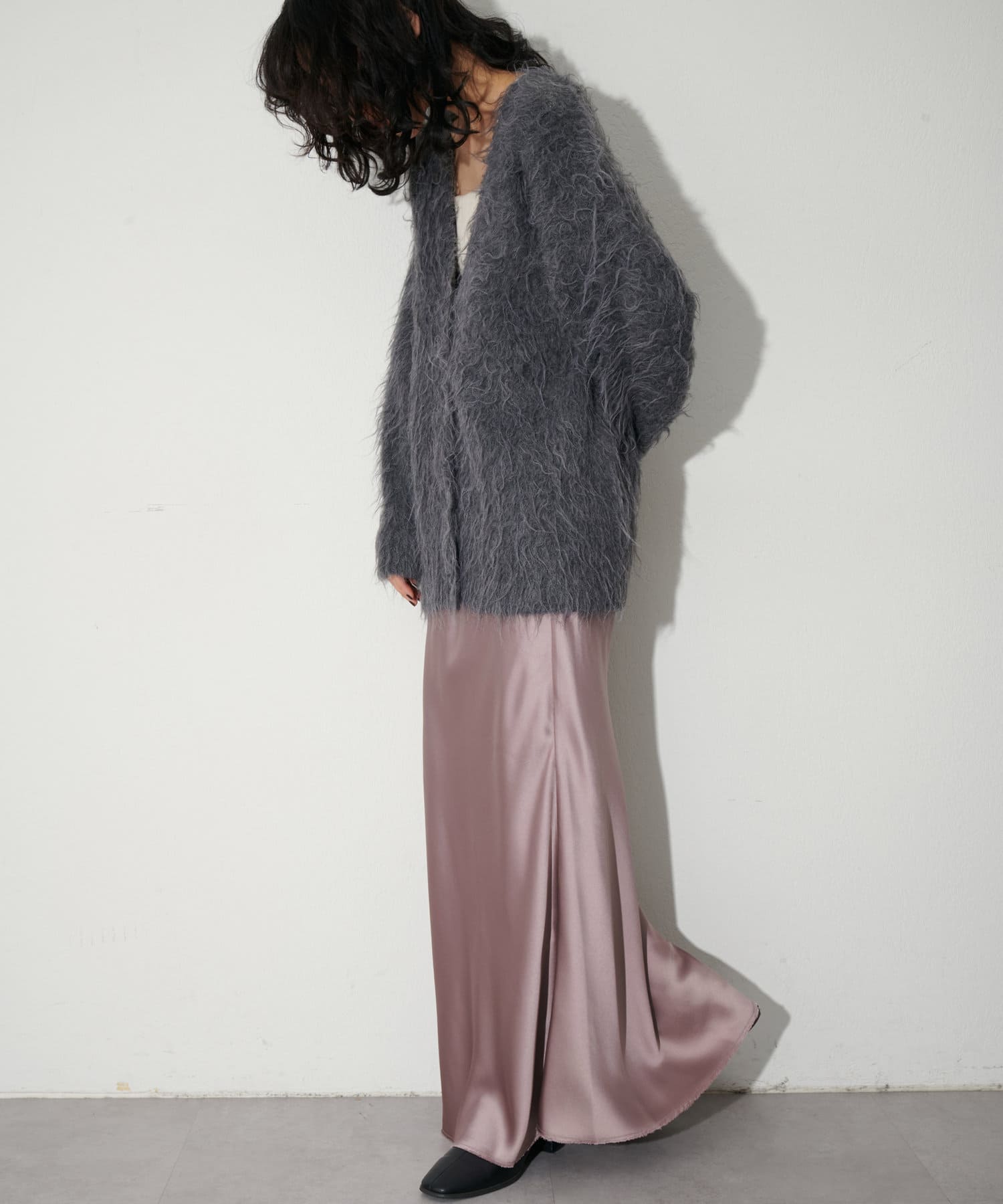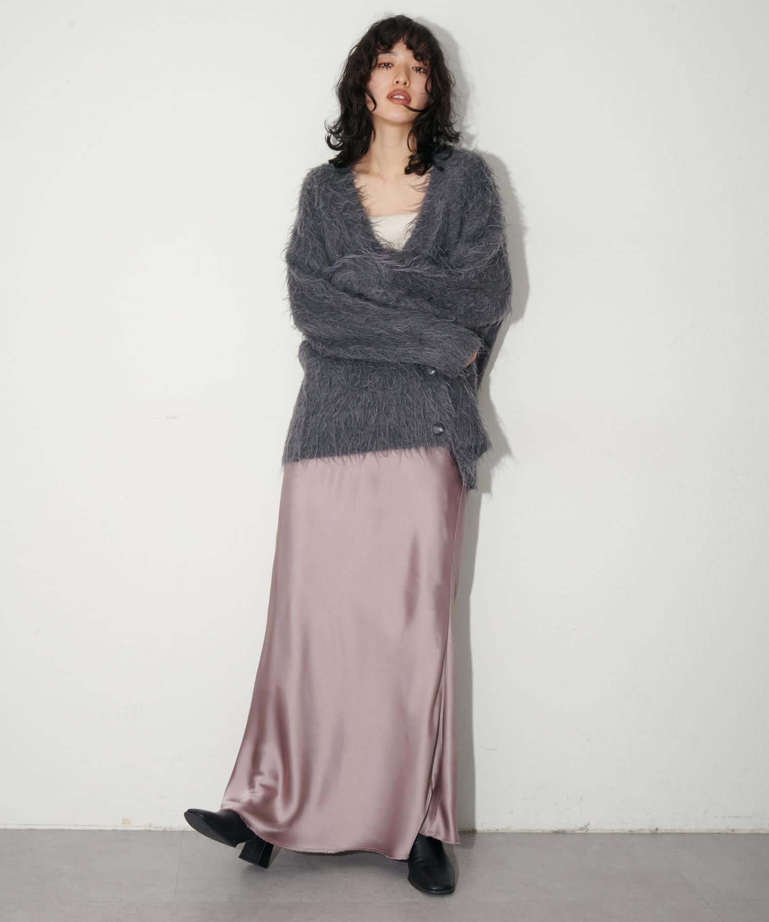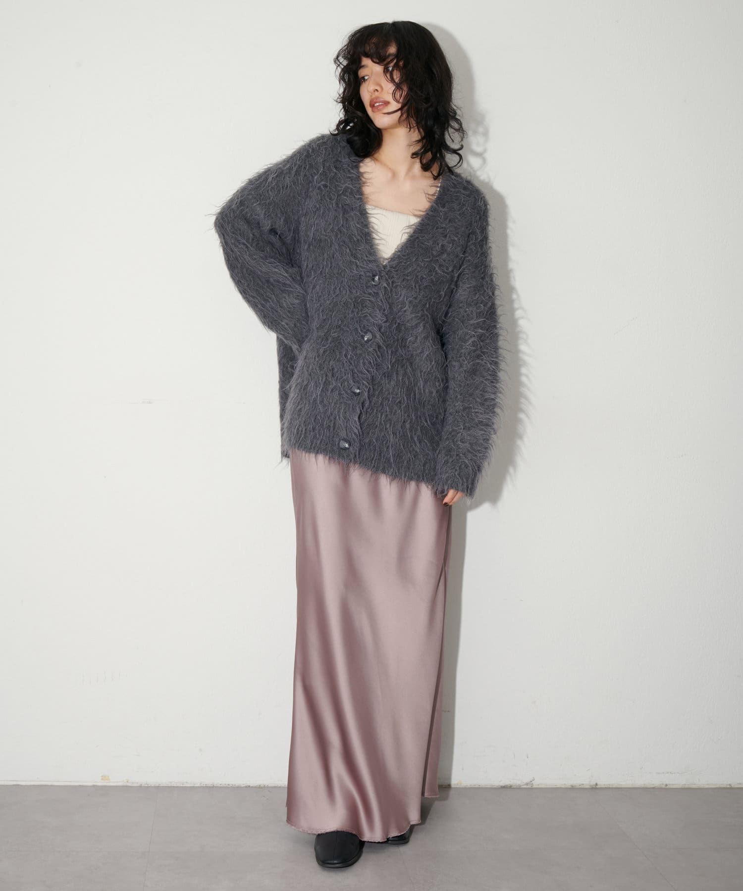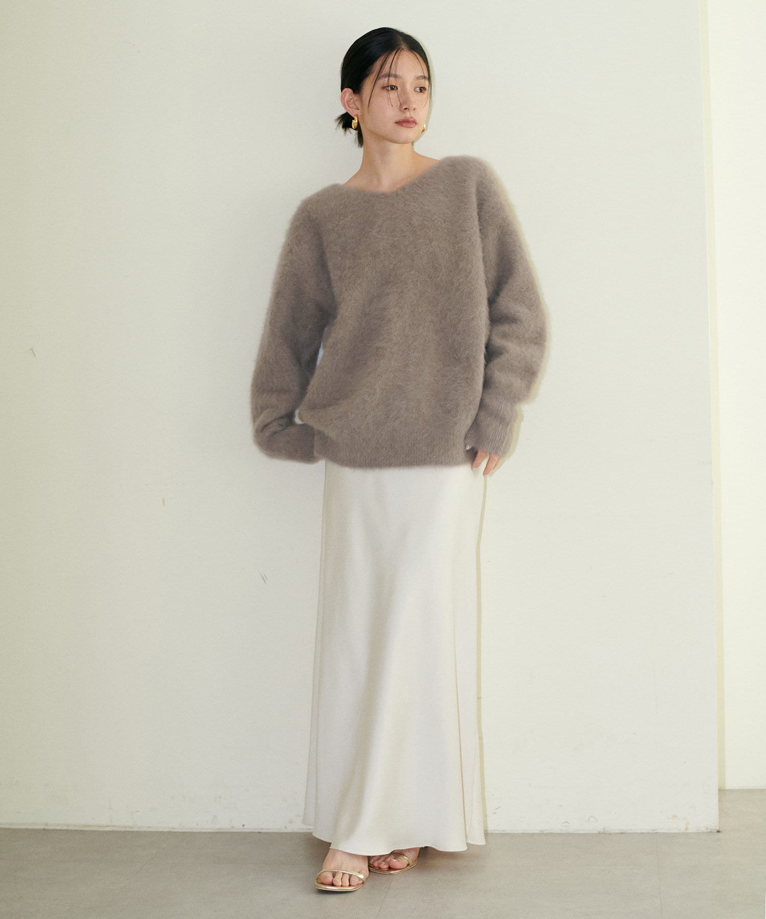 シーズンレスで着用できるので、秋冬には毛足のあるニットと合わせても◎