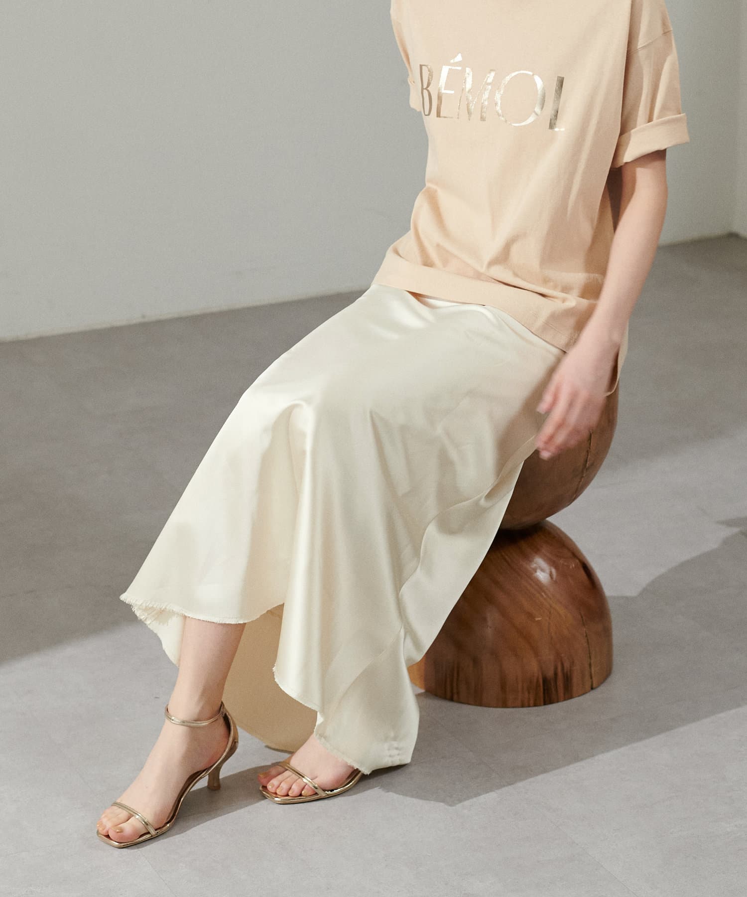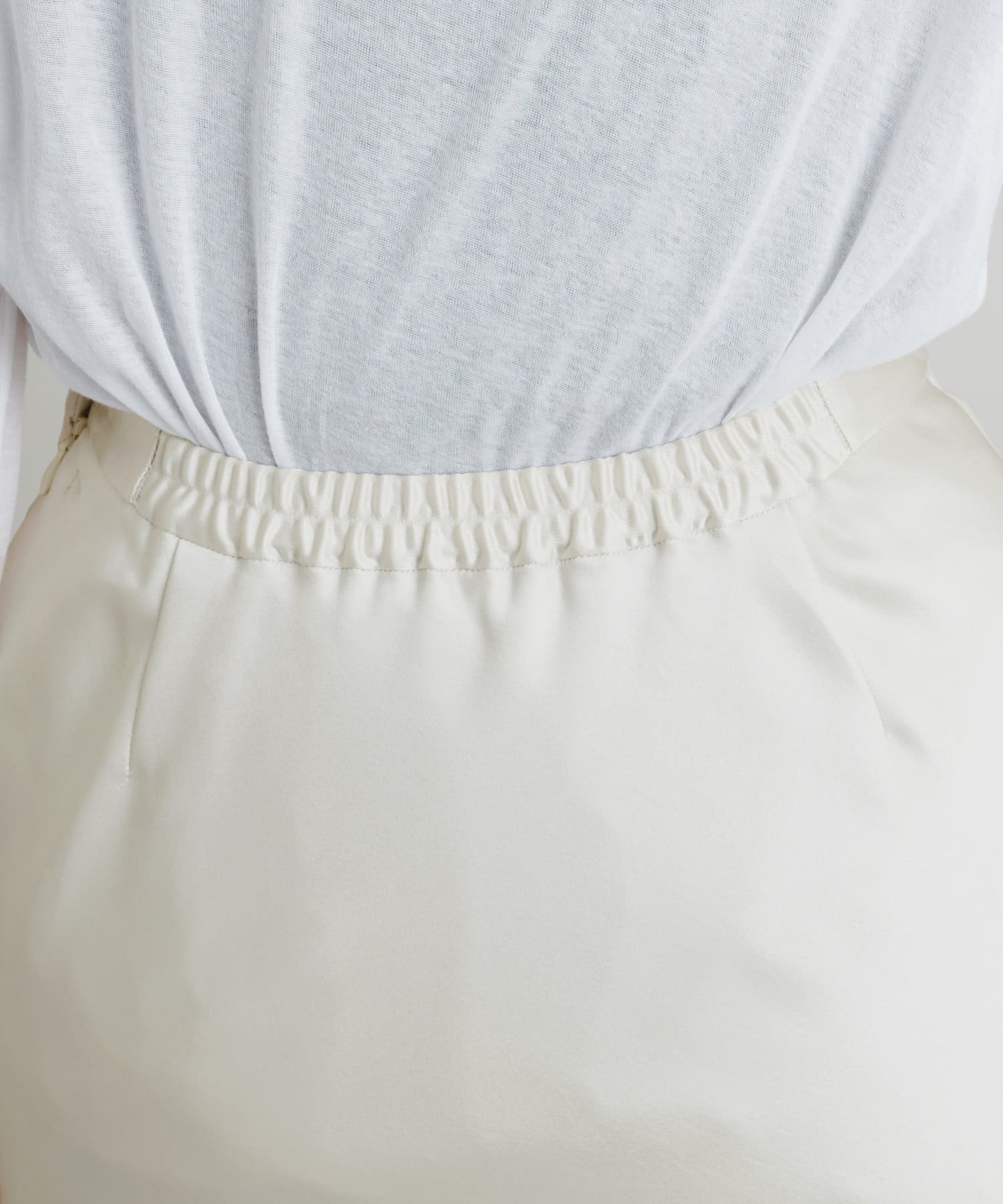 カジュアルなTシャツやカットソーと光沢のあるサテンのコーディネートは