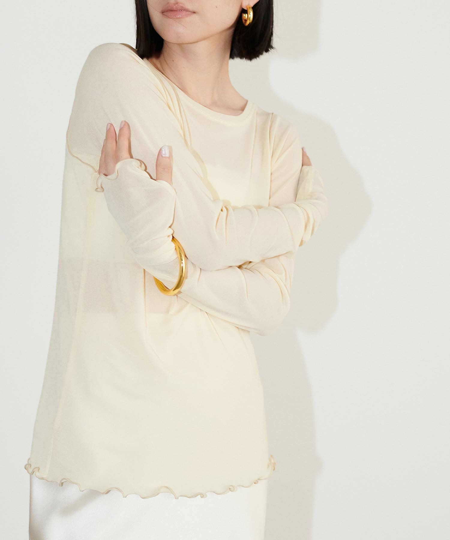 旬のシアー素材のプルオーバーが登場。ニュアンスたっぷりな程よい透け感で