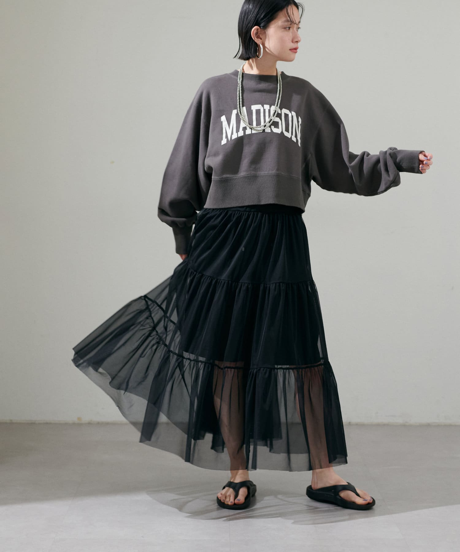 トレンドの短丈にドロップショルダー、長めの袖丈が着るだけでお洒落なシルエットに。