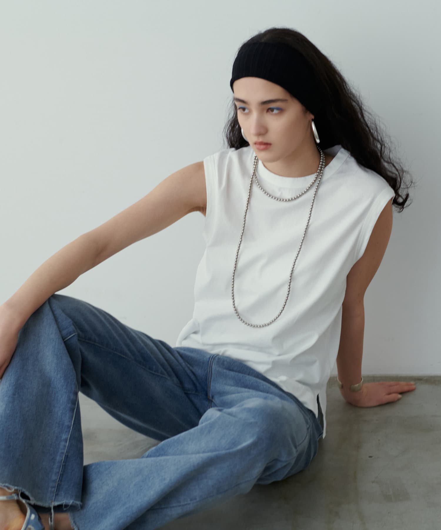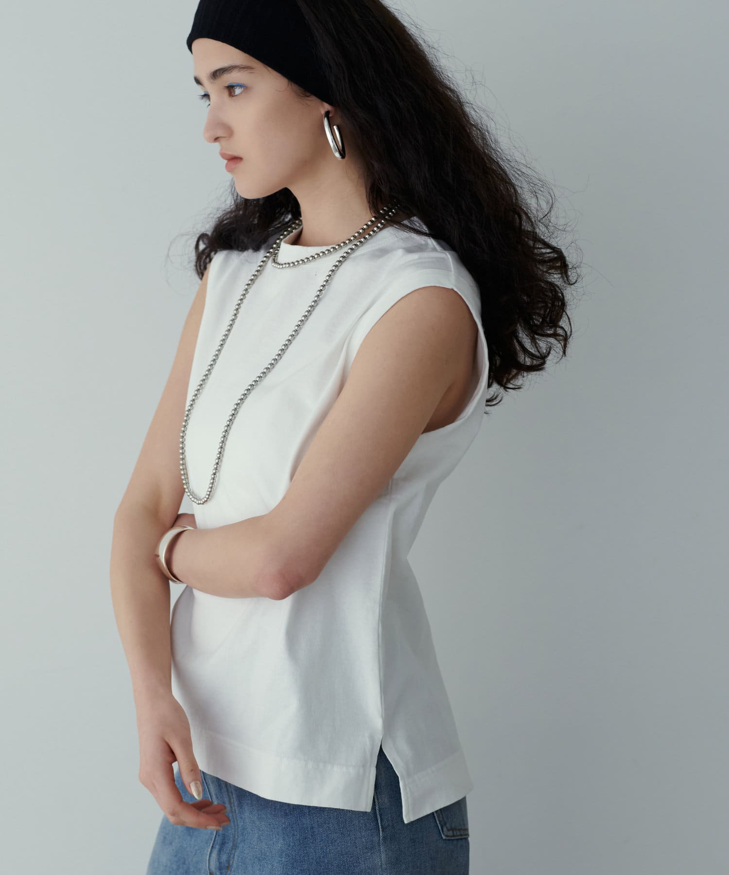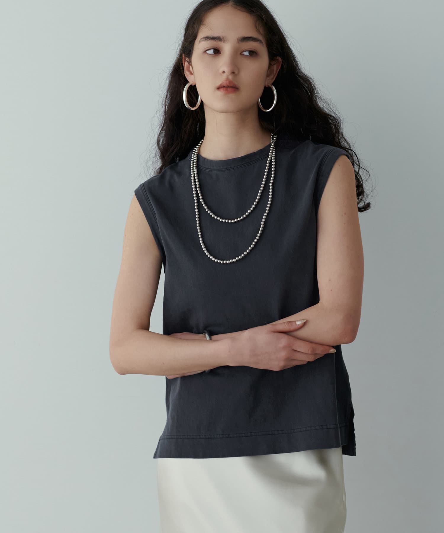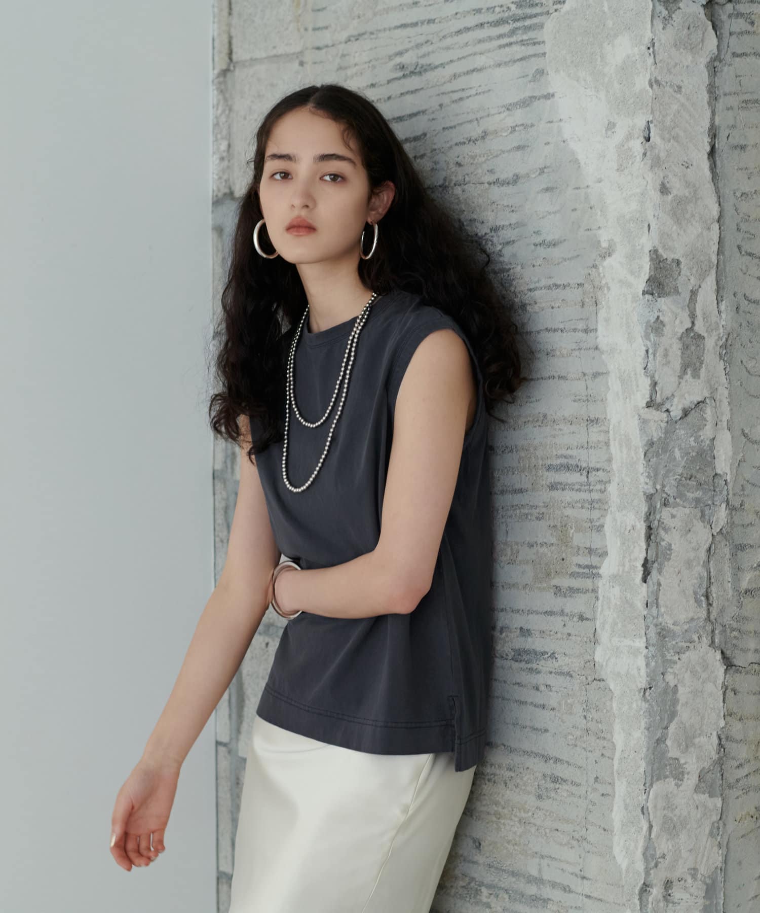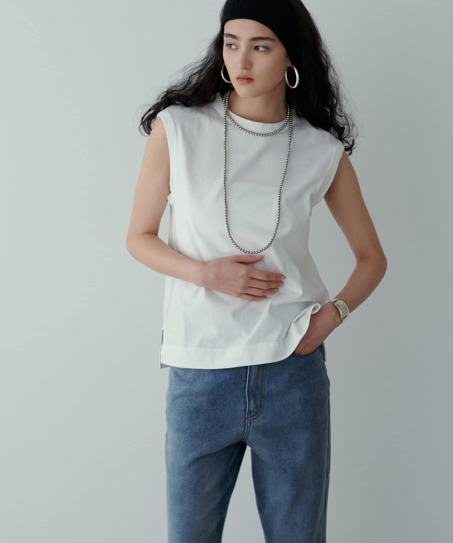 さらりと着られる生地感で、1枚使いはもちろん、インナーとしても活躍してくれるシーズンレスなノースリーブTシャツ。