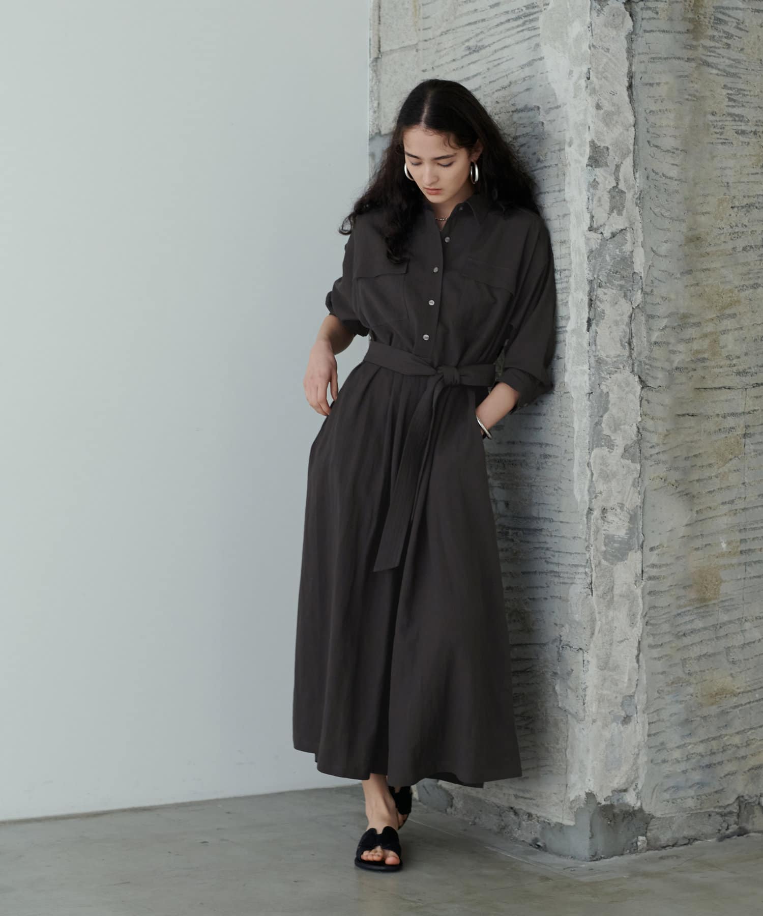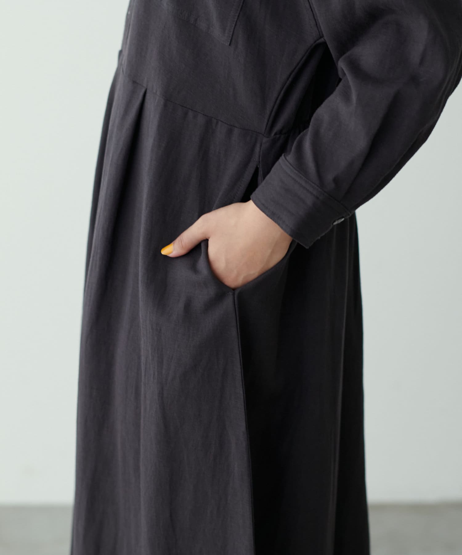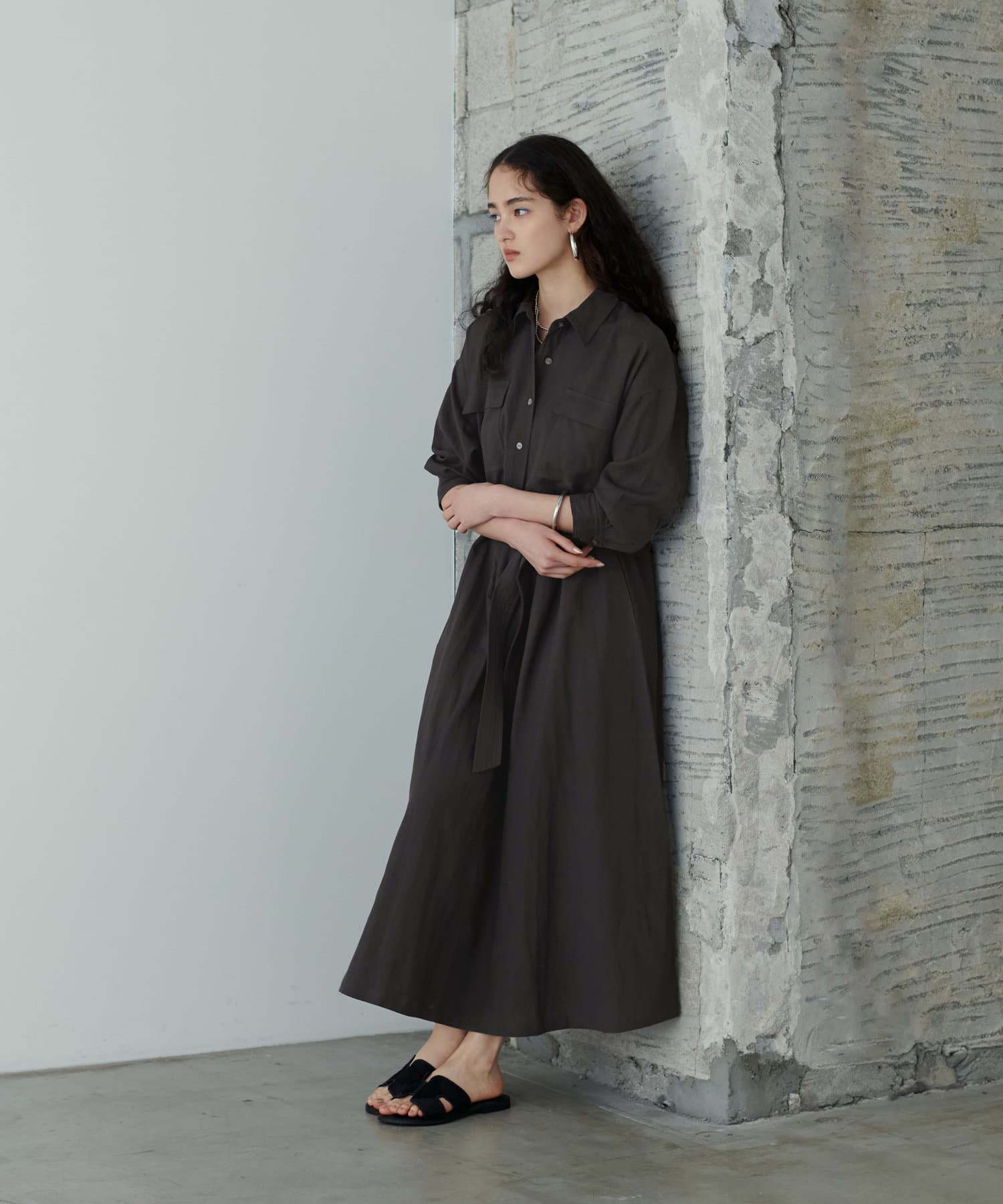 ハリのあるさらりとした麻混素材のシャツワンピース。