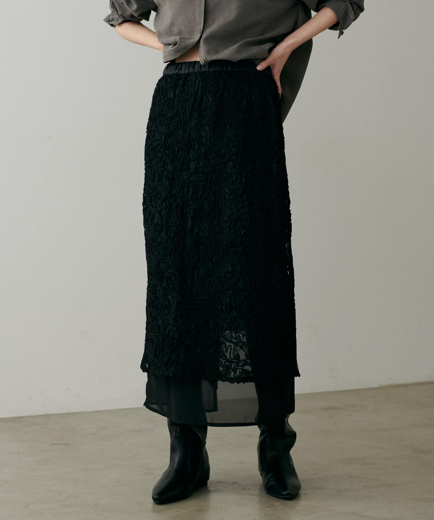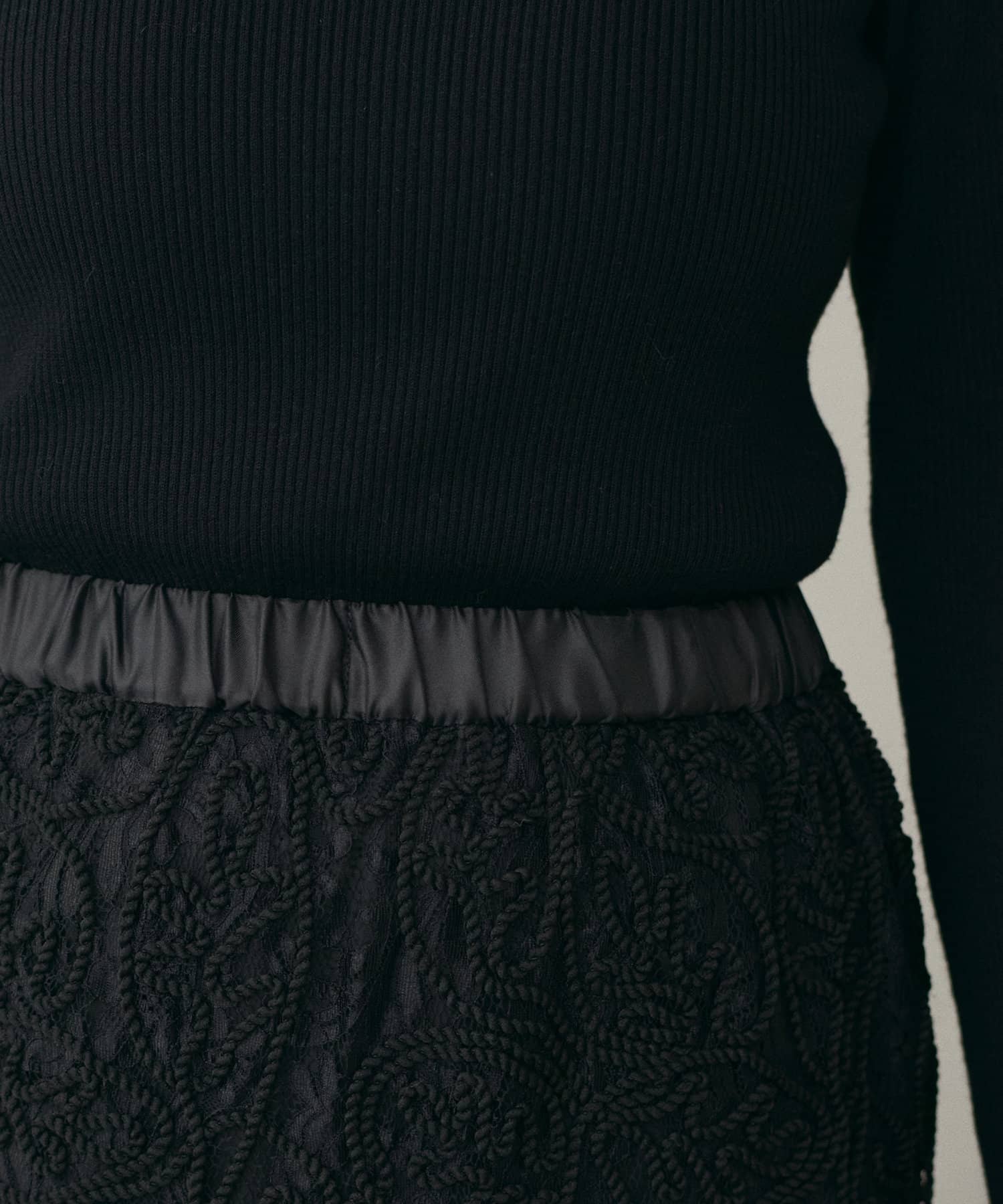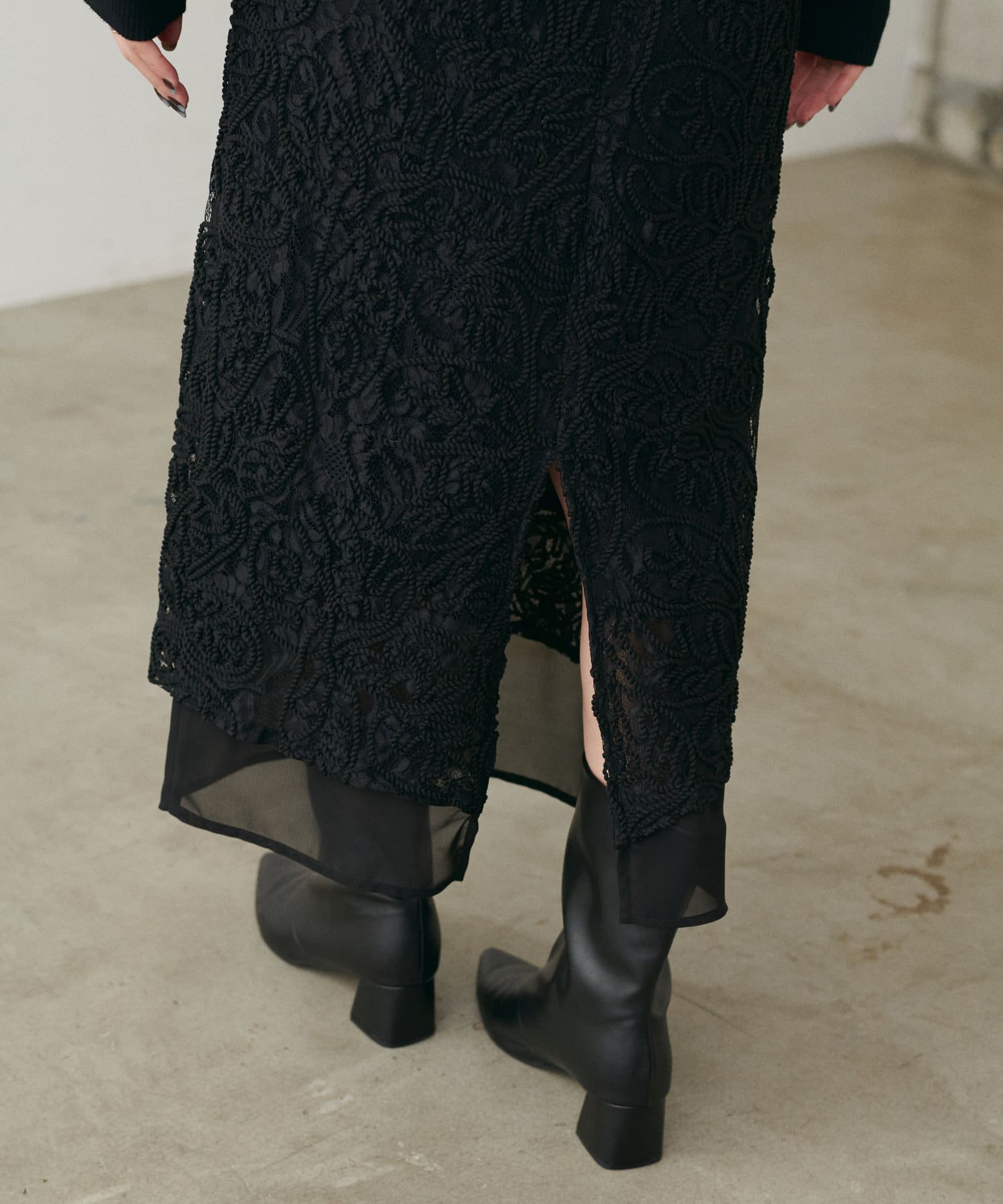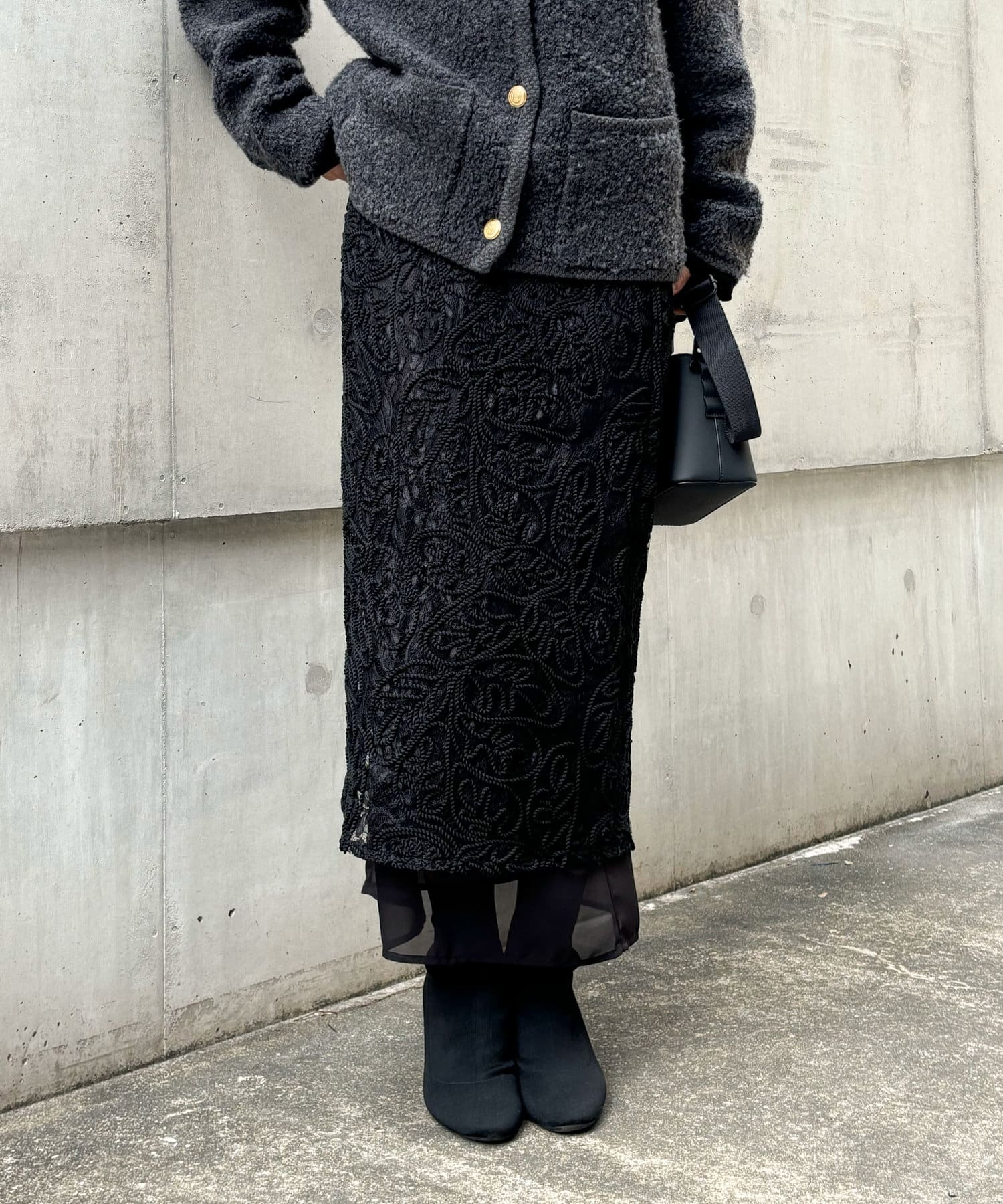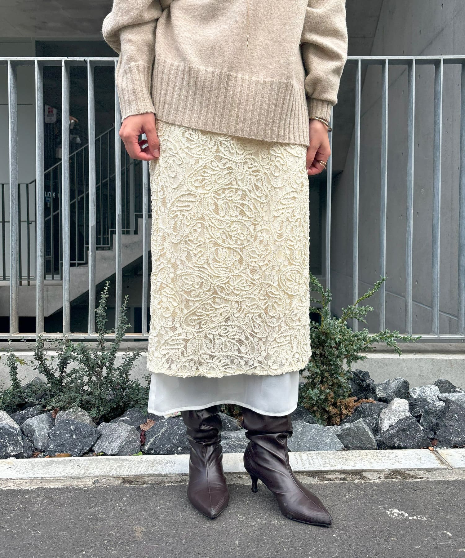 全体にひろがるロープレースの模様が気品を纏うIラインスカート。