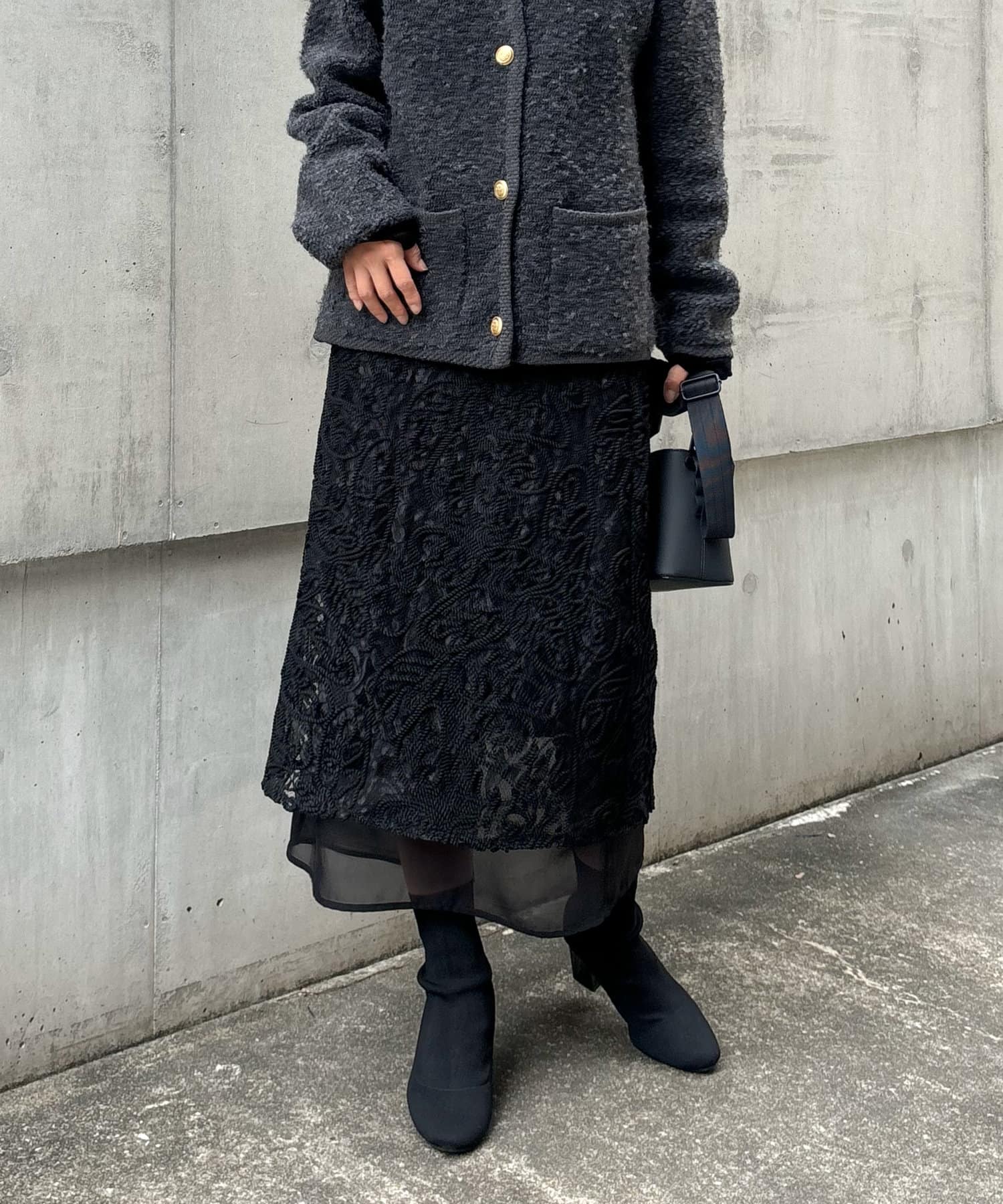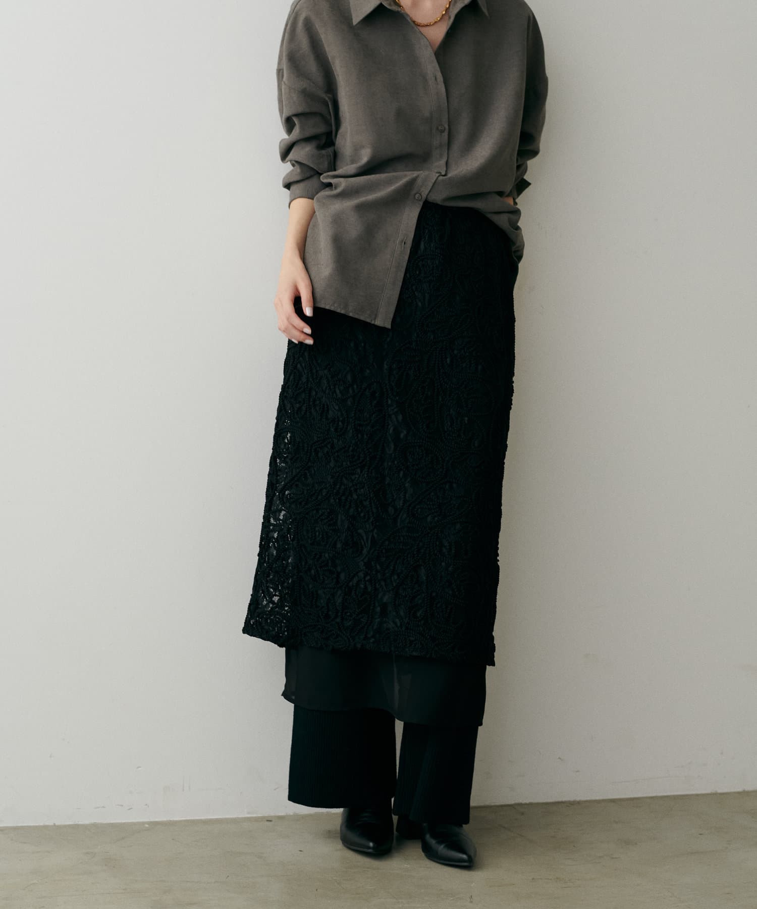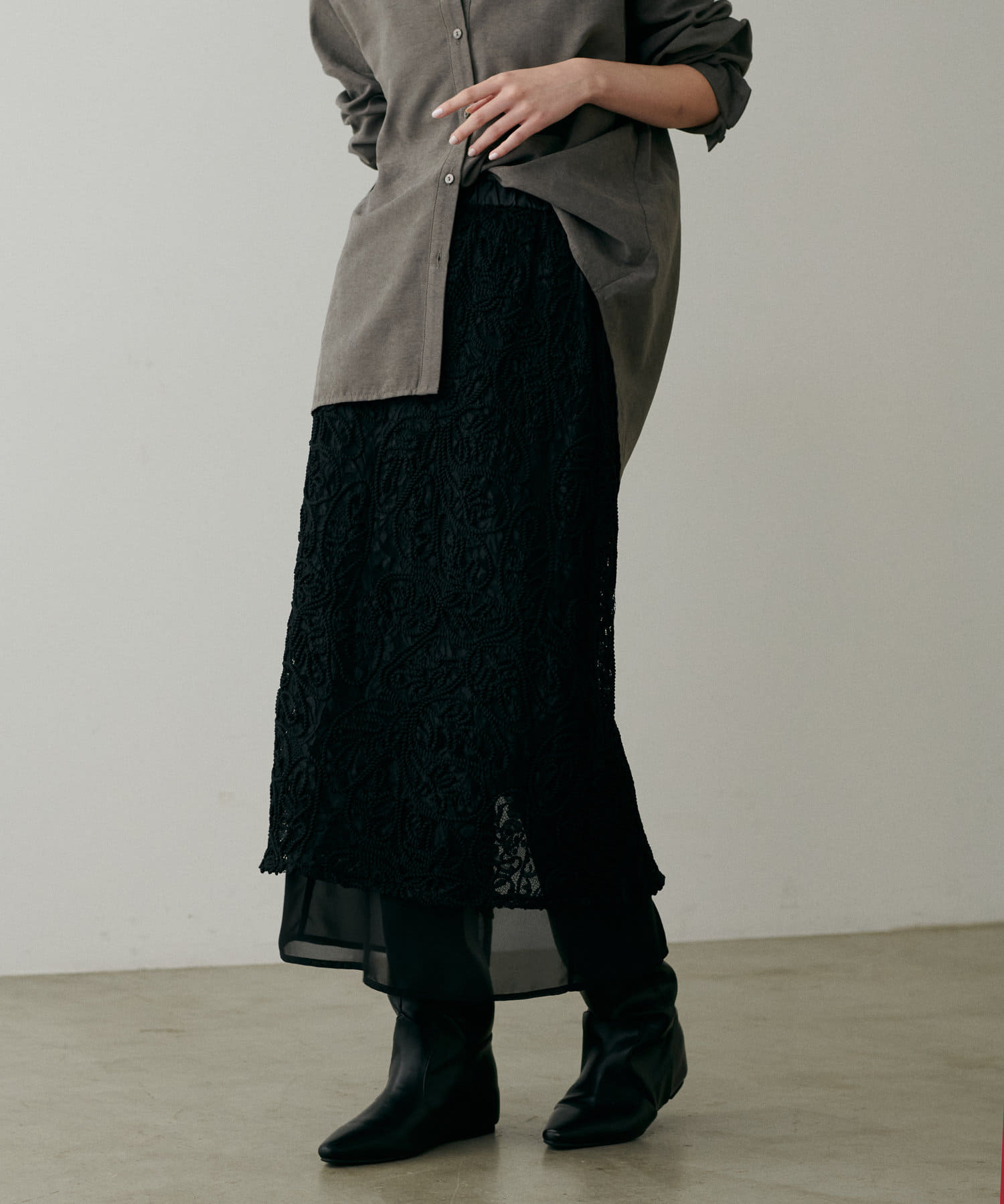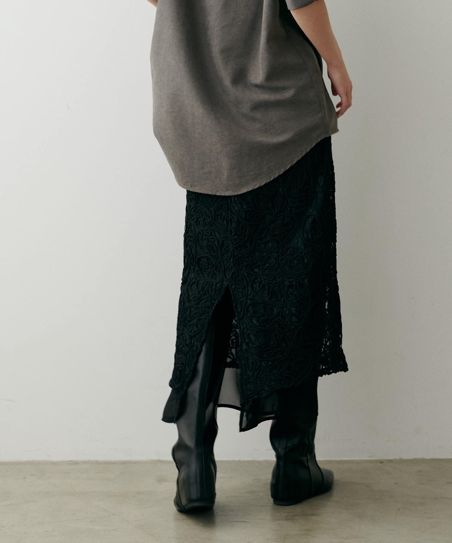 全体にひろがるロープレースの模様が気品を纏うIラインスカート。